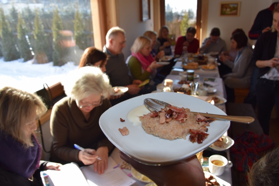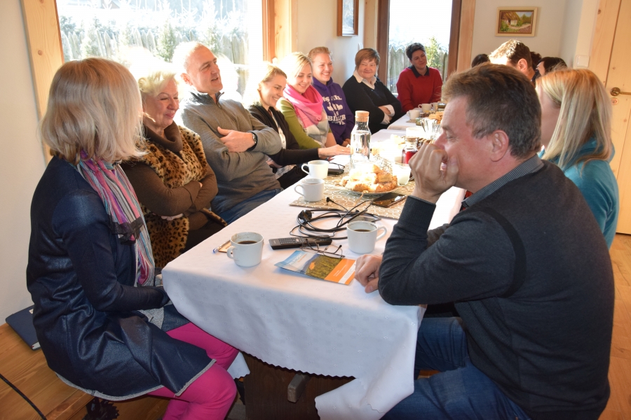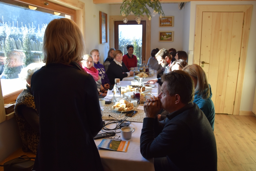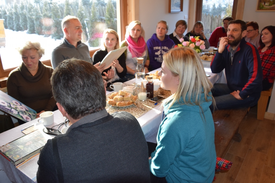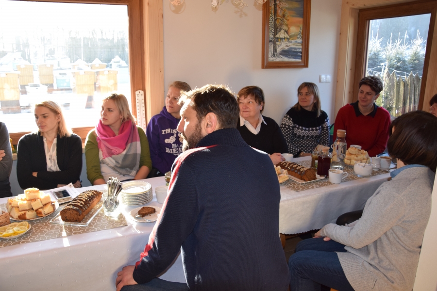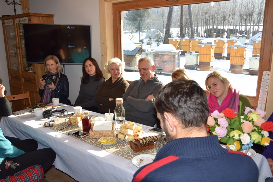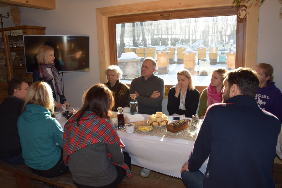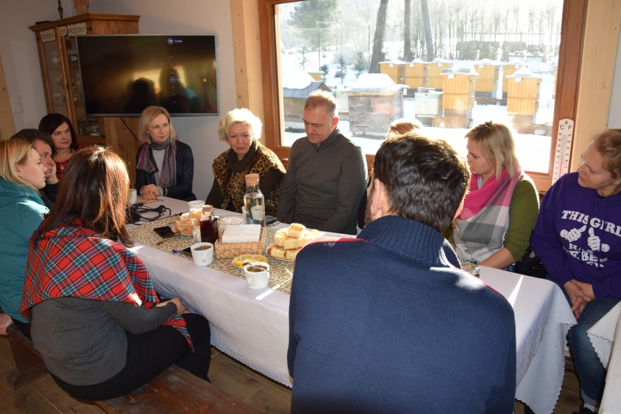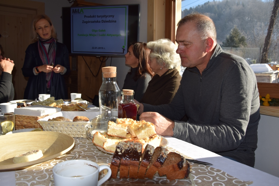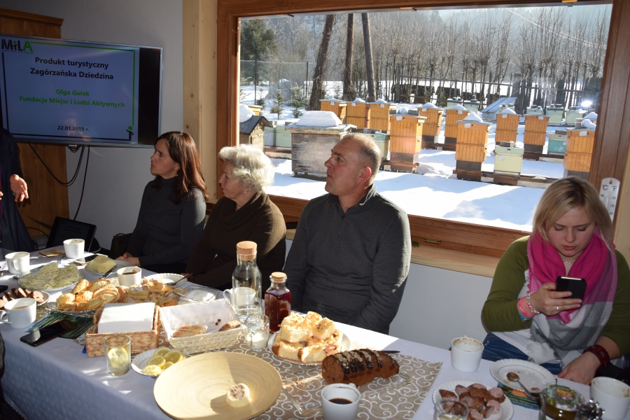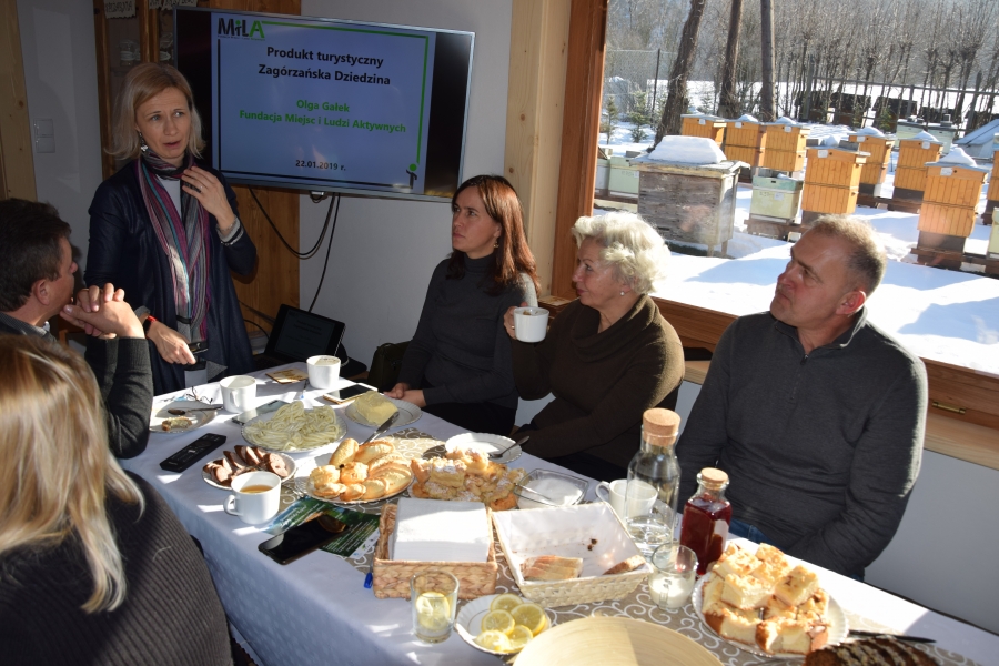 . Gospodarze miejsca – Barbara i Wojciech Łojasowie – w każdym szczególe zadbali o to, aby ich goście czuli się „na brzyzku” wspaniale. Począwszy od lokalizacji samego budynku, przez jego urządzenie, wyposażenie, a na poczęstunku i atmosferze skończywszy - wszystko przemyślane i przygotowane z ogromną dbałością o każdy szczegół. Takie otoczenie stało się dla uczestników wtorkowego spotkania (22.01.19) miejscem pracy twórczej. Kreatorzy marki wysłuchali ciekawego wykładu dot. miodu i produktów pszczelich (konik Wojciecha) oraz ziół i przetworów z warzyw, owoców i darów lasu (domena Barbary), a także ich właściwości zdrowotnych. Do woli upajali się też wspaniałym widokiem skąpanej w słońcu pasieki rozciągającym się przez ogromne okno usytuowane naprzeciw konferencyjnego stołu. Zapoznali się również z bardzo ciekawymi propozycjami zajęć edukacyjnych przygotowanych przez Stowarzyszenie „Zagórzańska Kraina”, które wzbogacą ofertę marki Zagórzańskie Dziedziny. Kreatorzy marki skupili się tego dnia na rozwoju produktu turystycznego. Inspirując się miejscem spotkania i pasjami jego uczestników, tworzyli cztery oferty turystyczne – przemyślane, spójne, perfekcyjnie i na wysokim poziomie. Profesjonalne jak wzór - Pasieka Bartek. Efekt końcowy spotkania stanowią oferty pobytowe przygotowane dla czterech różnych grup społecznych, z przypisanymi oferentami i cennikiem. Uwagę na niszę do zagospodarowania zwróciła uczestnikom spotkania jego prowadząca – Olga Gałek – Wiceprezes Fundacji Miejsc i Ludzi Aktywnych MILA. Przegotowane przez Zagórzańskie Dziedziny oferty turystyczne będą wprowadzane do wachlarza usług świadczonych przez podmioty działające w branży turystycznej i okołoturystycznej na tym terenie oraz profesjonalnego biura podróży z Krakowa.