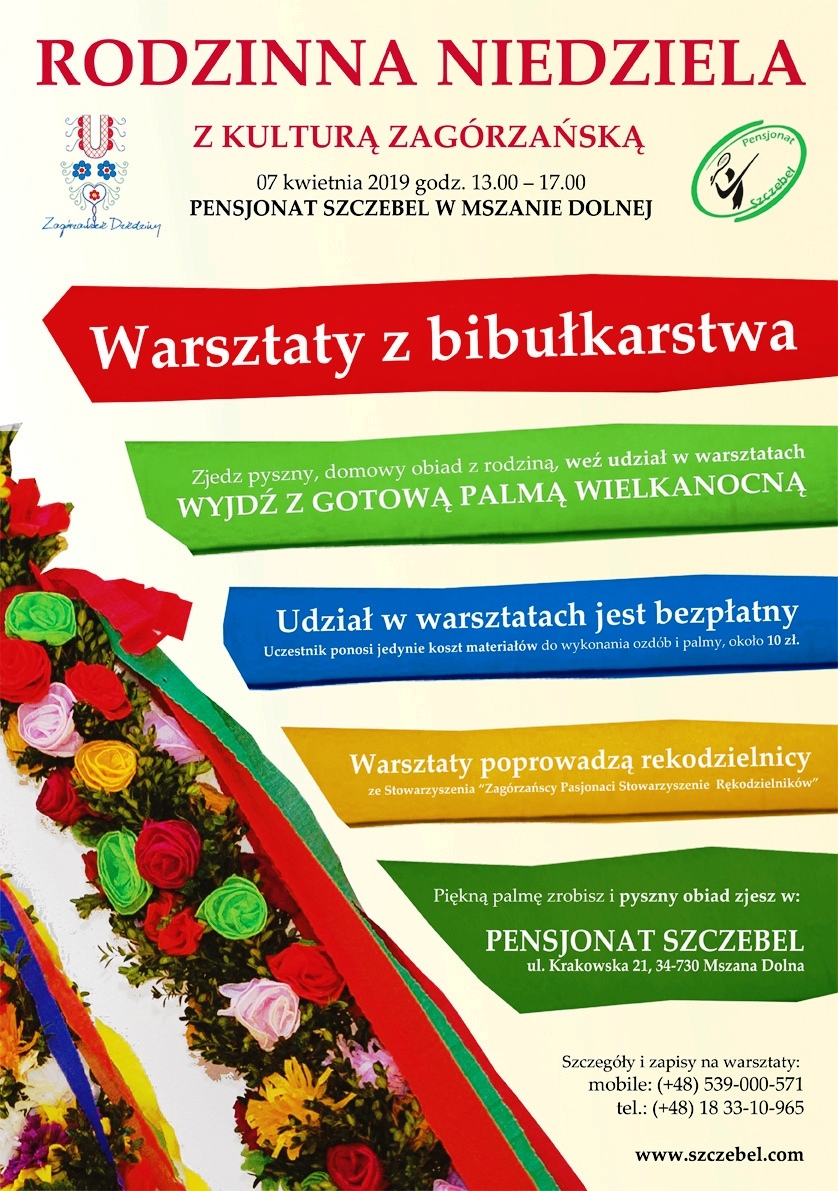 Już od 7 kwietnia b.r., przy współpracy z Pensjonatem Szczebel w Mszanie Dolnej, zaczną funkcjonować Rodzinne Niedziele z Kulturą Zagórzańską. Co tydzień będzie można w ramach tej oferty skorzystać z innych zajęć warsztatowych. Szczegóły podane zostaną każdorazowo na plakatach promujących akcję.
