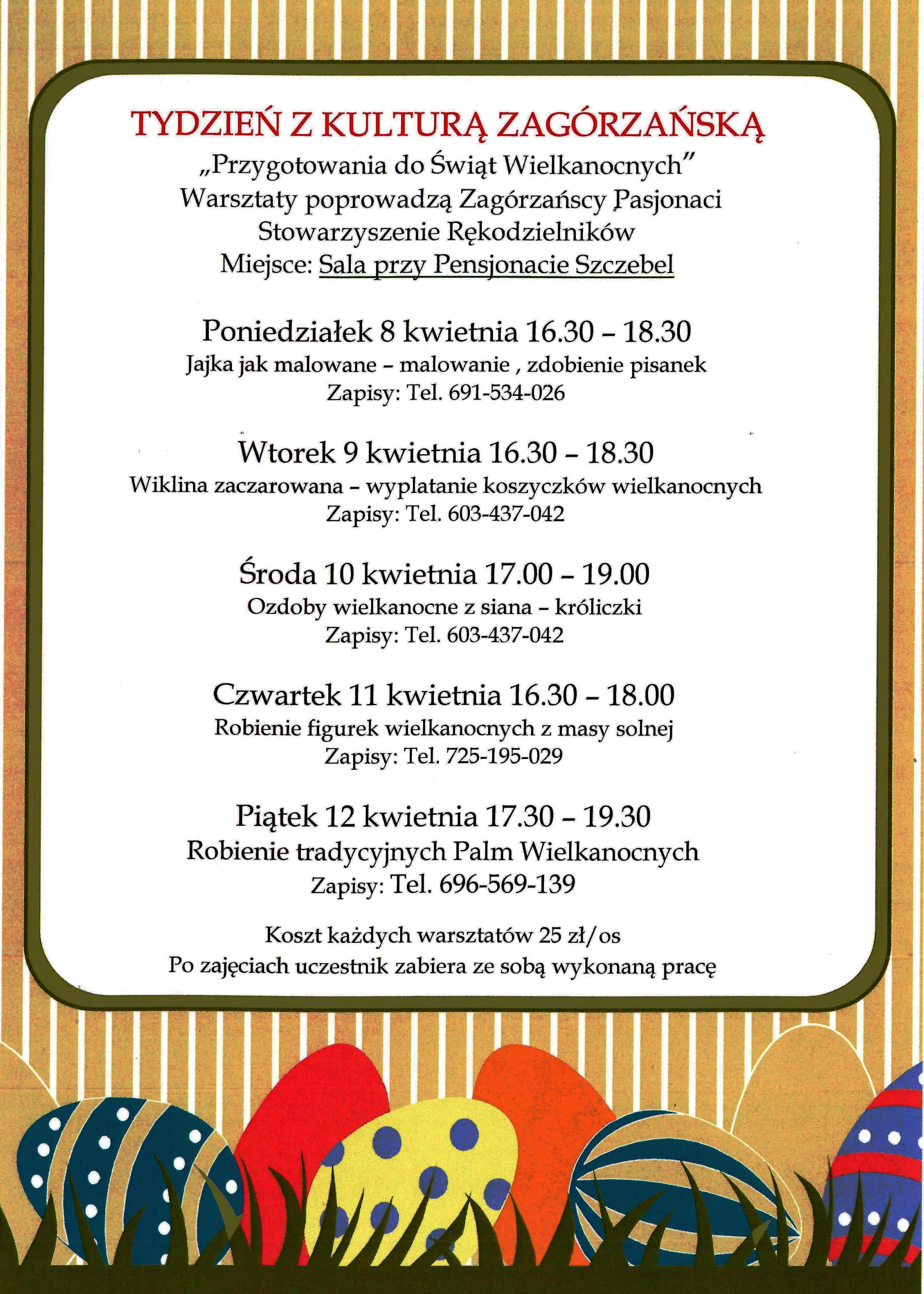 W przedświątecznym tygodniu 8 – 12 kwietnia b.r. członkowie Stowarzyszenia Rękodzielników Zagórzańscy Pasjonaci przeprowadzą cykl warsztatów związanych z tematyką wielkanocną. Będzie można własnoręcznie zrobić kwiaty z bibuły i palmę wielkanocną; będzie malowanie pisanek i wyplatanie koszyczków; niezłą zabawę będą mieli ci, którzy zdecydują się wyczarować świąteczne figurki z siana lub masy solnej.