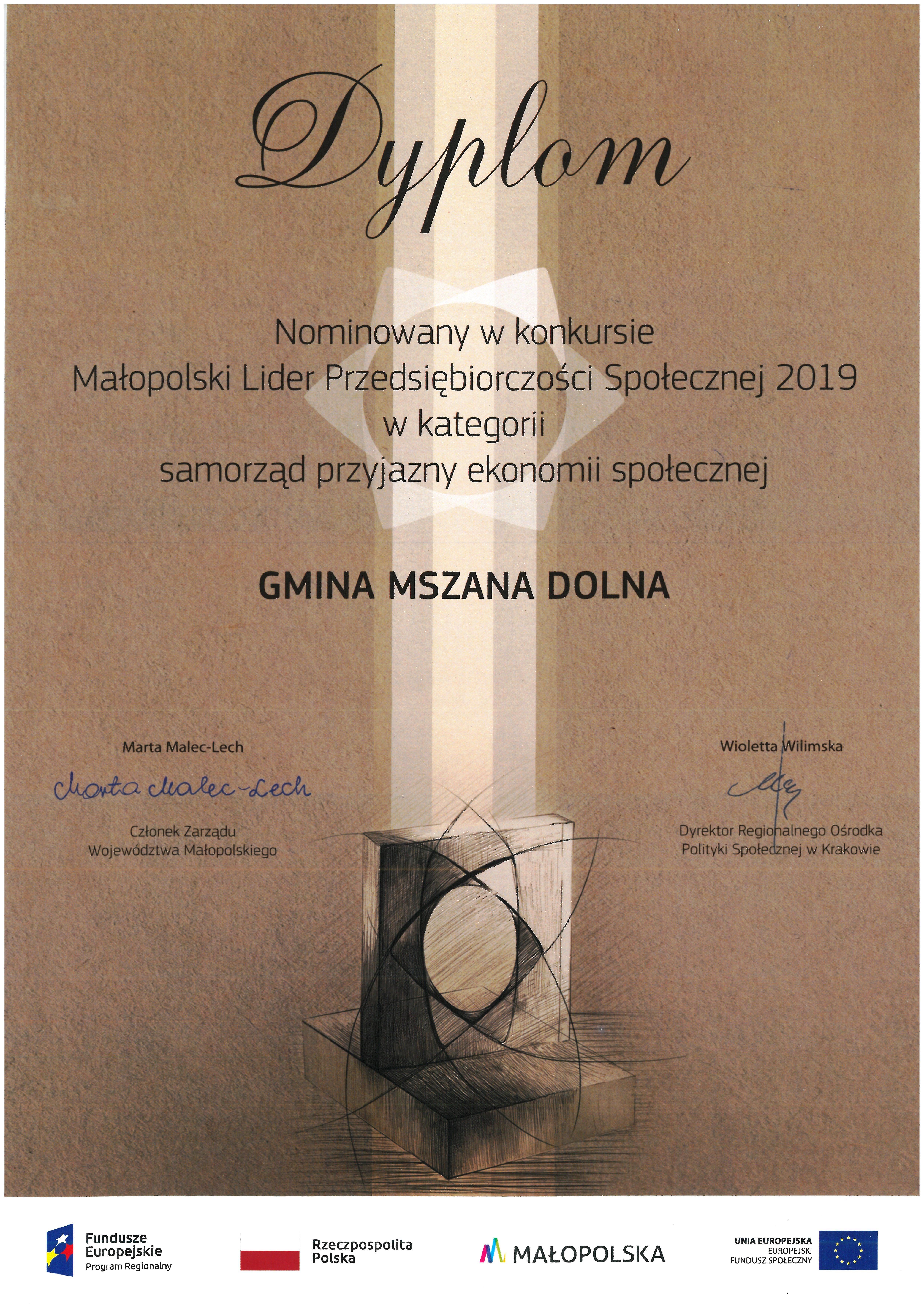 Rekomendację dla zagórzańskiego samorządu złożyła Fundacja Sztuki, Przygody i Przyjemności ARTS, która wśród 182 gmin z terenu Małopolski dostrzegła i doceniła działania Gminy Mszana Dolna mające na celu wsparcie i rozwój podmiotów ekonomii społecznej. Informację o prestiżowej nominacji podano do wiadomości podczas gali zorganizowanej 9 grudnia b.r. w Kopalni Soli w Bochni. W uroczystym wydarzeniu Gminę Mszana Dolna reprezentował Wójt Bolesław Żaba.