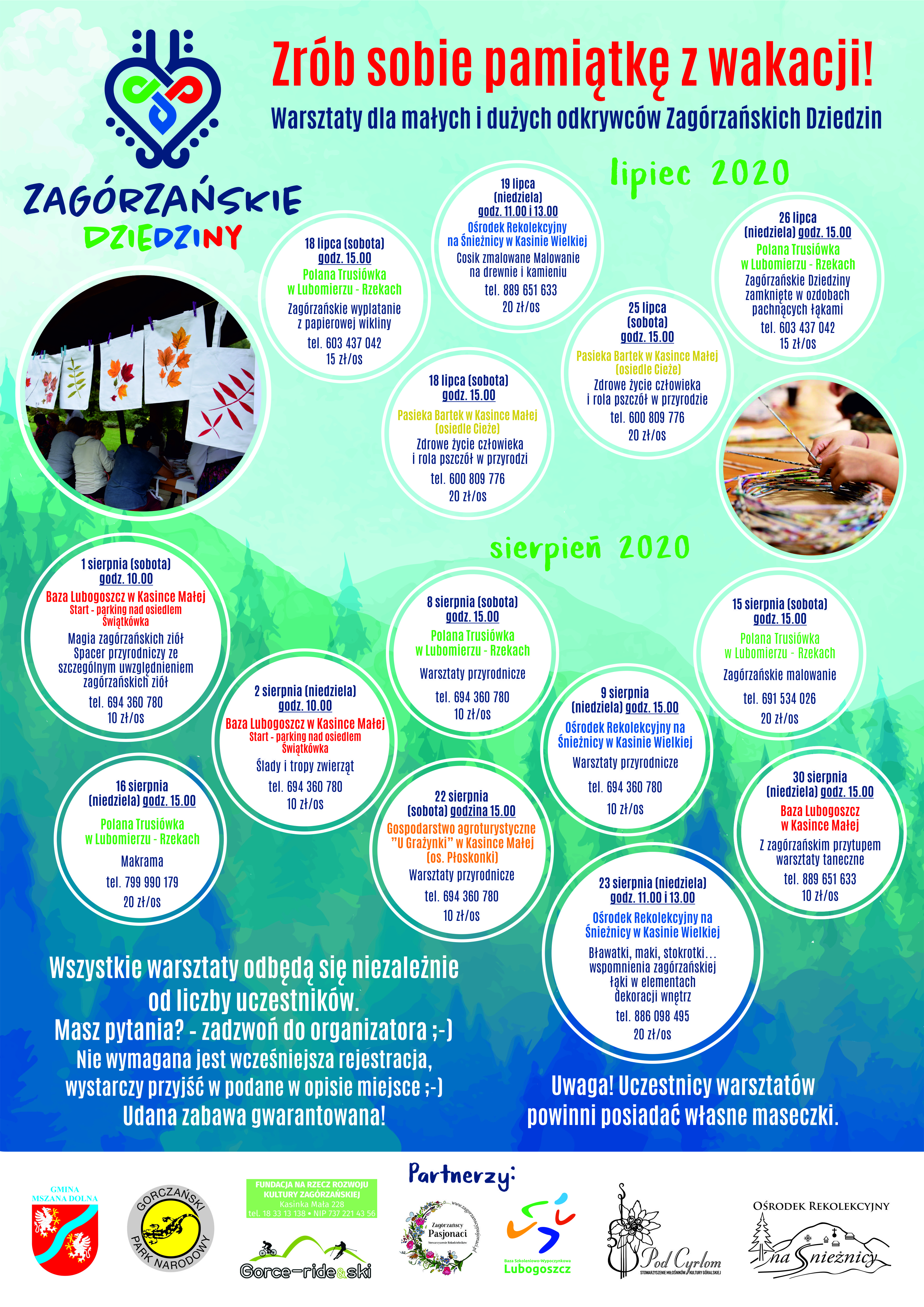 Najbliższe zajęcia kreatywne przeprowadzone zostaną już 18 lipca 2020 r. na Polanie Trusiówka w Lubomierzu - Rzekach i Pasiece Bartek w Kasince Małej (oś. Cieże) oraz 19 lipca 2020r. w Ośrodku Rekolekcyjnym na Śnieżnicy w Kasinie Wielkiej.