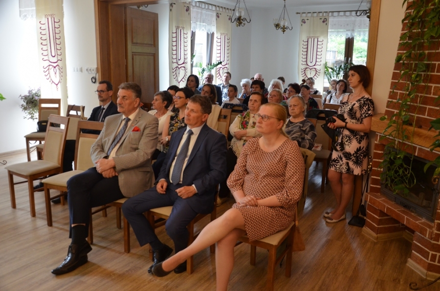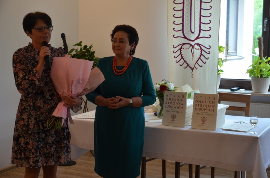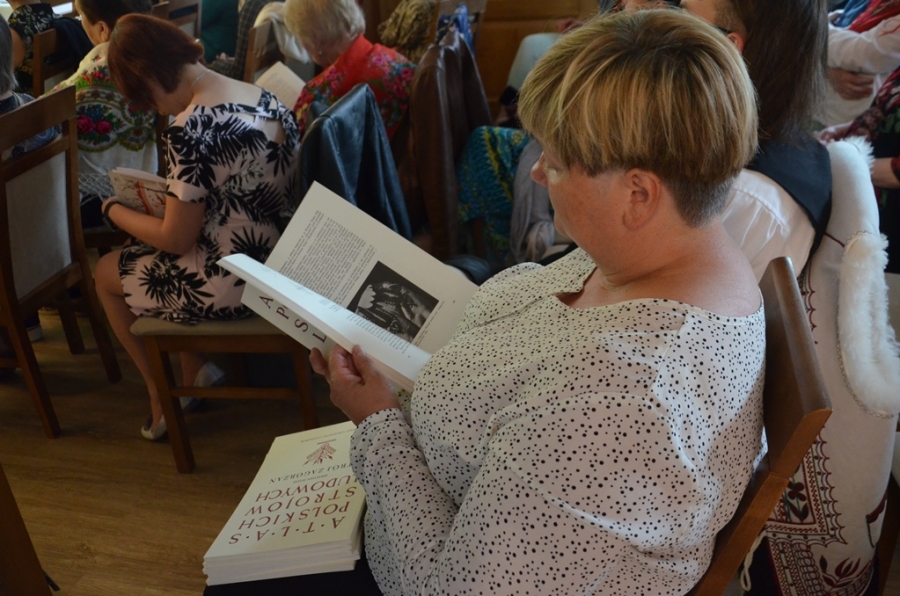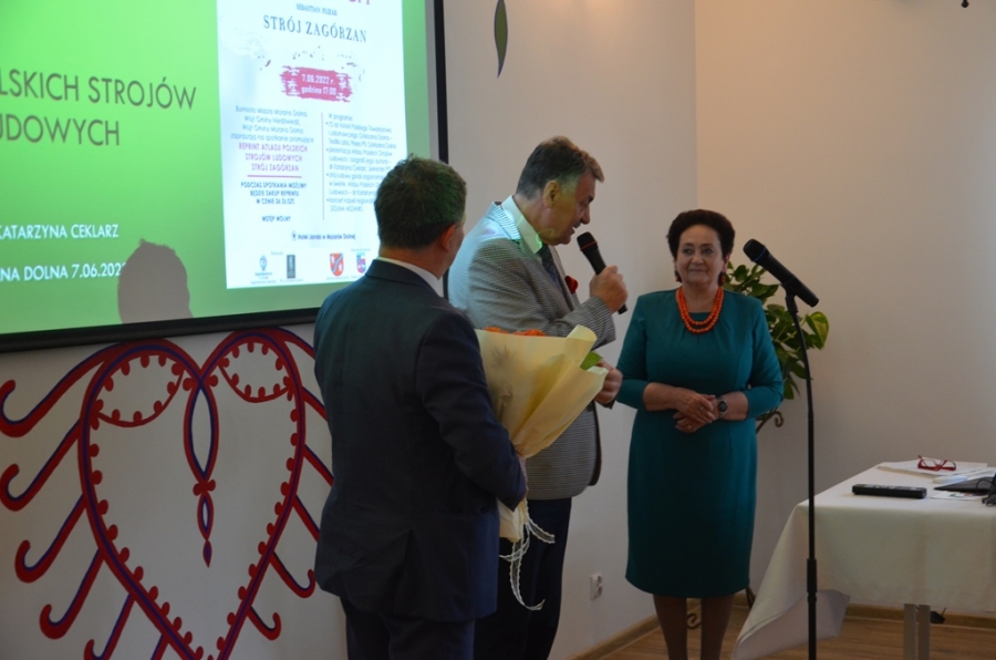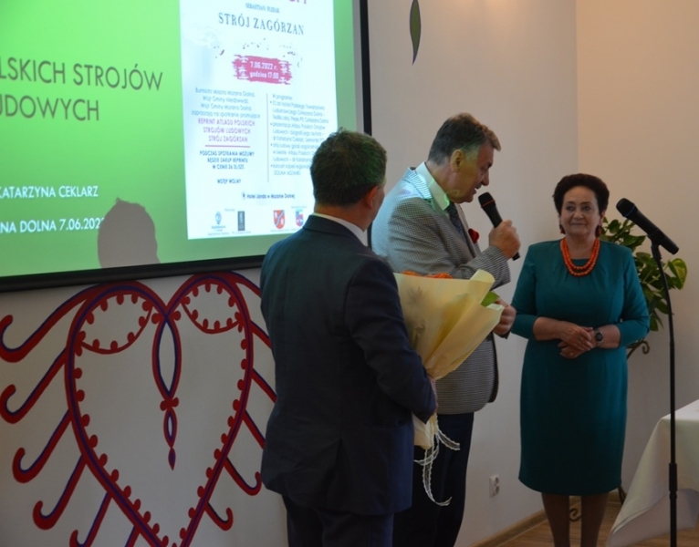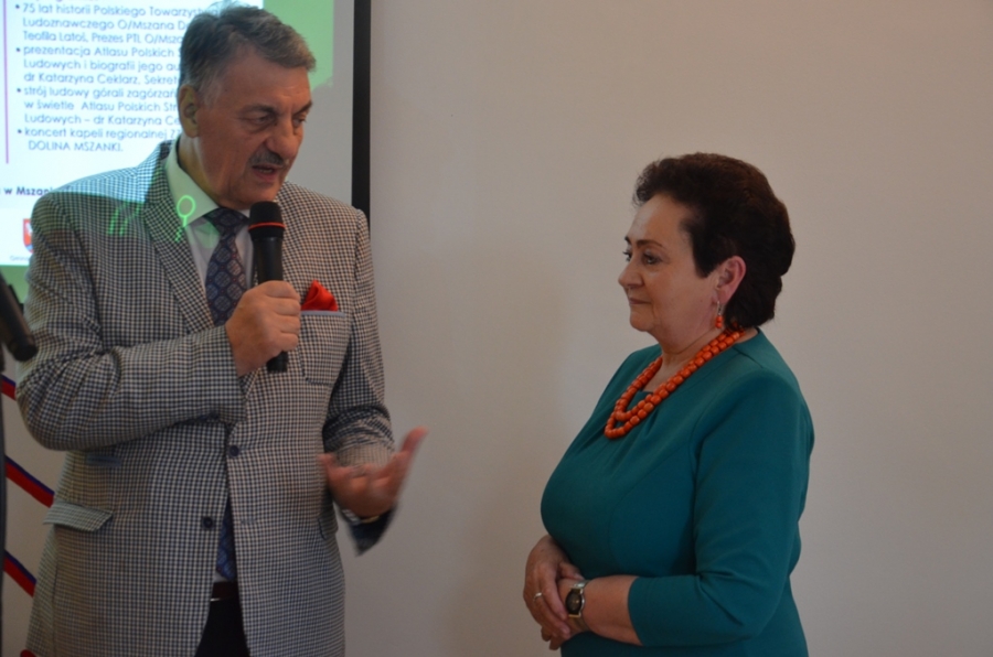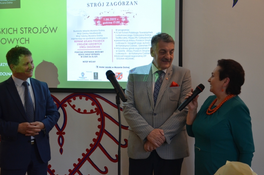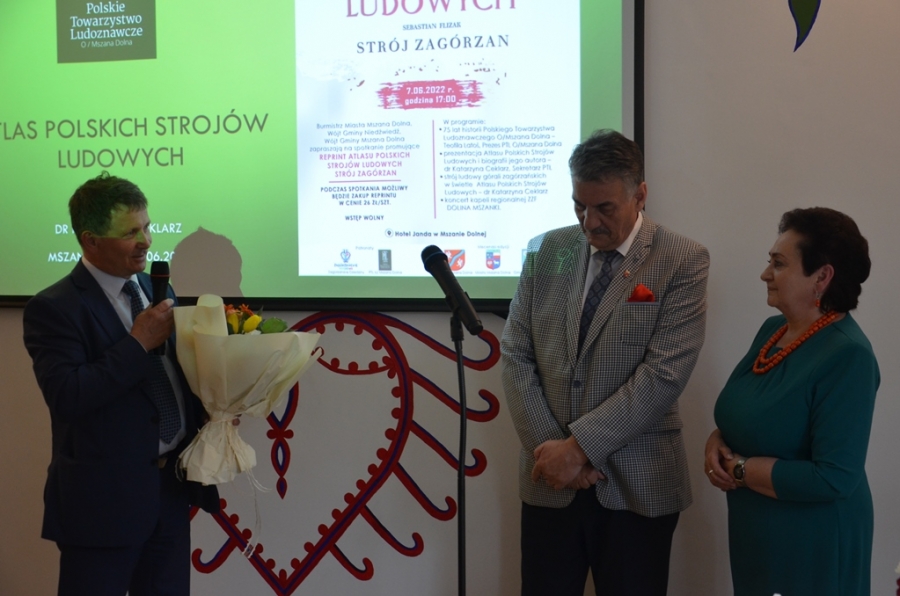 Kto miał kiedyś okazję sięgnąć do omawianego zeszytu, by poszerzyć swoją wiedzę o naszym, zagórzańskim regionie, ten wie jak wysłużony był już ten album. Nie ma więc lepszego prezentu na jubileusz mszańskiego Oddziału PTL , jak przygotowanie reprintu tego cennego dzieła etnograficznego. Udało się to przy współpracy trzech zagórzańskich samorządów: Miasta i Gminy Mszana Dolna oraz Gminy Niedźwiedź. Świadomość jak bardzo potrzebne i konieczne jest wznowienie tego atlasu pociągnęła za sobą finansowe wsparcie. Każdy z samorządów wspomógł Główny Oddział PTL i tak oto staliśmy się naocznymi świadkami niesamowitej historii. Zanim jednak Ci, których sercom bliska jest kultura regionu, dowiedzieli się czegoś więcej na temat samego atlasu, jak i stroju ludowego Zagórzan na spotkaniu promocyjnym, po przywitaniu gości przez Burmistrz Miasta Annę Pękałę, głos zabrała prezes mszańskiego PTL, Teofila Latoś. W krótkiej prelekcji przypomniała historię Polskiego Towarzystwa Ludoznawczego Oddział w Mszanie Dolnej – okoliczności powstania i założenia oddziału, zasłużone postaci, działalność, publikacje i ostatnie lata, gdy mszański PTL szukał odpowiedniego miejsca na zgromadzone przez siebie zbiory. Przy okazji takiego jubileuszu pojawiły się kwiaty, podziękowania i obietnice na dalsze wsparcie. Gratulacje dla Jubilatów w imieniu trzech zagórzańskich samorządów złożyli Wójtowie: Bolesław Żaba (Gmina Mszana Dolna) i Rafał Rusnak (Gmina Niedźwiedź).
