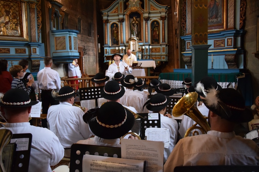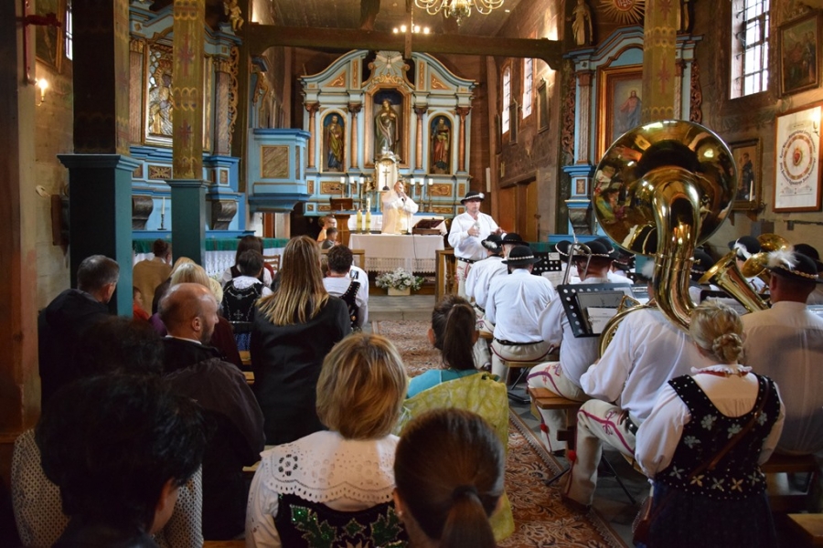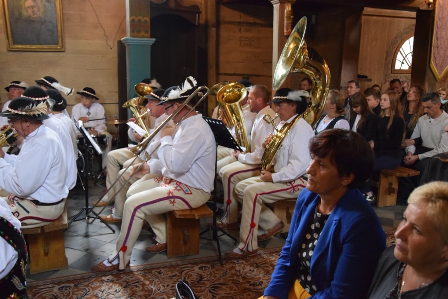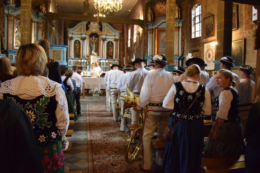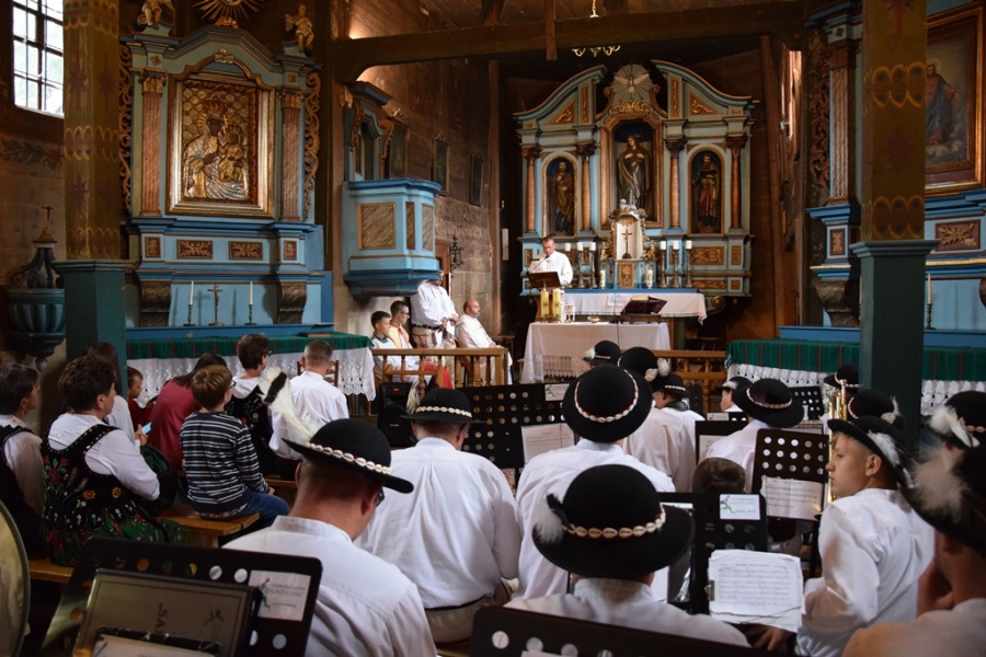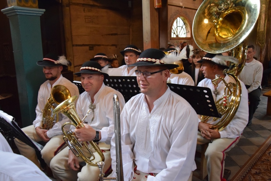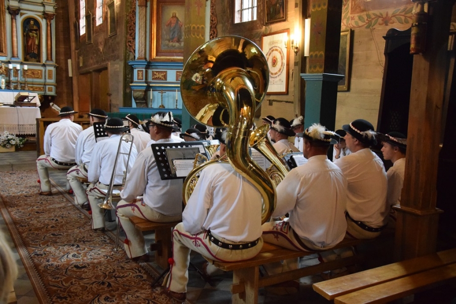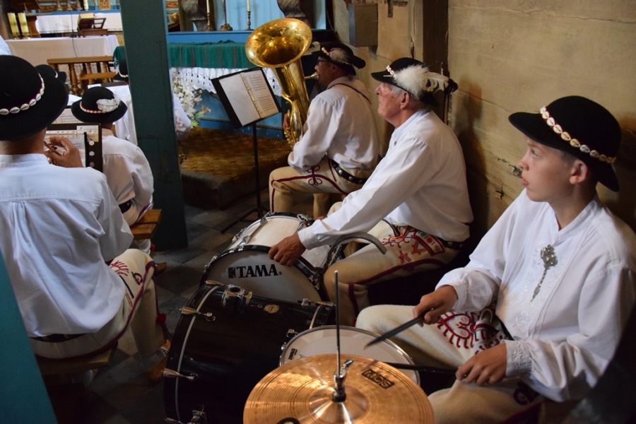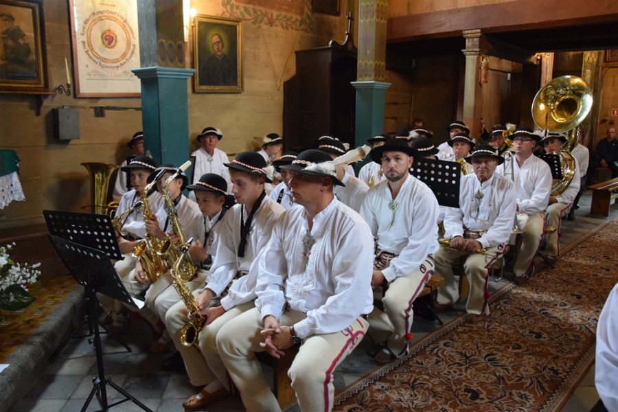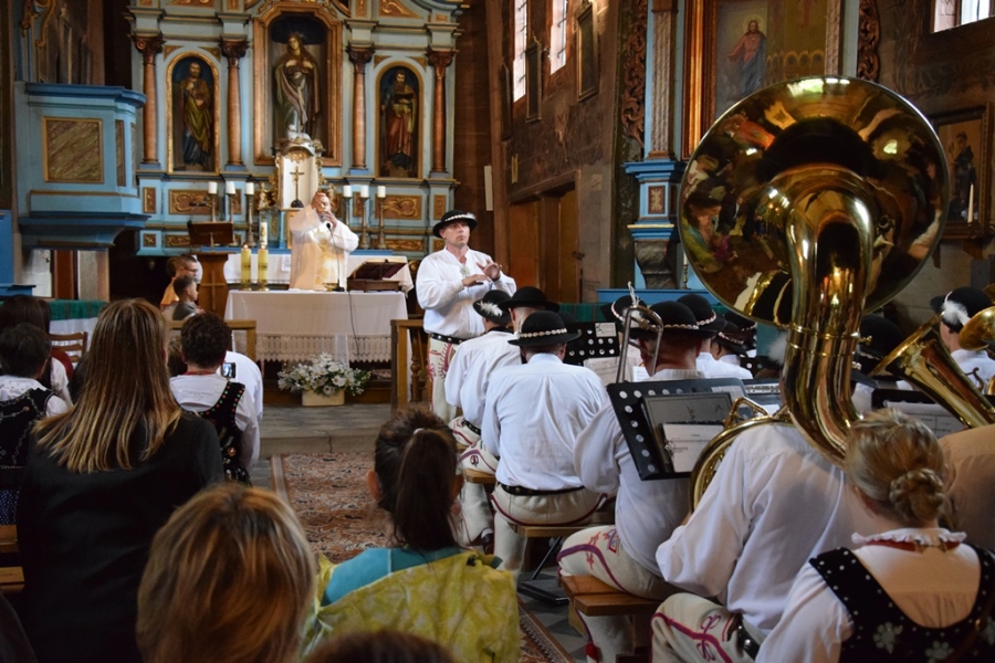 W kościele parasole były niepotrzebne, można więc było do woli rozkoszować się okolicznościowym anturażem. A ten, przyznać trzeba, był zacny. Niezmiennie zachwycają wnętrza siedemnastowiecznej świątyni, a głos zabytkowych również organów zapewnia nastrój jak z innej epoki… Dźwięki zagórzańskich zespołów i orkiestr dętych brzmią tutaj również wyjątkowo! Trzeba wszak przyznać, że akustyka obiektu sprzyja odbiorowi nabożnych pieśni. Tym razem o tę muzyczną oprawę Zagórzańskiej Mszy św. oraz ubogacenie liturgii słowa i śpiewów międzylekcyjnych zadbali muzycy z orkiestry Sami Swoi z Kasinki Małej – Zagródca. Wśród odświętnie przyodzianych w stroje regionalne Zagórzan dostrzec można było sąsiadów z Węglówki. Pociągiem retro z Chabówki na tę szczególną Eucharystię dotarło niezwykle sympatyczne małżeństwo, mieszkańcy Śląska Cieszyńskiego. Jak zwykle, swoim gospodarskim okiem ogarniał wszystko kasiński gazda, Adam Wrzecionek. Opady deszczu nie przeszkodziły również Zagórzańskim Pasjonatom Stowarzyszeniu Rękodzielników w rozstawieniu swojego stoiska z cudeńkami ludzką ręką uczynionymi. Dbają oni zawsze, aby uczestnicy Zagórzańskich Mszy św. z pobytu u Zagórzan wrócili z oryginalną pamiątką.