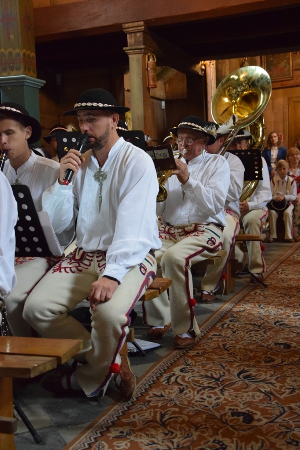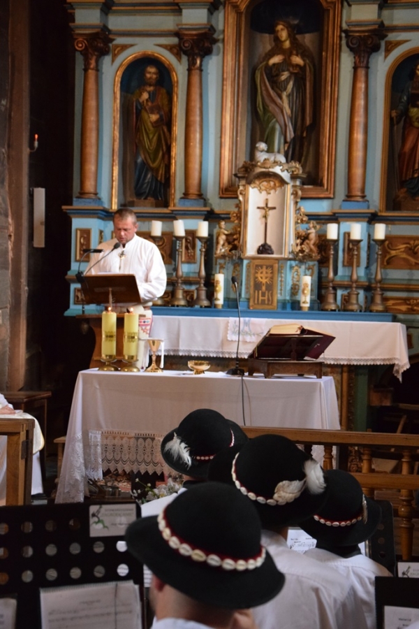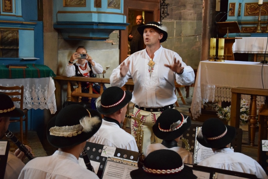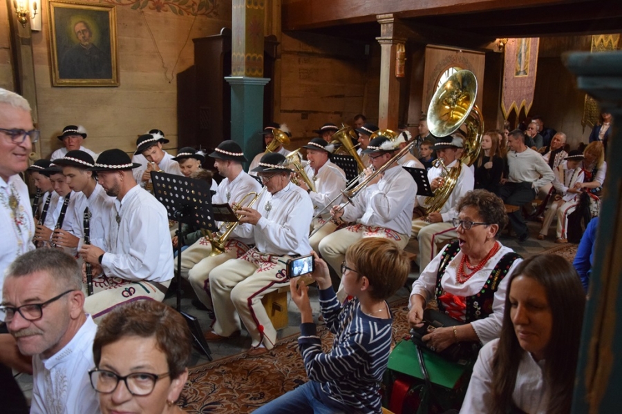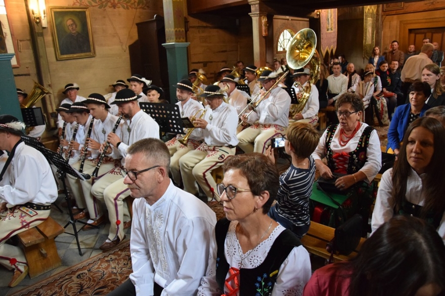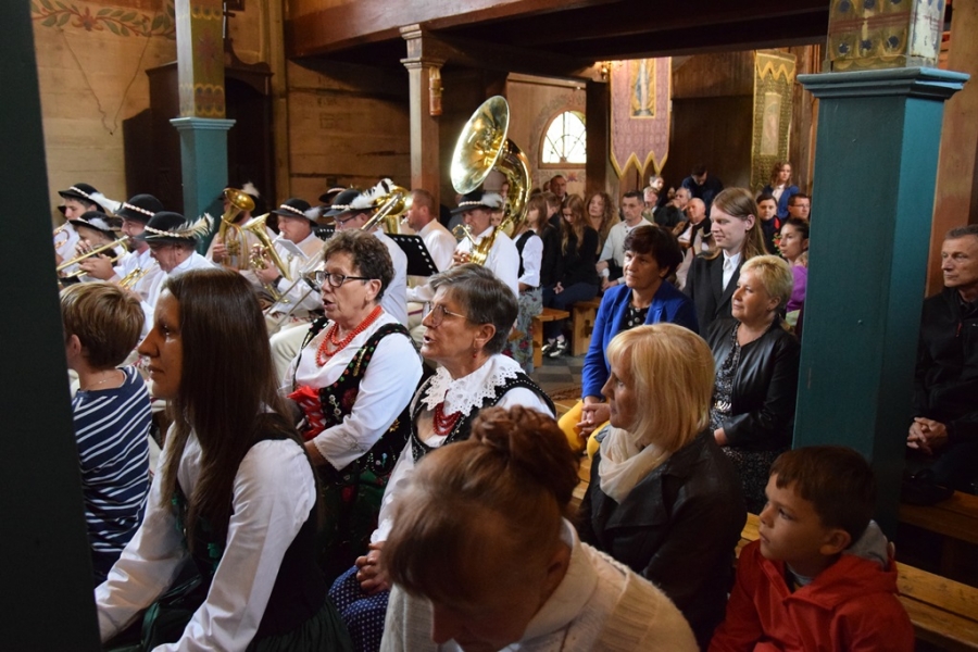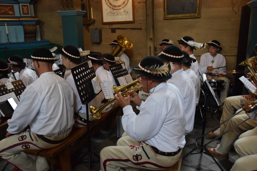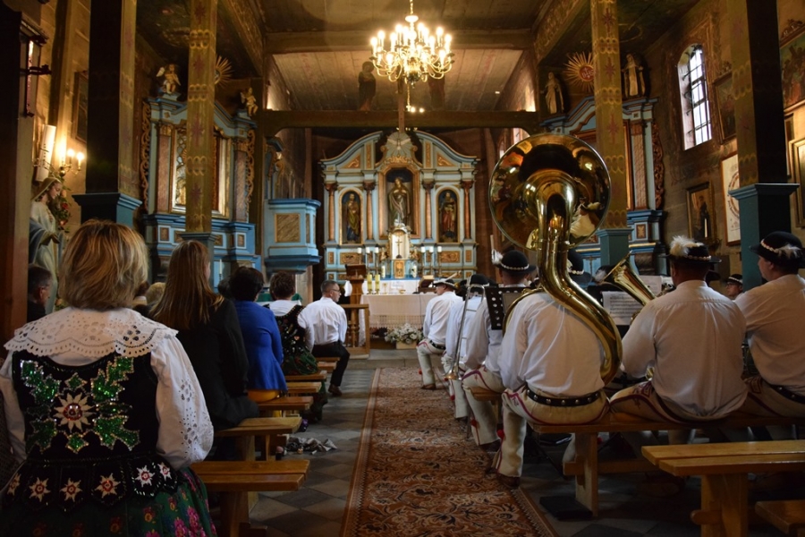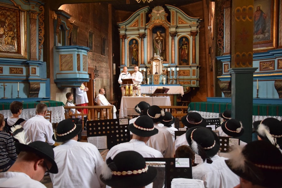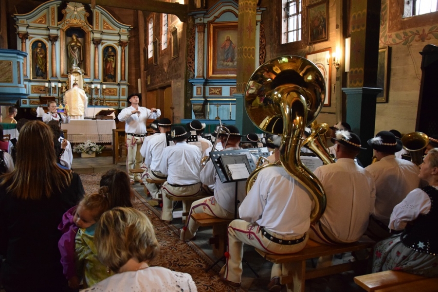 W kościele parasole były niepotrzebne, można więc było do woli rozkoszować się okolicznościowym anturażem. A ten, przyznać trzeba, był zacny. Niezmiennie zachwycają wnętrza siedemnastowiecznej świątyni, a głos zabytkowych również organów zapewnia nastrój jak z innej epoki… Dźwięki zagórzańskich zespołów i orkiestr dętych brzmią tutaj również wyjątkowo! Trzeba wszak przyznać, że akustyka obiektu sprzyja odbiorowi nabożnych pieśni. Tym razem o tę muzyczną oprawę Zagórzańskiej Mszy św. oraz ubogacenie liturgii słowa i śpiewów międzylekcyjnych zadbali muzycy z orkiestry Sami Swoi z Kasinki Małej – Zagródca. Wśród odświętnie przyodzianych w stroje regionalne Zagórzan dostrzec można było sąsiadów z Węglówki. Pociągiem retro z Chabówki na tę szczególną Eucharystię dotarło niezwykle sympatyczne małżeństwo, mieszkańcy Śląska Cieszyńskiego. Jak zwykle, swoim gospodarskim okiem ogarniał wszystko kasiński gazda, Adam Wrzecionek. Opady deszczu nie przeszkodziły również Zagórzańskim Pasjonatom Stowarzyszeniu Rękodzielników w rozstawieniu swojego stoiska z cudeńkami ludzką ręką uczynionymi. Dbają oni zawsze, aby uczestnicy Zagórzańskich Mszy św. z pobytu u Zagórzan wrócili z oryginalną pamiątką.