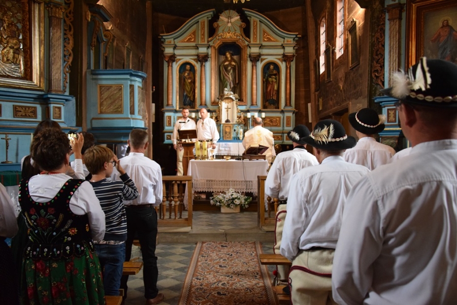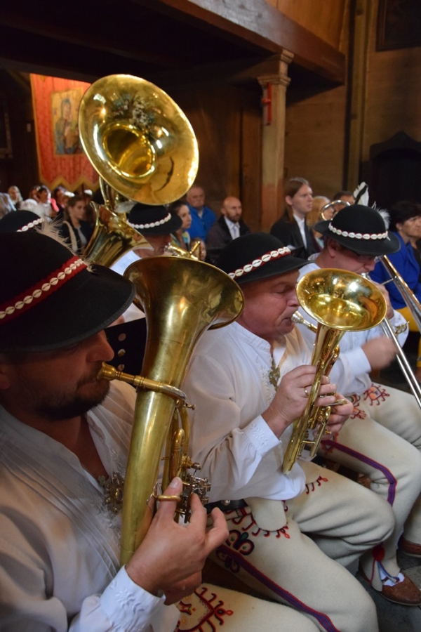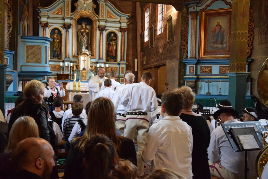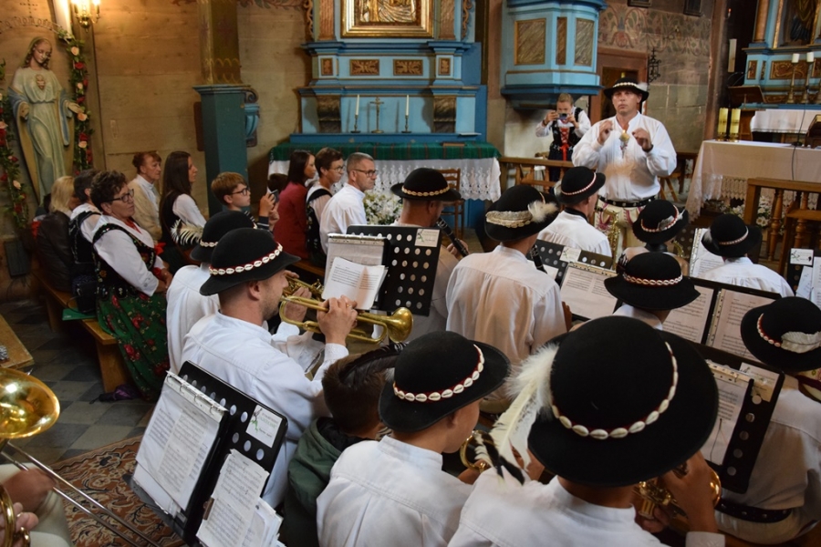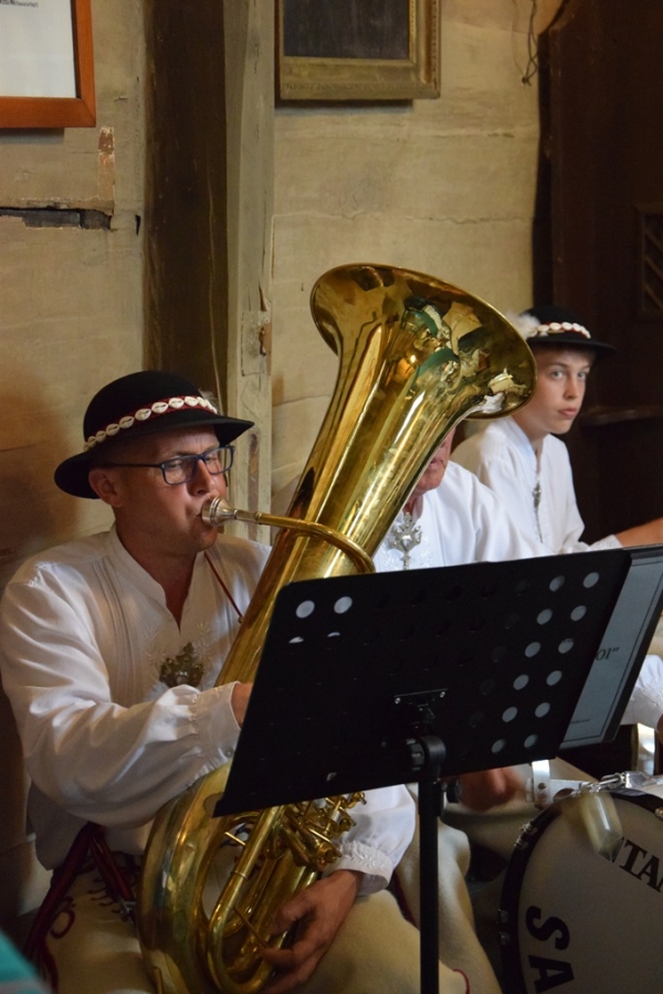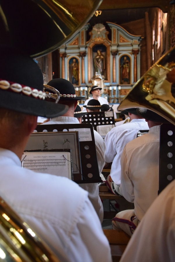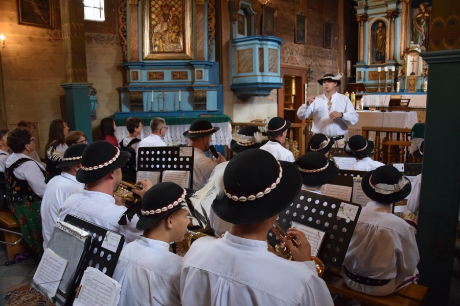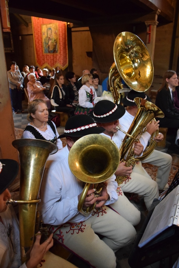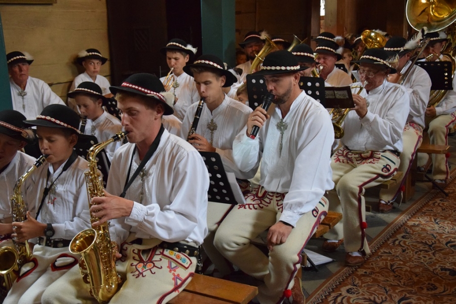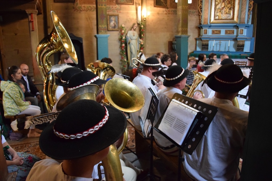 W kościele parasole były niepotrzebne, można więc było do woli rozkoszować się okolicznościowym anturażem. A ten, przyznać trzeba, był zacny. Niezmiennie zachwycają wnętrza siedemnastowiecznej świątyni, a głos zabytkowych również organów zapewnia nastrój jak z innej epoki… Dźwięki zagórzańskich zespołów i orkiestr dętych brzmią tutaj również wyjątkowo! Trzeba wszak przyznać, że akustyka obiektu sprzyja odbiorowi nabożnych pieśni. Tym razem o tę muzyczną oprawę Zagórzańskiej Mszy św. oraz ubogacenie liturgii słowa i śpiewów międzylekcyjnych zadbali muzycy z orkiestry Sami Swoi z Kasinki Małej – Zagródca. Wśród odświętnie przyodzianych w stroje regionalne Zagórzan dostrzec można było sąsiadów z Węglówki. Pociągiem retro z Chabówki na tę szczególną Eucharystię dotarło niezwykle sympatyczne małżeństwo, mieszkańcy Śląska Cieszyńskiego. Jak zwykle, swoim gospodarskim okiem ogarniał wszystko kasiński gazda, Adam Wrzecionek. Opady deszczu nie przeszkodziły również Zagórzańskim Pasjonatom Stowarzyszeniu Rękodzielników w rozstawieniu swojego stoiska z cudeńkami ludzką ręką uczynionymi. Dbają oni zawsze, aby uczestnicy Zagórzańskich Mszy św. z pobytu u Zagórzan wrócili z oryginalną pamiątką.