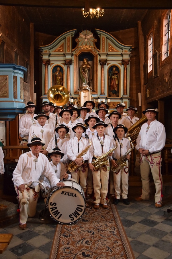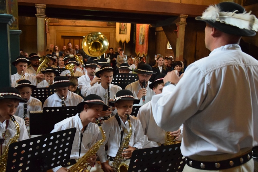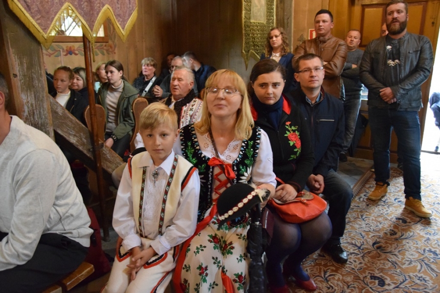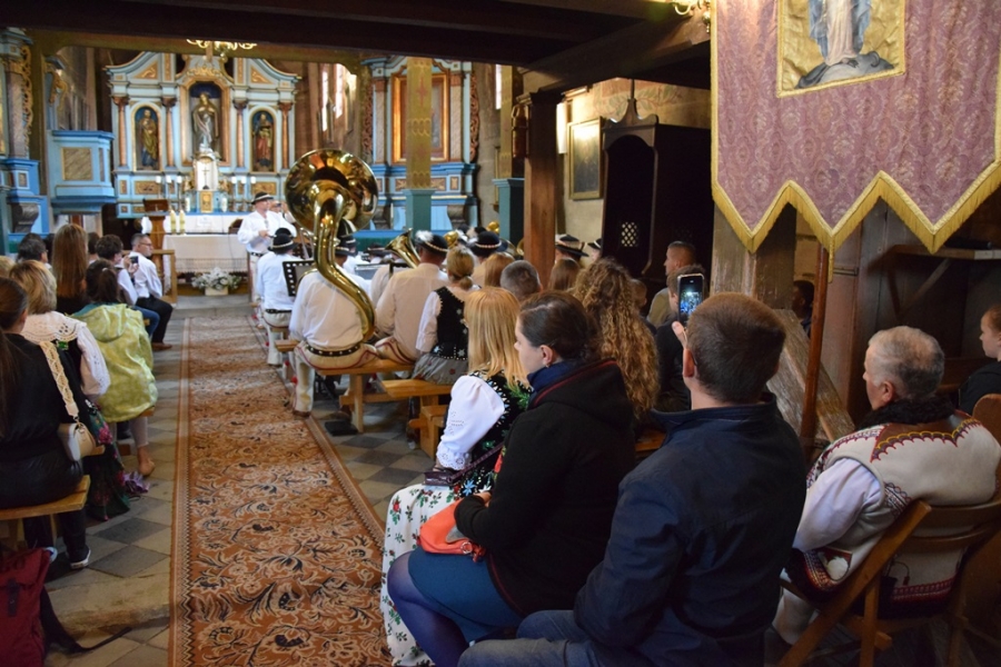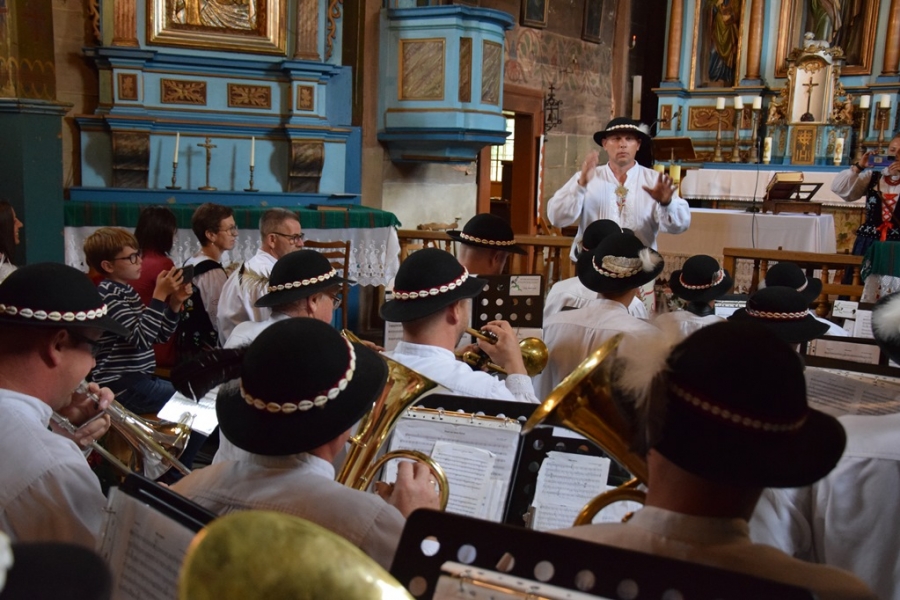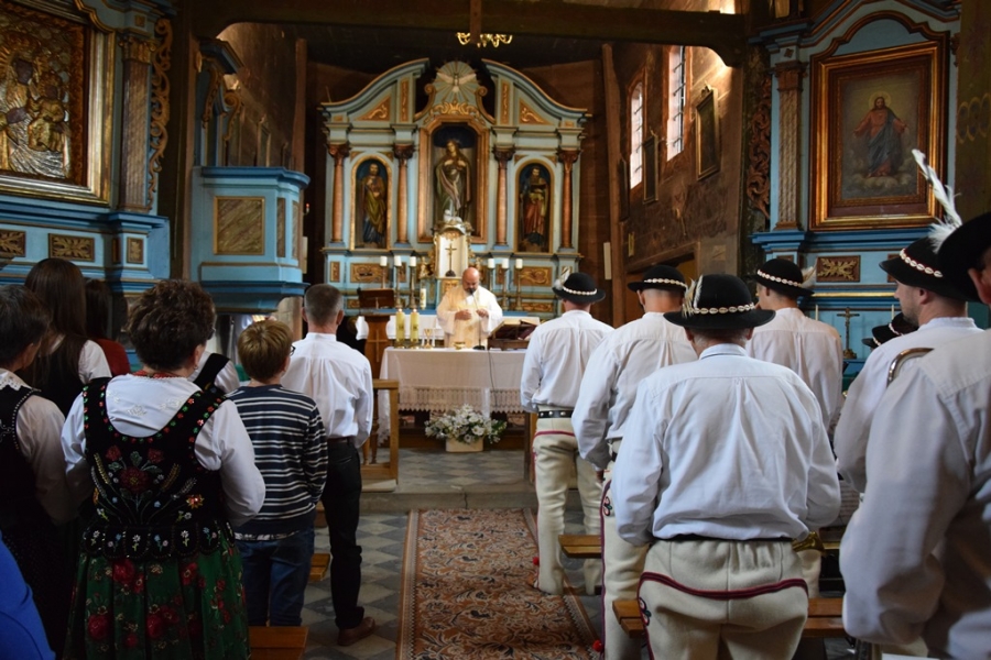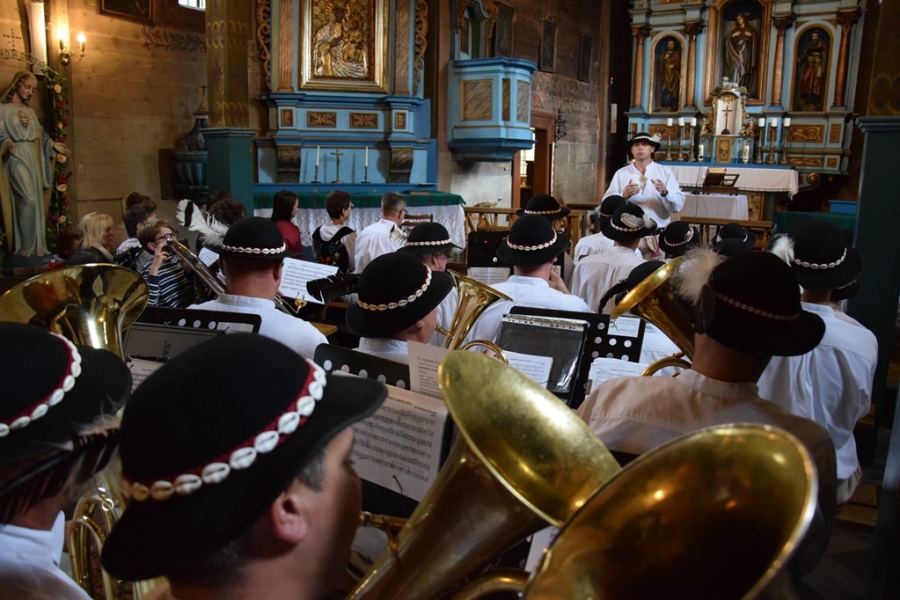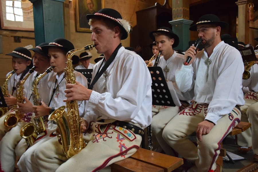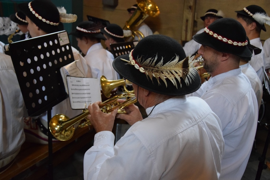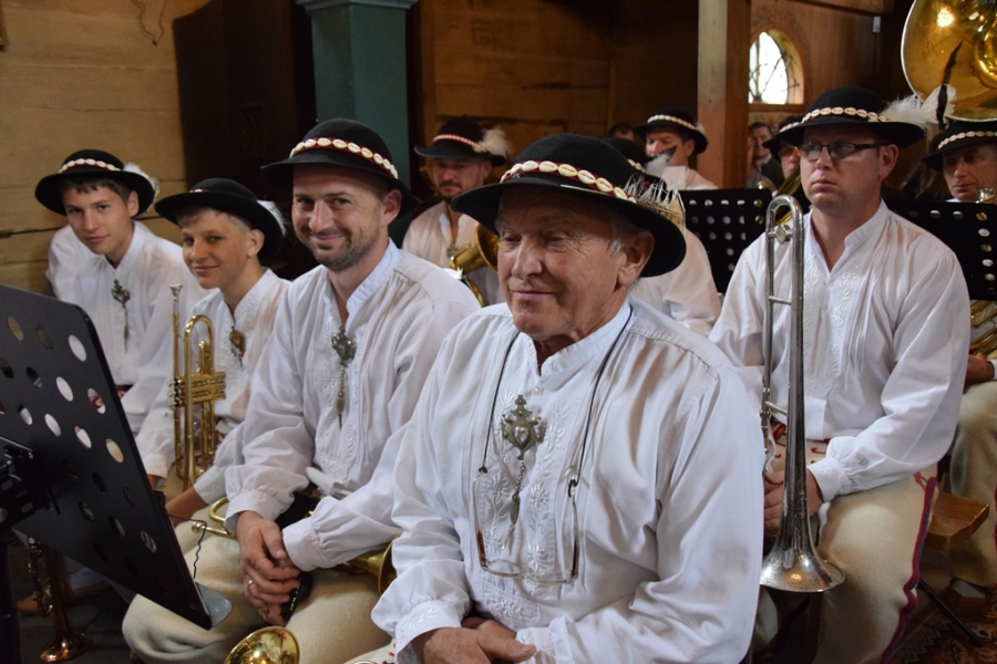 W kościele parasole były niepotrzebne, można więc było do woli rozkoszować się okolicznościowym anturażem. A ten, przyznać trzeba, był zacny. Niezmiennie zachwycają wnętrza siedemnastowiecznej świątyni, a głos zabytkowych również organów zapewnia nastrój jak z innej epoki… Dźwięki zagórzańskich zespołów i orkiestr dętych brzmią tutaj również wyjątkowo! Trzeba wszak przyznać, że akustyka obiektu sprzyja odbiorowi nabożnych pieśni. Tym razem o tę muzyczną oprawę Zagórzańskiej Mszy św. oraz ubogacenie liturgii słowa i śpiewów międzylekcyjnych zadbali muzycy z orkiestry Sami Swoi z Kasinki Małej – Zagródca. Wśród odświętnie przyodzianych w stroje regionalne Zagórzan dostrzec można było sąsiadów z Węglówki. Pociągiem retro z Chabówki na tę szczególną Eucharystię dotarło niezwykle sympatyczne małżeństwo, mieszkańcy Śląska Cieszyńskiego. Jak zwykle, swoim gospodarskim okiem ogarniał wszystko kasiński gazda, Adam Wrzecionek. Opady deszczu nie przeszkodziły również Zagórzańskim Pasjonatom Stowarzyszeniu Rękodzielników w rozstawieniu swojego stoiska z cudeńkami ludzką ręką uczynionymi. Dbają oni zawsze, aby uczestnicy Zagórzańskich Mszy św. z pobytu u Zagórzan wrócili z oryginalną pamiątką.