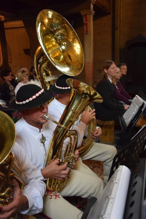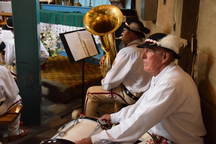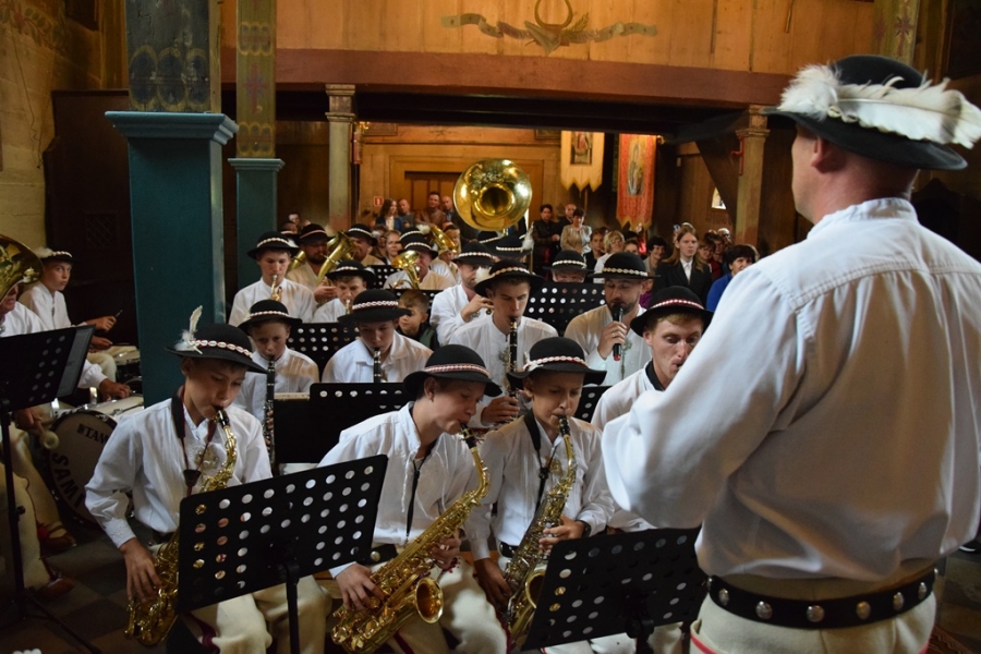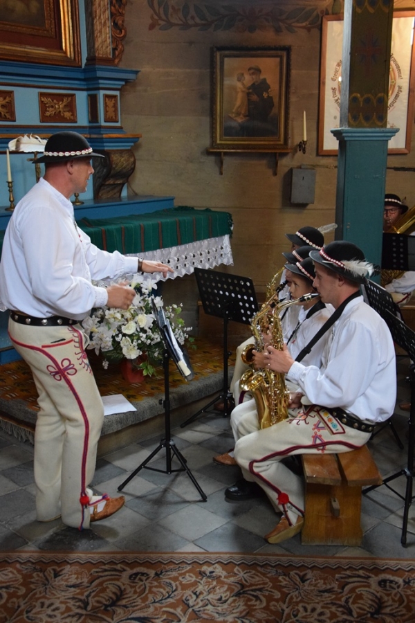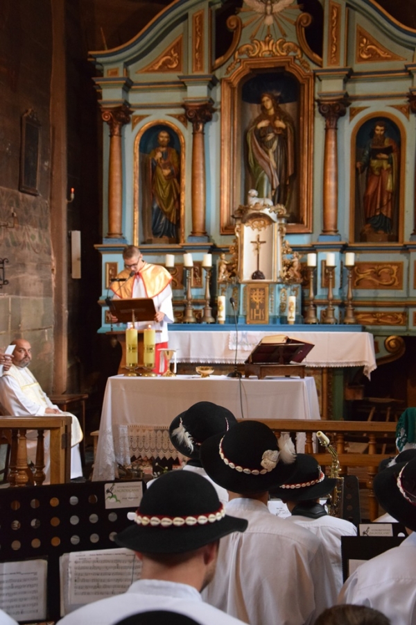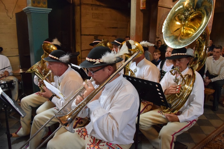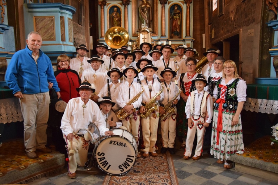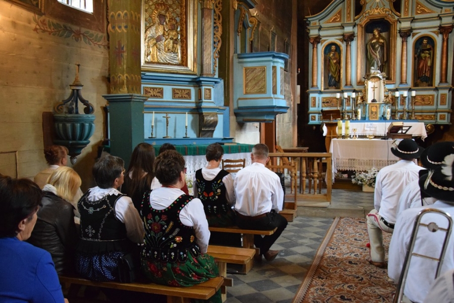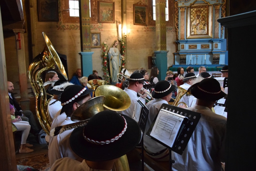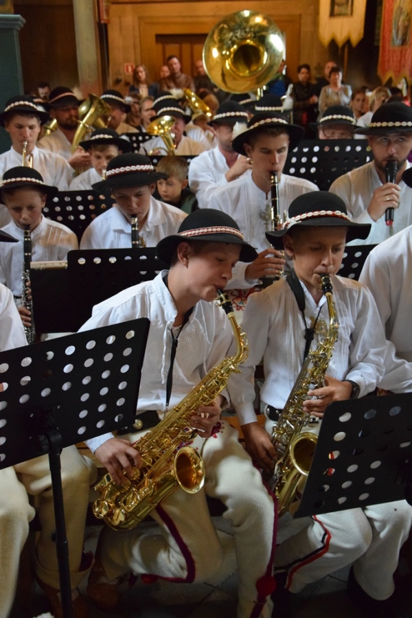 W kościele parasole były niepotrzebne, można więc było do woli rozkoszować się okolicznościowym anturażem. A ten, przyznać trzeba, był zacny. Niezmiennie zachwycają wnętrza siedemnastowiecznej świątyni, a głos zabytkowych również organów zapewnia nastrój jak z innej epoki… Dźwięki zagórzańskich zespołów i orkiestr dętych brzmią tutaj również wyjątkowo! Trzeba wszak przyznać, że akustyka obiektu sprzyja odbiorowi nabożnych pieśni. Tym razem o tę muzyczną oprawę Zagórzańskiej Mszy św. oraz ubogacenie liturgii słowa i śpiewów międzylekcyjnych zadbali muzycy z orkiestry Sami Swoi z Kasinki Małej – Zagródca. Wśród odświętnie przyodzianych w stroje regionalne Zagórzan dostrzec można było sąsiadów z Węglówki. Pociągiem retro z Chabówki na tę szczególną Eucharystię dotarło niezwykle sympatyczne małżeństwo, mieszkańcy Śląska Cieszyńskiego. Jak zwykle, swoim gospodarskim okiem ogarniał wszystko kasiński gazda, Adam Wrzecionek. Opady deszczu nie przeszkodziły również Zagórzańskim Pasjonatom Stowarzyszeniu Rękodzielników w rozstawieniu swojego stoiska z cudeńkami ludzką ręką uczynionymi. Dbają oni zawsze, aby uczestnicy Zagórzańskich Mszy św. z pobytu u Zagórzan wrócili z oryginalną pamiątką.