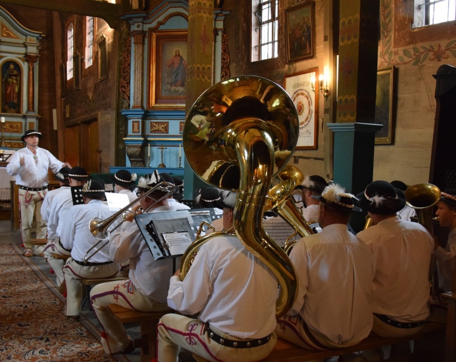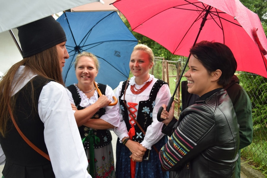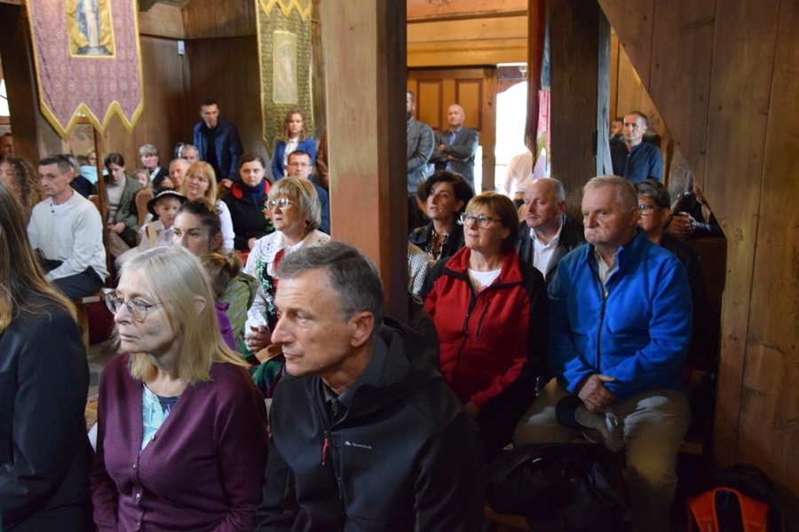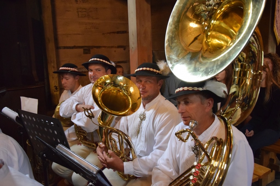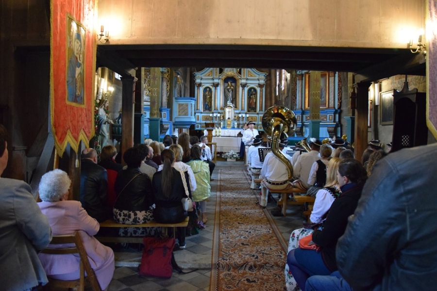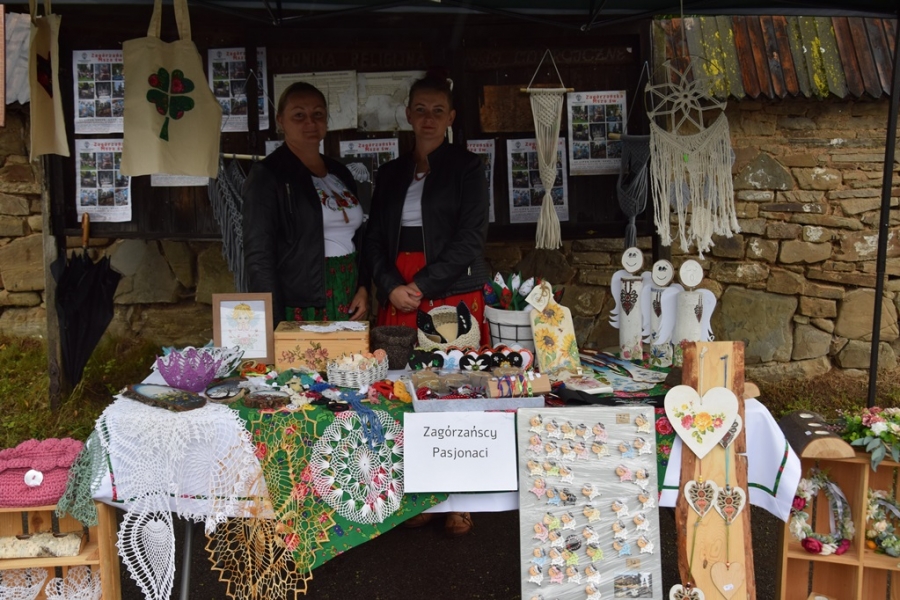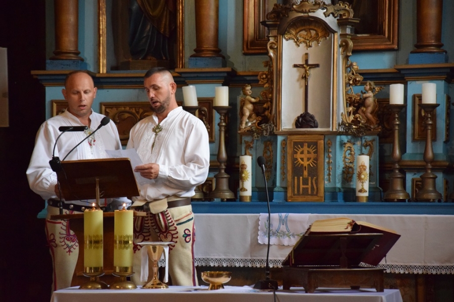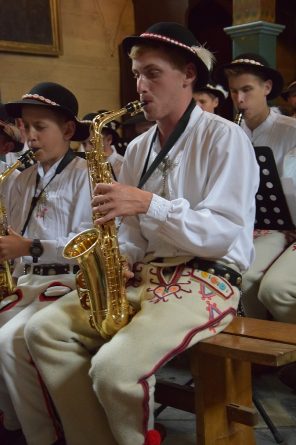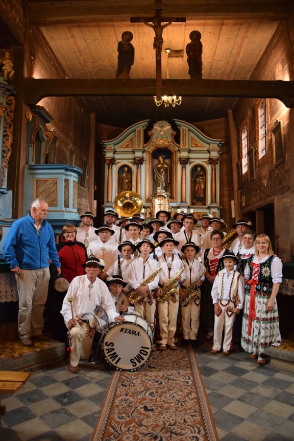 W kościele parasole były niepotrzebne, można więc było do woli rozkoszować się okolicznościowym anturażem. A ten, przyznać trzeba, był zacny. Niezmiennie zachwycają wnętrza siedemnastowiecznej świątyni, a głos zabytkowych również organów zapewnia nastrój jak z innej epoki… Dźwięki zagórzańskich zespołów i orkiestr dętych brzmią tutaj również wyjątkowo! Trzeba wszak przyznać, że akustyka obiektu sprzyja odbiorowi nabożnych pieśni. Tym razem o tę muzyczną oprawę Zagórzańskiej Mszy św. oraz ubogacenie liturgii słowa i śpiewów międzylekcyjnych zadbali muzycy z orkiestry Sami Swoi z Kasinki Małej – Zagródca. Wśród odświętnie przyodzianych w stroje regionalne Zagórzan dostrzec można było sąsiadów z Węglówki. Pociągiem retro z Chabówki na tę szczególną Eucharystię dotarło niezwykle sympatyczne małżeństwo, mieszkańcy Śląska Cieszyńskiego. Jak zwykle, swoim gospodarskim okiem ogarniał wszystko kasiński gazda, Adam Wrzecionek. Opady deszczu nie przeszkodziły również Zagórzańskim Pasjonatom Stowarzyszeniu Rękodzielników w rozstawieniu swojego stoiska z cudeńkami ludzką ręką uczynionymi. Dbają oni zawsze, aby uczestnicy Zagórzańskich Mszy św. z pobytu u Zagórzan wrócili z oryginalną pamiątką.