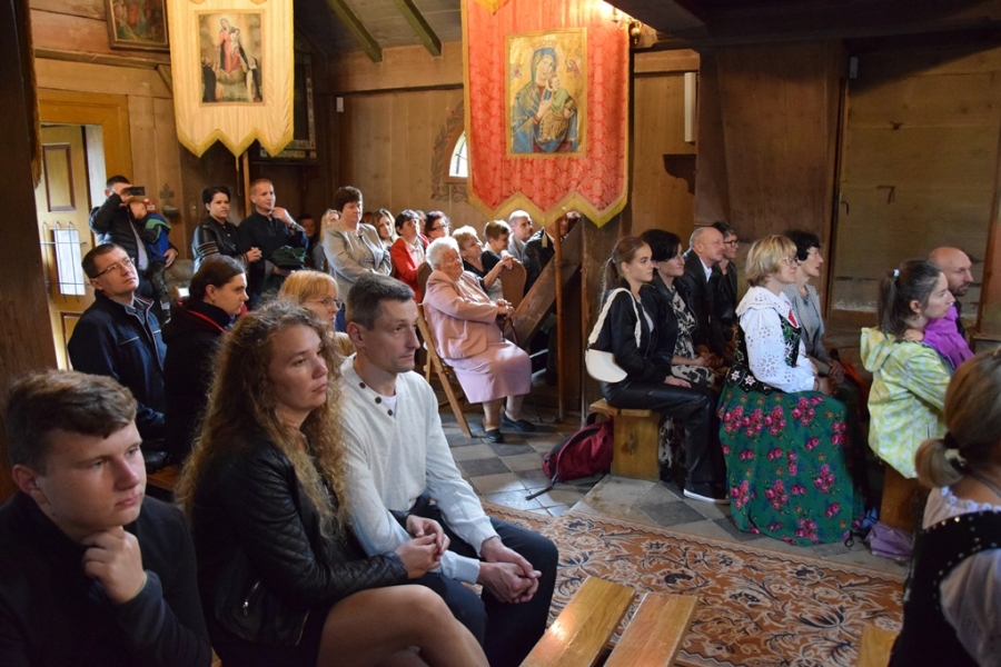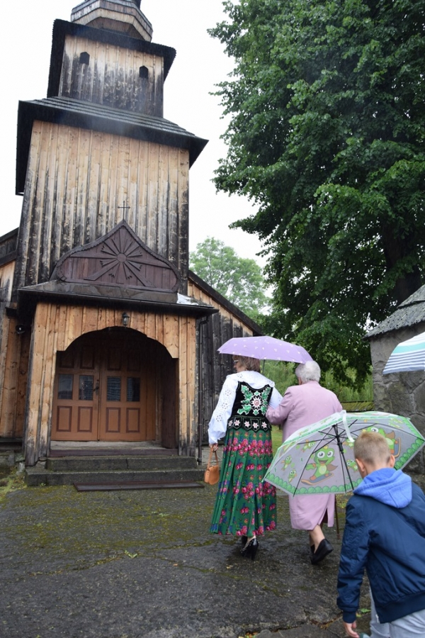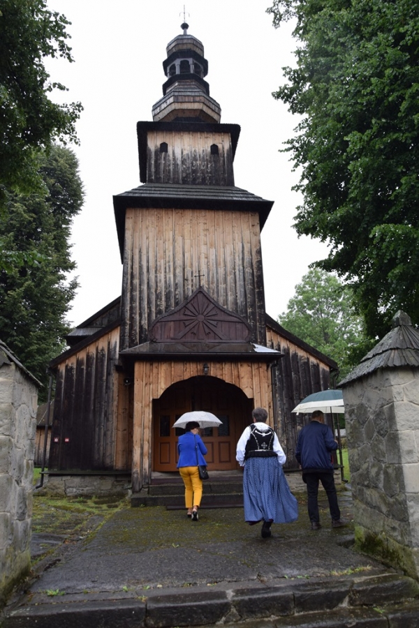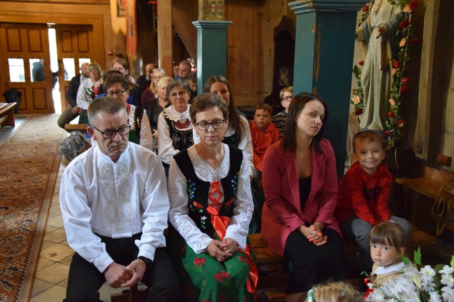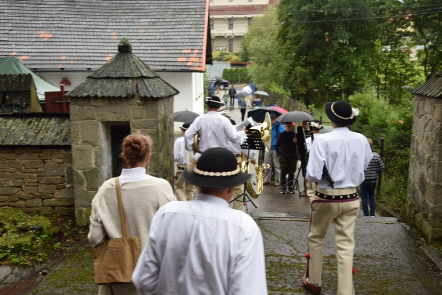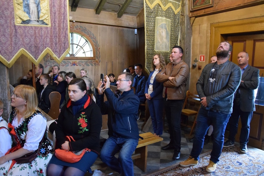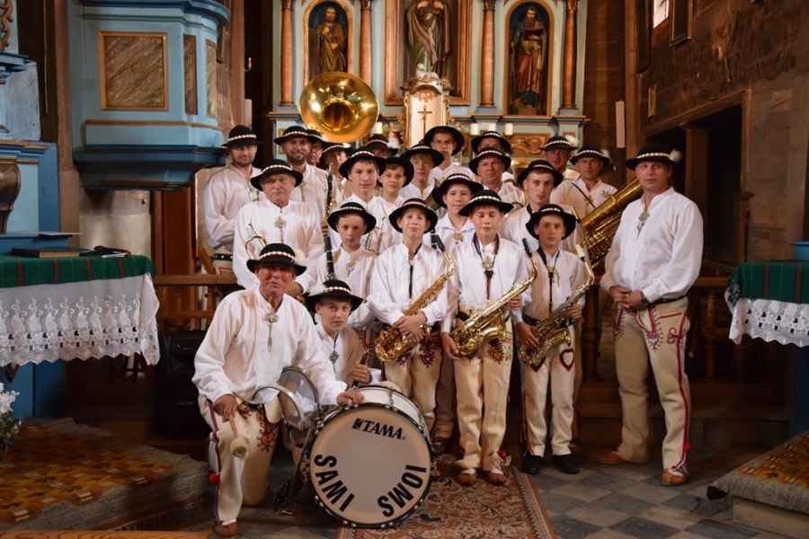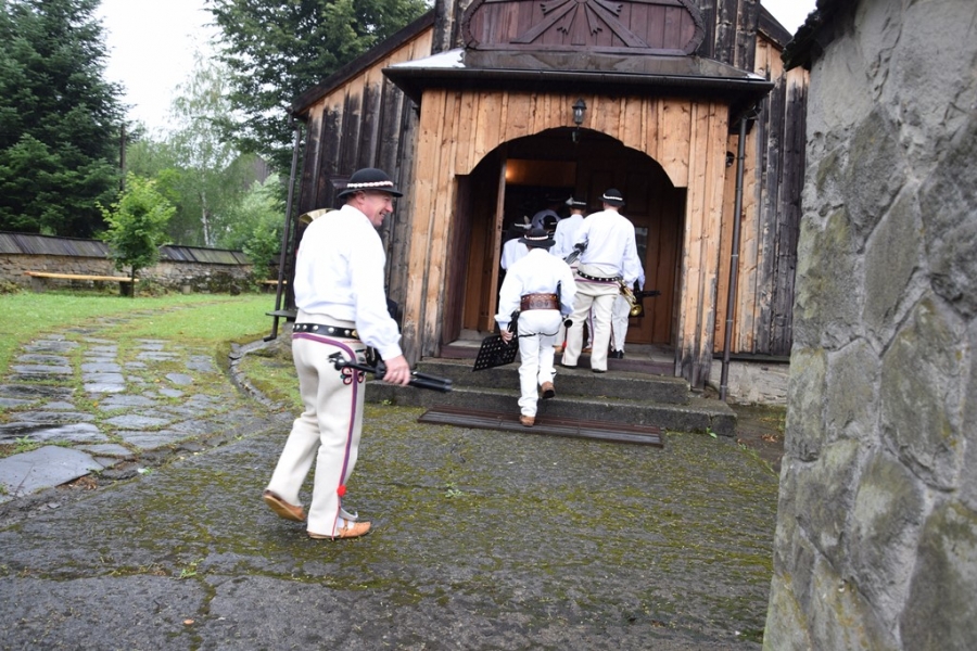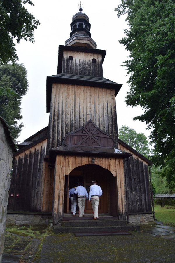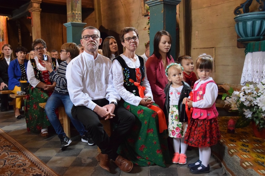 W kościele parasole były niepotrzebne, można więc było do woli rozkoszować się okolicznościowym anturażem. A ten, przyznać trzeba, był zacny. Niezmiennie zachwycają wnętrza siedemnastowiecznej świątyni, a głos zabytkowych również organów zapewnia nastrój jak z innej epoki… Dźwięki zagórzańskich zespołów i orkiestr dętych brzmią tutaj również wyjątkowo! Trzeba wszak przyznać, że akustyka obiektu sprzyja odbiorowi nabożnych pieśni. Tym razem o tę muzyczną oprawę Zagórzańskiej Mszy św. oraz ubogacenie liturgii słowa i śpiewów międzylekcyjnych zadbali muzycy z orkiestry Sami Swoi z Kasinki Małej – Zagródca. Wśród odświętnie przyodzianych w stroje regionalne Zagórzan dostrzec można było sąsiadów z Węglówki. Pociągiem retro z Chabówki na tę szczególną Eucharystię dotarło niezwykle sympatyczne małżeństwo, mieszkańcy Śląska Cieszyńskiego. Jak zwykle, swoim gospodarskim okiem ogarniał wszystko kasiński gazda, Adam Wrzecionek. Opady deszczu nie przeszkodziły również Zagórzańskim Pasjonatom Stowarzyszeniu Rękodzielników w rozstawieniu swojego stoiska z cudeńkami ludzką ręką uczynionymi. Dbają oni zawsze, aby uczestnicy Zagórzańskich Mszy św. z pobytu u Zagórzan wrócili z oryginalną pamiątką.