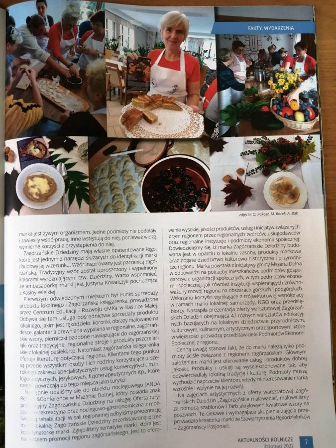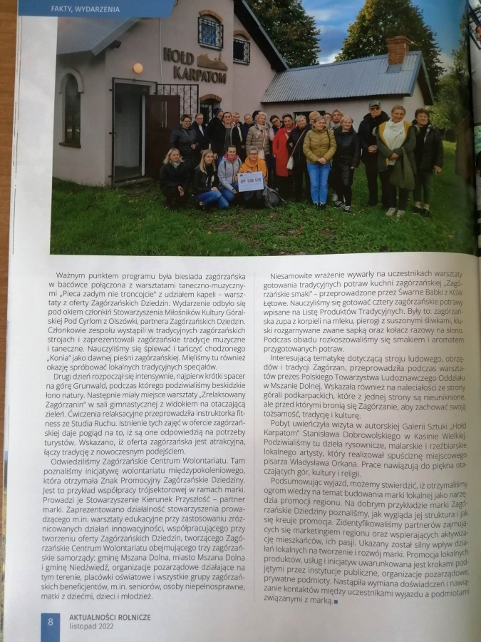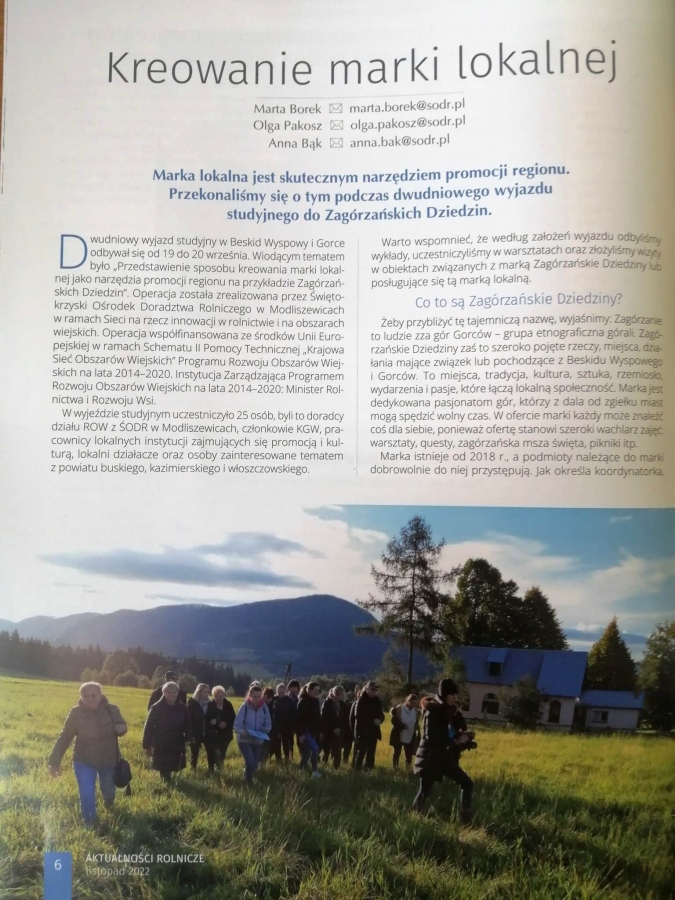 Tworzona przez Zagórzan marka lokalna posłużyła Marcie Borek, Oldze Pakosz i Annie Bąk ze Świętokrzyskiego Ośrodka Doradztwa Rolniczego w Modliszewicach jako przykład do opisania sposobu promocji regionu przez najwyższej jakości produkty, usługi i inicjatywy ściśle związane z Regionem Zagórzańskim. Swoją opowieść o markowym miejscu autorki artykułu oparły na osobistych doświadczeniach, które stały się ich udziałem podczas zorganizowanej w Zagórzańskich Dziedzinach wizyty studyjnej (link). Swoją wiedzą i zagórzańskimi przeżyciami podzieliły się z czytelnikami branżowego czasopisma.