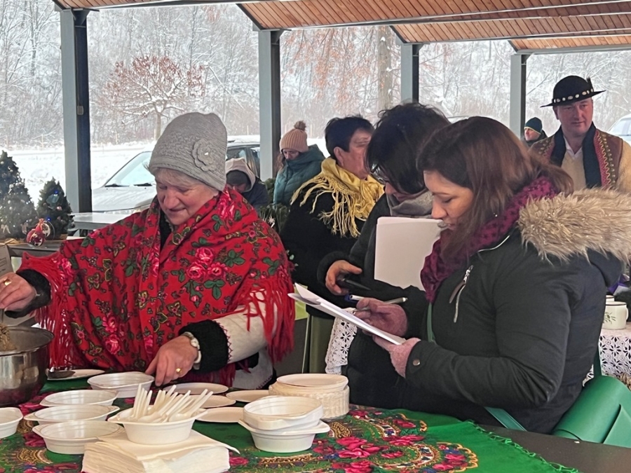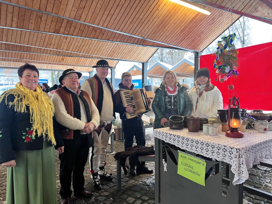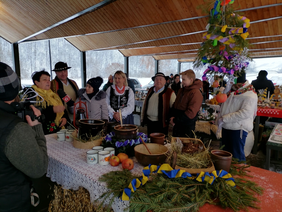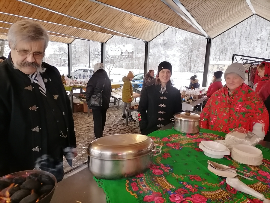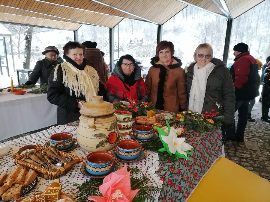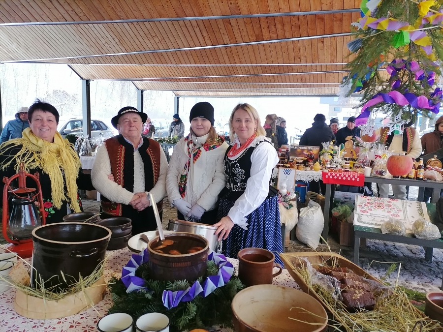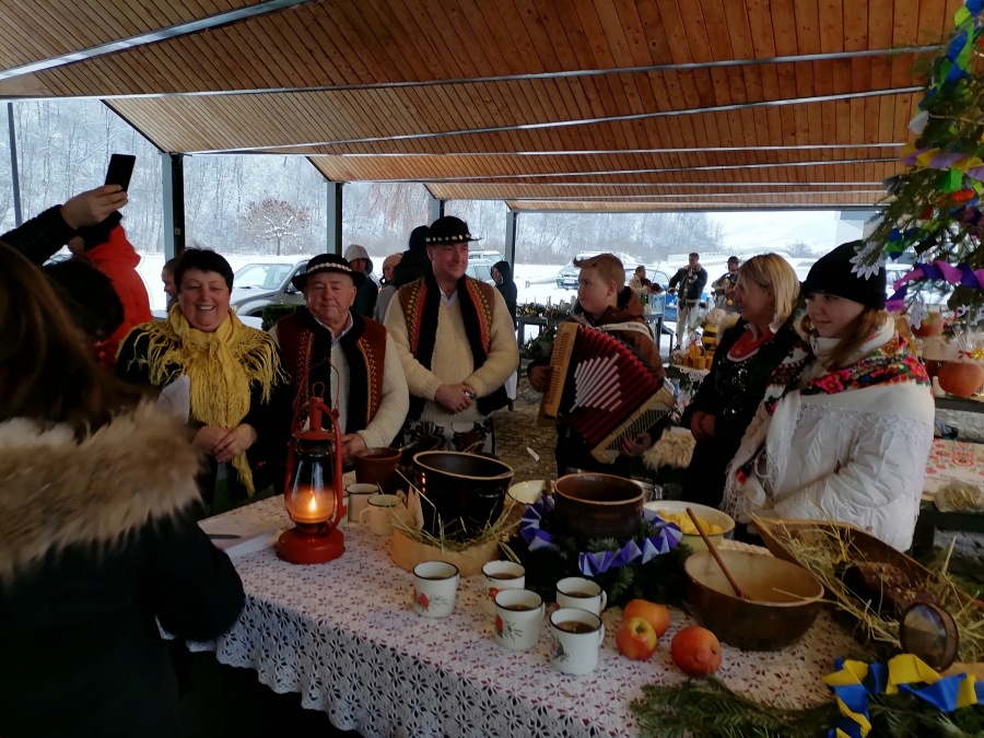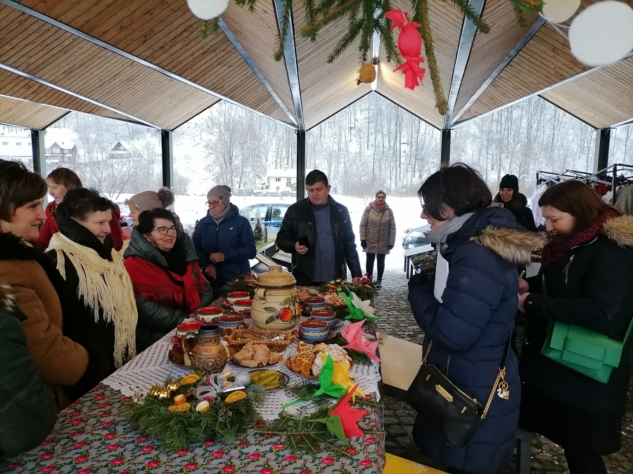 Kto był, nie żałuje – wyjście z domu w taką pogodę wymagało odwagi, ale atmosferę mieliśmy gorącą! Klimatyczne oświetlenie świąteczne zapewniła firma „Dropel”, kapela Kościelniaków ze Stowarzyszenia „Pod Cyrlom” oraz dzieci i młodzież z Gminnego Zespołu Pieśni i Tańca „Halny” kolędowali bez miary, a Stowarzyszenie „Kierunek Przyszłość” zorganizowało pierwszy Konkurs Potraw Wigilijnych. O godz. 14:00 odbyła się prezentacja potraw dla jury. W szranki stanęły cztery zespoły: KGW Olszówka, Klub „Senior +” z Mszany Dolnej, „Rysiowe” z Poręby Wielkiej oraz rodzina Woźniaków z Koniny. Nie tylko smak zgłoszonych potraw był tutaj ważny; oceniana była również oprawa stołu oraz prezentacja dania i posiadana na temat tradycji zagórzańskich wiedza. A powołane do oceny jury to prawdziwi specjaliści i znawcy tematu: Katarzyna Ceklarz – dr etnologii, socjolog, specjalistka w tematyce zagórzańskiej, autorka wielu publikacji związanych z naszym regionem, Małgorzata Wójtowicz-Wierzbicka – etnograf, adiunkt z Muzeum im. Wł. Orkana w Rabce , specjalistka od starych przepisów kulinarnych i receptur oraz Paweł Kołodziej zawodowy kucharz, współtwórca programów kulinarnych z Mikołajem Rejem, właściciel Pizzerii Szapo ba. Decyzja wybrania najlepszego dania okazała się bardzo trudna; obrady trwały i trwały, nawet próby przyspieszenia werdyktu nic nie dały… Na szczęście głodnych wyników dokarmiali uczestnicy, więc każdy, kto w tym czasie pojawił się na Jarmarku, mógł posmakować konkursowych potraw. Ostatecznie pierwszą nagrodę zdobyła rodzina Woźniaków z Koniny; dwa równorzędne drugie miejsca przyznano Rysiom i Klubowi Senior+, a trzecie miejsce zawędrowało do KGW Olszówka. Trzeba jednak zaznaczyć, że o wynikach zadecydowały tak naprawdę szczegóły, ponieważ poziom prezentacji konkursowych był wysoki i bardzo wyrównany. Nagrodzonym gratulowała Karolina Maria Zapała, Prezes Stowarzyszenia Kierunek Przyszłość, organizatorka konkursu.