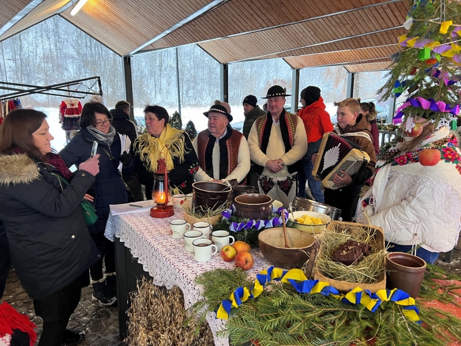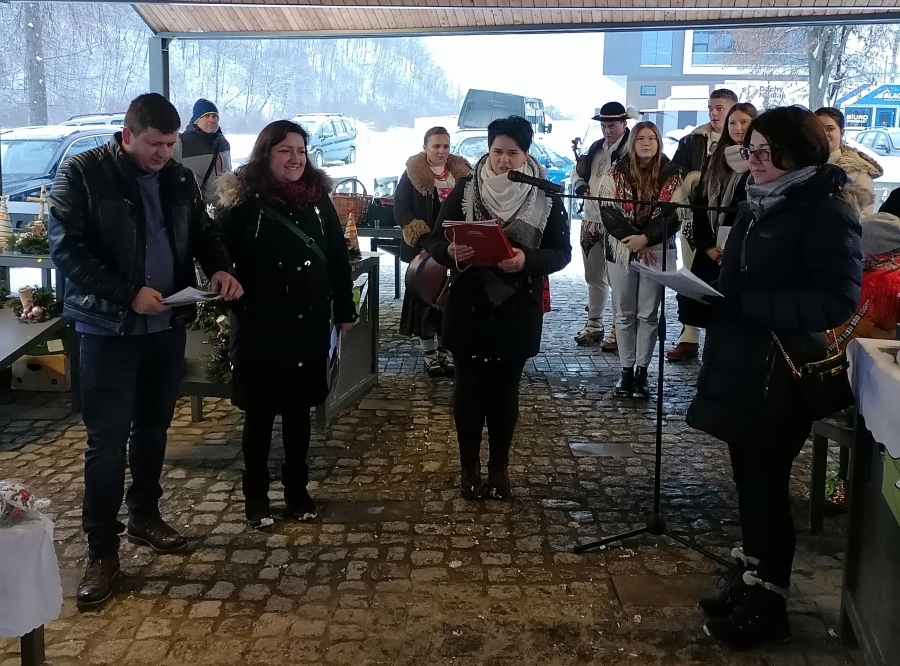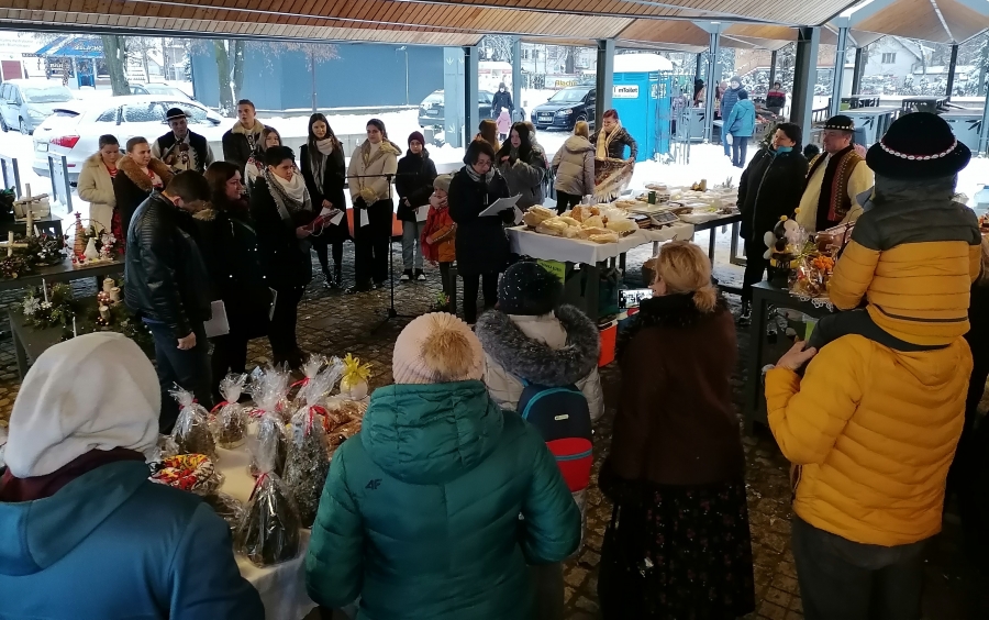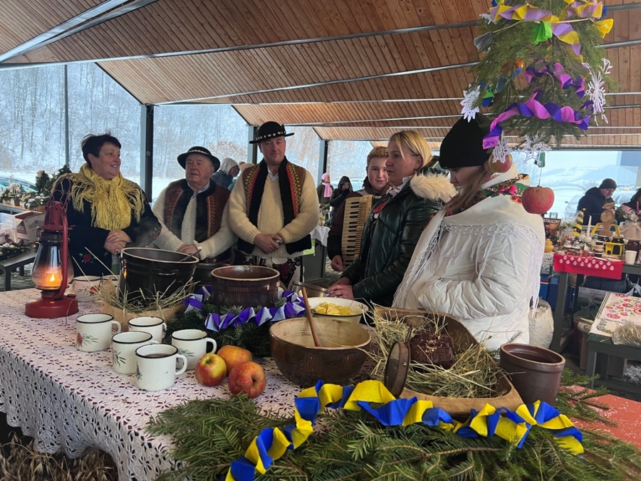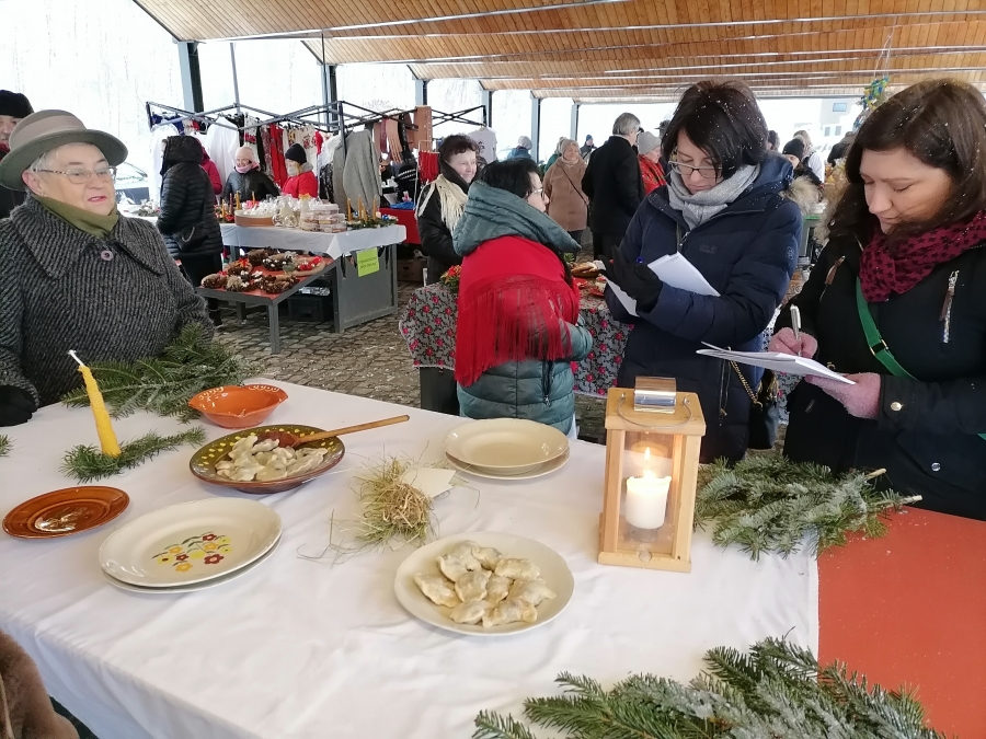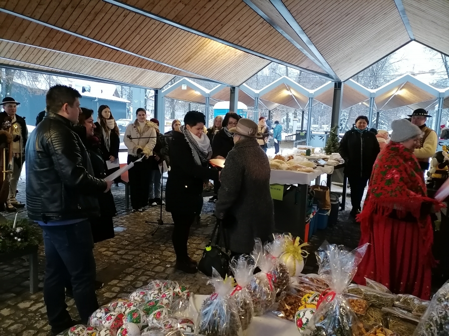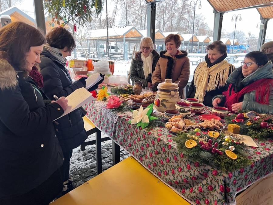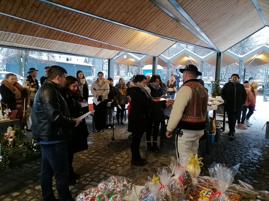 Kto był, nie żałuje – wyjście z domu w taką pogodę wymagało odwagi, ale atmosferę mieliśmy gorącą! Klimatyczne oświetlenie świąteczne zapewniła firma „Dropel”, kapela Kościelniaków ze Stowarzyszenia „Pod Cyrlom” oraz dzieci i młodzież z Gminnego Zespołu Pieśni i Tańca „Halny” kolędowali bez miary, a Stowarzyszenie „Kierunek Przyszłość” zorganizowało pierwszy Konkurs Potraw Wigilijnych. O godz. 14:00 odbyła się prezentacja potraw dla jury. W szranki stanęły cztery zespoły: KGW Olszówka, Klub „Senior +” z Mszany Dolnej, „Rysiowe” z Poręby Wielkiej oraz rodzina Woźniaków z Koniny. Nie tylko smak zgłoszonych potraw był tutaj ważny; oceniana była również oprawa stołu oraz prezentacja dania i posiadana na temat tradycji zagórzańskich wiedza. A powołane do oceny jury to prawdziwi specjaliści i znawcy tematu: Katarzyna Ceklarz – dr etnologii, socjolog, specjalistka w tematyce zagórzańskiej, autorka wielu publikacji związanych z naszym regionem, Małgorzata Wójtowicz-Wierzbicka – etnograf, adiunkt z Muzeum im. Wł. Orkana w Rabce , specjalistka od starych przepisów kulinarnych i receptur oraz Paweł Kołodziej zawodowy kucharz, współtwórca programów kulinarnych z Mikołajem Rejem, właściciel Pizzerii Szapo ba. Decyzja wybrania najlepszego dania okazała się bardzo trudna; obrady trwały i trwały, nawet próby przyspieszenia werdyktu nic nie dały… Na szczęście głodnych wyników dokarmiali uczestnicy, więc każdy, kto w tym czasie pojawił się na Jarmarku, mógł posmakować konkursowych potraw. Ostatecznie pierwszą nagrodę zdobyła rodzina Woźniaków z Koniny; dwa równorzędne drugie miejsca przyznano Rysiom i Klubowi Senior+, a trzecie miejsce zawędrowało do KGW Olszówka. Trzeba jednak zaznaczyć, że o wynikach zadecydowały tak naprawdę szczegóły, ponieważ poziom prezentacji konkursowych był wysoki i bardzo wyrównany. Nagrodzonym gratulowała Karolina Maria Zapała, Prezes Stowarzyszenia Kierunek Przyszłość, organizatorka konkursu.