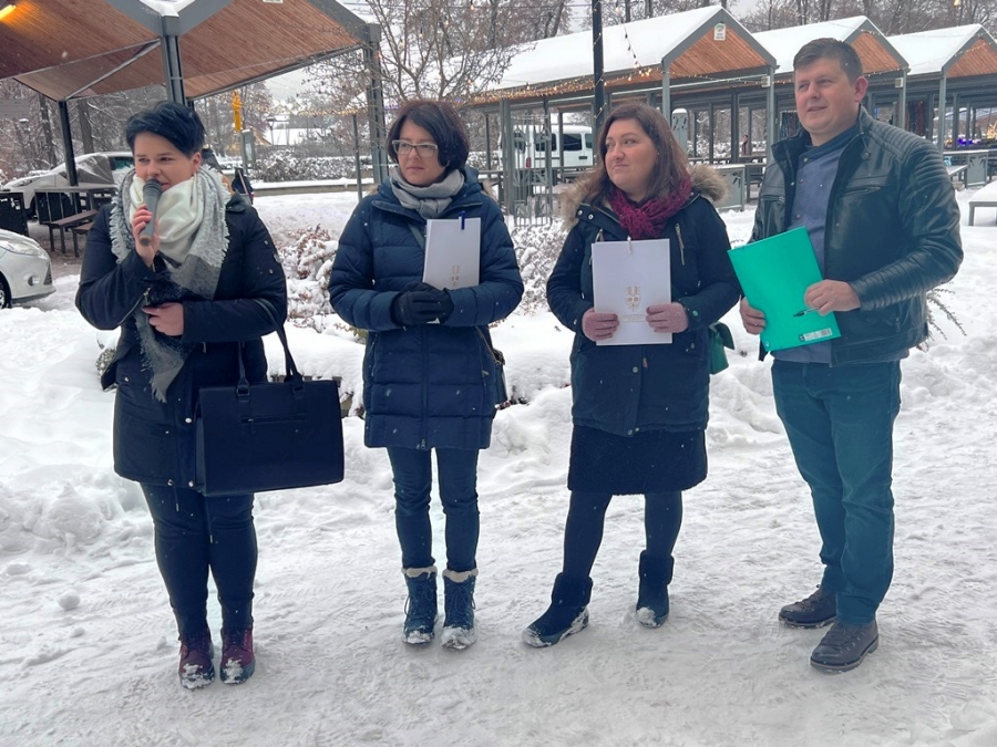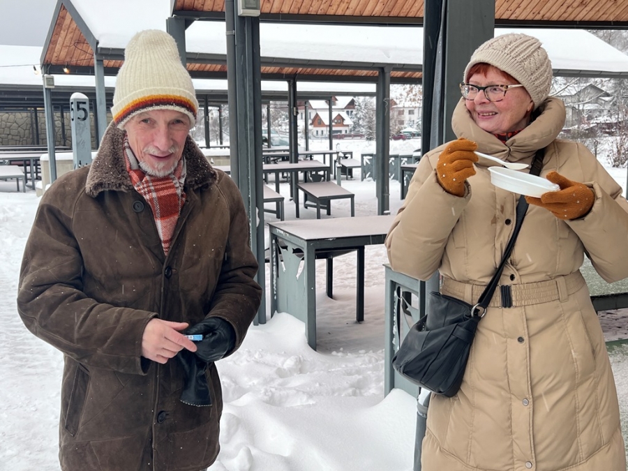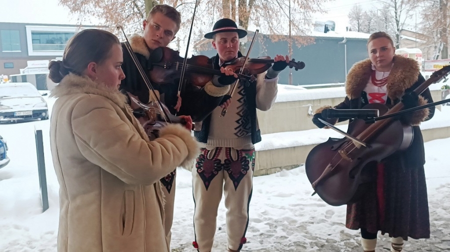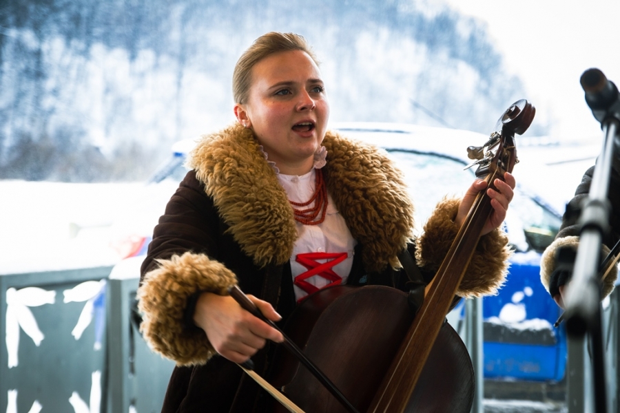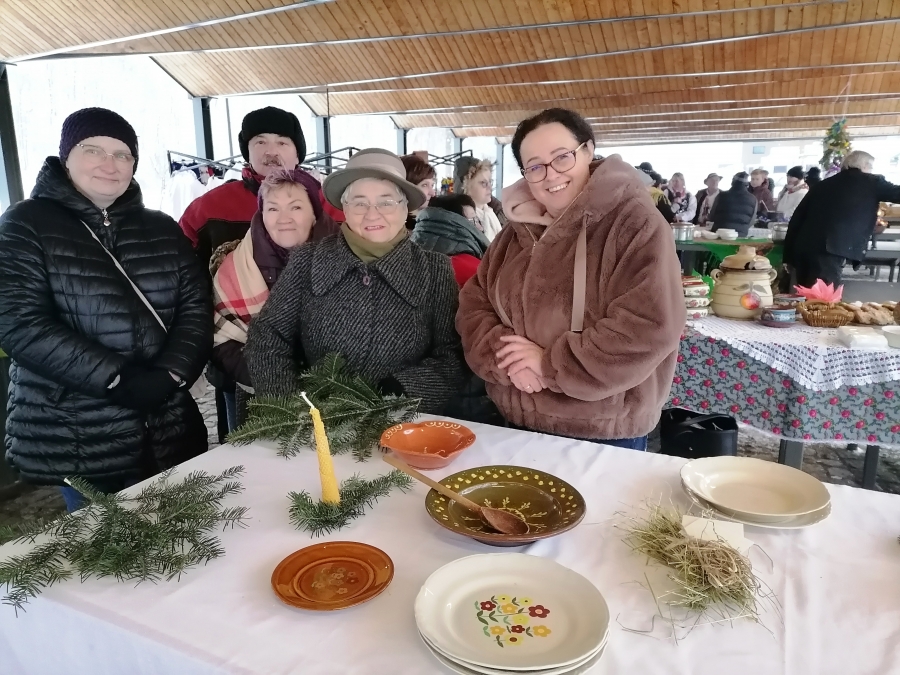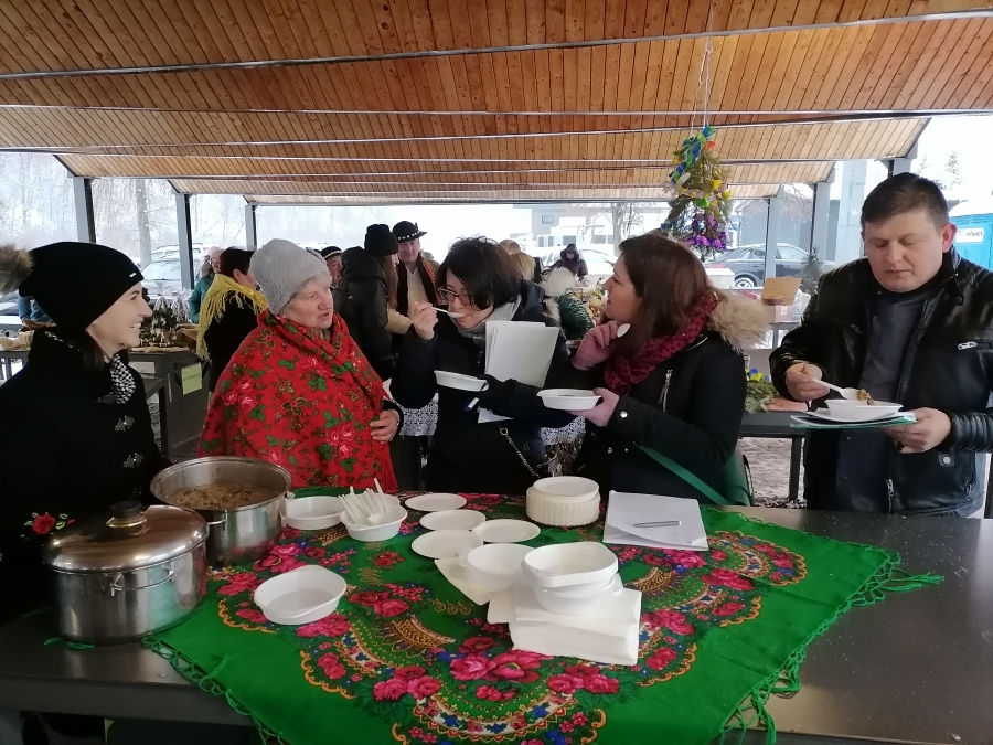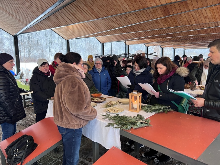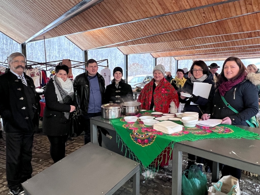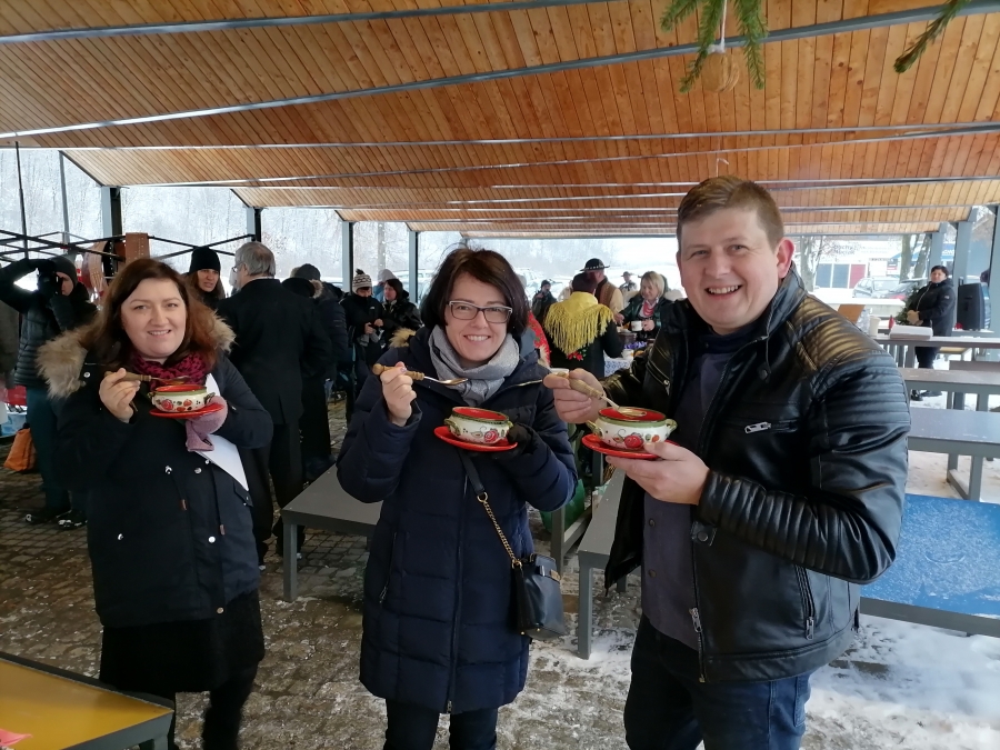 Kto był, nie żałuje – wyjście z domu w taką pogodę wymagało odwagi, ale atmosferę mieliśmy gorącą! Klimatyczne oświetlenie świąteczne zapewniła firma „Dropel”, kapela Kościelniaków ze Stowarzyszenia „Pod Cyrlom” oraz dzieci i młodzież z Gminnego Zespołu Pieśni i Tańca „Halny” kolędowali bez miary, a Stowarzyszenie „Kierunek Przyszłość” zorganizowało pierwszy Konkurs Potraw Wigilijnych. O godz. 14:00 odbyła się prezentacja potraw dla jury. W szranki stanęły cztery zespoły: KGW Olszówka, Klub „Senior +” z Mszany Dolnej, „Rysiowe” z Poręby Wielkiej oraz rodzina Woźniaków z Koniny. Nie tylko smak zgłoszonych potraw był tutaj ważny; oceniana była również oprawa stołu oraz prezentacja dania i posiadana na temat tradycji zagórzańskich wiedza. A powołane do oceny jury to prawdziwi specjaliści i znawcy tematu: Katarzyna Ceklarz – dr etnologii, socjolog, specjalistka w tematyce zagórzańskiej, autorka wielu publikacji związanych z naszym regionem, Małgorzata Wójtowicz-Wierzbicka – etnograf, adiunkt z Muzeum im. Wł. Orkana w Rabce , specjalistka od starych przepisów kulinarnych i receptur oraz Paweł Kołodziej zawodowy kucharz, współtwórca programów kulinarnych z Mikołajem Rejem, właściciel Pizzerii Szapo ba. Decyzja wybrania najlepszego dania okazała się bardzo trudna; obrady trwały i trwały, nawet próby przyspieszenia werdyktu nic nie dały… Na szczęście głodnych wyników dokarmiali uczestnicy, więc każdy, kto w tym czasie pojawił się na Jarmarku, mógł posmakować konkursowych potraw. Ostatecznie pierwszą nagrodę zdobyła rodzina Woźniaków z Koniny; dwa równorzędne drugie miejsca przyznano Rysiom i Klubowi Senior+, a trzecie miejsce zawędrowało do KGW Olszówka. Trzeba jednak zaznaczyć, że o wynikach zadecydowały tak naprawdę szczegóły, ponieważ poziom prezentacji konkursowych był wysoki i bardzo wyrównany. Nagrodzonym gratulowała Karolina Maria Zapała, Prezes Stowarzyszenia Kierunek Przyszłość, organizatorka konkursu.