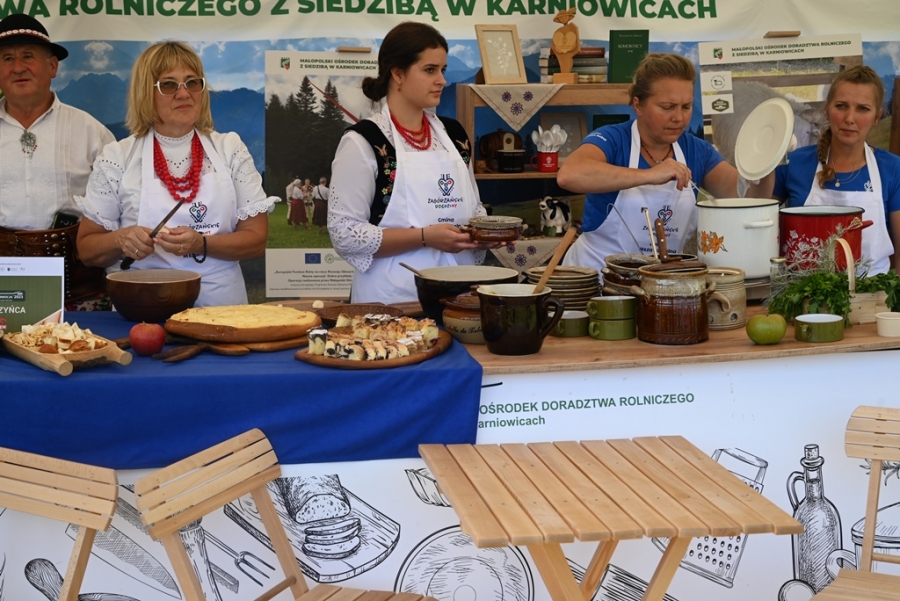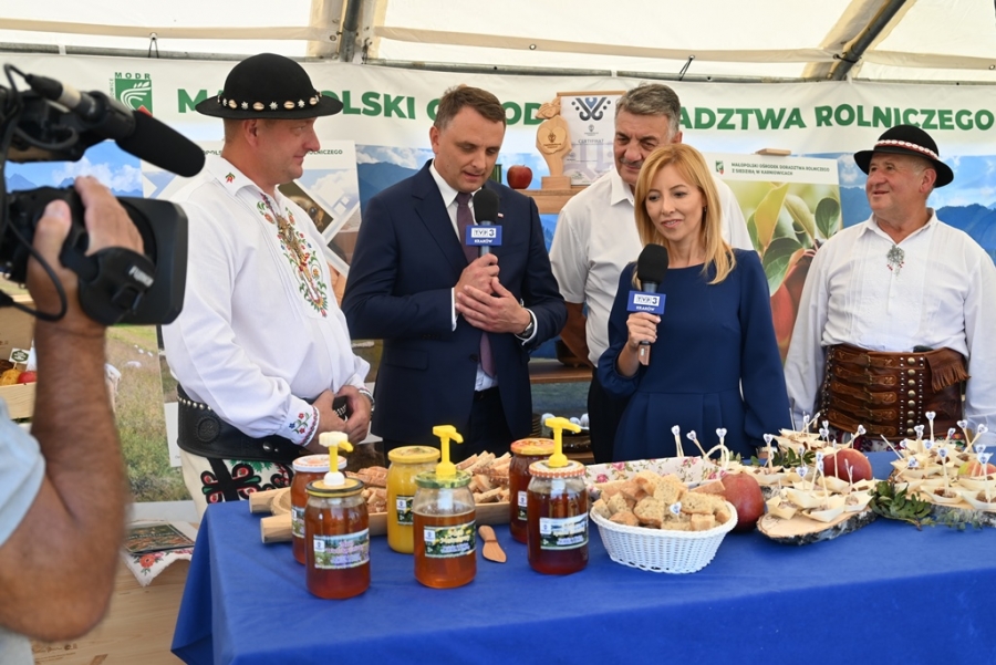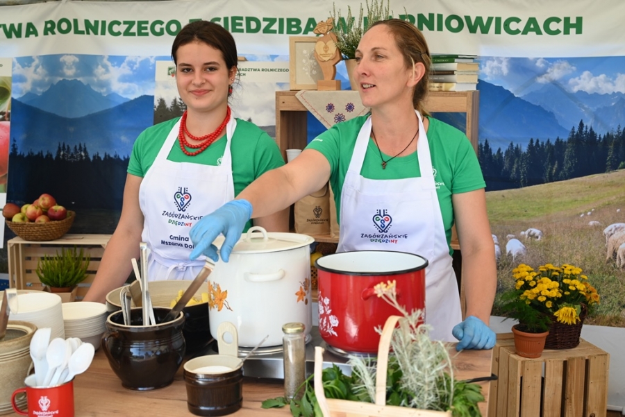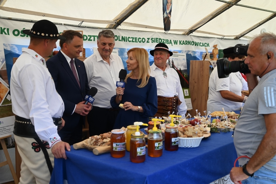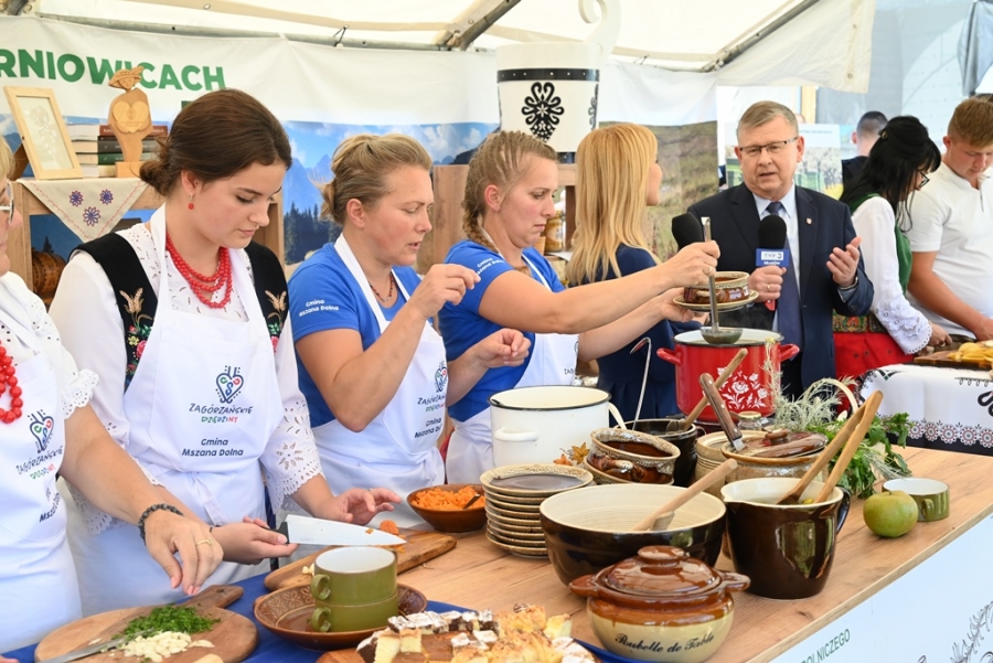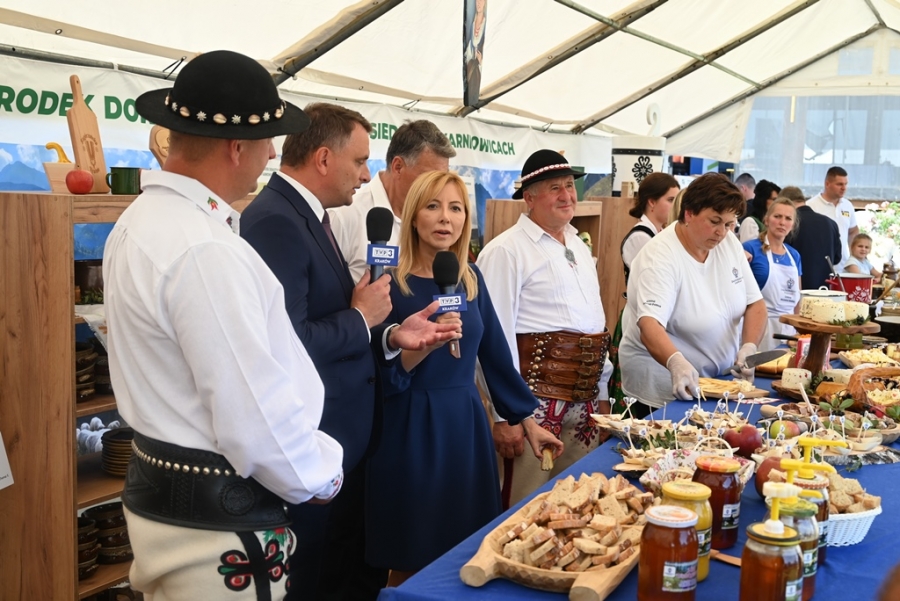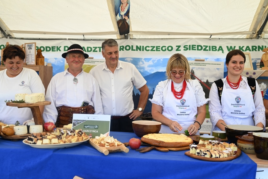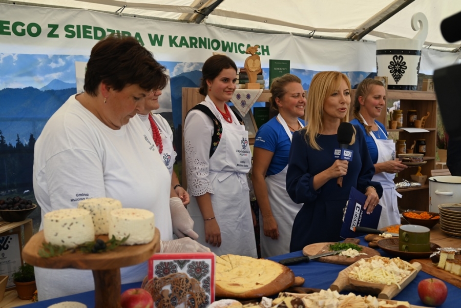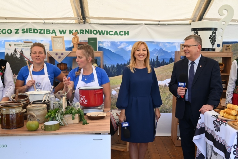 W międzyczasie trwały przygotowania na stoisku SIR – Sieci na Rzecz Innowacji w Rolnictwie i na obszarach wiejskich. Od wczesnego poranka przygotowaliśmy produkty do degustacji; a był to nie lada wyczyn, gdyż mieliśmy już pierwsze wejścia antenowe w TVP 3 Kraków. Pod nieodstępującym nas okiem kamer – w sumie pięć wejść antenowych (do obejrzenia tutaj: https://www.modr.pl/aktualnosc/zapraszamy-do-obejrzenia-relacji-z-wejsc-na-zywo-xxxi-wystawa-rolnicza-agropromocja-2023) - zaradne gospodynie, z głównodowodzącą, Moniką Kościelniak na czele, ryktowały stoisko przygotowane również dzięki Drewnianym Cudom z Kasinki (ten aktywny użytkownik Znaku Promocyjnego Zagórzańskie Dziedziny dwoił się i troił aby na wrześniowe wydarzenie do Starego Sącza przygotować skrzynie, skrzynki i okolicznościowe magnesy zamówione u niego przez organizatorów wydarzenia!). Puste półki zapełniliśmy zagórzańską literaturą, serwetami z elementami zagórzańskich zdobień zapożyczonych z naszych strojów ludowych – to piękne dzieła Barbary Łabuz z Miejskiego Ośrodka Kultury w Mszanie Dolnej; nie zabrakło przetworów wyciągniętych ze spiżarni zacnych zagórzańskich gospodyń oraz certyfikatów i statuetek bacy Bulandy - jak się mamy chwalić produktami, to tymi, które otrzymały już nasz lokalny znak jakości! A do tego jeszcze stoły uginające się od regionalnych smaków: swojskich kiełbas i innych wędlin, gorczańskich serów od Moniki Kubik, miodów z Pasieki u Piotra Woźniaka z Koniny, koszy pełnych podpłomyków wypieczonych w nocy przez zagórzańskie gospodynie, oraz chlebów… Były i wielkie kołacze z mszańskiej Piekarni SWAT i paluchy do zagryzania smalczyku. Niezwykły aromat, który zachęcał do odwiedzenia naszego stoiska, to gotujący się rosół z barana. Wszyscy, którzy nas odwiedzali, nie mogli się nachwalić zagórzańskich potraw; produkty tak szybko znikały, że ledwo nadążaliśmy z dokładką… Aromatycznym rosołem poczęstowaliśmy Witolda Kozłowskiego, Marszałka Województwa Małopolskiego, który odwiedził nasze stoisko z redaktor Olimpią Górską z TVP 3 Kraków oraz Andrzeja Guta - Mostowego - Wiceministra Sportu i Turystki. Wizytę zaanonsowała kapela Kościelniaków, która schodząc ze sceny po krótkim występie zaplanowanym w programie, sygnalizowała miejsce, gdzie można dobrze zjeść. Wszystkich znamienitych gości podejmowali Zagórzanie ubrani w regionalne stroje albo w charakterystyczne koszulki marki - by bez trudu można było do nas trafić. Rolę gospodarza stoiska pełnił gminny gazda, Bolesław Żaba, koordynator marki lokalnej Zagórzańskie Dziedziny. O współpracy i korzyściach płynących z partnerstwa i wspólnych działań marki opowiadały przed kamerą przedstawicielki Partnerów Zagórzańskich Dziedzin: Agnieszka Józefiak - Lewandowska reprezentująca Miasto Mszana Dolna oraz Lucyna Pazdur z Bazy Lubogoszcz w Kasince Małej.