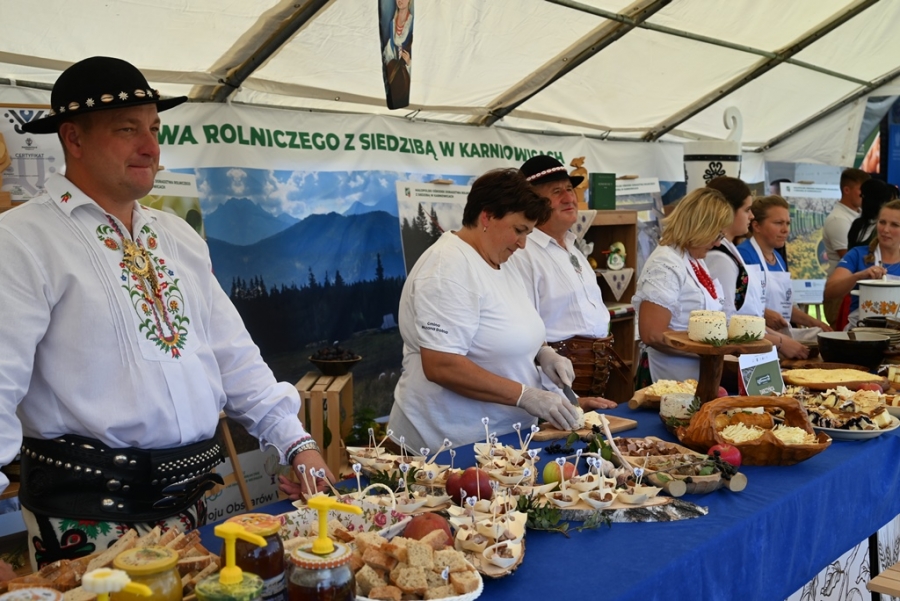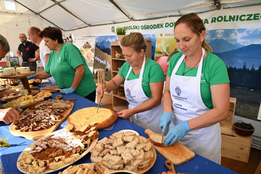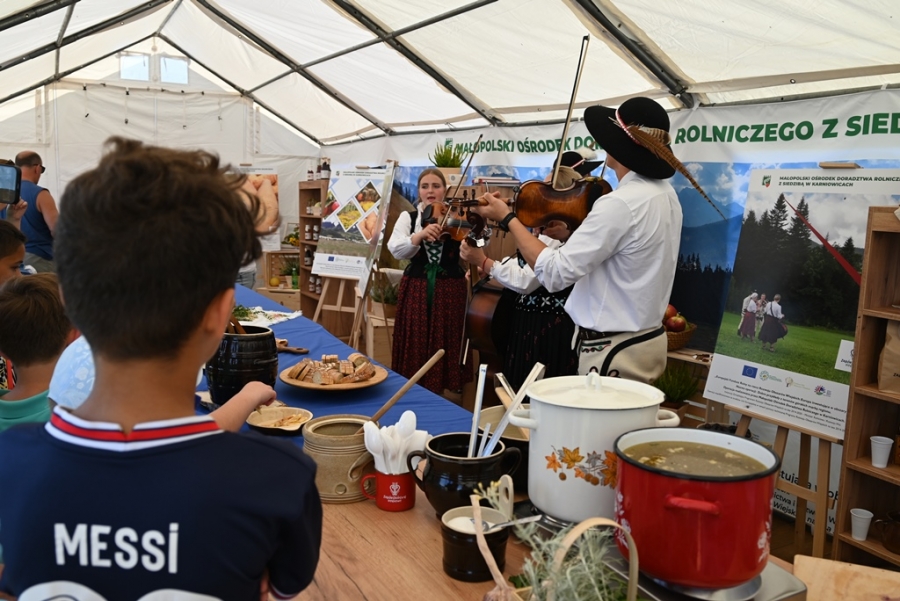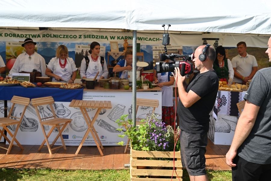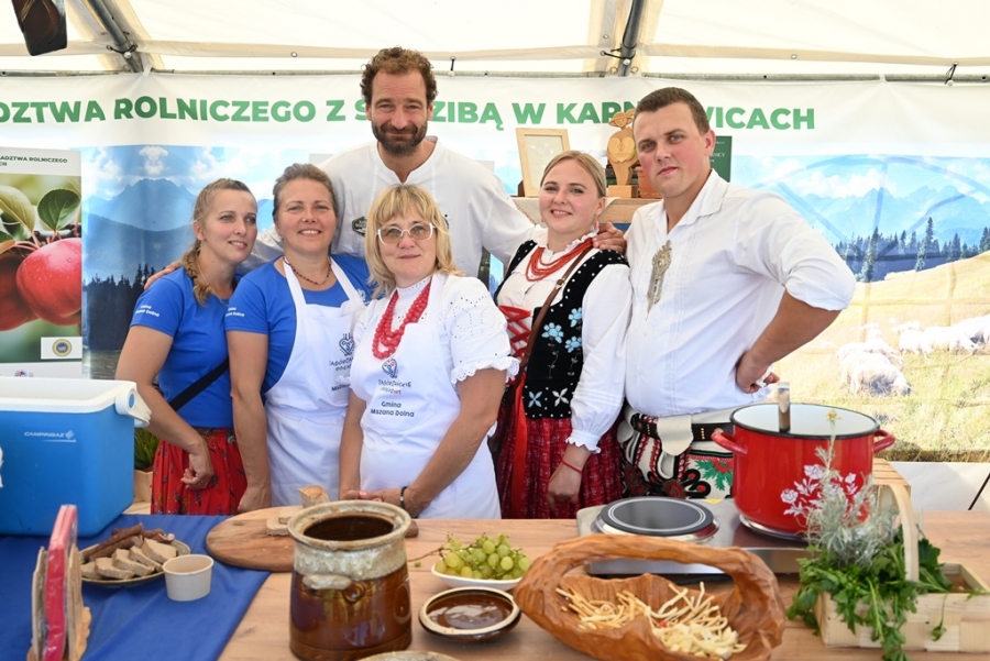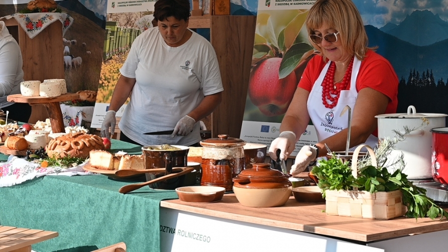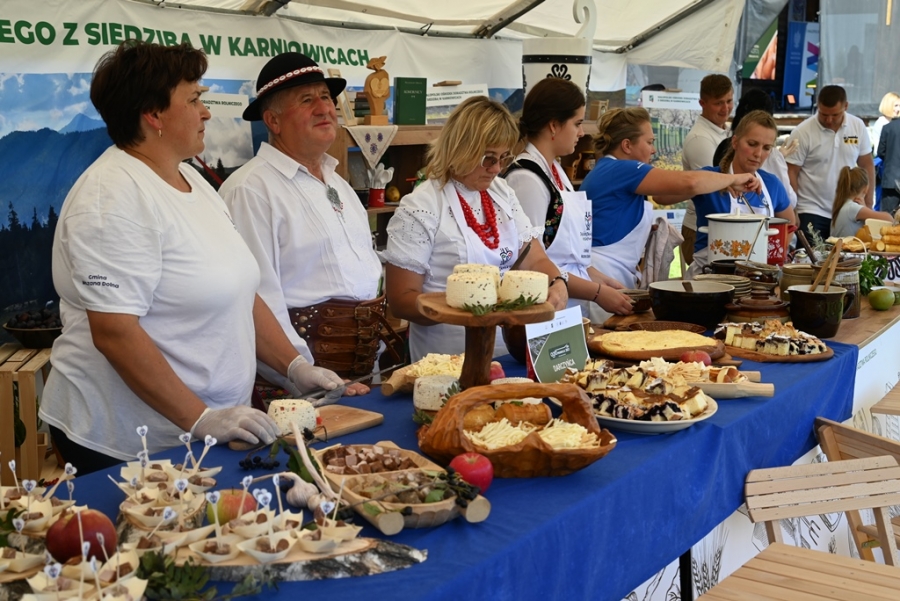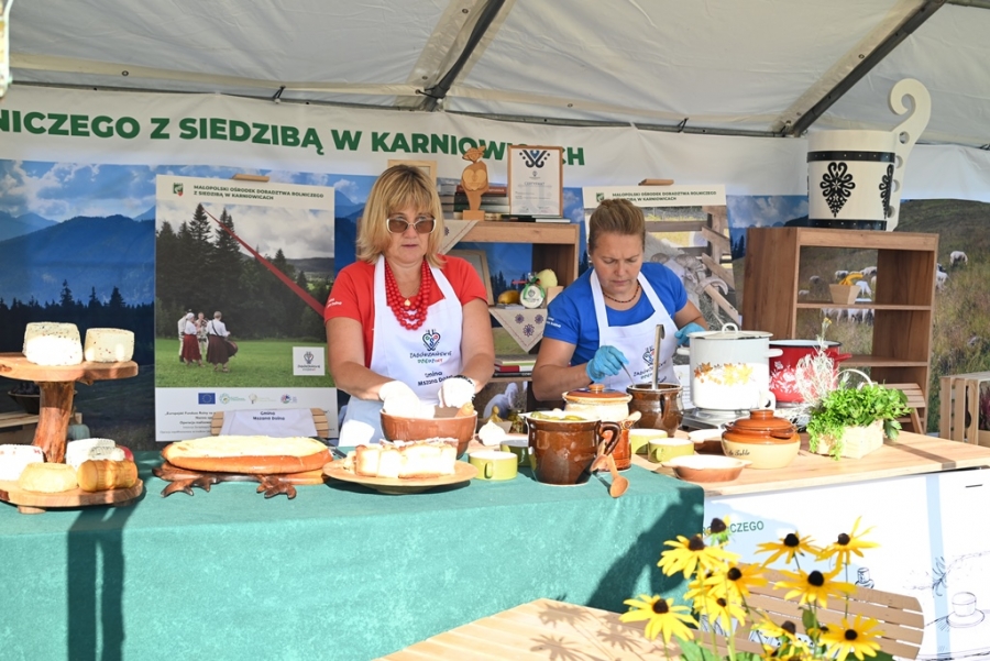 W międzyczasie trwały przygotowania na stoisku SIR – Sieci na Rzecz Innowacji w Rolnictwie i na obszarach wiejskich. Od wczesnego poranka przygotowaliśmy produkty do degustacji; a był to nie lada wyczyn, gdyż mieliśmy już pierwsze wejścia antenowe w TVP 3 Kraków. Pod nieodstępującym nas okiem kamer – w sumie pięć wejść antenowych (do obejrzenia tutaj: https://www.modr.pl/aktualnosc/zapraszamy-do-obejrzenia-relacji-z-wejsc-na-zywo-xxxi-wystawa-rolnicza-agropromocja-2023) - zaradne gospodynie, z głównodowodzącą, Moniką Kościelniak na czele, ryktowały stoisko przygotowane również dzięki Drewnianym Cudom z Kasinki (ten aktywny użytkownik Znaku Promocyjnego Zagórzańskie Dziedziny dwoił się i troił aby na wrześniowe wydarzenie do Starego Sącza przygotować skrzynie, skrzynki i okolicznościowe magnesy zamówione u niego przez organizatorów wydarzenia!). Puste półki zapełniliśmy zagórzańską literaturą, serwetami z elementami zagórzańskich zdobień zapożyczonych z naszych strojów ludowych – to piękne dzieła Barbary Łabuz z Miejskiego Ośrodka Kultury w Mszanie Dolnej; nie zabrakło przetworów wyciągniętych ze spiżarni zacnych zagórzańskich gospodyń oraz certyfikatów i statuetek bacy Bulandy - jak się mamy chwalić produktami, to tymi, które otrzymały już nasz lokalny znak jakości! A do tego jeszcze stoły uginające się od regionalnych smaków: swojskich kiełbas i innych wędlin, gorczańskich serów od Moniki Kubik, miodów z Pasieki u Piotra Woźniaka z Koniny, koszy pełnych podpłomyków wypieczonych w nocy przez zagórzańskie gospodynie, oraz chlebów… Były i wielkie kołacze z mszańskiej Piekarni SWAT i paluchy do zagryzania smalczyku. Niezwykły aromat, który zachęcał do odwiedzenia naszego stoiska, to gotujący się rosół z barana. Wszyscy, którzy nas odwiedzali, nie mogli się nachwalić zagórzańskich potraw; produkty tak szybko znikały, że ledwo nadążaliśmy z dokładką… Aromatycznym rosołem poczęstowaliśmy Witolda Kozłowskiego, Marszałka Województwa Małopolskiego, który odwiedził nasze stoisko z redaktor Olimpią Górską z TVP 3 Kraków oraz Andrzeja Guta - Mostowego - Wiceministra Sportu i Turystki. Wizytę zaanonsowała kapela Kościelniaków, która schodząc ze sceny po krótkim występie zaplanowanym w programie, sygnalizowała miejsce, gdzie można dobrze zjeść. Wszystkich znamienitych gości podejmowali Zagórzanie ubrani w regionalne stroje albo w charakterystyczne koszulki marki - by bez trudu można było do nas trafić. Rolę gospodarza stoiska pełnił gminny gazda, Bolesław Żaba, koordynator marki lokalnej Zagórzańskie Dziedziny. O współpracy i korzyściach płynących z partnerstwa i wspólnych działań marki opowiadały przed kamerą przedstawicielki Partnerów Zagórzańskich Dziedzin: Agnieszka Józefiak - Lewandowska reprezentująca Miasto Mszana Dolna oraz Lucyna Pazdur z Bazy Lubogoszcz w Kasince Małej.