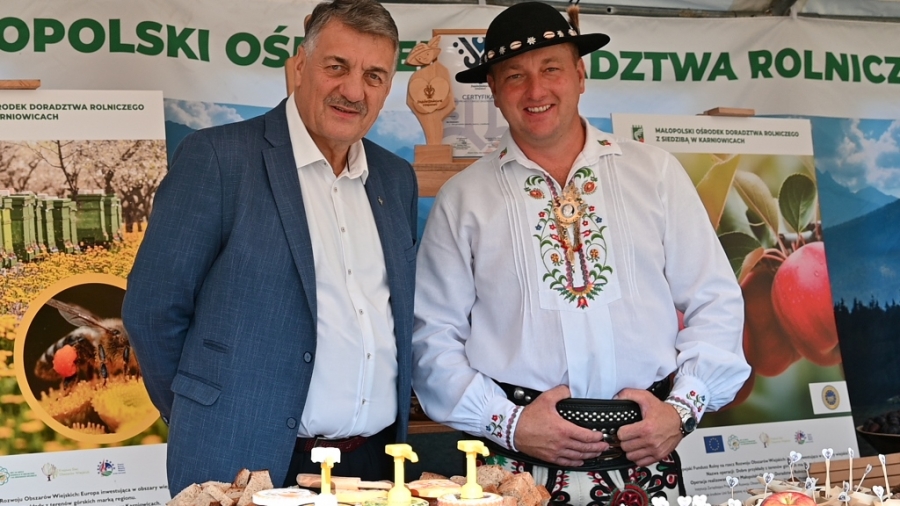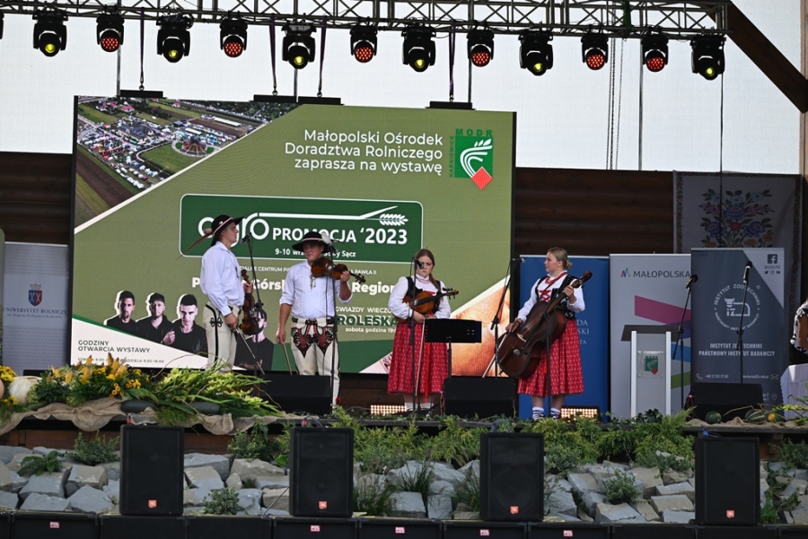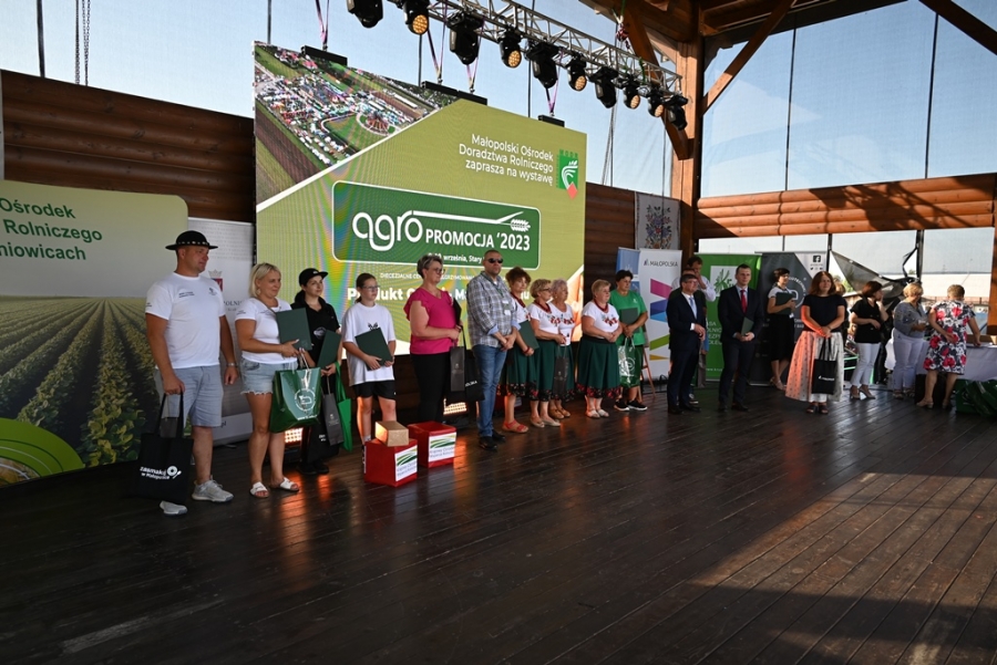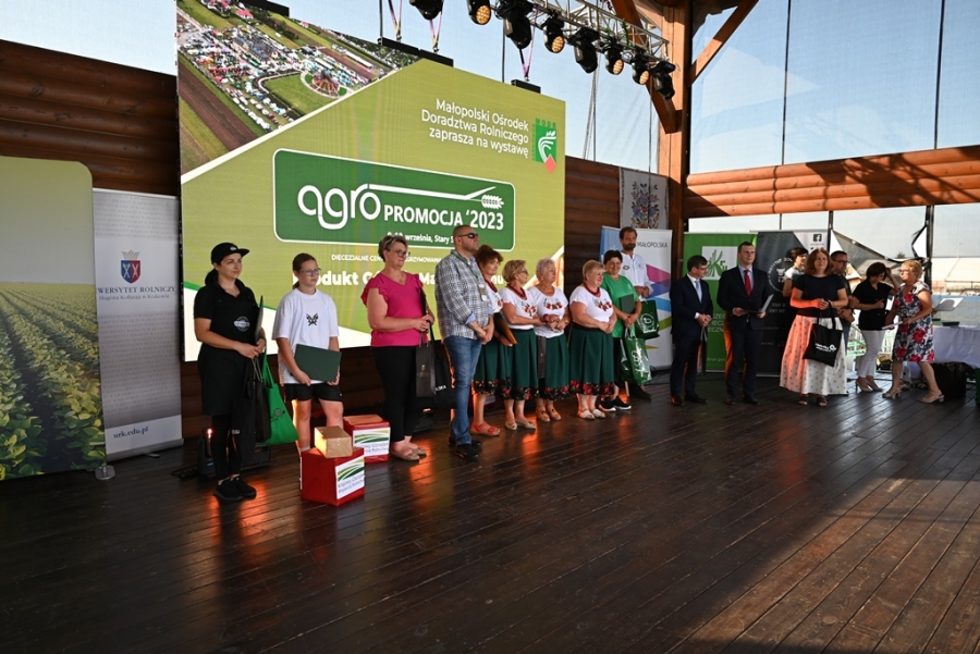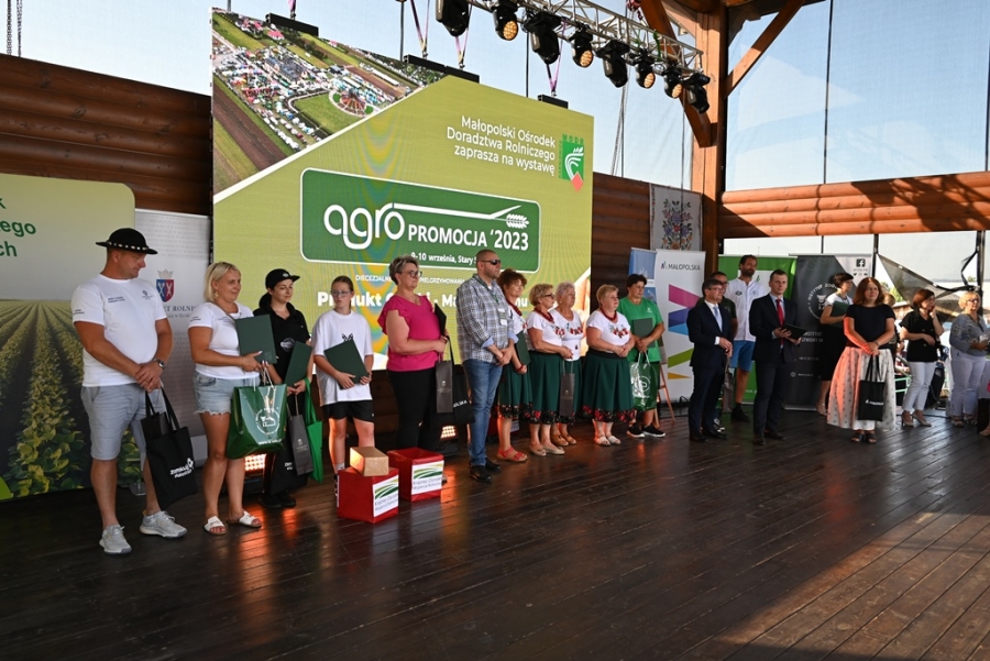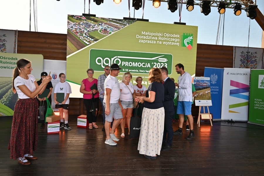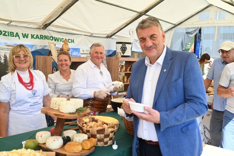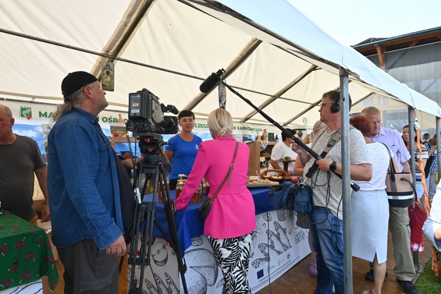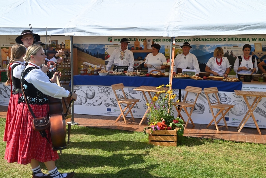 W międzyczasie trwały przygotowania na stoisku SIR – Sieci na Rzecz Innowacji w Rolnictwie i na obszarach wiejskich. Od wczesnego poranka przygotowaliśmy produkty do degustacji; a był to nie lada wyczyn, gdyż mieliśmy już pierwsze wejścia antenowe w TVP 3 Kraków. Pod nieodstępującym nas okiem kamer – w sumie pięć wejść antenowych (do obejrzenia tutaj: https://www.modr.pl/aktualnosc/zapraszamy-do-obejrzenia-relacji-z-wejsc-na-zywo-xxxi-wystawa-rolnicza-agropromocja-2023) - zaradne gospodynie, z głównodowodzącą, Moniką Kościelniak na czele, ryktowały stoisko przygotowane również dzięki Drewnianym Cudom z Kasinki (ten aktywny użytkownik Znaku Promocyjnego Zagórzańskie Dziedziny dwoił się i troił aby na wrześniowe wydarzenie do Starego Sącza przygotować skrzynie, skrzynki i okolicznościowe magnesy zamówione u niego przez organizatorów wydarzenia!). Puste półki zapełniliśmy zagórzańską literaturą, serwetami z elementami zagórzańskich zdobień zapożyczonych z naszych strojów ludowych – to piękne dzieła Barbary Łabuz z Miejskiego Ośrodka Kultury w Mszanie Dolnej; nie zabrakło przetworów wyciągniętych ze spiżarni zacnych zagórzańskich gospodyń oraz certyfikatów i statuetek bacy Bulandy - jak się mamy chwalić produktami, to tymi, które otrzymały już nasz lokalny znak jakości! A do tego jeszcze stoły uginające się od regionalnych smaków: swojskich kiełbas i innych wędlin, gorczańskich serów od Moniki Kubik, miodów z Pasieki u Piotra Woźniaka z Koniny, koszy pełnych podpłomyków wypieczonych w nocy przez zagórzańskie gospodynie, oraz chlebów… Były i wielkie kołacze z mszańskiej Piekarni SWAT i paluchy do zagryzania smalczyku. Niezwykły aromat, który zachęcał do odwiedzenia naszego stoiska, to gotujący się rosół z barana. Wszyscy, którzy nas odwiedzali, nie mogli się nachwalić zagórzańskich potraw; produkty tak szybko znikały, że ledwo nadążaliśmy z dokładką… Aromatycznym rosołem poczęstowaliśmy Witolda Kozłowskiego, Marszałka Województwa Małopolskiego, który odwiedził nasze stoisko z redaktor Olimpią Górską z TVP 3 Kraków oraz Andrzeja Guta - Mostowego - Wiceministra Sportu i Turystki. Wizytę zaanonsowała kapela Kościelniaków, która schodząc ze sceny po krótkim występie zaplanowanym w programie, sygnalizowała miejsce, gdzie można dobrze zjeść. Wszystkich znamienitych gości podejmowali Zagórzanie ubrani w regionalne stroje albo w charakterystyczne koszulki marki - by bez trudu można było do nas trafić. Rolę gospodarza stoiska pełnił gminny gazda, Bolesław Żaba, koordynator marki lokalnej Zagórzańskie Dziedziny. O współpracy i korzyściach płynących z partnerstwa i wspólnych działań marki opowiadały przed kamerą przedstawicielki Partnerów Zagórzańskich Dziedzin: Agnieszka Józefiak - Lewandowska reprezentująca Miasto Mszana Dolna oraz Lucyna Pazdur z Bazy Lubogoszcz w Kasince Małej.