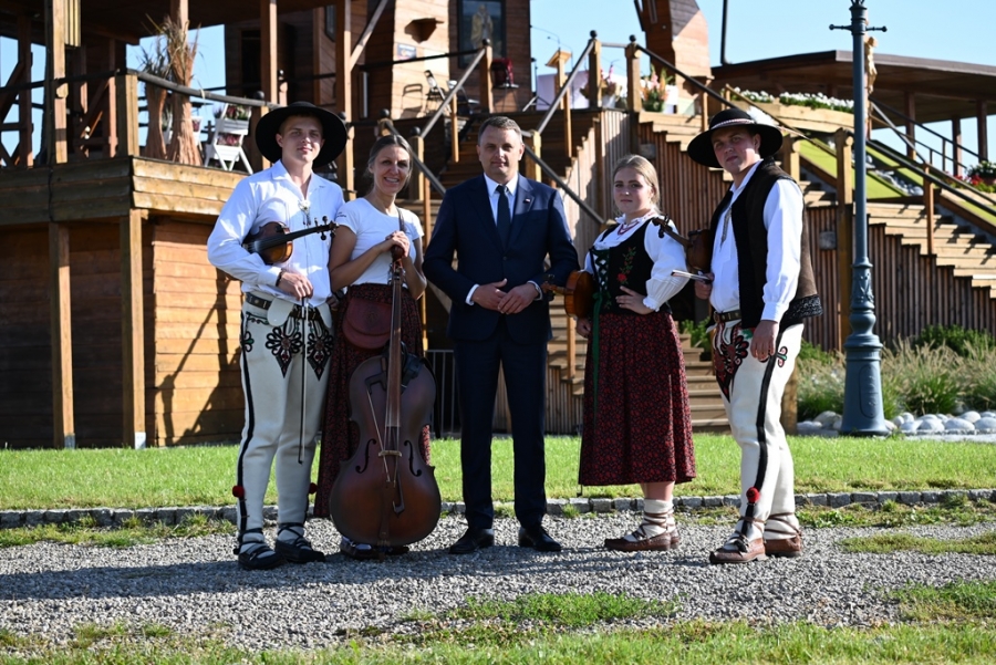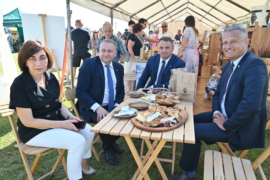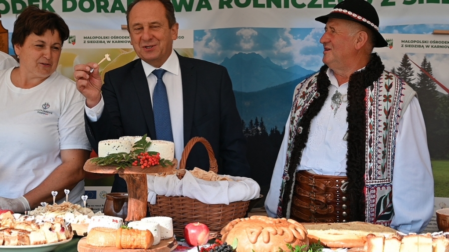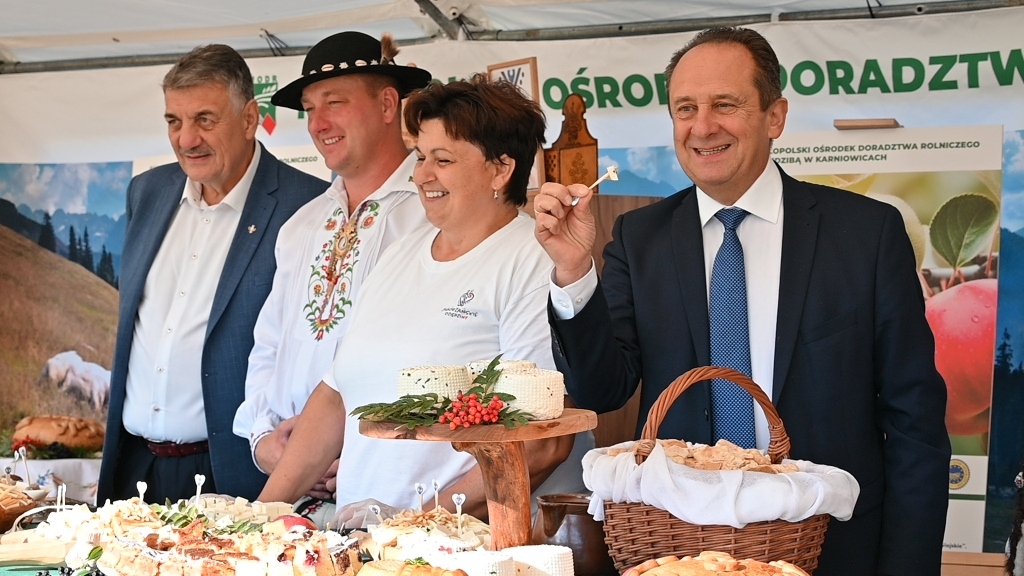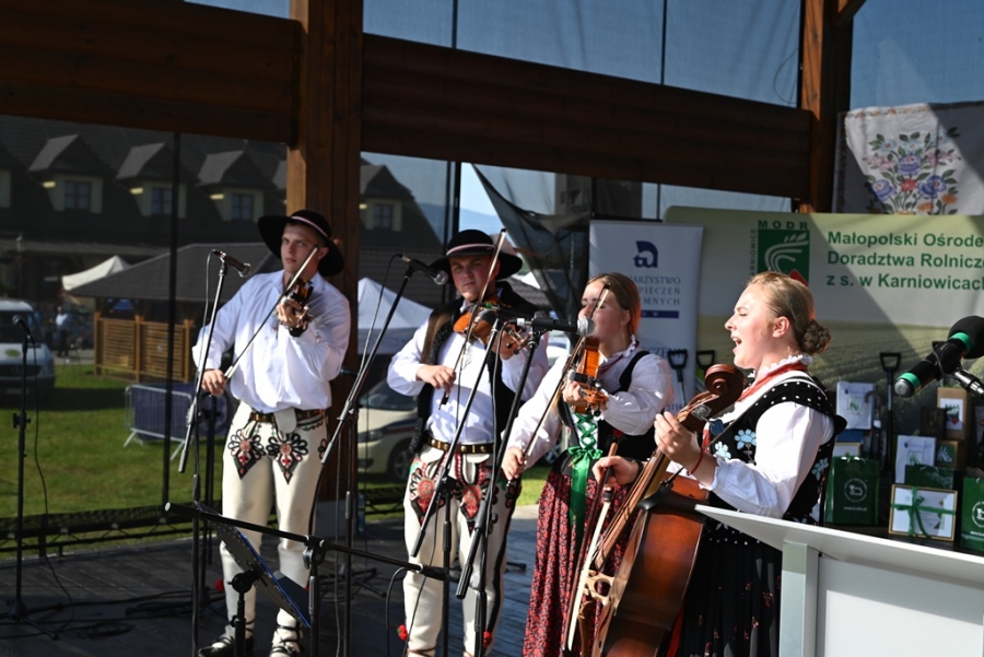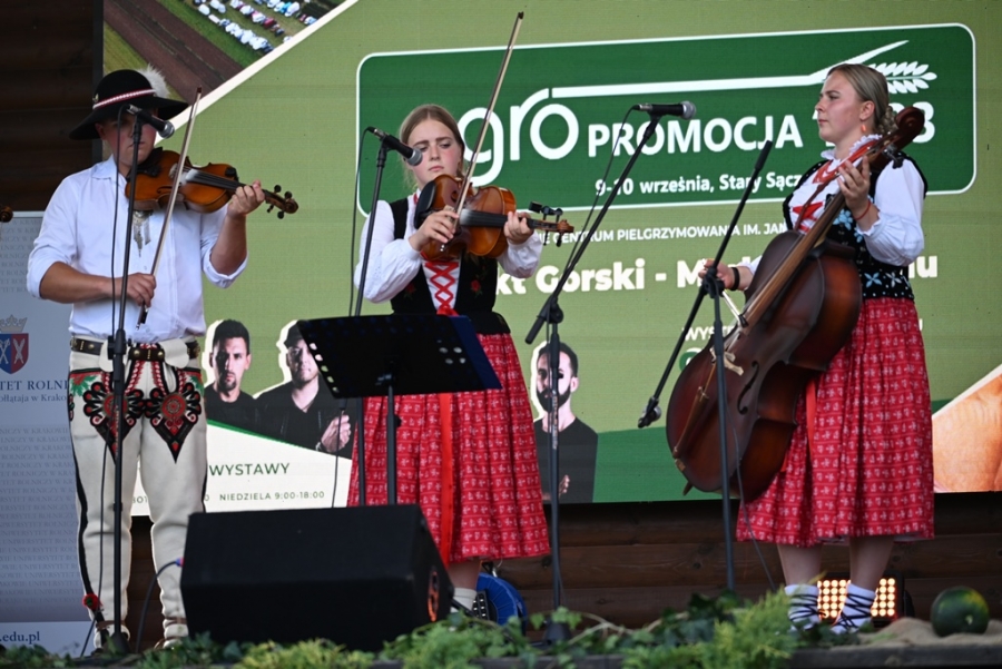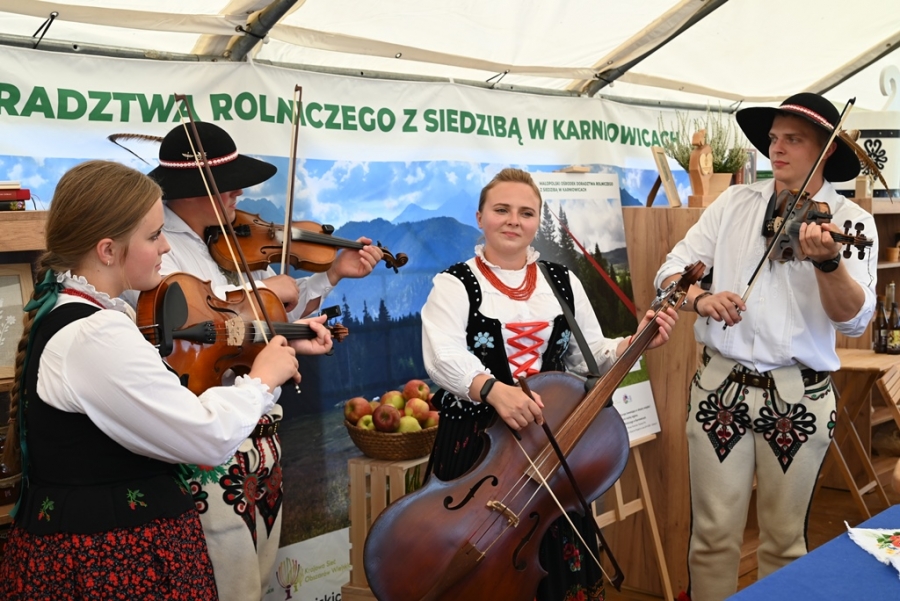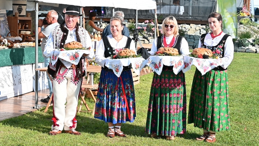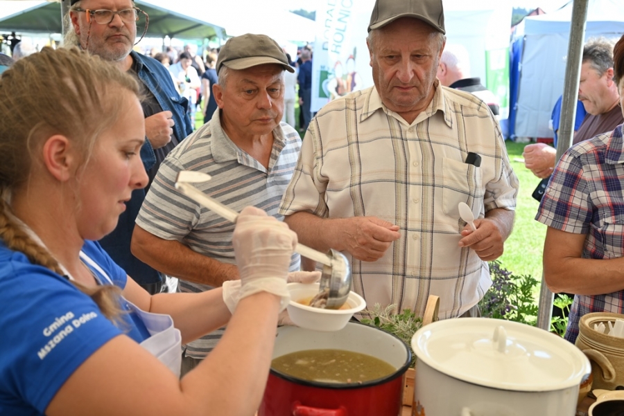 W międzyczasie trwały przygotowania na stoisku SIR – Sieci na Rzecz Innowacji w Rolnictwie i na obszarach wiejskich. Od wczesnego poranka przygotowaliśmy produkty do degustacji; a był to nie lada wyczyn, gdyż mieliśmy już pierwsze wejścia antenowe w TVP 3 Kraków. Pod nieodstępującym nas okiem kamer – w sumie pięć wejść antenowych (do obejrzenia tutaj: https://www.modr.pl/aktualnosc/zapraszamy-do-obejrzenia-relacji-z-wejsc-na-zywo-xxxi-wystawa-rolnicza-agropromocja-2023) - zaradne gospodynie, z głównodowodzącą, Moniką Kościelniak na czele, ryktowały stoisko przygotowane również dzięki Drewnianym Cudom z Kasinki (ten aktywny użytkownik Znaku Promocyjnego Zagórzańskie Dziedziny dwoił się i troił aby na wrześniowe wydarzenie do Starego Sącza przygotować skrzynie, skrzynki i okolicznościowe magnesy zamówione u niego przez organizatorów wydarzenia!). Puste półki zapełniliśmy zagórzańską literaturą, serwetami z elementami zagórzańskich zdobień zapożyczonych z naszych strojów ludowych – to piękne dzieła Barbary Łabuz z Miejskiego Ośrodka Kultury w Mszanie Dolnej; nie zabrakło przetworów wyciągniętych ze spiżarni zacnych zagórzańskich gospodyń oraz certyfikatów i statuetek bacy Bulandy - jak się mamy chwalić produktami, to tymi, które otrzymały już nasz lokalny znak jakości! A do tego jeszcze stoły uginające się od regionalnych smaków: swojskich kiełbas i innych wędlin, gorczańskich serów od Moniki Kubik, miodów z Pasieki u Piotra Woźniaka z Koniny, koszy pełnych podpłomyków wypieczonych w nocy przez zagórzańskie gospodynie, oraz chlebów… Były i wielkie kołacze z mszańskiej Piekarni SWAT i paluchy do zagryzania smalczyku. Niezwykły aromat, który zachęcał do odwiedzenia naszego stoiska, to gotujący się rosół z barana. Wszyscy, którzy nas odwiedzali, nie mogli się nachwalić zagórzańskich potraw; produkty tak szybko znikały, że ledwo nadążaliśmy z dokładką… Aromatycznym rosołem poczęstowaliśmy Witolda Kozłowskiego, Marszałka Województwa Małopolskiego, który odwiedził nasze stoisko z redaktor Olimpią Górską z TVP 3 Kraków oraz Andrzeja Guta - Mostowego - Wiceministra Sportu i Turystki. Wizytę zaanonsowała kapela Kościelniaków, która schodząc ze sceny po krótkim występie zaplanowanym w programie, sygnalizowała miejsce, gdzie można dobrze zjeść. Wszystkich znamienitych gości podejmowali Zagórzanie ubrani w regionalne stroje albo w charakterystyczne koszulki marki - by bez trudu można było do nas trafić. Rolę gospodarza stoiska pełnił gminny gazda, Bolesław Żaba, koordynator marki lokalnej Zagórzańskie Dziedziny. O współpracy i korzyściach płynących z partnerstwa i wspólnych działań marki opowiadały przed kamerą przedstawicielki Partnerów Zagórzańskich Dziedzin: Agnieszka Józefiak - Lewandowska reprezentująca Miasto Mszana Dolna oraz Lucyna Pazdur z Bazy Lubogoszcz w Kasince Małej.