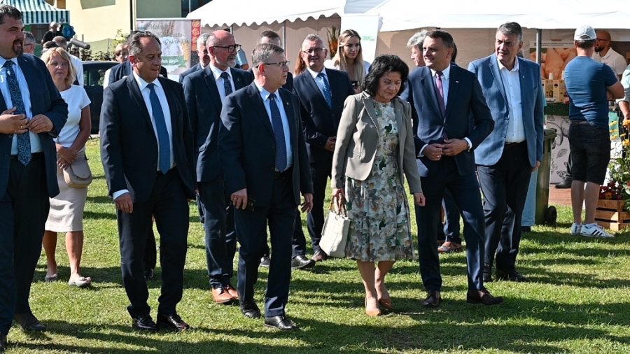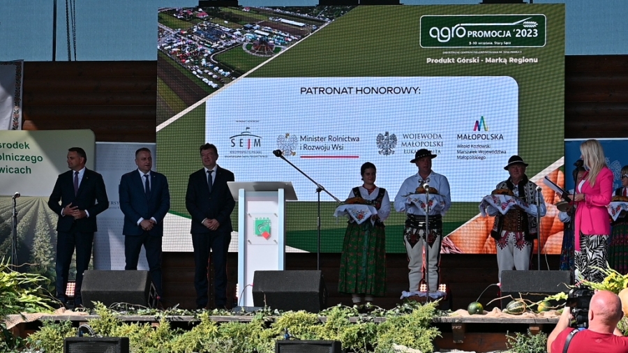 Na scenie trombita dał sygnał uroczyście otwierając wystawę Agropromocji, a Adam Wrzecionek, sołtys Kasiny Wielkiej oraz Piotr Woźniak w imieniu wszystkich rolników, wraz z kobiecą delegacją: Moniką Kościelniak, Lucyną Pazdur i Emilią Szywałą, przekazali chleby Dominikowi Paskowi, Dyrektorowi MORD w Karniowicach, profesorowi Andrzejowi Sechmanowi, Prorektorowi Uniwersytetu Rolniczego w Krakowie oraz Krzysztofowi Dudzie Dyrektorowi Instytutu Zootechniki – Państwowego Instytutu Badawczego w Balicach. Chlebem, po gospodarsku, podzielono się również ze wszystkimi uczestnikami Agropromocji.