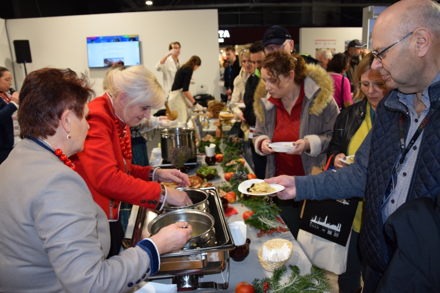 Jak widać opłacało się zarwać noc i z Łętowego wyruszyć pod Warszawę wcześnie rano aby pobić swoje wszelkie rekordy. Na długo przed ustaloną w programie godziną poczęstunku tłumnie zgromadzili się wokół stoiska łętowianek turyści z kraju i zagranicy (głównie z Rumunii, kraju partnerskiego TT Warsaw) szukający na targach inspiracji do swoich nie tylko urlopowych aktywności. Nic w tym dziwnego, wszak urodziwe gospodynie wystrojone w stroje ludowe wabiły swoimi szczerymi uśmiechami, a uchylając pokrywki garnków skutecznie „drażniły” nozdrza publiczności i szczodrze dzieliły się zapachami zagórzańskich potraw z Listy Produktów Tradycyjnych. Pierogi z suszonymi śliwkami okazały się po raz kolejny prawdziwym hitem! Aż trudno uwierzyć, że wielu nie znało jeszcze tego smaku… Królową naszych zup, zagórzańską zupę z korpieli na mleku i serwowany z nią w duecie razowy kołacz na słono trzeba było dzielić na mniejsze porcje, aby obdarować tym dobrodziejstwem jak największą rzeszę ludzi. Tak oto zagórzańskie kulinarne dziedzictwo skutecznie zachęcało do odwiedzin Małopolski. A przypomnieć trzeba, że przedstawiciele Zagórzańskich Dziedzin na stoisku Małopolskiej Organizacji Turystycznej znaleźli się nie przez przypadek. Smaki te uwiodły już wcześniej podniebienia tych, którzy „rządzą” polską turystyką. Swój palec maczała w tym również Baba z gór, z którą poznaliśmy się w zupełnie innych okolicznościach… Po skończonej przedwcześnie pracy Zagórzanki mogły spróbować smaków charakterystycznych dla Podhala i Beskidu Niskiego. Swoje kulinarne stoisko współdzieliły bowiem z KGW z Gminy Ochotnica Dolna oraz Towarzystwa z Beskidu Niskiego reprezentowanego przez Malowane Wierchy, Trzy Potoki, Swystowy Sad, Dom na Łąkach i Wysowiankę. No, nie można się było oprzeć tej mieszance smaków, które wręcz krzyczały: Odkryj Małopolskę!