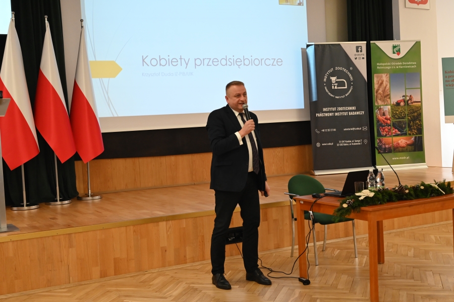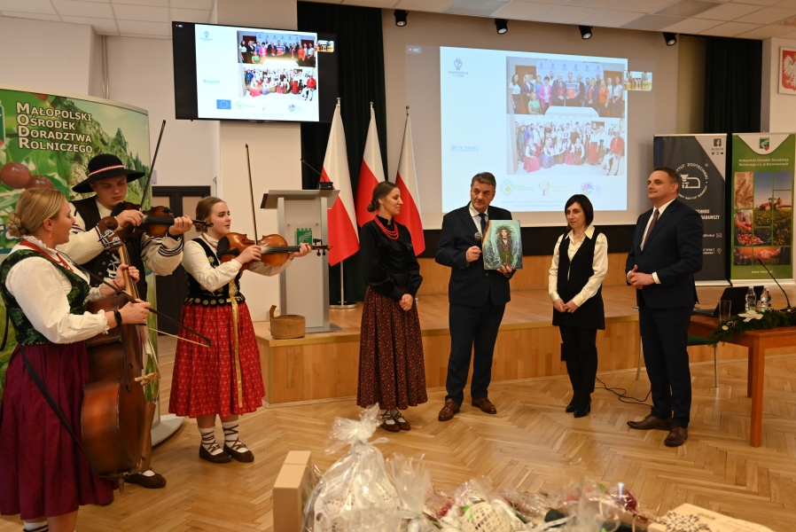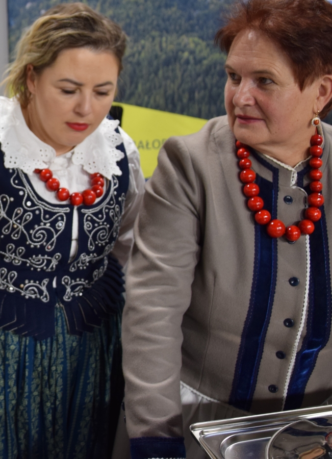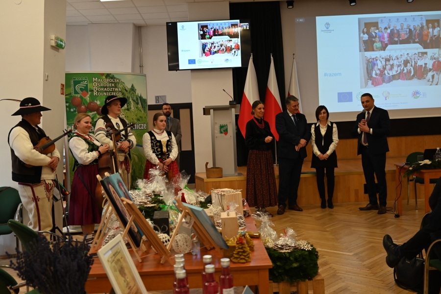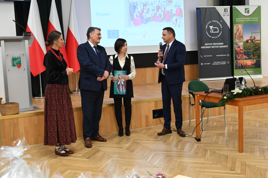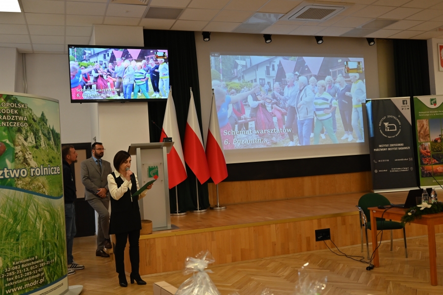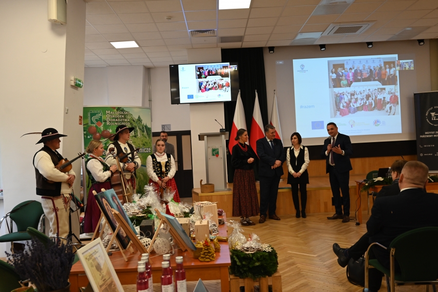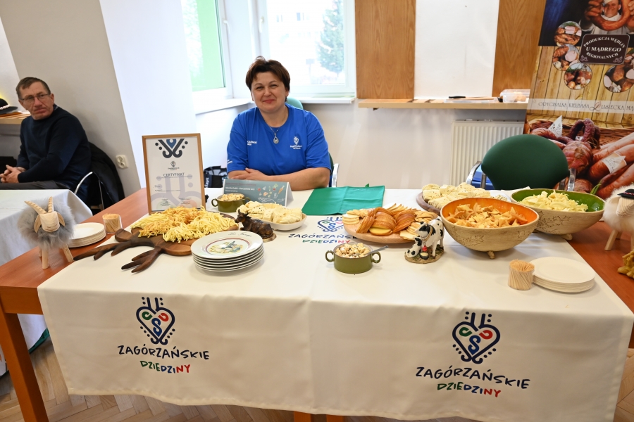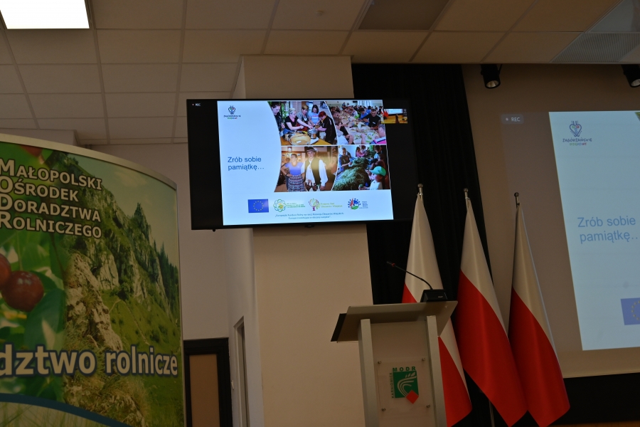 A program grudniowego seminarium w Karniowicach obfitował w zagórzańskie akcenty. Na zaproszenie Dominika Paska, Dyrektora MODR, zaprezentowano działania zagórzańskich liderek pod marką lokalną. Dodatkowo przykładowe dziedzinne produkty pojawiły się też na okolicznościowym stoisku, którego doglądały Józefa Potaczek i Monika Kościelniak. Monika Kubik obficie częstowała swoimi Gorczańskimi serami certyfikowanymi Znakiem Promocyjnym Zagórzańskie Dziedziny, zaś Śwarne Babki z Koła Gospodyń Wiejskich Łętowe (Józefa Węglarz, Krystyna Krzysztof, Danuta Węglarz, Anna Tęczar i Justyna Babuśka) karmiły wszystkich rosołem z baraniny, zagórzańską zupą z korpieli na mleku, pierogami z suszonymi śliwkami, serkami i wędlinami z Łętowego oraz przepysznymi ciastami. Nie obyło się bez zagórzańskich kolęd i pastorałek wyśpiewanych na całe gardła przez Kapelę Kościelnioki z Olszówki oraz tradycyjnych życzeń podsypanych owsem. Świąteczne pozdrowienia od Zagórzan i okolicznościowe życzenia zgromadzonym przekazał również Bolesław Żaba, Wójt Gminy Mszana Dolna – inicjator i koordynator Zagórzańskich Dziedzin. Wszystkie te dziedzinne chwile utrwaliła kamera TVP 3 Kraków, a materiał wyemitowano w wieczornej Kronice: https://krakow.tvp.pl/74725076/12122023-2130 (po 12 min.)