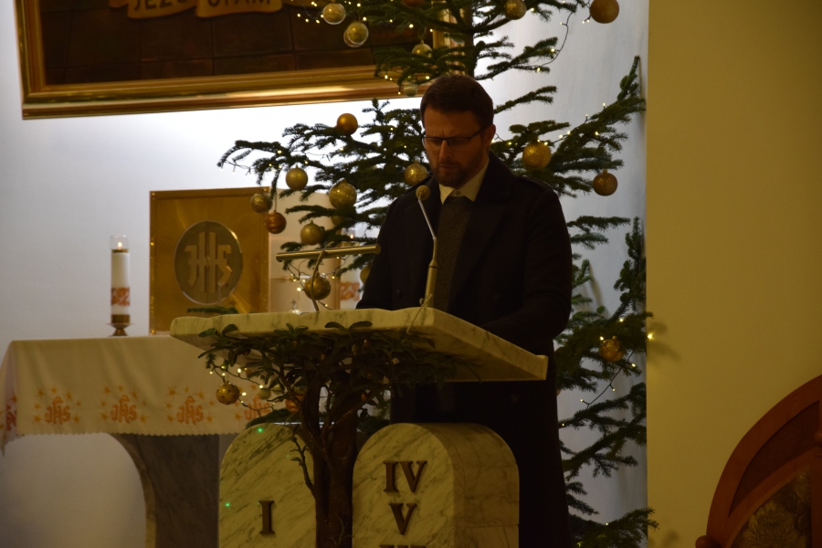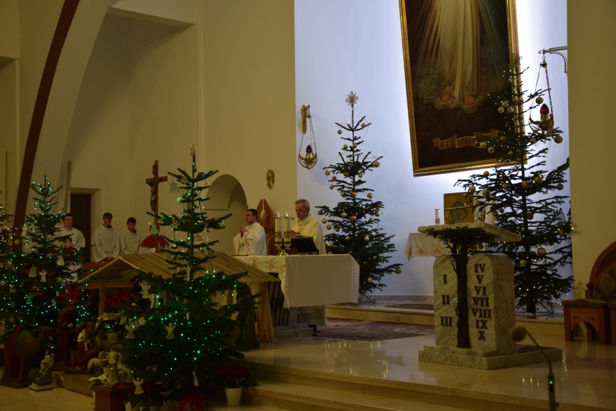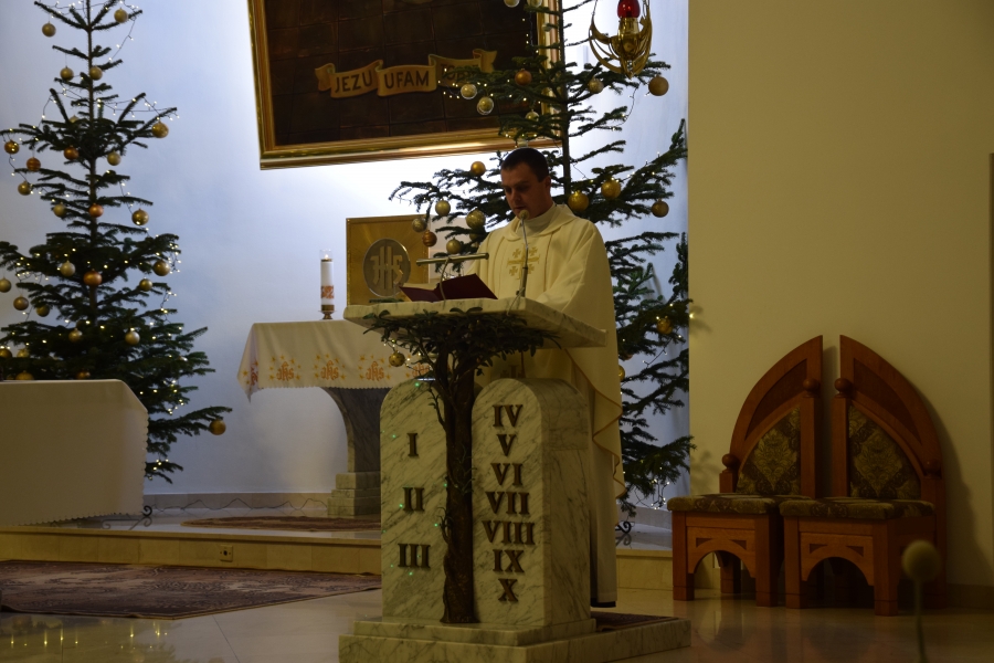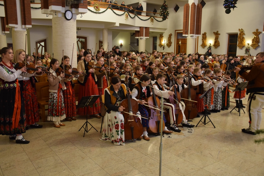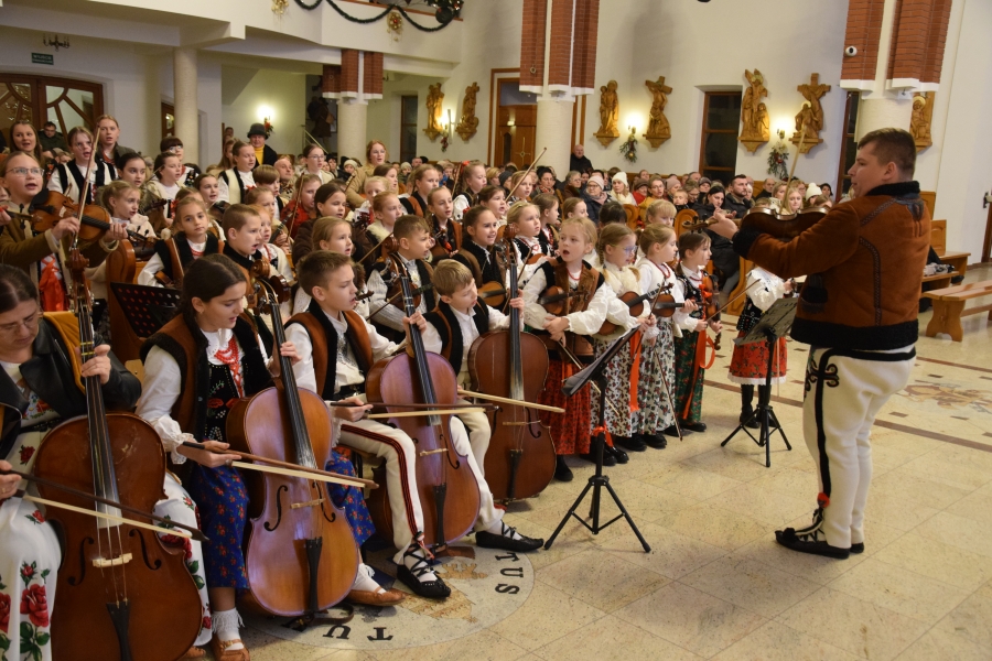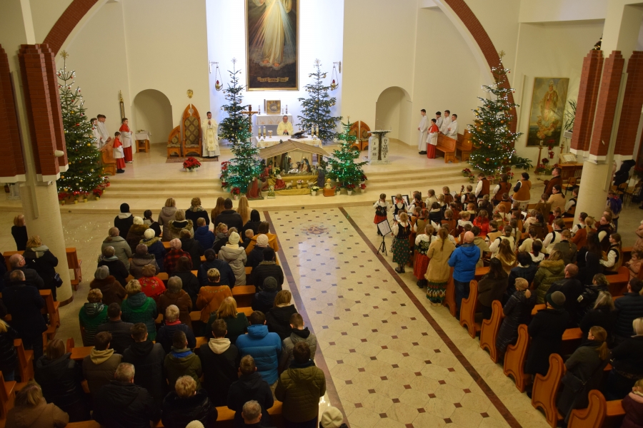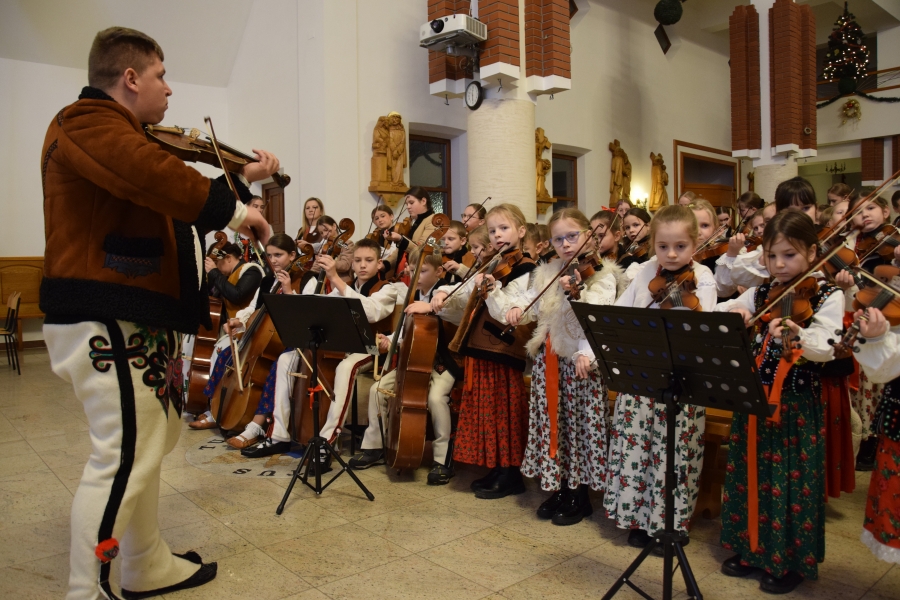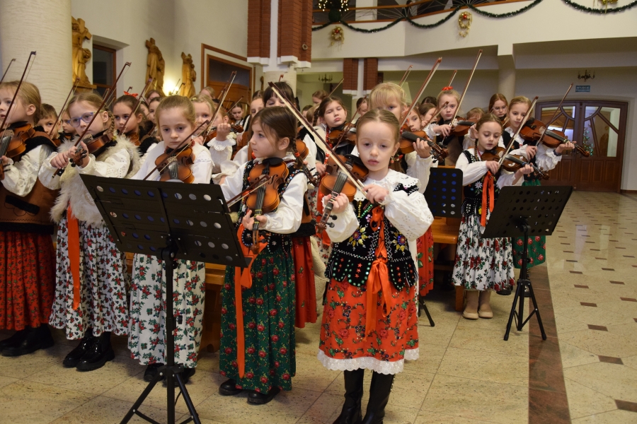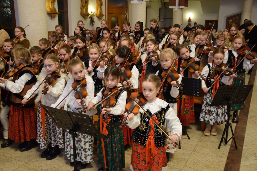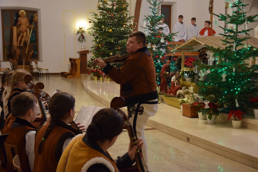 W parafii Miłosierdzia Bożego odprawiona została Eucharystia dla społeczności ZSTI - najpierw adorację przy żłóbku poprowadzili członkowie zespołu „Instal Band” oraz Hubert Rapciak ze swoją kapelą (blisko setka młodych, zdolnych muzyków), która później zadbała również o muzyczną oprawę Mszy św. Obserwowanie, jak pod okiem nauczyciela, a równocześnie absolwenta szkoły, nabierają wprawy w wykonaniu kolęd i pastorałek to sama radość. Wszak przejęte występem to najmłodsze pokolenie w przyszłości będzie reprezentować naszą kulturę i tradycję.