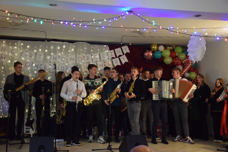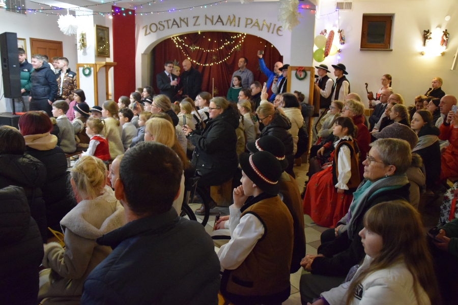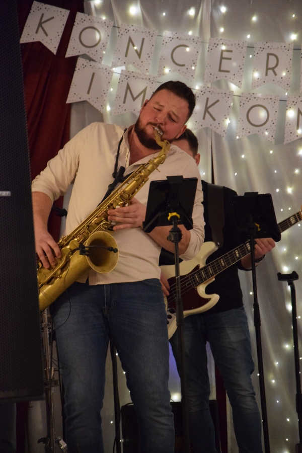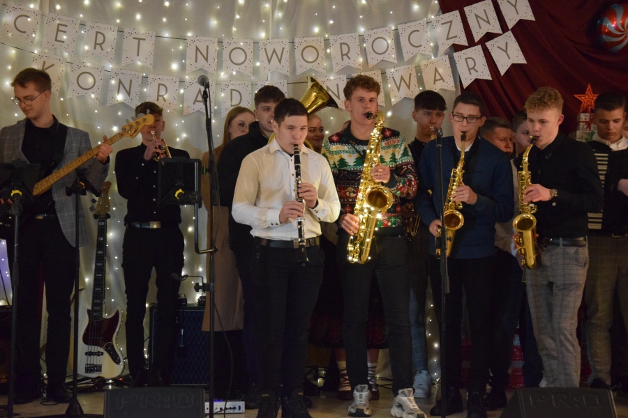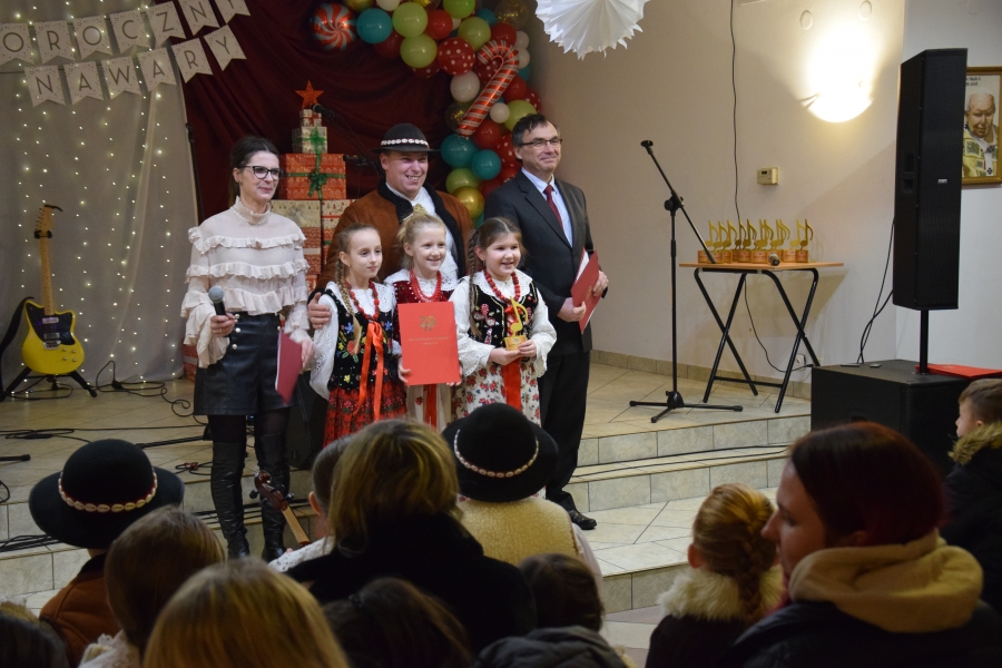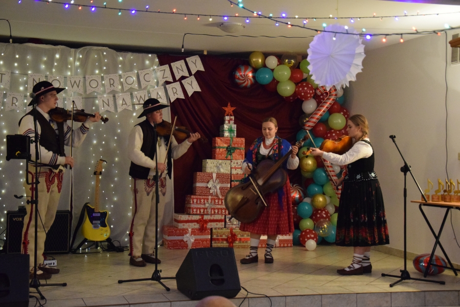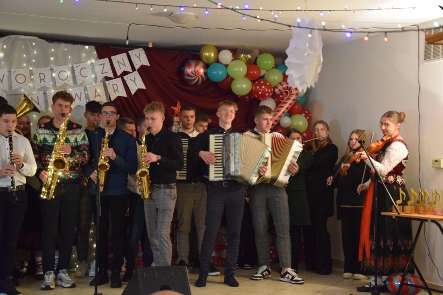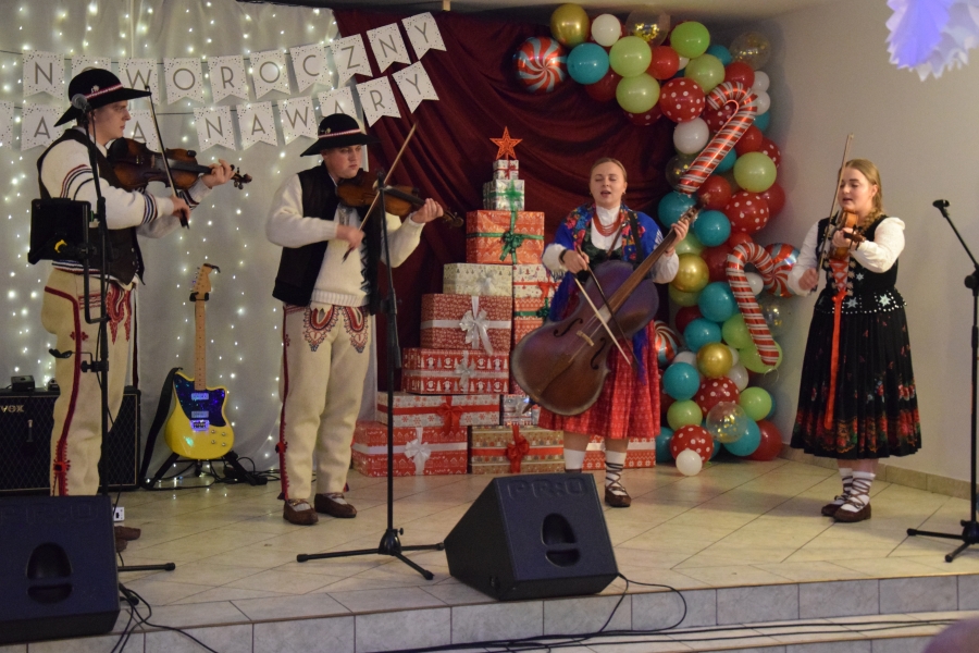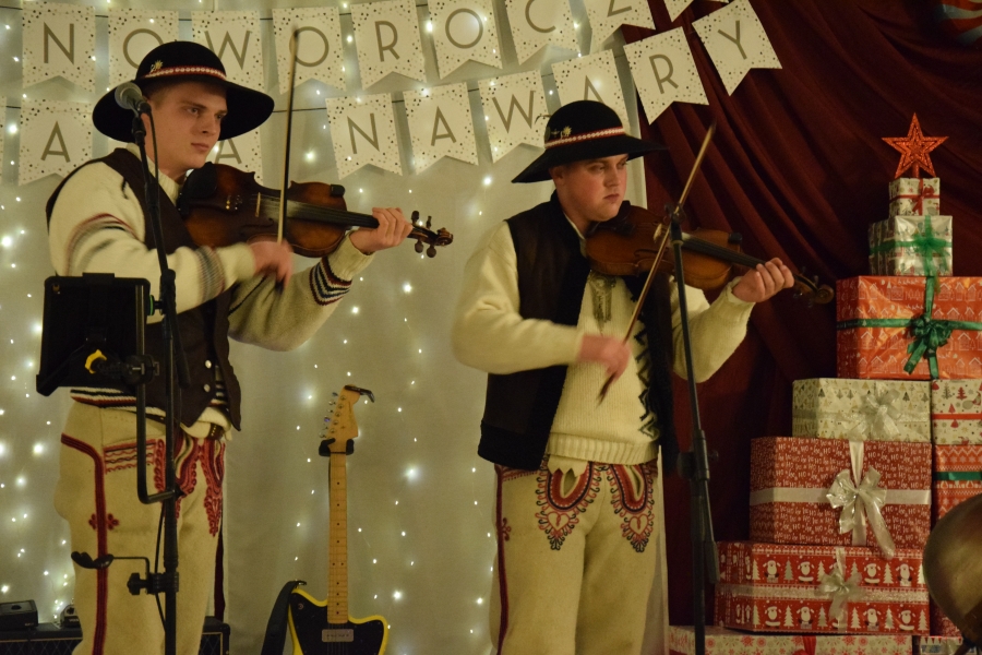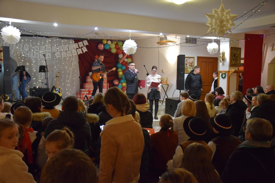 Następnym punktem muzycznego programu był koncert noworoczny i przegląd zespołów muzycznych w sali pod plebanią, któremu od 2020 roku patronuje Konrad Nawara, uzdolniony muzycznie absolwent szkoły. Ten Zagórzanin, któremu muzyka w duszy grała, rósł na naszych oczach, rozwijał swoje talenty i popularyzował kulturę ludową regionu, najpierw w kapeli „Olszowianie”, a potem również w reaktywowanym zespole regionalnym o tej samej nazwie. Do dzisiaj widzimy go w stroju ludowym, ze skrzypcami w rękach i ze śpiewem na ustach. Kilka lat temu zjednoczył nas wokół siebie, pokazał jak dzielić się swoim dobrem z innymi i udowodnił, że chcieć to móc. Pozostawił po sobie niezapisany testament, który wypełnić mają ludzie dotknięci chorobami. Chciał, aby nikt nigdy nie zawahał się walczyć o siebie; żeby chorzy się nie poddawali i odważnie podejmowali nowatorskie terapie, aby wykorzystali każdą szansę na powrót do zdrowia. I taką szansę na poprawę zdrowia potrzebującym tego Zagórzanom stworzyła społeczność szkolna mszańskiego „Instalu”, wespół z rodziną Konrada. Noworoczne koncerty, które początkowo odbywały się w szkolnych murach, połączono z bardzo wzniosłym przesłaniem: jest to jednocześnie akcja charytatywna i zbiórka pieniężna na wybrany cel. W tym roku postanowiono, że będzie to formą wsparcia Magdy Klimek z Kasinki Małej, absolwentki szkoły, która przechodzi kosztowną rehabilitację. W ten sposób licznie zgromadzona publiczność mogła przekazać datki do puszek, które krążyły na sali.