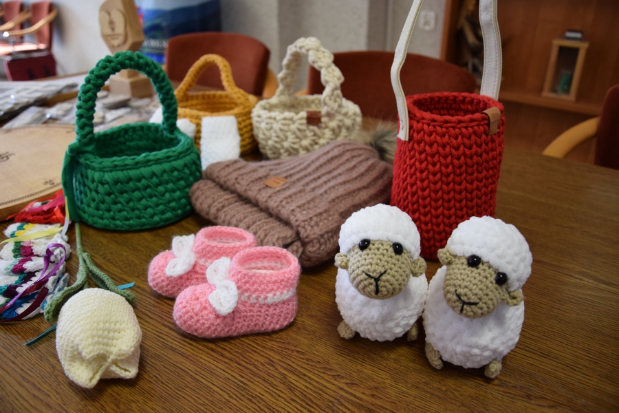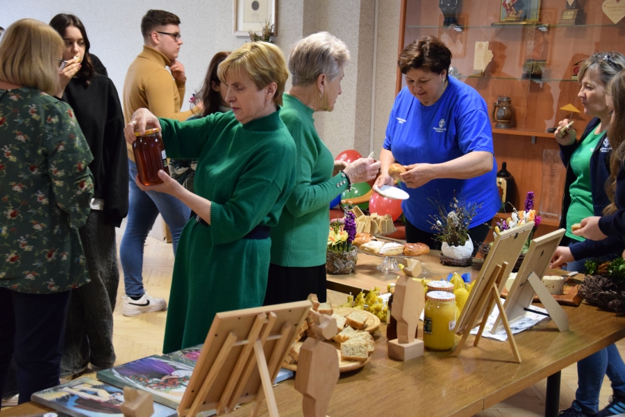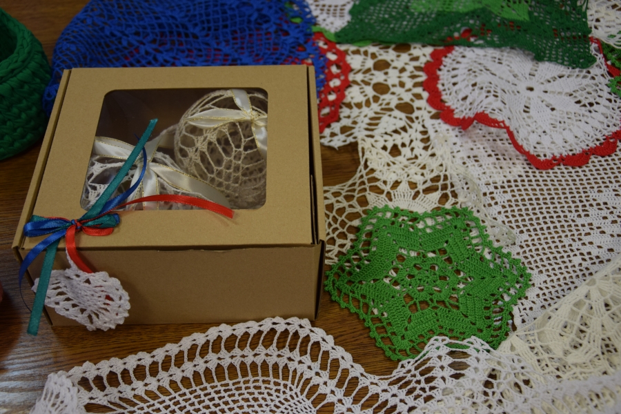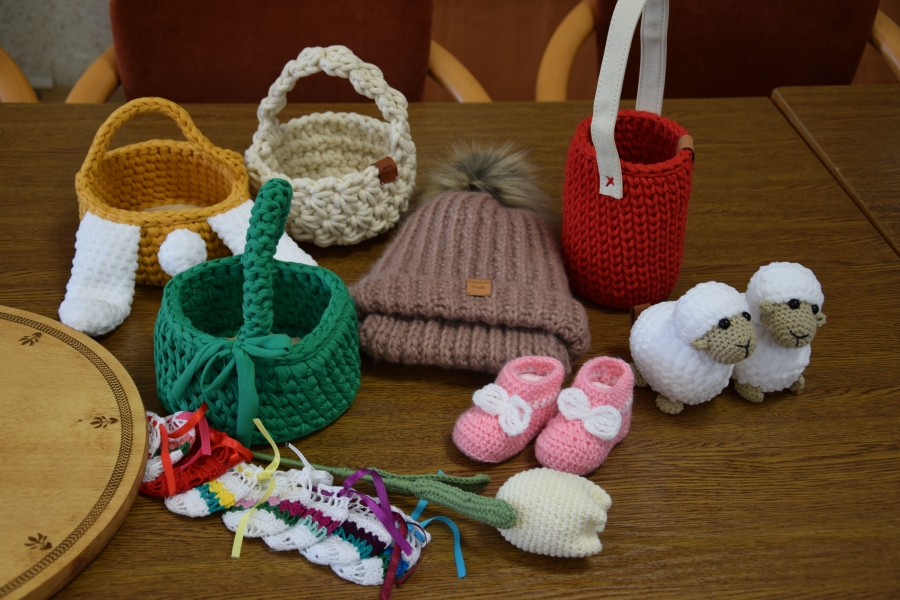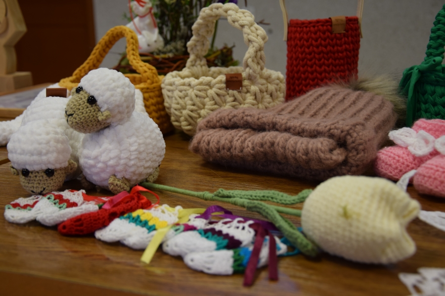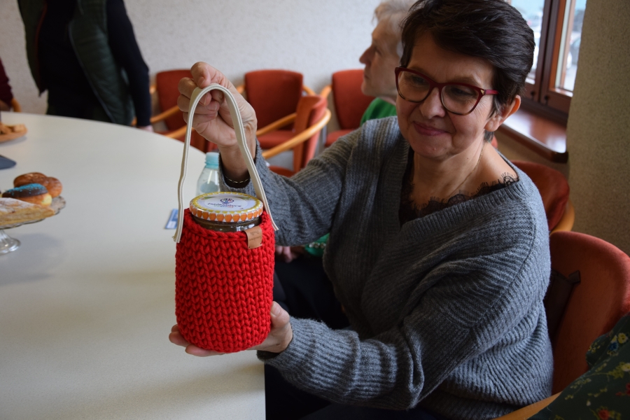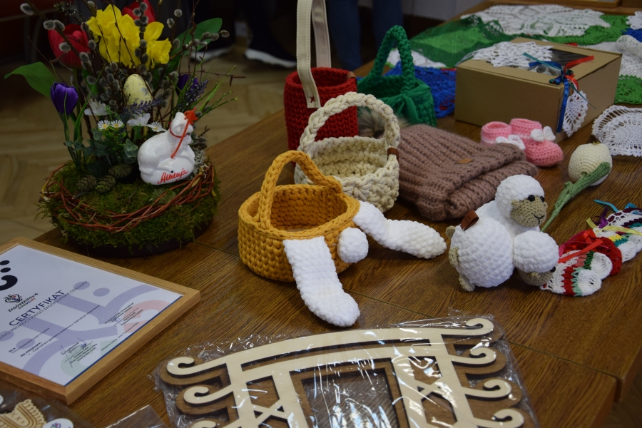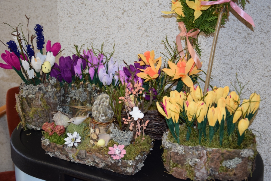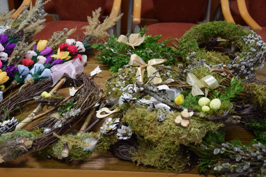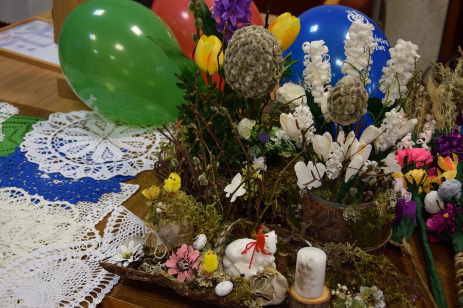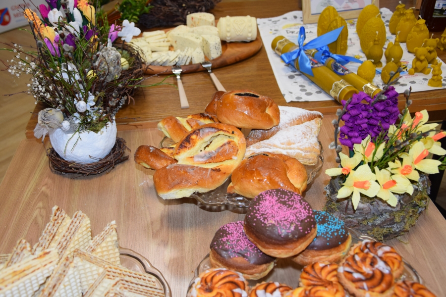 Czas krótkiego odpoczynku wykorzystaliśmy również na nakarmienie naszych zmysłów. Wystawowe stoły uginały się bowiem od wszelakich dziedzinnych produktów, kusiły zapachami, wabiły kolorami i pięknymi formami… Były tam woskowe świeczki z Koniny, drewniana galanteria z Kasinki, Drzewiane łobrazki Józi, koronki (również w markowych kolorach!) od Zosi, stroiki i palmy od Marysi. Nowymi wytworami swoich zdolnych rąk pochwaliła się Basia, która na spotkanie przywiozła sznurkowe koszyczki na miód i święconkę, baranki, kwiaty i kordonkowe osłonki na jajka. A to dopiero zapowiedź tego, co nas czeka na Zagórzańskim Wielkanocnym Jarmarku, 17 marca na placu targowym w Mszanie Dolnej.