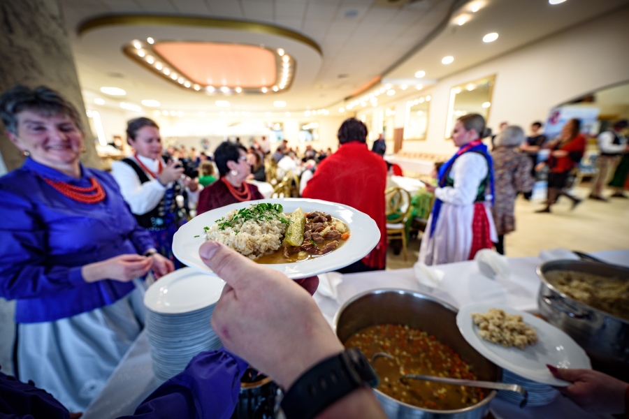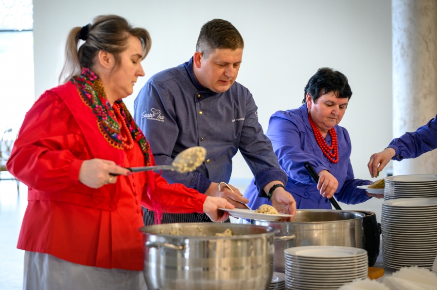 W oczekiwaniu na uroczyste otwarcie wydarzenia naszym gościom zaserwowano danie: gulasz z baraniny podany z pęczakiem i kiszonymi ogórkami – w ten sposób KGW Olszówka pod czujnym okiem Pawła Kołodzieja, szefa kuchni Szapo ba z Kasinki Małej, zrealizowało wygraną - pierwszą nagrodę w konkursie „Bitwa na Sodrę” podczas Zagórzańskiego Jarmarku Wielkanocnego. Podkręcony w nowoczesny sposób starter uspokoił „podrażnione” aromatem dania zmysły i pozwolił naszym gościom uczestniczyć dalej w kolejnych punktach dorocznego święta. Uroczystego otwarcia III Gali Znaku Promocyjnego Zagórzańskie Dziedziny dokonali wspólnie gospodarze trzech zagórzańskich samorządów: Bolesław Żaba, Wójt Gminy Mszana Dolna, inicjator i koordynator marki lokalnej Zagórzańskie Dziedziny, Anna Pękała, Burmistrz Miasta Mszana Dolna oraz Rafał Rusnak, Wójt Gminy Niedźwiedź. Tytuł Partnera Gali w imieniu Województwa Małopolskiego odebrał Grzegorz Biedroń, Radny Sejmiku Województwa Małopolskiego i Prezes Małopolskiej Organizacji Turystycznej. To właśnie dzięki wsparciu tych dwóch instytucji mogliśmy się spotkać i wspólnie poświętować. W uroczysty sposób Akt Nadania Partnerstwa przekazała Agnieszka Duda, Wiceprezes Fundacji Wspierania Rozwoju Lokalnego „Inicjatywa”.
