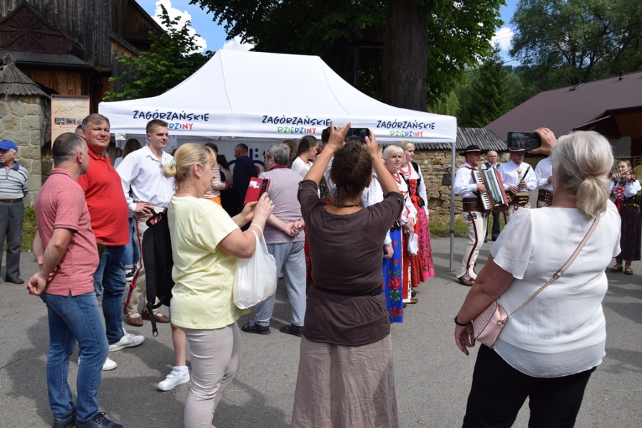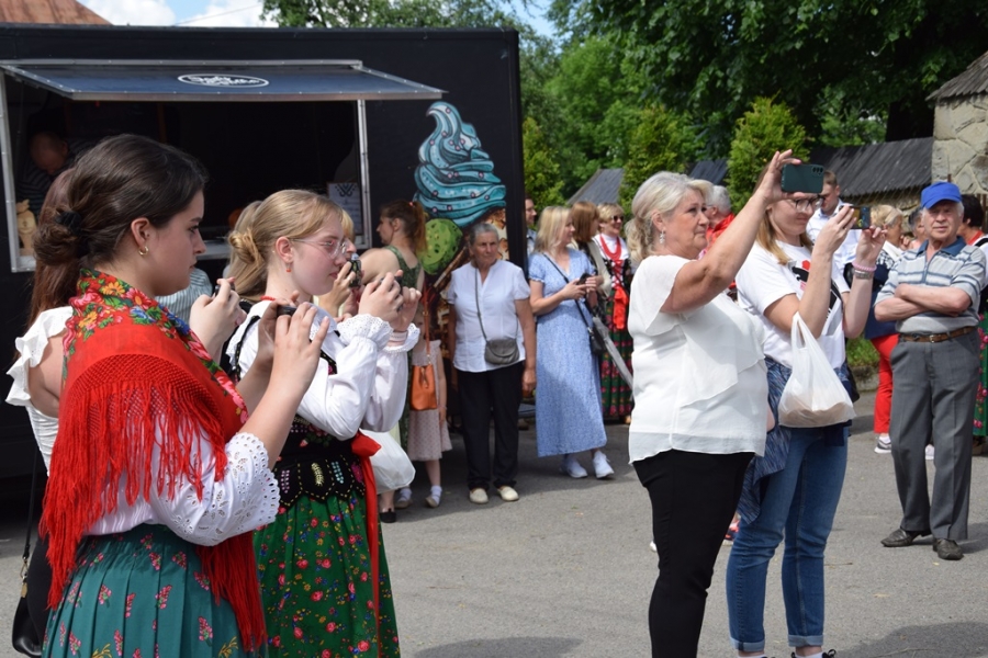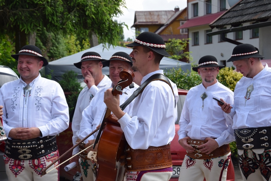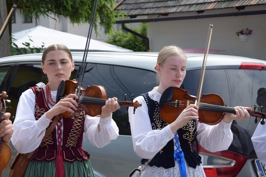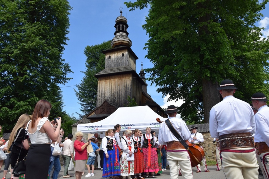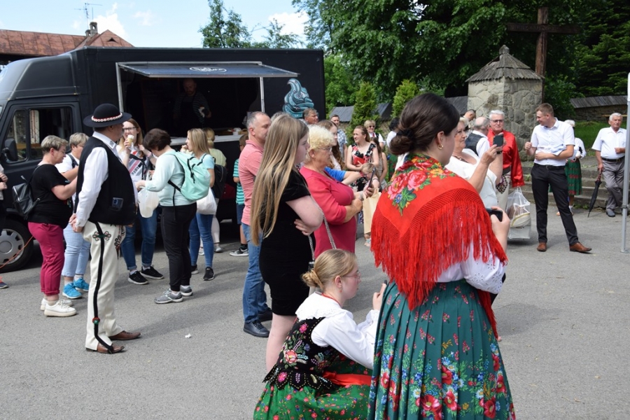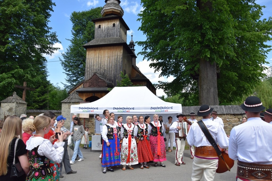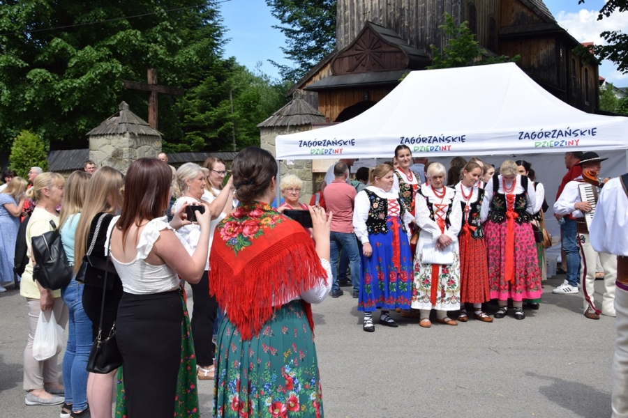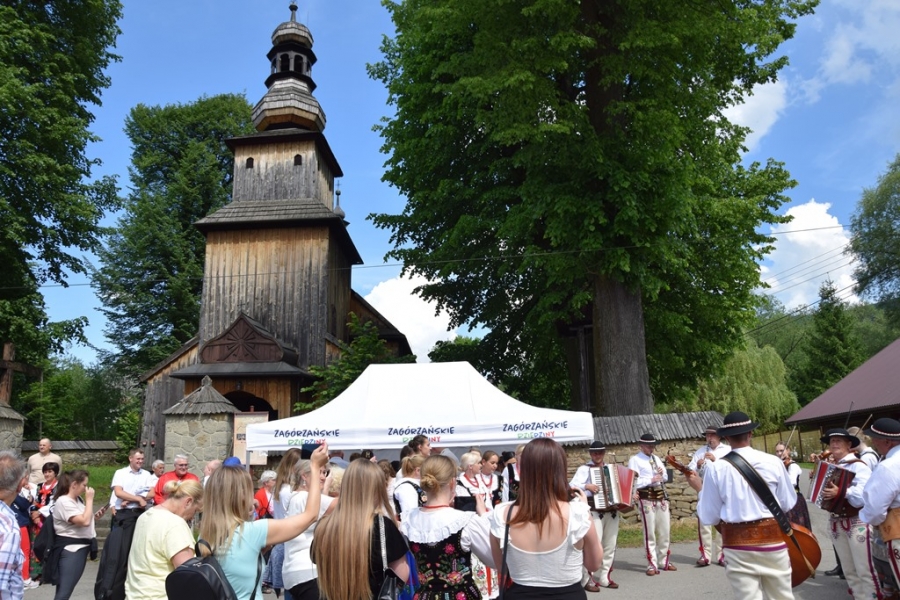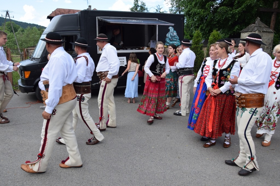 Tak zespół „Folkowe Łętowe” zaznaczył swoją obecność podczas zagórzańskiej Eucharystii, która w ostatnią niedzielę maja do Kasiny Wielkiej przyciągnęła również w swoje progi gości z odległych stron. Symbolicznie kończyliśmy majowe granie, co zaakcentował również w swoim repertuarze zespół, a dla naszych gości z Kurpii Zielonych był to ostatni dzień wizyty studyjnej. Co więcej, warto podkreślić, że grupa z LGD „Kurpsie Razem” specjalnie przełożyła swój przyjazd, dostosowując termin pobytu tam, gdzie Beskid Wyspowy wita się z Gorcami, by uczestniczyć w Zagórzańskiej Mszy św. Zebranych w świątyni przywitał w Niedzielę Trójcy Świętej proboszcz, Wiesław Maciaszek. Pięknie prezentowały się zagórzańskie stroje; a warto dodać, że Kurpie Zielone słyną z równie pięknych okryć. Jednak w tym przypadku zwracała uwagę melodia znanych pieśni, akcenty i gwarowe określenia, które szybko wychwycili uczestnicy wizyty studyjnej. „Folkowe Łętowe” nie poprzestało na wykonaniu pieśni tylko w kościele. Jak zwyczajowo przyjęto – ciąg dalszy nastąpił na placu przed kościołem. Tam mogliśmy obserwować jak zespół podzielony na dwie grupy, męską i żeńską, wygrywa i wyśpiewuje kolejne utwory. Dodatkową atrakcją były również nasze zagórzańskie stoiska, które wyjątkowo i „na wszelki wypadek” szukały schronienia pod dziedzinnym namiotem… Obawialiśmy się deszczu patrząc na kłębiące się na horyzoncie granatowe chmury! Tym razem na okolicznościowym kiermaszu produktów lokalnych pojawiły się różnego rodzaju serki gorczańskie od Moniki Kubik: wędzone, białe z różnymi dodatkami, krojone i zalane oliwą, a nawet bryndza! Po sąsiedzku „Sznurkowe Perełki” – Basia i Asia były przygotowane, by spieszyć z ratunkiem dla tych, którzy mieli braki w prezentach na obchody Dnia Matki. Widzieliście ich piękne, sznurkowe kwiaty? Poza tym nie zabrakło również innych propozycji, zarówno dla modnych fashionistek i małych smyków… A na ochłodę i na deser - dla wszystkich - lody! Najlepsze smaki - wiadomo, sprawdzone, od Maćka Komenzy vel Lody i Spółka.