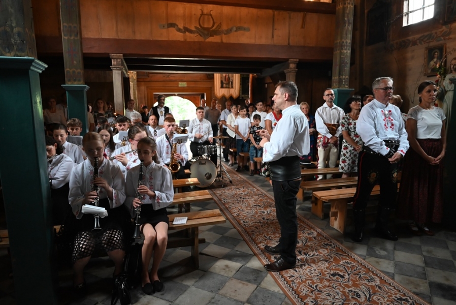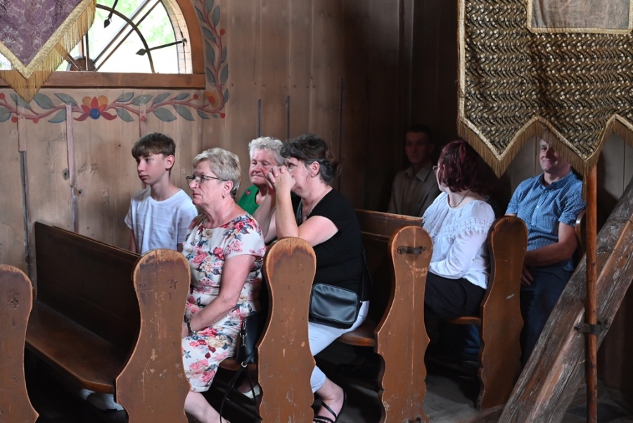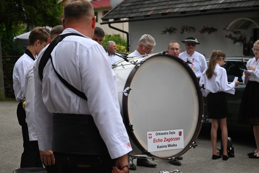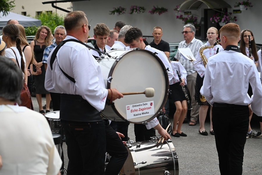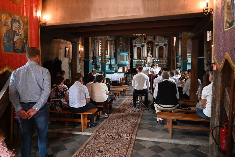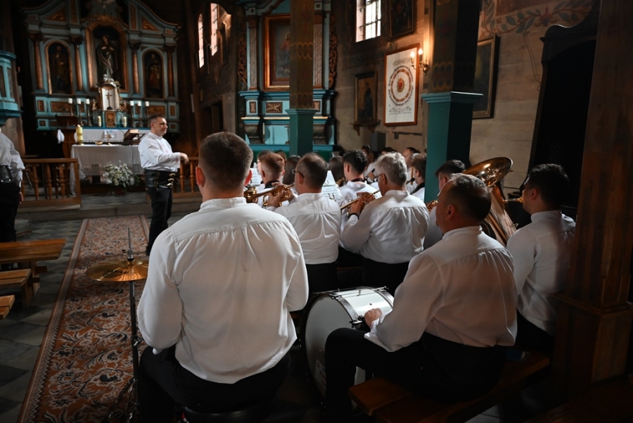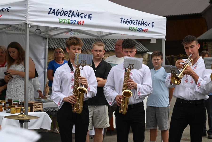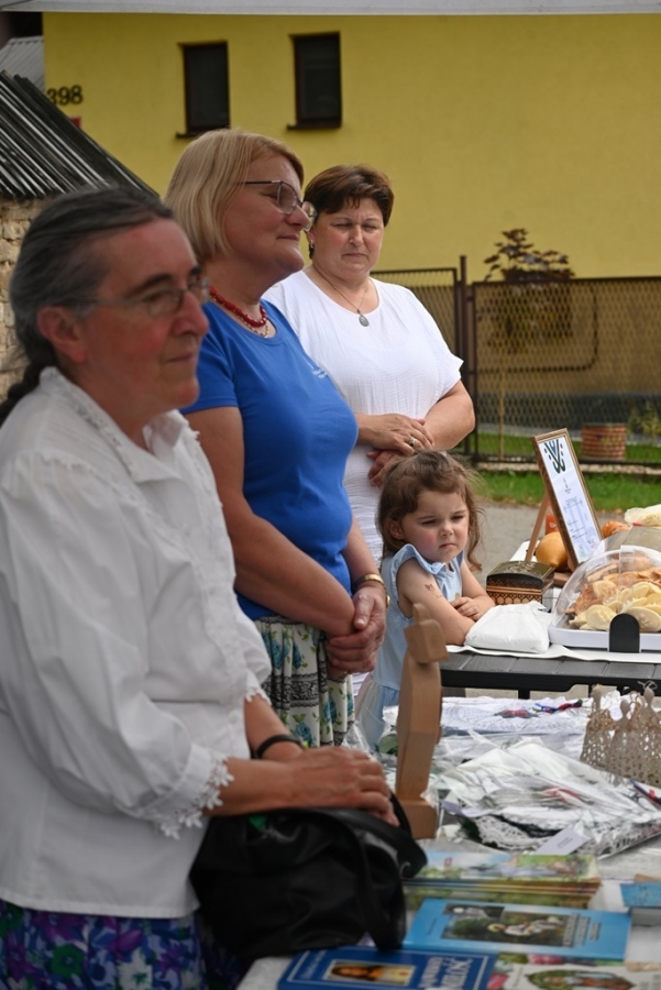 I my sobie nie wyobrażamy, że cokolwiek mogłoby zmienić tę naszą nową tradycję. Okazało się, że wewnątrz kościoła upał wcale nie doskwierał, a schronienie przed słońcem, tym którzy zostali na zewnątrz, dały rozłożyste, również zabytkowe lipy. Gorąco się na naszych zagórzańskich sercach zrobiło tylko wówczas, gdy ksiądz przeczytał piękną intencję Mszy ofiarowaną przez członków Orkiestry Dętej Echo Zagórzan z Kasiny Wielkiej. „Za tych, którzy dbają o dziedzictwo Zagórzan”, czyli za nich samych i wszystkich, którzy tego dnia zgromadzili się w zabytkowym kościele. Mimo wszystko. Charakterystyczna dla Adama Rusnarczyka, kapelmistrza orkiestry, lekkość wygrywanych dźwięków, zachwyciła turystów i naszych gości. „W Krakowie za taki koncert trzeba by było sporo zapłacić, a tutaj? garstka ludzi…” (tych, którzy zostali po zakończonej Eucharystii, aby na placu przed kościołem wysłuchać okolicznościowego koncertu) – skomentował stały bywalec naszych comiesięcznych wydarzeń, mieszkający w grodzie Kraka. Tak, był upał. Ale doskwierał wszystkim; księdzu, organiście, kościelnemu…, dziewczynom dokumentującym wydarzenie…, młodym i starszym, a przede wszystkim muzykom orkiestry, którzy w pełnym słońcu koncertowali dla tych, którzy jednak zostali aby ich posłuchać… Miło było również naszym wystawcom z kiermaszu produktów lokalnych, że uczestnicy Zagórzańskiej Mszy św. zainteresowali się również efektami ich pracy. Niektórzy zaopatrzyli się w Gorczańskie sery u Moniki Kubik, inni zrobili zapas miodów z Pasieki u Piotra Woźniaka z Koniny, jeszcze inni rozkochali się w koronkach od Zofii Piętoń… Najbardziej zadowolone miny mieli jednak ci, którym udało się kupić książeczki edukacyjne, do których osobistą dedykację wpisywała ich autorka, Władysława Anna Jamróz.