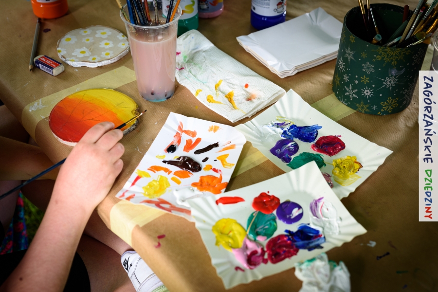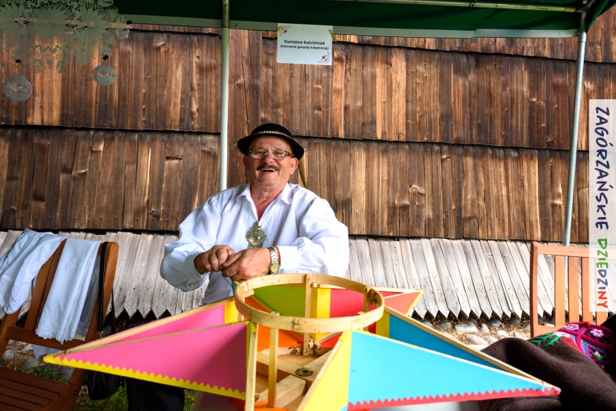 Dużo działo się nie tylko w środku – równocześnie na zewnątrz Muzeum czekało mnóstwo atrakcji! Można było bowiem skorzystać z warsztatów pn. „Zagórzańska zabawka” oraz „Malowanie na szkle” czy też podpatrzeć pracę zagórzańskich rzemieślników. Zainteresowanych elementami stroju zagórzańskiego przyciągnęło stoisko Rafała Nowaka, kuśnierza z Kasiny Wielkiej, a także Marii Łabuz, gorseciarki z Łostówki. Obecny był również wikliniarz Marek Czech, Stanisław Kościelniak z własnoręcznie wykonanymi gwiazdami kolędniczymi, koronczarka Zofia Piętoń oraz Krystyna Kaczmarczyk produkująca tradycyjne ozdoby bożonarodzeniowe i kwiaty bibułkowe, której tego dnia towarzyszyły trzy gaździny z KGW Olszówka. Instruktażu w zakresie technik malowania na desce udzielała Monika Rataj, zagórzańska malarka. Smakosze mogli spróbować słodkich, naturalnych pyszności przy stoisku Moniki i Piotra Woźniaków reprezentujących Pasiekę u Piotra Woźniaka z Koniny, Kingi i Macieja Komenzów częstujących lodami rzemieślniczymi z manufaktury Lody i Spółka czy też u Moniki Kubik oferującej gorczańskie sery i prowadzącej warsztaty z tworzenia tych wytrawnych przysmaków. Kuszące zapachy dochodziły również ze stoiska „Śwarnych Babek” z Koła Gospodyń Wiejskich Łętowe, które częstowały zagórzańskimi potrawami regionalnymi: zagórzańską zupą z korpieli na mleku, razowym kołaczem na słono i pierogami z suszonymi śliwkami (400 szt. tych ostatnich „wyszło” w mig i pozostawiło po sobie echo mlaskania…; tym razem to one były hitem imprezy!). Pośród stoisk dostępna była także drewniana ścianka do zdjęć, na której każdy chętny znalazł elementy stroju regionalnego i w takim anturażu mógł zrobić sobie fotki (dobry przykład dali sami organizatorzy), czy nowe! monidło – efekt wspólnej pracy Pawła Widzisza vel Drewniane cuda z Kasinki i naszej zagórzańskiej artystki, Józefy Potaczek. Skutecznie do odkrywania Zagórzańskich Dziedzin zachęcali na stoisku promocyjnym: Lucyna Pazdur reprezentująca KSOS Bazę Lubogoszcz, Maria Knapczyk i Grzegorz Kubowicz, nasz Zagórzański Informator Turystyczny. Ozdobą tego mobilnego Punktu Informacji Turystycznej były markowe miody z Pasieki Przygórze nr 248, której właścicielem jest Józef Bierowiec, paradzący się na imprezie w regionalnym ubraniu, z piękną Zagórzanką u boku (jego żoną!). Swoimi szydełkowymi wyrobami kuracjuszy przyciągały Sznurkowe Perełki oraz Barbara Jarosz; skutecznie wabiły kolorowe, edukacyjne książeczki mszańskiej pisarki, Władysławy Anny Jamróz (mieć w swojej biblioteczce egzemplarz z dedykacją i podpisem samej autorki to jest coś!).
