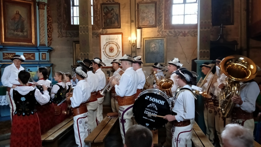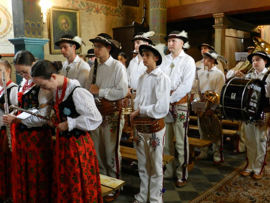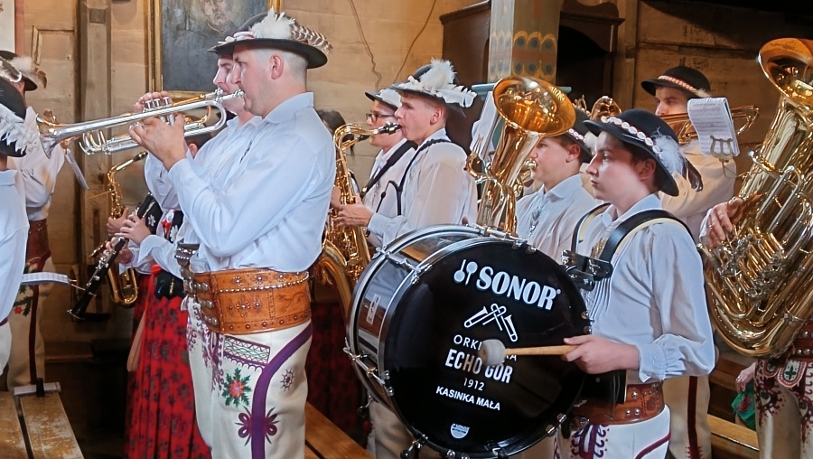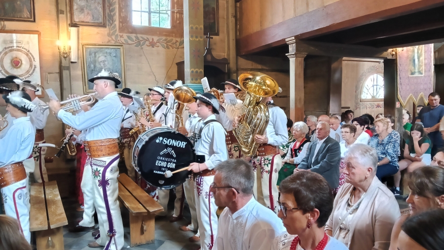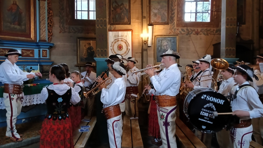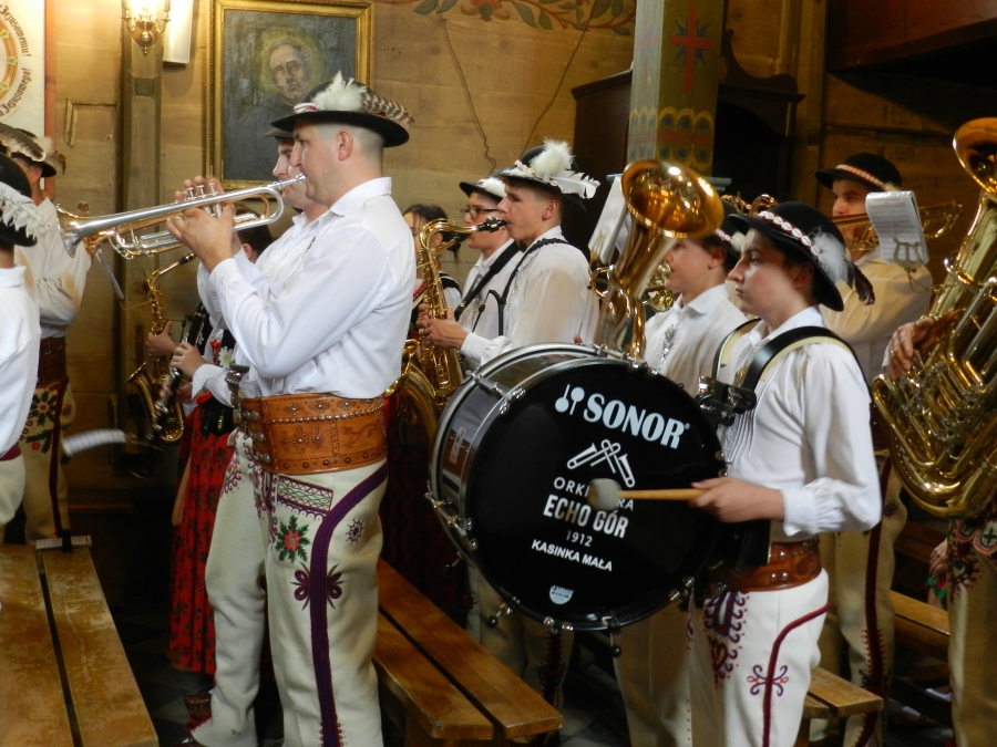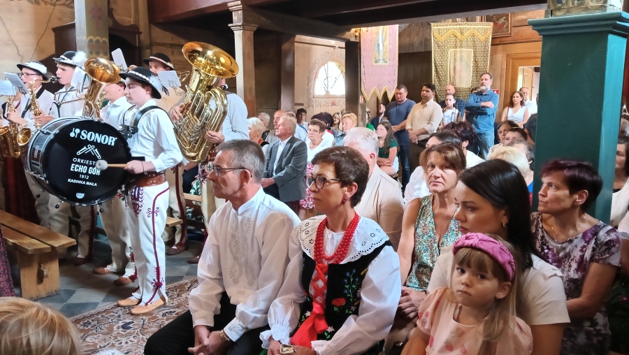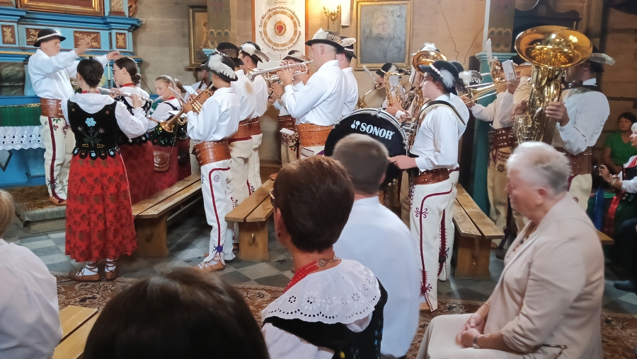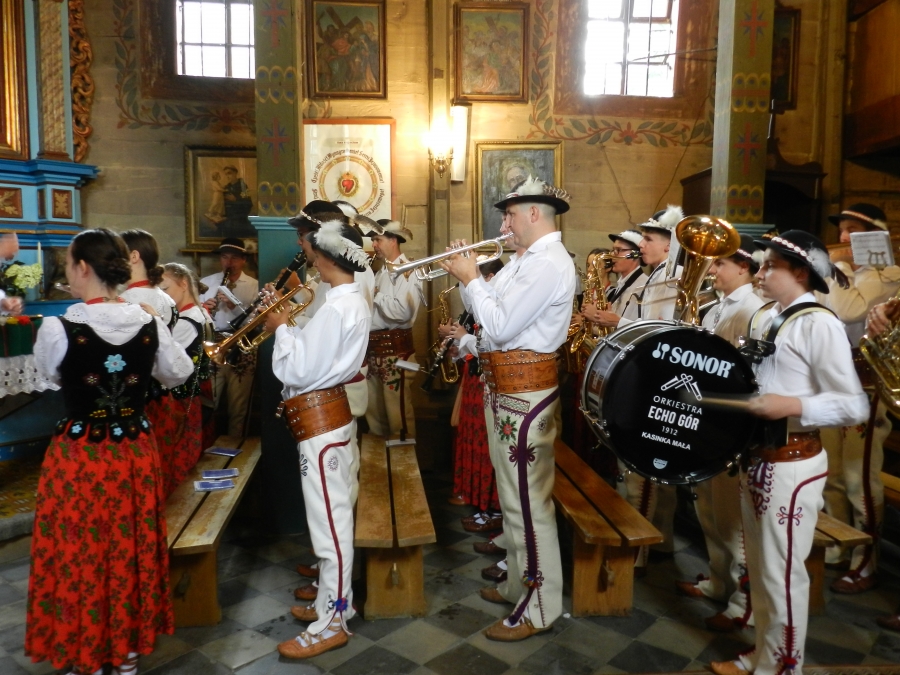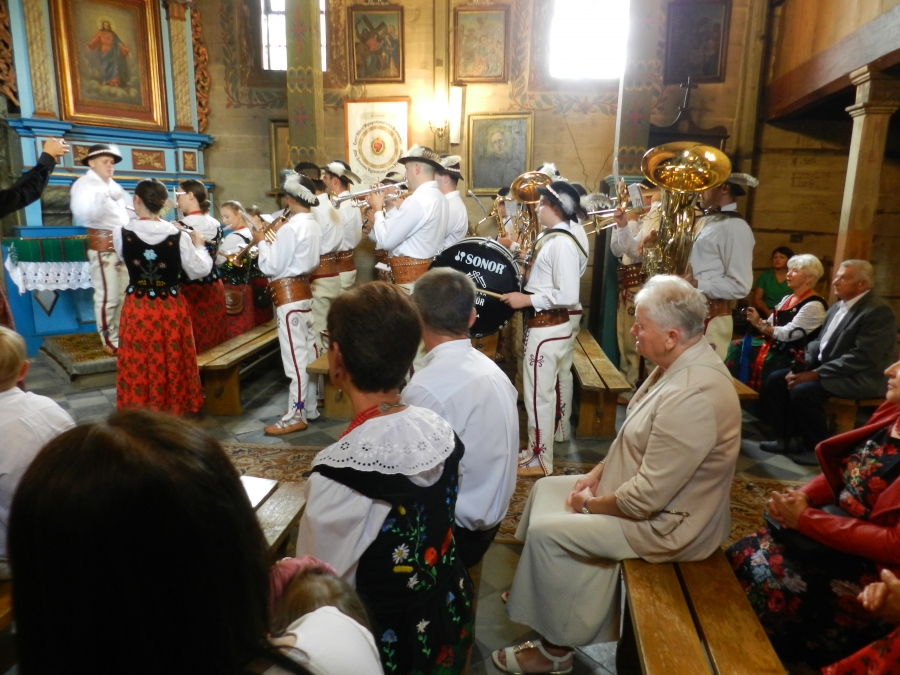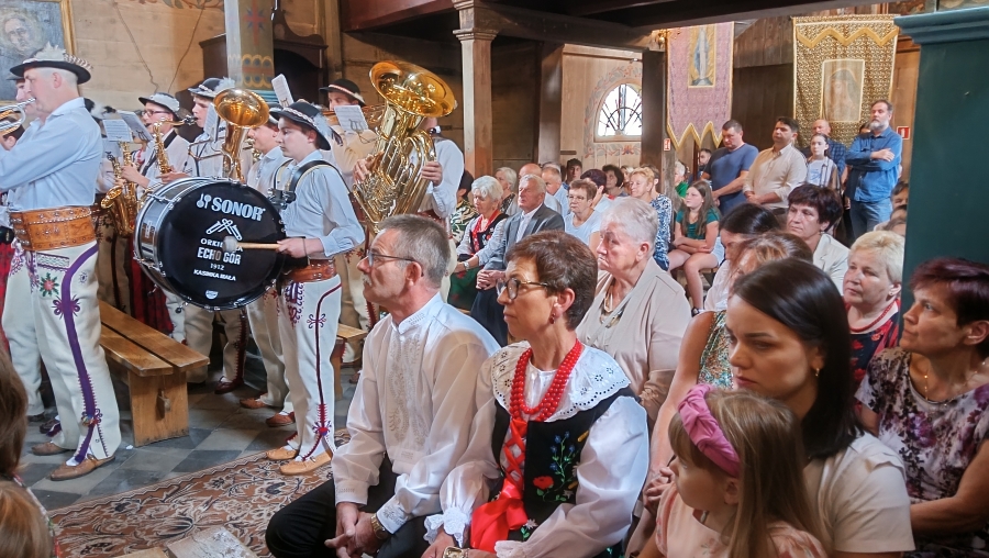 Wspólnej modlitwie przewodniczył tym razem rodak z Kasiny Wielkiej, Ojciec Erwin Ceklarz, gwardian klasztoru OO. Bernardynów w Przeworsku, proboszcz tamtejszej parafii, zaś muzycznie w celebrację włączyli się członkowie Orkiestry Dętej Echo Gór z Kasinki Małej. Wygrywane przez nich melodie nabożnych pieśni koiły zmysły, uspokajały, nastrajały i pomagały skupić się na modlitwie. Również okolicznościowy koncert po Mszy św. wykonali w kościele, wszak tradycji musiało stać się zadość, a pogoda nie pozwalała na plenerowe popisy. A słuchać było komu… Oprócz stałych bywalców, co to sobie już nie wyobrażają ostatniej niedzieli miesiąca bez udziału w tej szczególnej Eucharystii przepełnionej na wskroś regionem, byli turyści (poznaliśmy np. sympatyczną rodzinkę z Wrocławia stacjonującą w Łostówce), weekendowi i stali mieszkańcy Kasiny Wielkiej i sąsiednich miejscowości, nasi przyjaciele z Podobina (Jasiu ze swoją mamą), Mszany Górnej i Dolnej, czy Kasinki Małej. Gospodarskim okien na wszystko rzucił ks. Wiesław Maciaszek, proboszcz z Kasiny Wielkiej. Uczestników uroczystości bardzo ucieszył fakt obecności włodarza Gminy Mszana Dolna, Wójta, Mirosława Cichorza i jego rodziny. Serdeczne powitania i szczere uśmiechy potwierdzają fakt, że i na takim wydarzeniu pragną porozmawiać, tak na luzie, z tym, który kieruje ich samorządem i koordynuje działania Zagórzańskich Dziedzin.