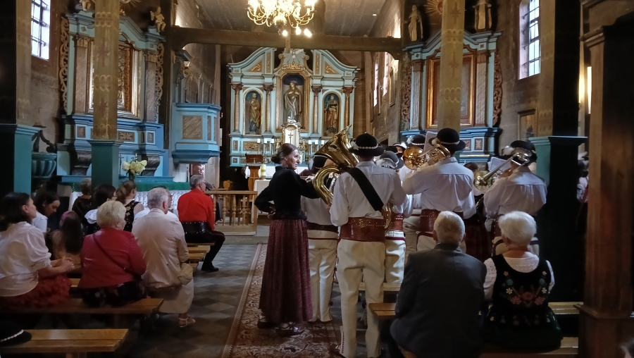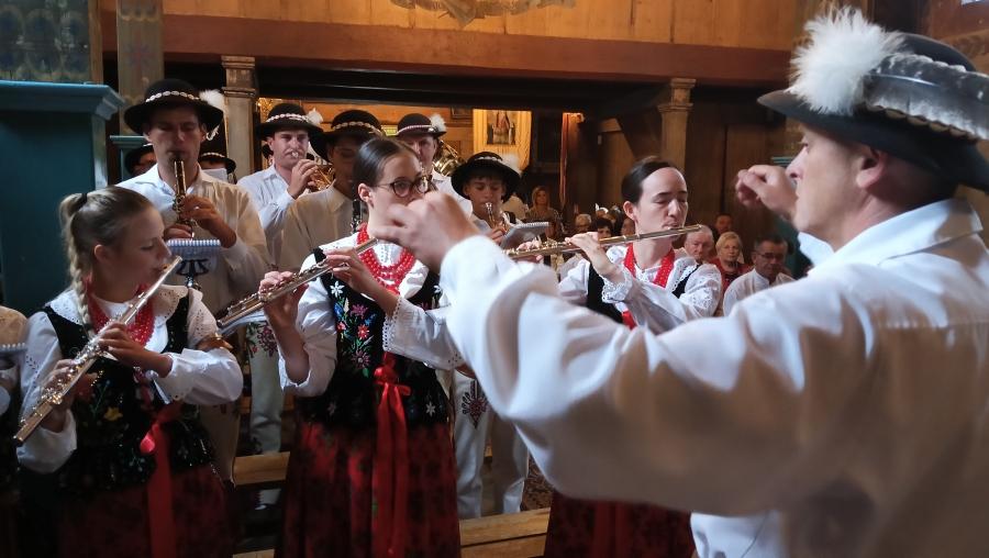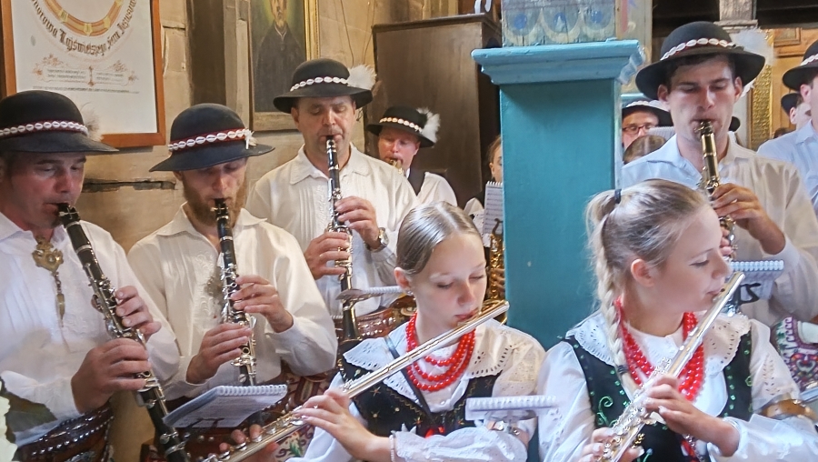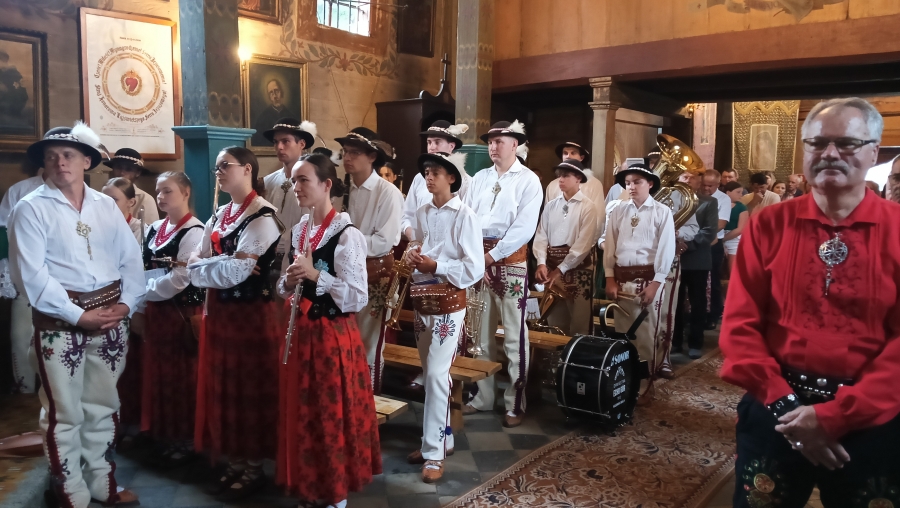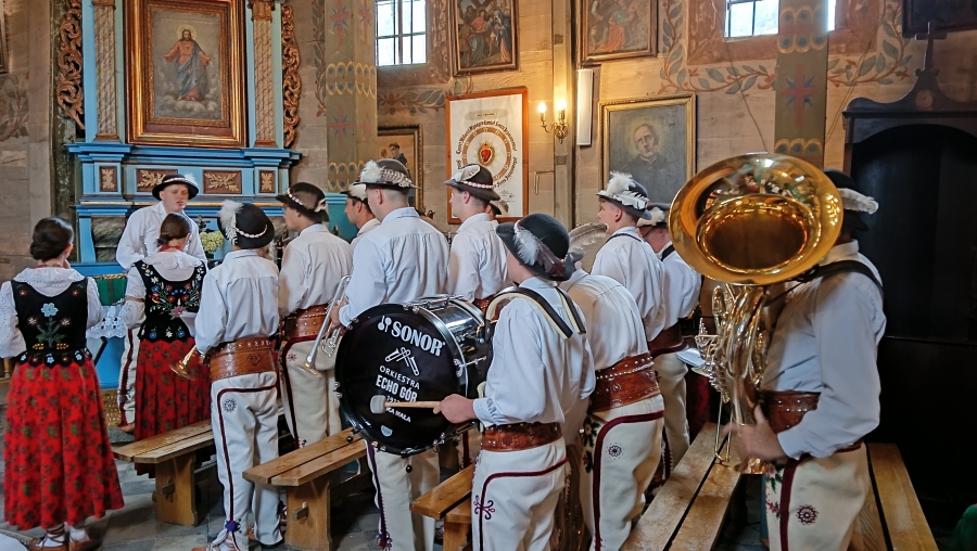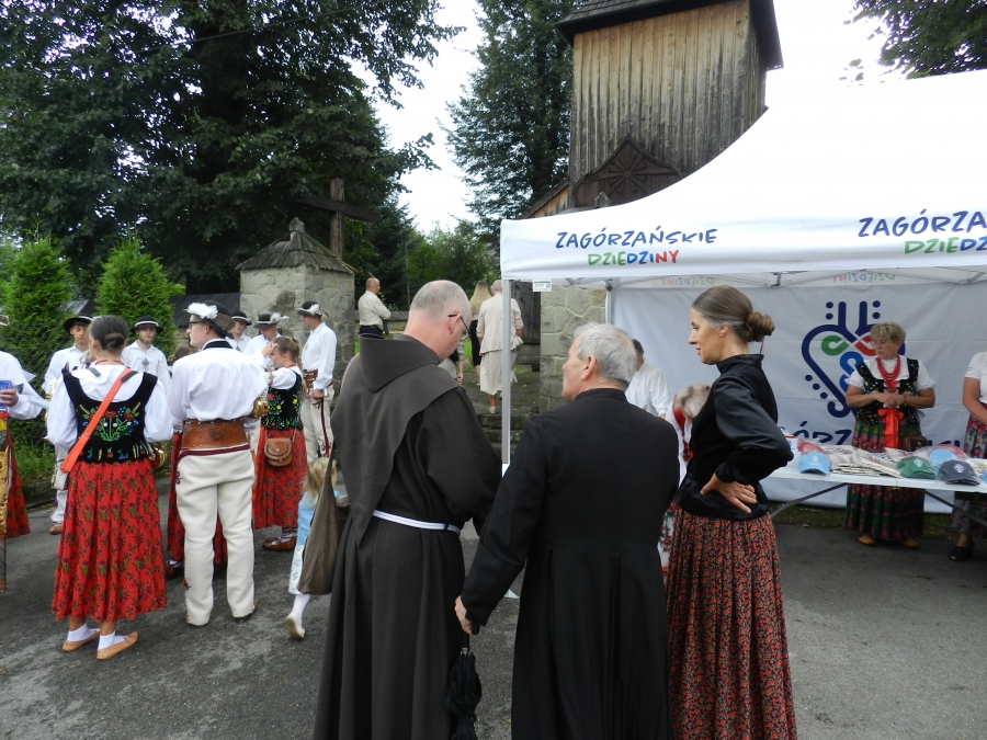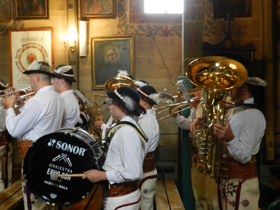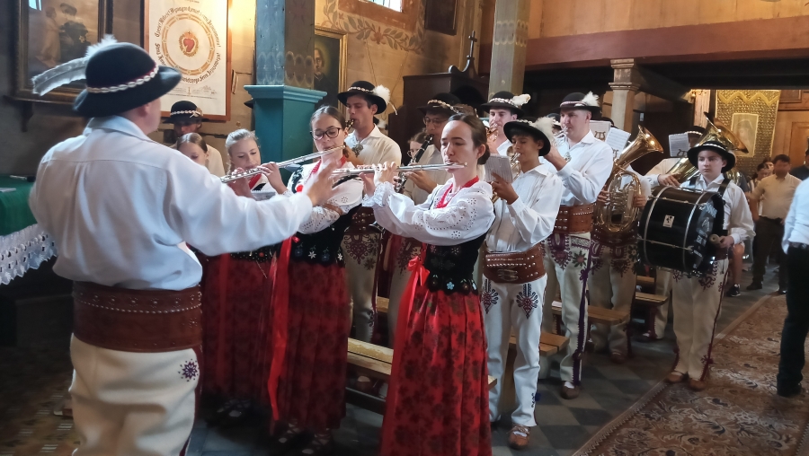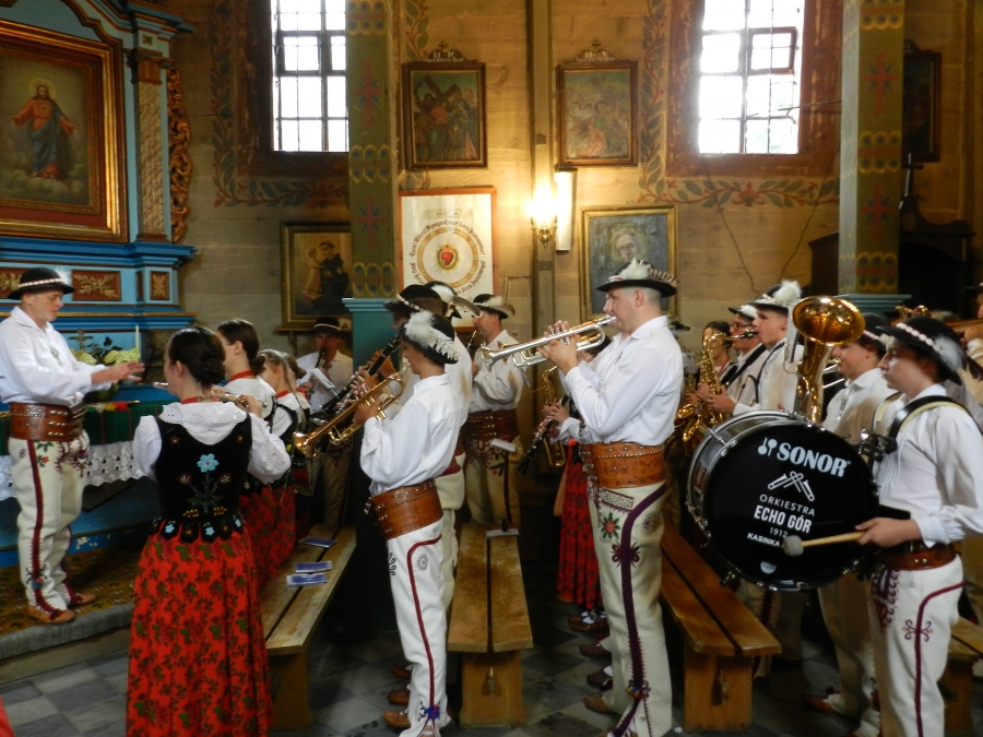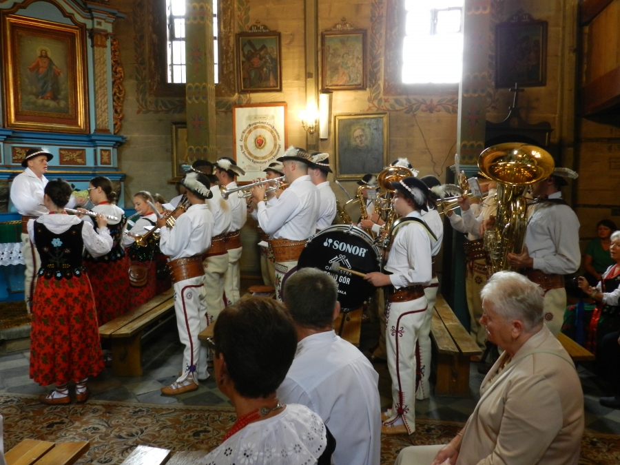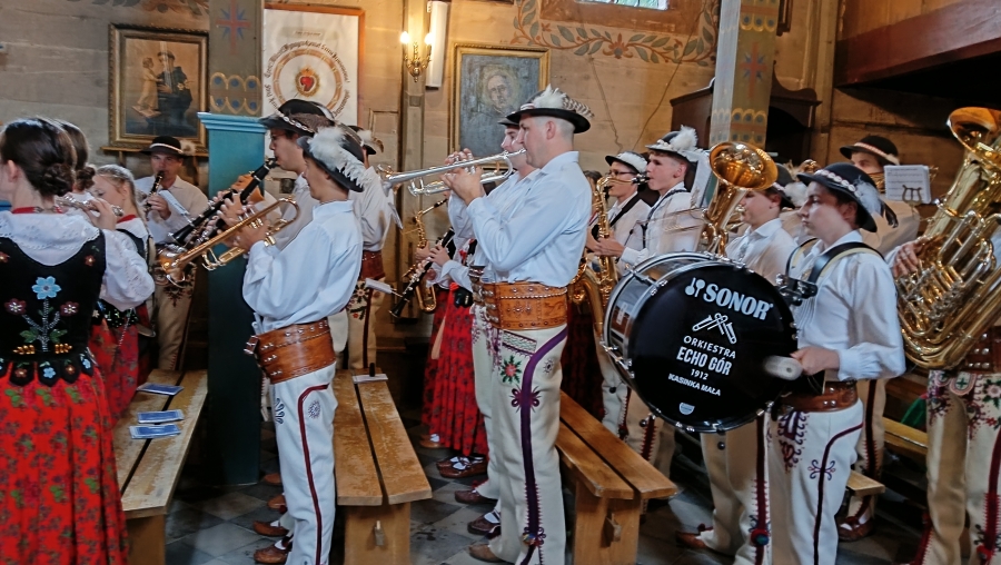 Wspólnej modlitwie przewodniczył tym razem rodak z Kasiny Wielkiej, Ojciec Erwin Ceklarz, gwardian klasztoru OO. Bernardynów w Przeworsku, proboszcz tamtejszej parafii, zaś muzycznie w celebrację włączyli się członkowie Orkiestry Dętej Echo Gór z Kasinki Małej. Wygrywane przez nich melodie nabożnych pieśni koiły zmysły, uspokajały, nastrajały i pomagały skupić się na modlitwie. Również okolicznościowy koncert po Mszy św. wykonali w kościele, wszak tradycji musiało stać się zadość, a pogoda nie pozwalała na plenerowe popisy. A słuchać było komu… Oprócz stałych bywalców, co to sobie już nie wyobrażają ostatniej niedzieli miesiąca bez udziału w tej szczególnej Eucharystii przepełnionej na wskroś regionem, byli turyści (poznaliśmy np. sympatyczną rodzinkę z Wrocławia stacjonującą w Łostówce), weekendowi i stali mieszkańcy Kasiny Wielkiej i sąsiednich miejscowości, nasi przyjaciele z Podobina (Jasiu ze swoją mamą), Mszany Górnej i Dolnej, czy Kasinki Małej. Gospodarskim okien na wszystko rzucił ks. Wiesław Maciaszek, proboszcz z Kasiny Wielkiej. Uczestników uroczystości bardzo ucieszył fakt obecności włodarza Gminy Mszana Dolna, Wójta, Mirosława Cichorza i jego rodziny. Serdeczne powitania i szczere uśmiechy potwierdzają fakt, że i na takim wydarzeniu pragną porozmawiać, tak na luzie, z tym, który kieruje ich samorządem i koordynuje działania Zagórzańskich Dziedzin.