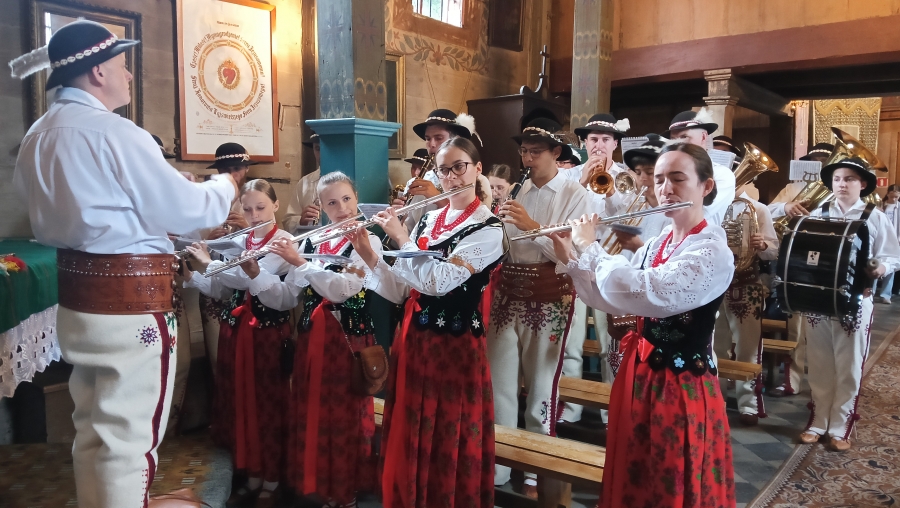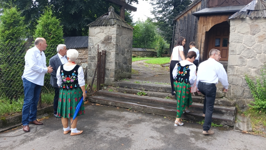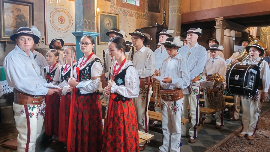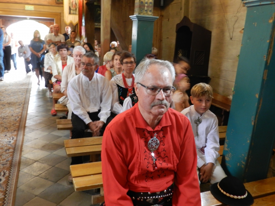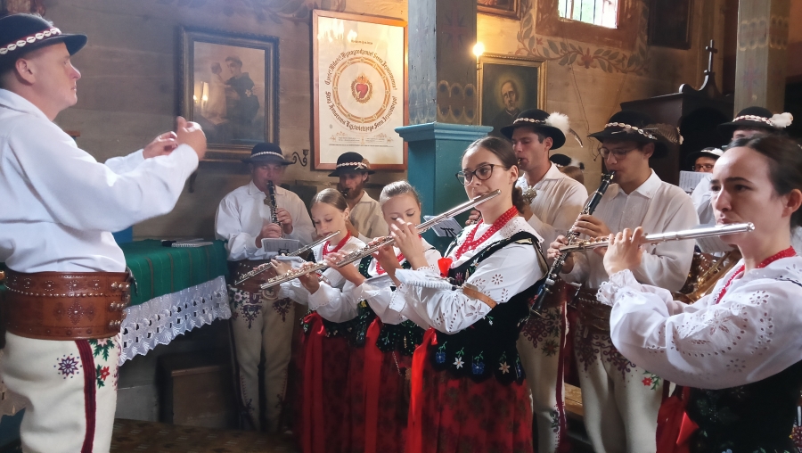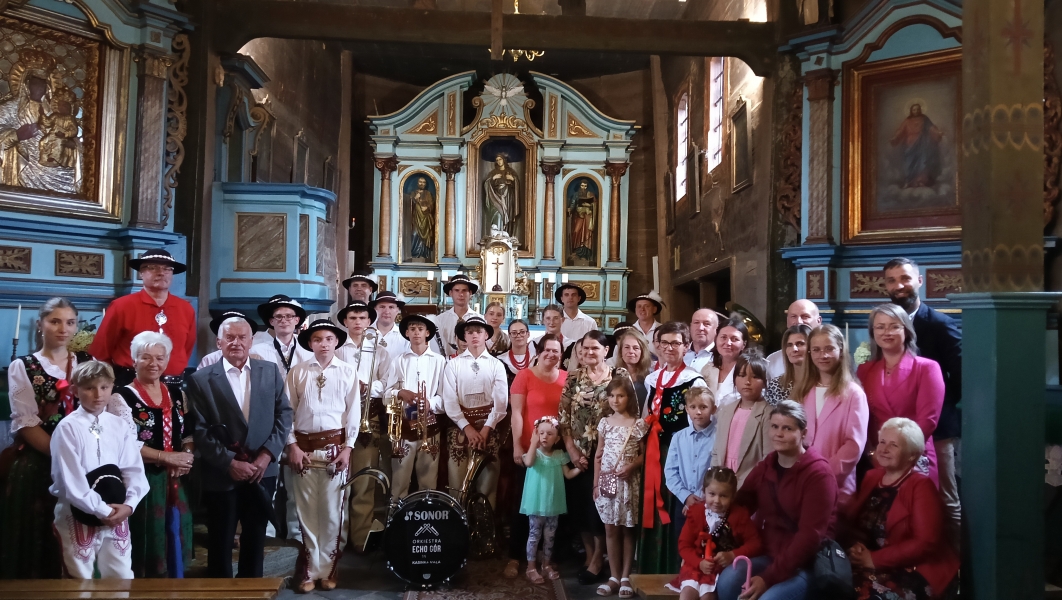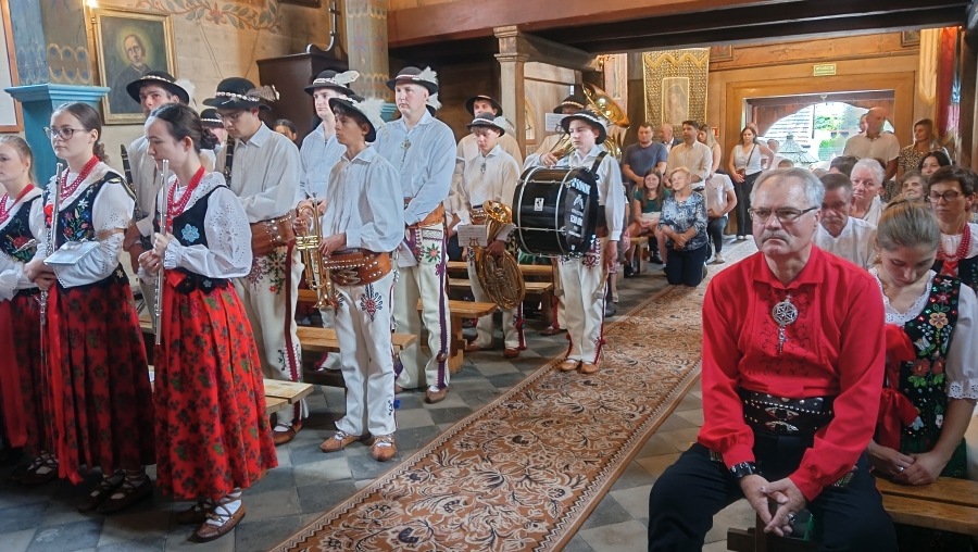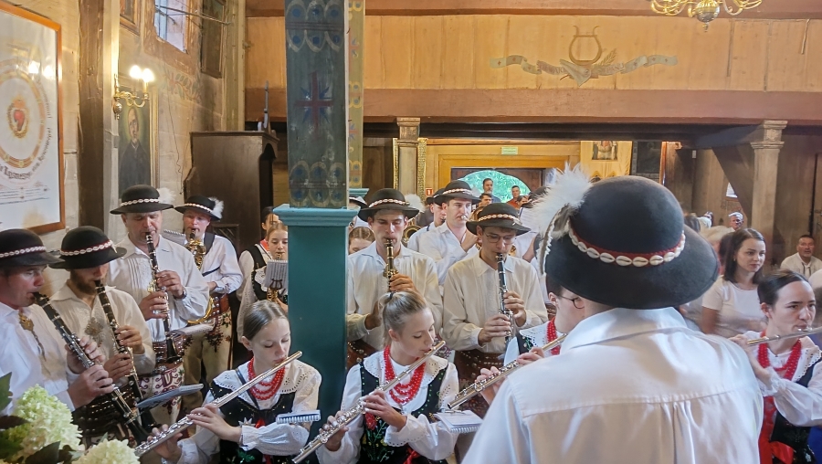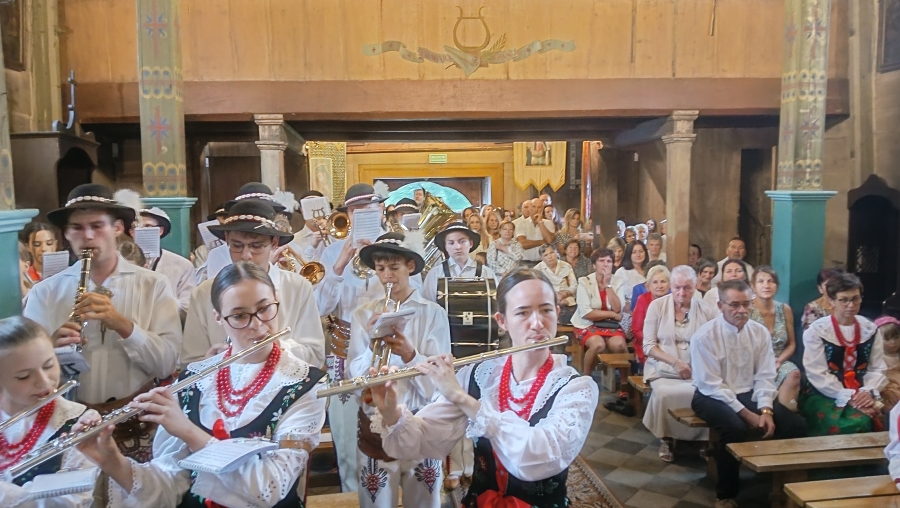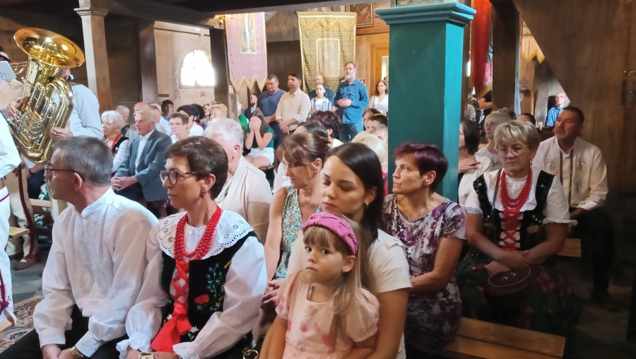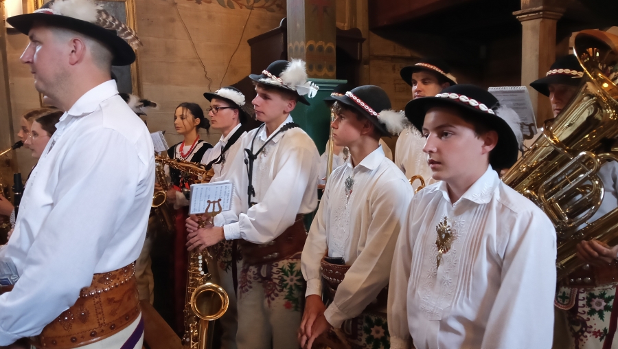 Wspólnej modlitwie przewodniczył tym razem rodak z Kasiny Wielkiej, Ojciec Erwin Ceklarz, gwardian klasztoru OO. Bernardynów w Przeworsku, proboszcz tamtejszej parafii, zaś muzycznie w celebrację włączyli się członkowie Orkiestry Dętej Echo Gór z Kasinki Małej. Wygrywane przez nich melodie nabożnych pieśni koiły zmysły, uspokajały, nastrajały i pomagały skupić się na modlitwie. Również okolicznościowy koncert po Mszy św. wykonali w kościele, wszak tradycji musiało stać się zadość, a pogoda nie pozwalała na plenerowe popisy. A słuchać było komu… Oprócz stałych bywalców, co to sobie już nie wyobrażają ostatniej niedzieli miesiąca bez udziału w tej szczególnej Eucharystii przepełnionej na wskroś regionem, byli turyści (poznaliśmy np. sympatyczną rodzinkę z Wrocławia stacjonującą w Łostówce), weekendowi i stali mieszkańcy Kasiny Wielkiej i sąsiednich miejscowości, nasi przyjaciele z Podobina (Jasiu ze swoją mamą), Mszany Górnej i Dolnej, czy Kasinki Małej. Gospodarskim okien na wszystko rzucił ks. Wiesław Maciaszek, proboszcz z Kasiny Wielkiej. Uczestników uroczystości bardzo ucieszył fakt obecności włodarza Gminy Mszana Dolna, Wójta, Mirosława Cichorza i jego rodziny. Serdeczne powitania i szczere uśmiechy potwierdzają fakt, że i na takim wydarzeniu pragną porozmawiać, tak na luzie, z tym, który kieruje ich samorządem i koordynuje działania Zagórzańskich Dziedzin.
