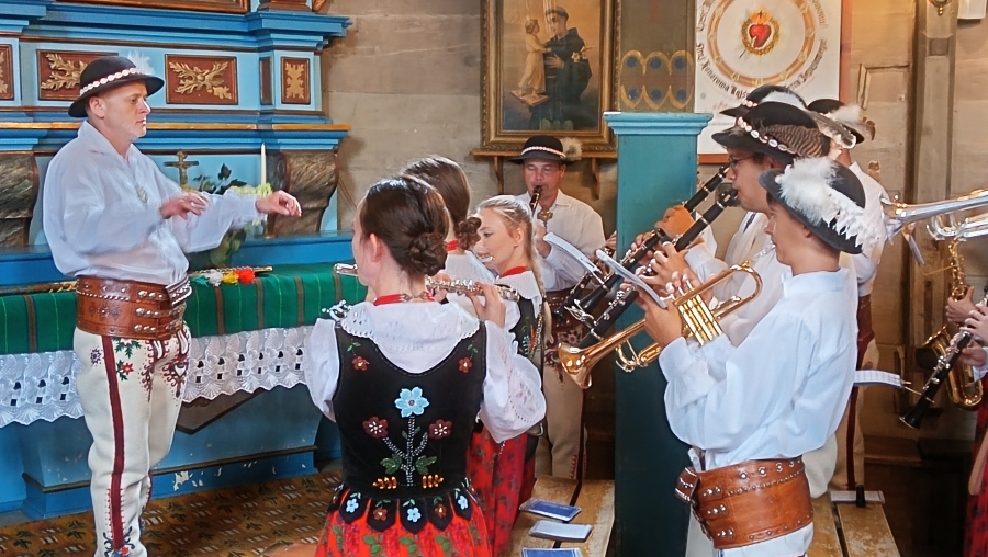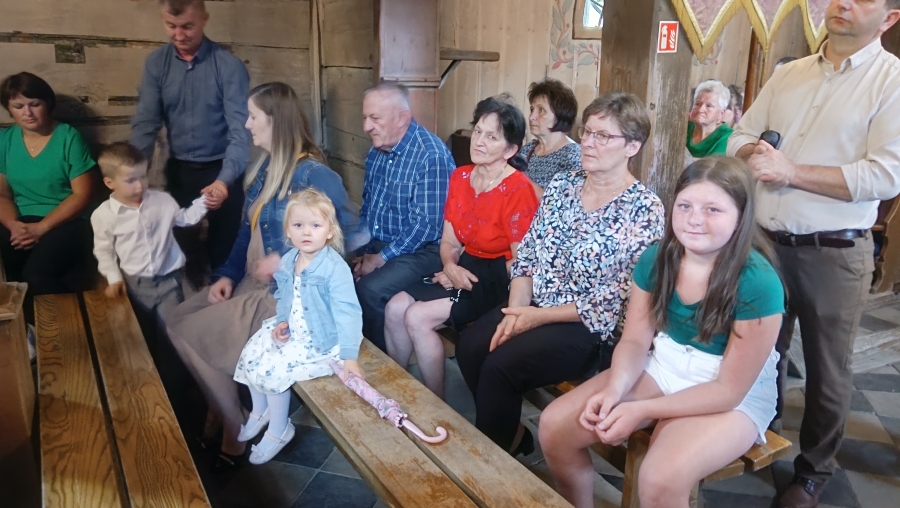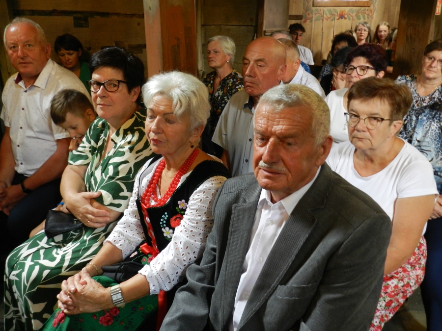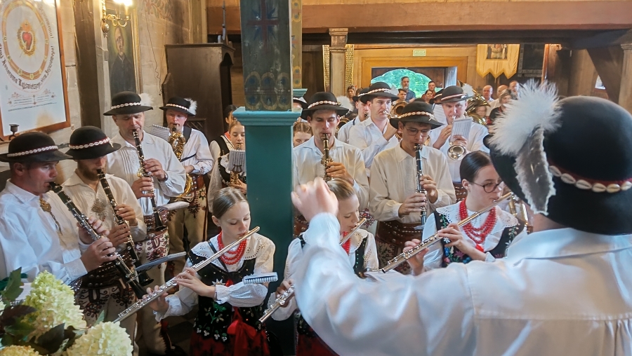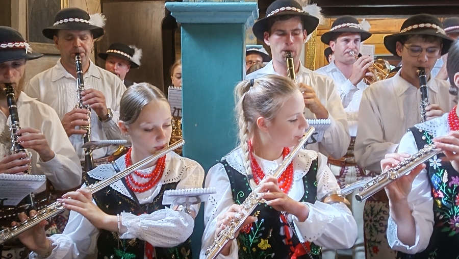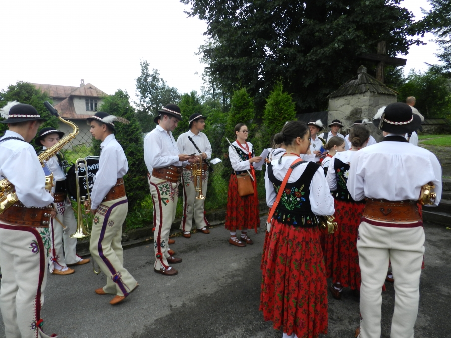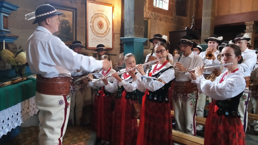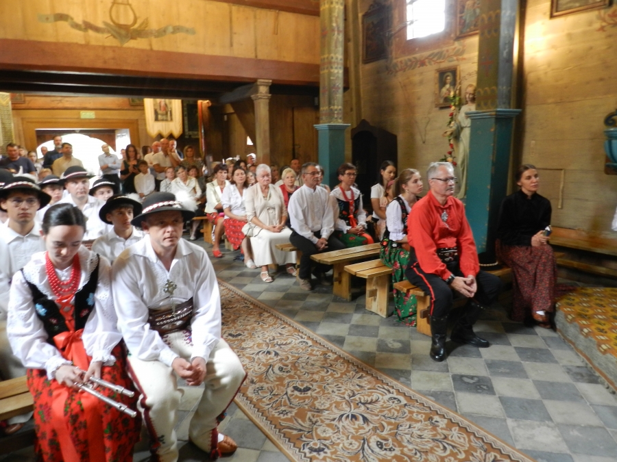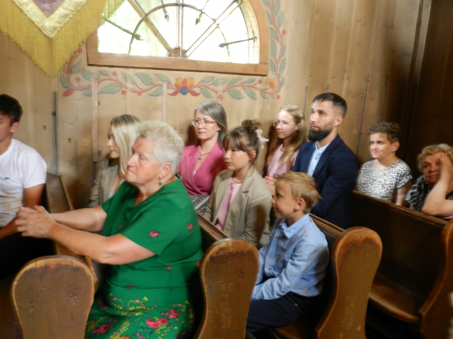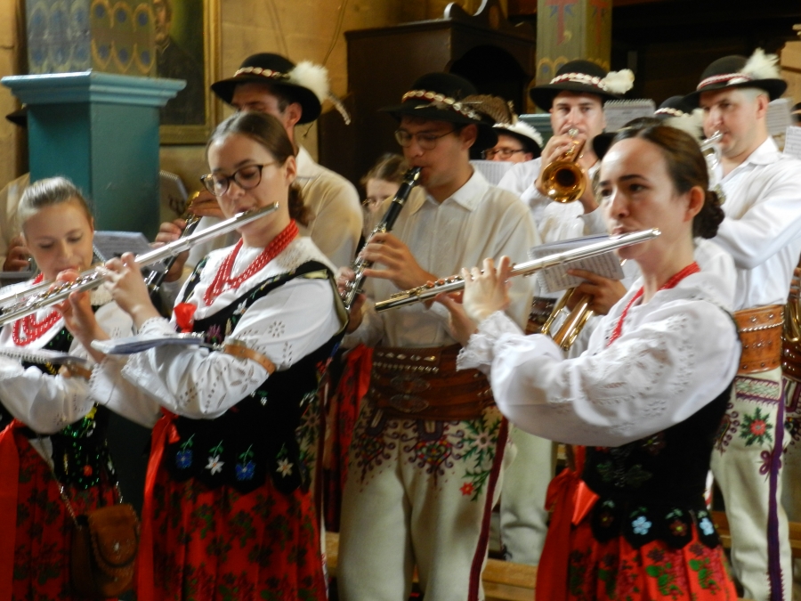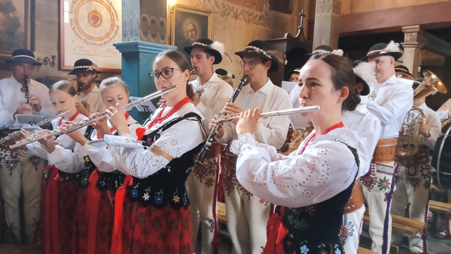 Wspólnej modlitwie przewodniczył tym razem rodak z Kasiny Wielkiej, Ojciec Erwin Ceklarz, gwardian klasztoru OO. Bernardynów w Przeworsku, proboszcz tamtejszej parafii, zaś muzycznie w celebrację włączyli się członkowie Orkiestry Dętej Echo Gór z Kasinki Małej. Wygrywane przez nich melodie nabożnych pieśni koiły zmysły, uspokajały, nastrajały i pomagały skupić się na modlitwie. Również okolicznościowy koncert po Mszy św. wykonali w kościele, wszak tradycji musiało stać się zadość, a pogoda nie pozwalała na plenerowe popisy. A słuchać było komu… Oprócz stałych bywalców, co to sobie już nie wyobrażają ostatniej niedzieli miesiąca bez udziału w tej szczególnej Eucharystii przepełnionej na wskroś regionem, byli turyści (poznaliśmy np. sympatyczną rodzinkę z Wrocławia stacjonującą w Łostówce), weekendowi i stali mieszkańcy Kasiny Wielkiej i sąsiednich miejscowości, nasi przyjaciele z Podobina (Jasiu ze swoją mamą), Mszany Górnej i Dolnej, czy Kasinki Małej. Gospodarskim okien na wszystko rzucił ks. Wiesław Maciaszek, proboszcz z Kasiny Wielkiej. Uczestników uroczystości bardzo ucieszył fakt obecności włodarza Gminy Mszana Dolna, Wójta, Mirosława Cichorza i jego rodziny. Serdeczne powitania i szczere uśmiechy potwierdzają fakt, że i na takim wydarzeniu pragną porozmawiać, tak na luzie, z tym, który kieruje ich samorządem i koordynuje działania Zagórzańskich Dziedzin.