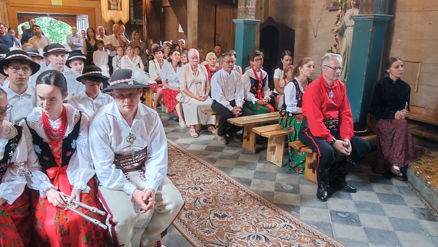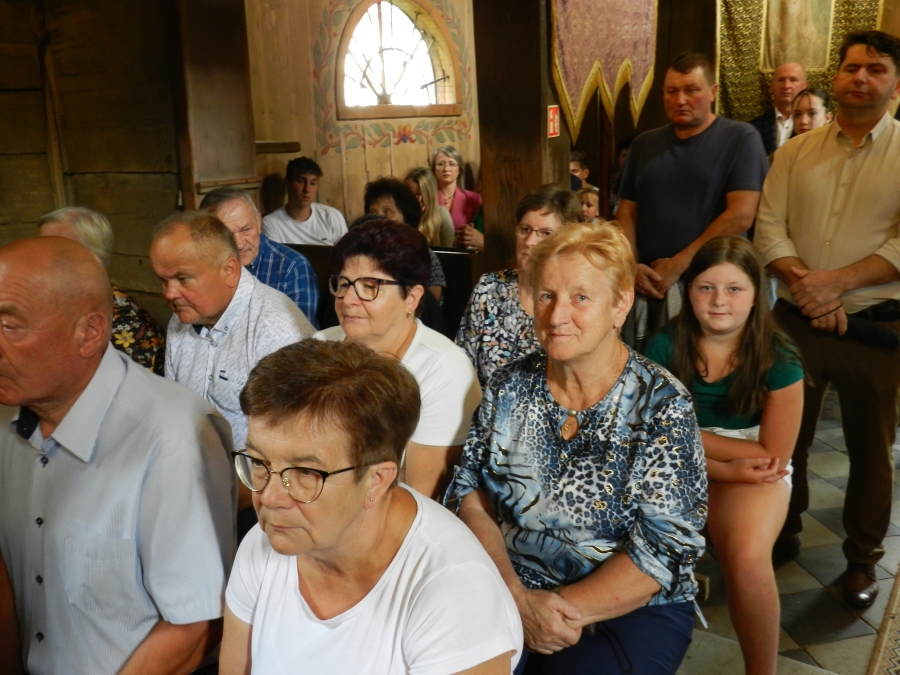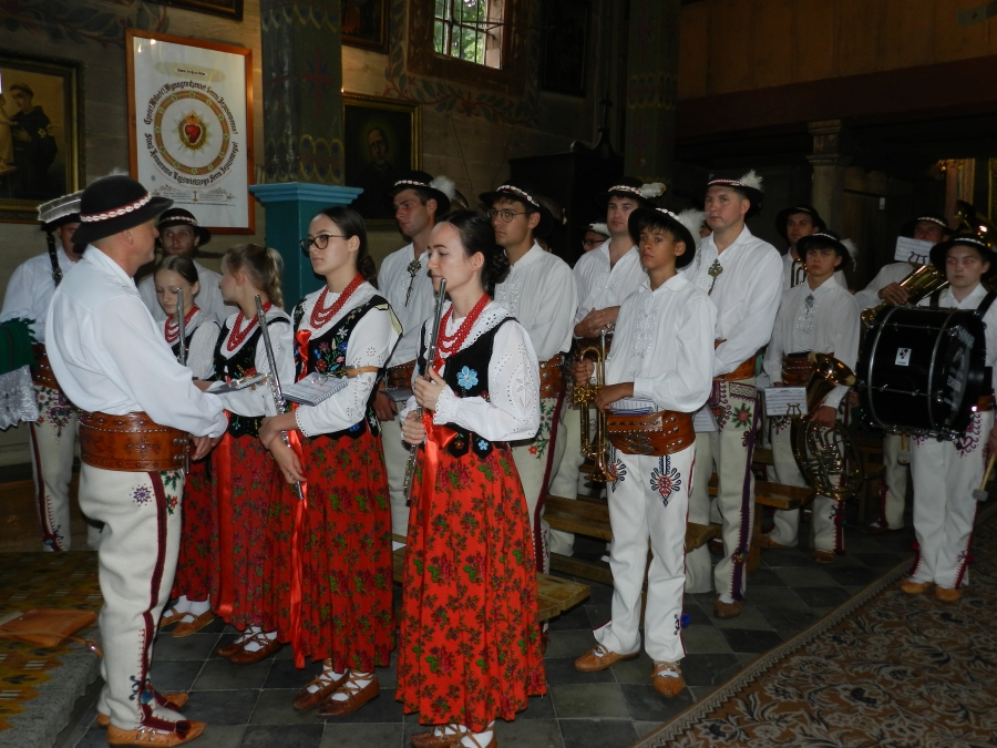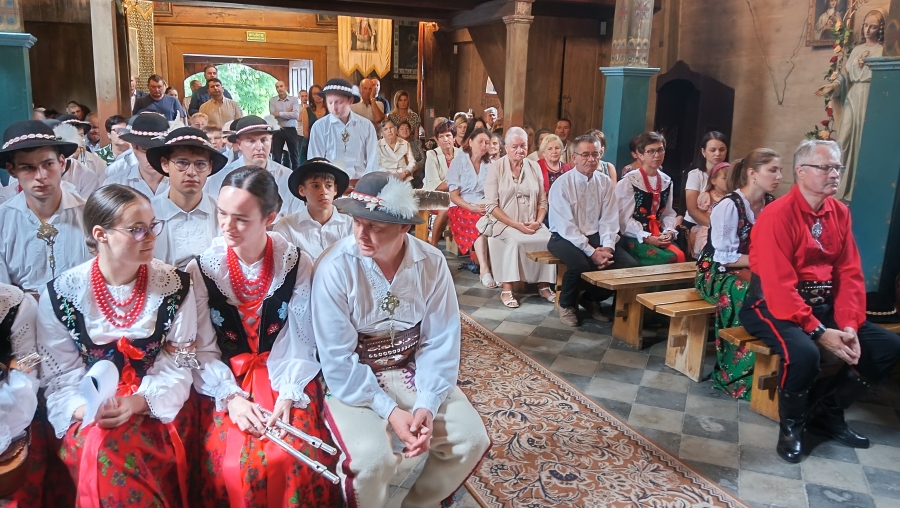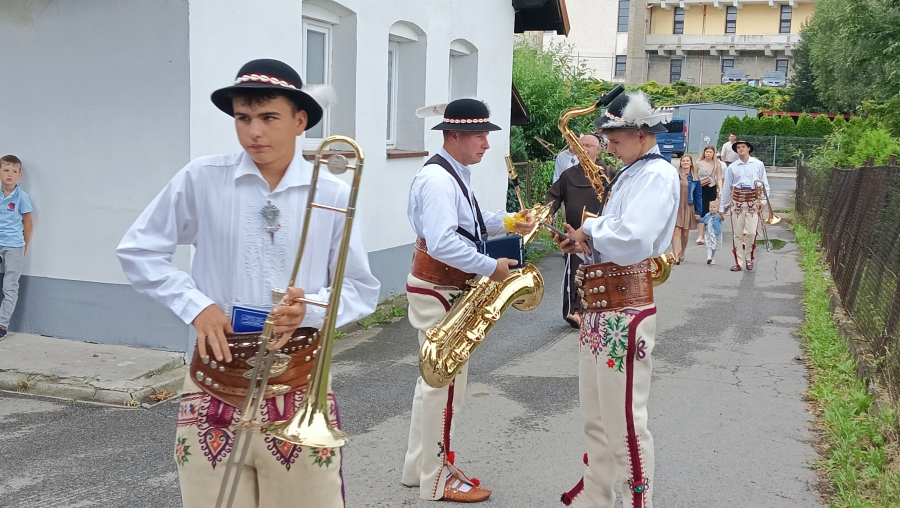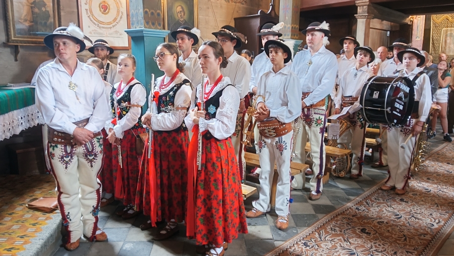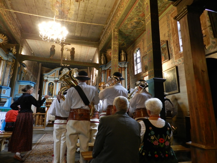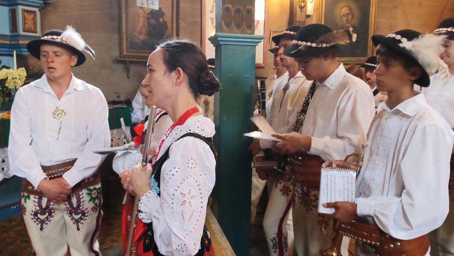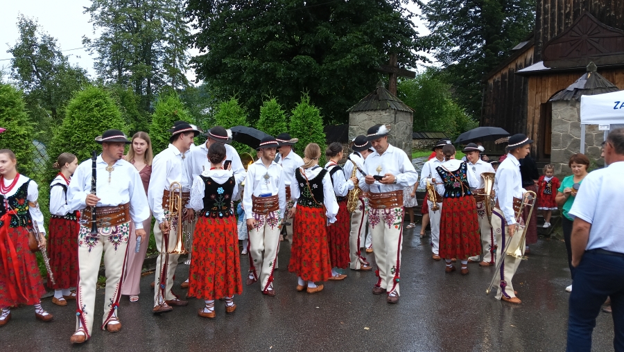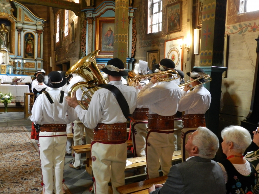 Wspólnej modlitwie przewodniczył tym razem rodak z Kasiny Wielkiej, Ojciec Erwin Ceklarz, gwardian klasztoru OO. Bernardynów w Przeworsku, proboszcz tamtejszej parafii, zaś muzycznie w celebrację włączyli się członkowie Orkiestry Dętej Echo Gór z Kasinki Małej. Wygrywane przez nich melodie nabożnych pieśni koiły zmysły, uspokajały, nastrajały i pomagały skupić się na modlitwie. Również okolicznościowy koncert po Mszy św. wykonali w kościele, wszak tradycji musiało stać się zadość, a pogoda nie pozwalała na plenerowe popisy. A słuchać było komu… Oprócz stałych bywalców, co to sobie już nie wyobrażają ostatniej niedzieli miesiąca bez udziału w tej szczególnej Eucharystii przepełnionej na wskroś regionem, byli turyści (poznaliśmy np. sympatyczną rodzinkę z Wrocławia stacjonującą w Łostówce), weekendowi i stali mieszkańcy Kasiny Wielkiej i sąsiednich miejscowości, nasi przyjaciele z Podobina (Jasiu ze swoją mamą), Mszany Górnej i Dolnej, czy Kasinki Małej. Gospodarskim okien na wszystko rzucił ks. Wiesław Maciaszek, proboszcz z Kasiny Wielkiej. Uczestników uroczystości bardzo ucieszył fakt obecności włodarza Gminy Mszana Dolna, Wójta, Mirosława Cichorza i jego rodziny. Serdeczne powitania i szczere uśmiechy potwierdzają fakt, że i na takim wydarzeniu pragną porozmawiać, tak na luzie, z tym, który kieruje ich samorządem i koordynuje działania Zagórzańskich Dziedzin.