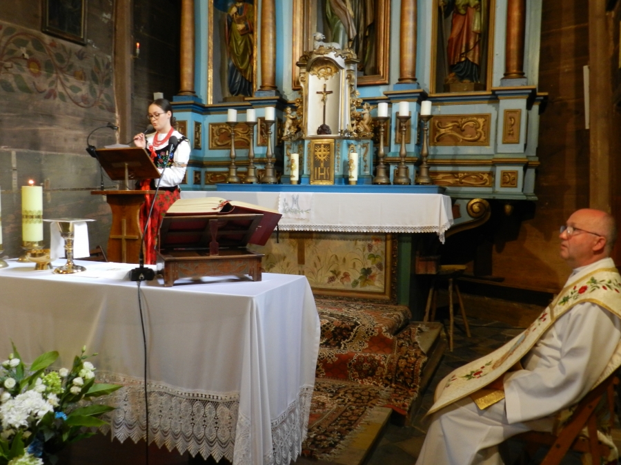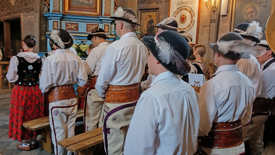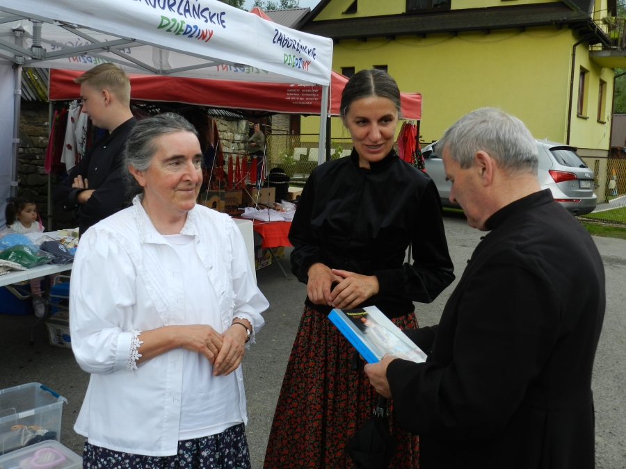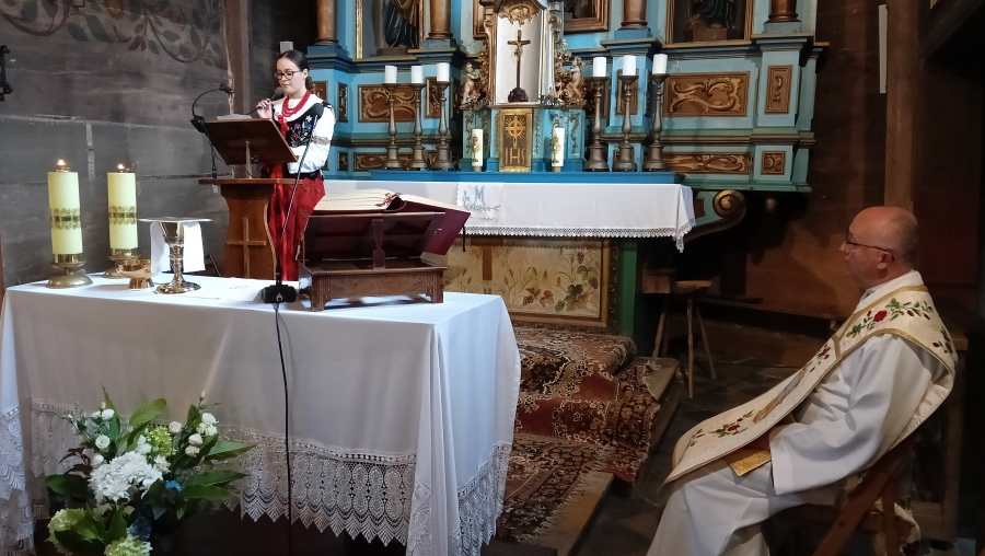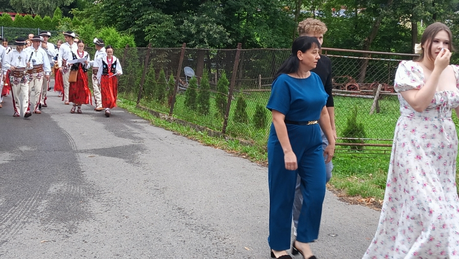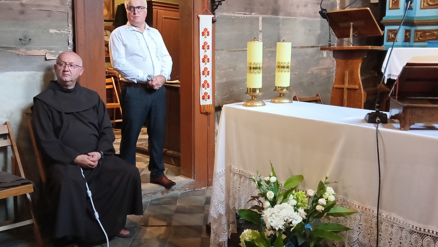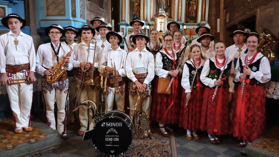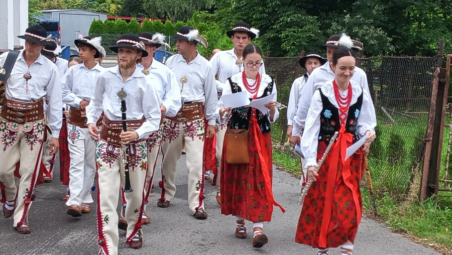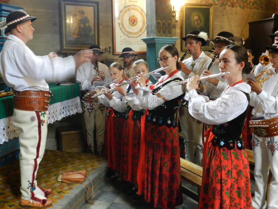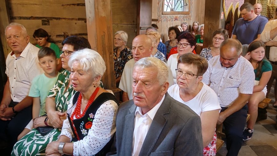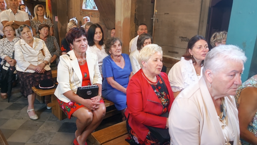 Wspólnej modlitwie przewodniczył tym razem rodak z Kasiny Wielkiej, Ojciec Erwin Ceklarz, gwardian klasztoru OO. Bernardynów w Przeworsku, proboszcz tamtejszej parafii, zaś muzycznie w celebrację włączyli się członkowie Orkiestry Dętej Echo Gór z Kasinki Małej. Wygrywane przez nich melodie nabożnych pieśni koiły zmysły, uspokajały, nastrajały i pomagały skupić się na modlitwie. Również okolicznościowy koncert po Mszy św. wykonali w kościele, wszak tradycji musiało stać się zadość, a pogoda nie pozwalała na plenerowe popisy. A słuchać było komu… Oprócz stałych bywalców, co to sobie już nie wyobrażają ostatniej niedzieli miesiąca bez udziału w tej szczególnej Eucharystii przepełnionej na wskroś regionem, byli turyści (poznaliśmy np. sympatyczną rodzinkę z Wrocławia stacjonującą w Łostówce), weekendowi i stali mieszkańcy Kasiny Wielkiej i sąsiednich miejscowości, nasi przyjaciele z Podobina (Jasiu ze swoją mamą), Mszany Górnej i Dolnej, czy Kasinki Małej. Gospodarskim okien na wszystko rzucił ks. Wiesław Maciaszek, proboszcz z Kasiny Wielkiej. Uczestników uroczystości bardzo ucieszył fakt obecności włodarza Gminy Mszana Dolna, Wójta, Mirosława Cichorza i jego rodziny. Serdeczne powitania i szczere uśmiechy potwierdzają fakt, że i na takim wydarzeniu pragną porozmawiać, tak na luzie, z tym, który kieruje ich samorządem i koordynuje działania Zagórzańskich Dziedzin.