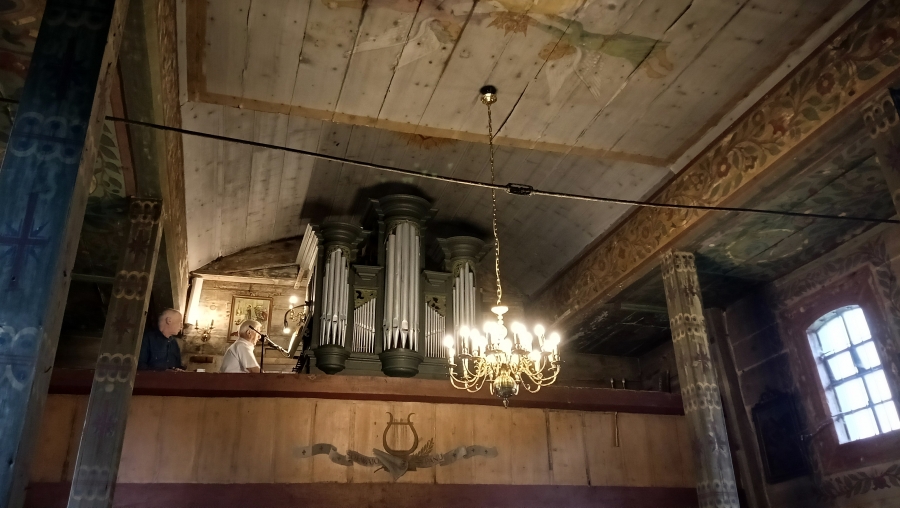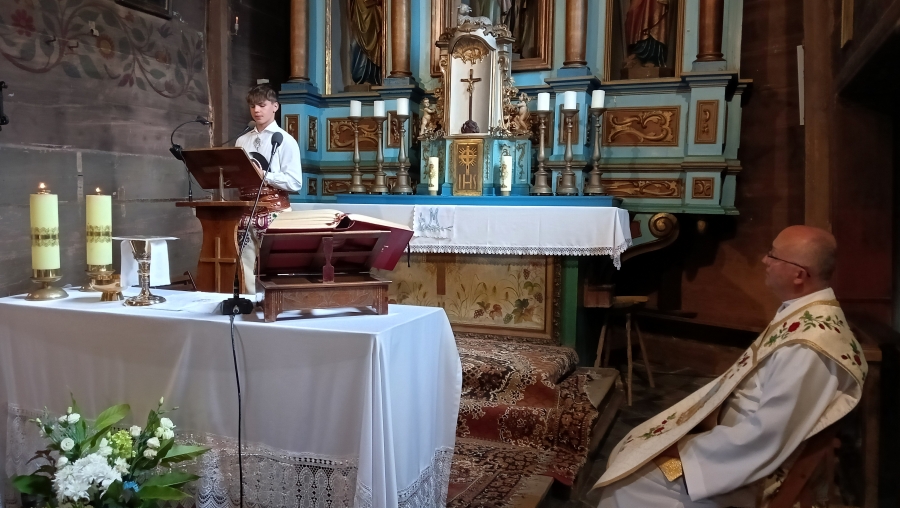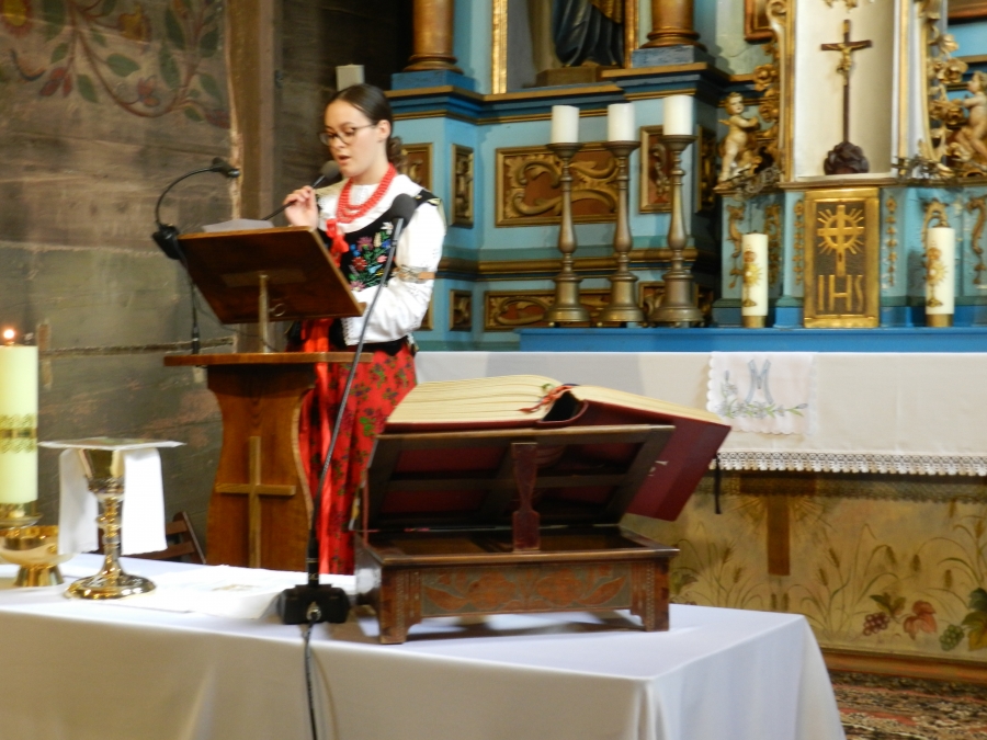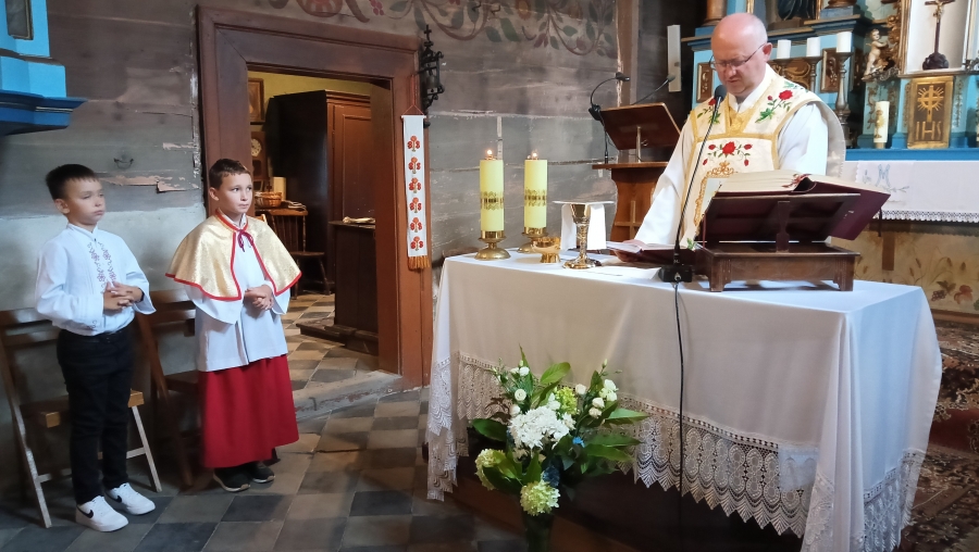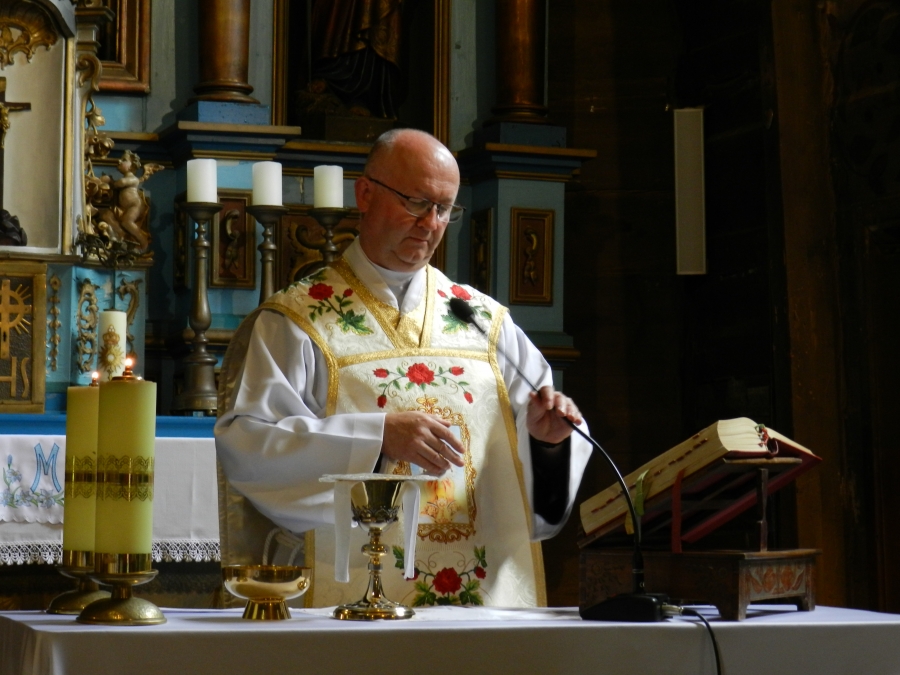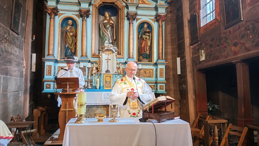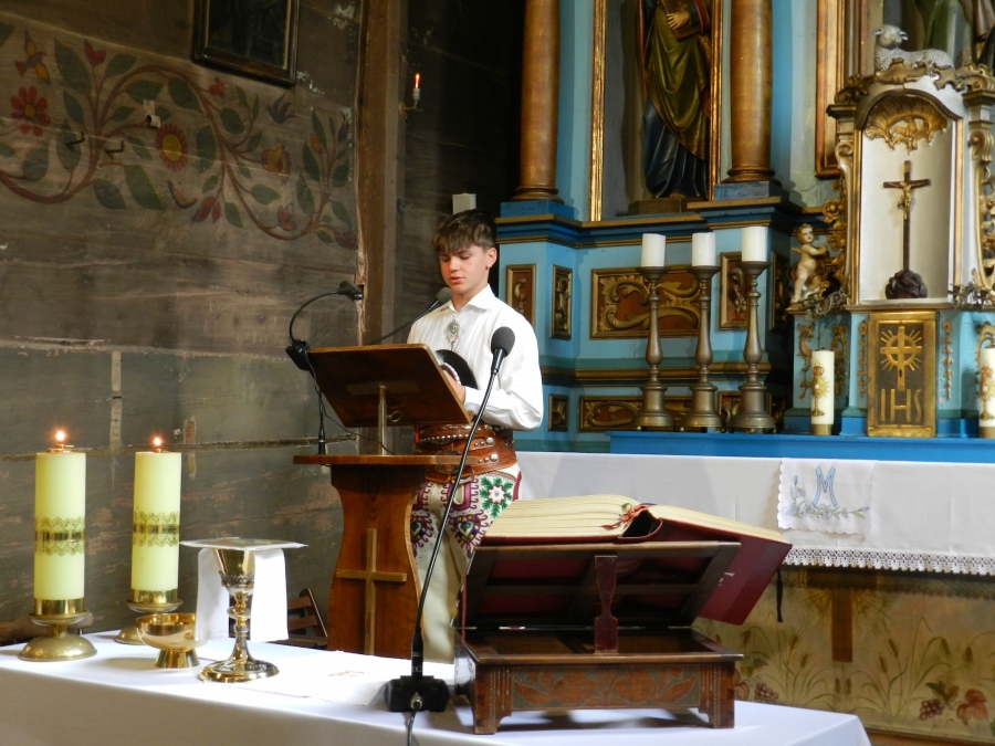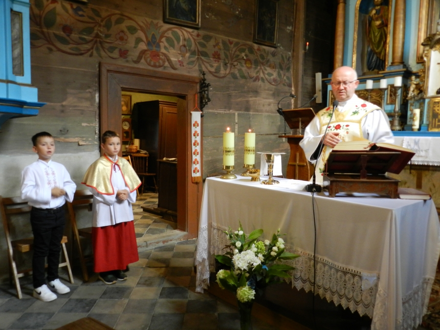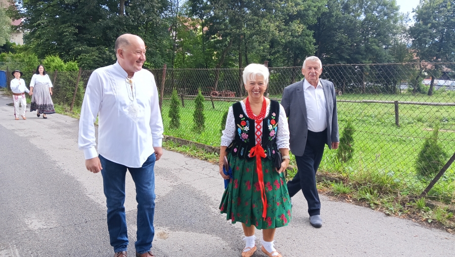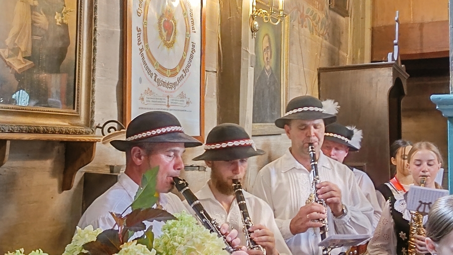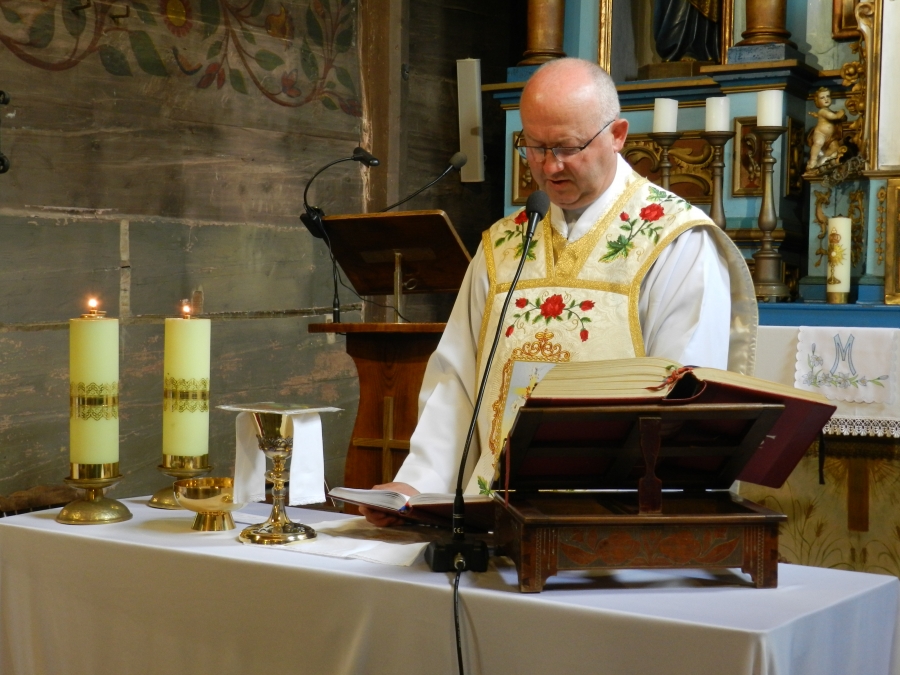 Wspólnej modlitwie przewodniczył tym razem rodak z Kasiny Wielkiej, Ojciec Erwin Ceklarz, gwardian klasztoru OO. Bernardynów w Przeworsku, proboszcz tamtejszej parafii, zaś muzycznie w celebrację włączyli się członkowie Orkiestry Dętej Echo Gór z Kasinki Małej. Wygrywane przez nich melodie nabożnych pieśni koiły zmysły, uspokajały, nastrajały i pomagały skupić się na modlitwie. Również okolicznościowy koncert po Mszy św. wykonali w kościele, wszak tradycji musiało stać się zadość, a pogoda nie pozwalała na plenerowe popisy. A słuchać było komu… Oprócz stałych bywalców, co to sobie już nie wyobrażają ostatniej niedzieli miesiąca bez udziału w tej szczególnej Eucharystii przepełnionej na wskroś regionem, byli turyści (poznaliśmy np. sympatyczną rodzinkę z Wrocławia stacjonującą w Łostówce), weekendowi i stali mieszkańcy Kasiny Wielkiej i sąsiednich miejscowości, nasi przyjaciele z Podobina (Jasiu ze swoją mamą), Mszany Górnej i Dolnej, czy Kasinki Małej. Gospodarskim okien na wszystko rzucił ks. Wiesław Maciaszek, proboszcz z Kasiny Wielkiej. Uczestników uroczystości bardzo ucieszył fakt obecności włodarza Gminy Mszana Dolna, Wójta, Mirosława Cichorza i jego rodziny. Serdeczne powitania i szczere uśmiechy potwierdzają fakt, że i na takim wydarzeniu pragną porozmawiać, tak na luzie, z tym, który kieruje ich samorządem i koordynuje działania Zagórzańskich Dziedzin.
