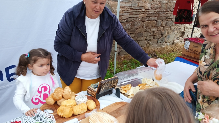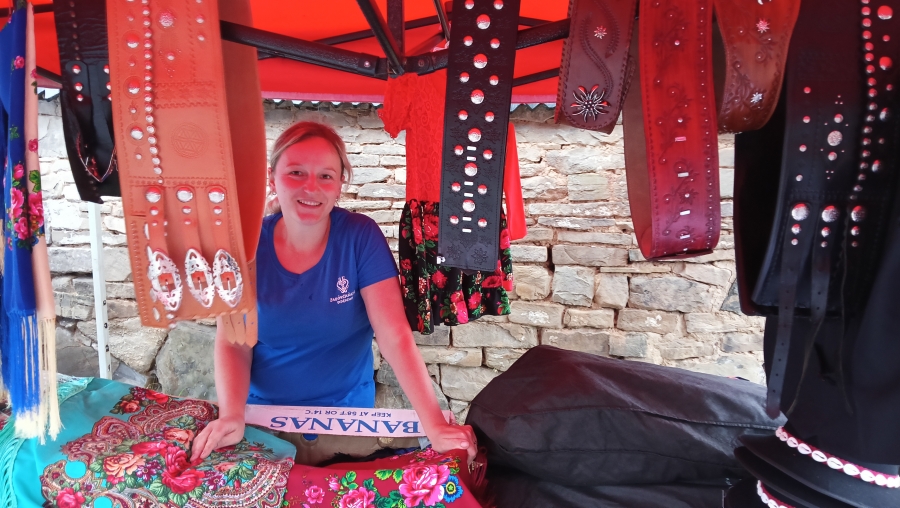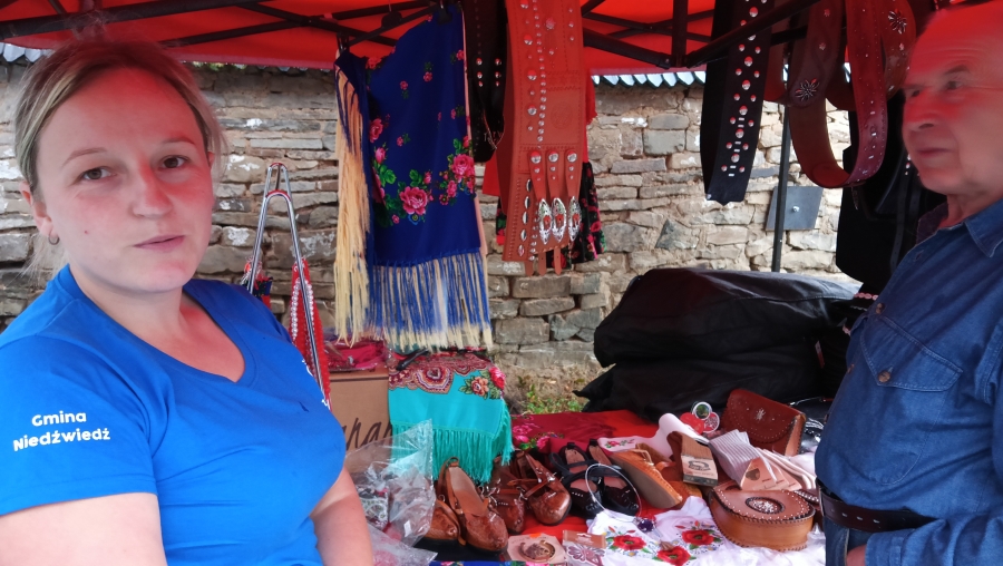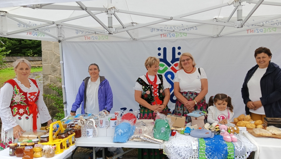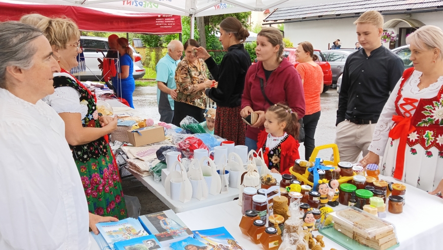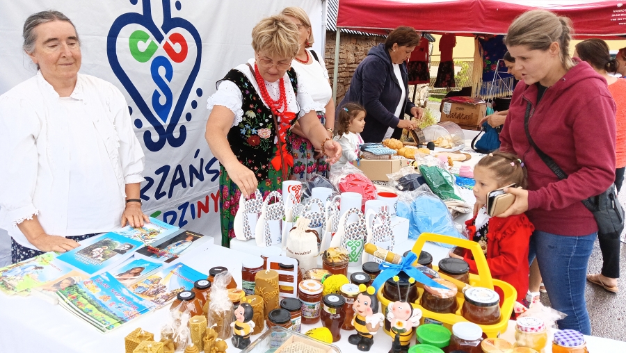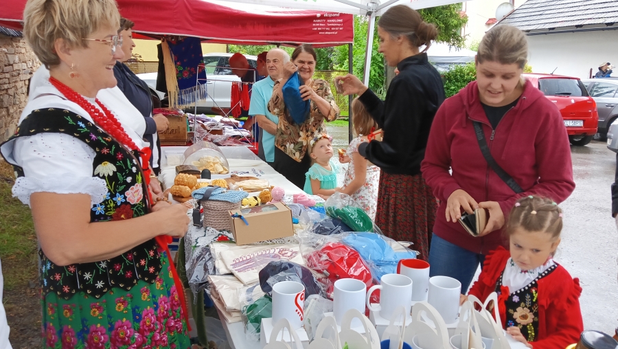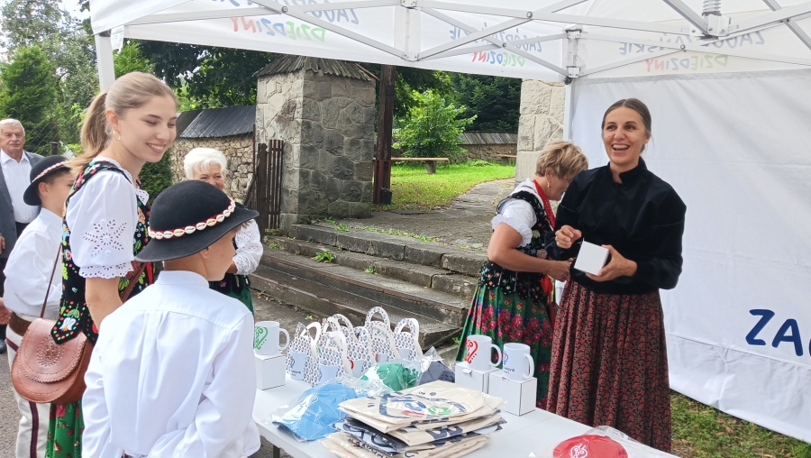 Rozstawione na placu przed kościołem namioty dały schronienie przed deszczem tym, którzy chcieli nabyć produkty lokalne. A na stoiska przyciągały uśmiechnięte twarze Zagórzanek i dzieła ich rąk tak dumnie się prezentujące. Niesłabnącym powodzeniem cieszą się Gorczańskie sery od Moniki Kubik (Zagórzańska Tradycja – Sery Podpuszczkowe), o jakości których już nikogo nie trzeba przekonywać. Tę słoną przekąskę swoim słodkim smakiem przełamują miody z Pasieki u Piotra Woźniaka z Koniny, również posiadające certyfikat marki lokalnej i swoich amatorów. Także i inne produkty pszczele pochodzące z tej pasieki cieszyły się wzięciem. Wśród kupujących nie zabrakło amatorów pióra zagórzańskiej pisarki i poetki, Władysławy Anny Jamróz. Zarówno proponowane przez nią treści jak i graficzna strona pokaźnej biblioteczki książek jej autorstwa mają swoich młodych i starszych fanów. A już bonus w postaci osobistej dedykacji Pani Władzi powoduje błysk szczęścia w oczach kupujących. Feerią barw, jak zwykle, przyciągało też stoisko Hafthan Konina, na którym można nabyć elementy stroju regionalnego, aby ubrać się paradnie na takie wydarzenia. Hitem i nowością w naszej ofercie okazały się zdobione elementami znaku marki i innymi charakterystycznymi dla Regionu Zagórzańskiego wzorami kubki, czapki i torby… Te inspirowane gorsetem to prawdziwy sztos! Zeszły w mig! Ale nie martwicie się, wszak obiecujący ich twórca, Jasiek notabene (jak nasz przewodnik po wyprawach questowych – bardzo podobny do tego z obrazka… a może to on sam jest???), już uruchomił produkcję i na kolejnych wydarzeniach na pewno będziecie się mogli w nie zaopatrzyć! W internetach szukajcie go pod nazwą PanDa – haftowanie, znakowanie i więcej, a jego produktów na stoiskach Zagórzańskich Dziedzin!
