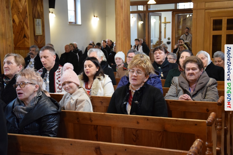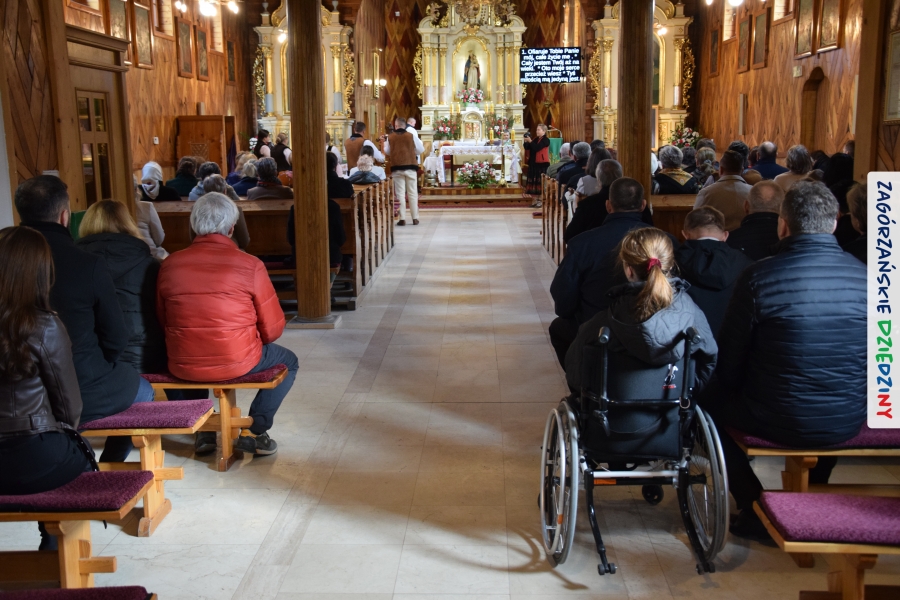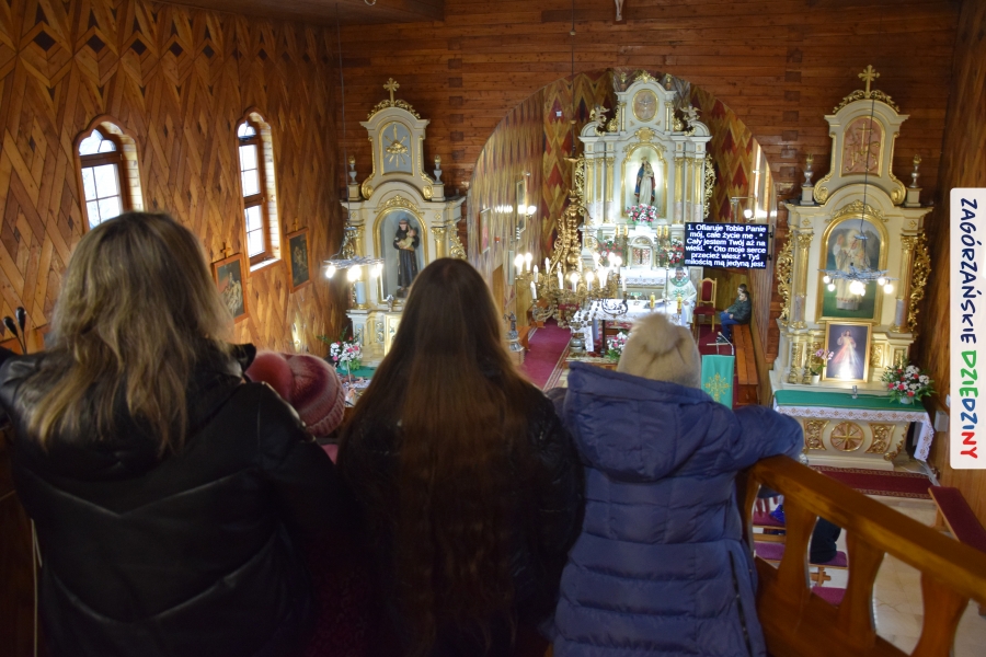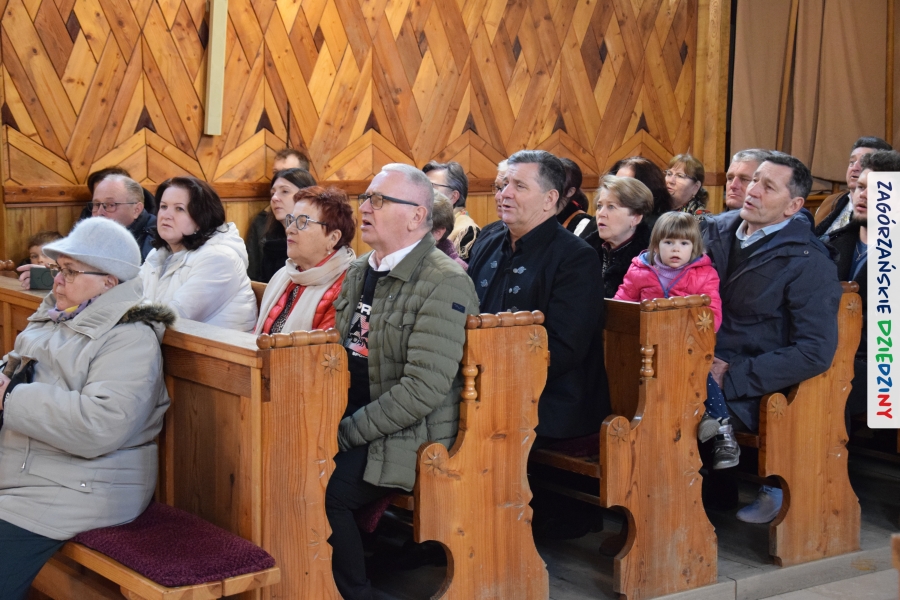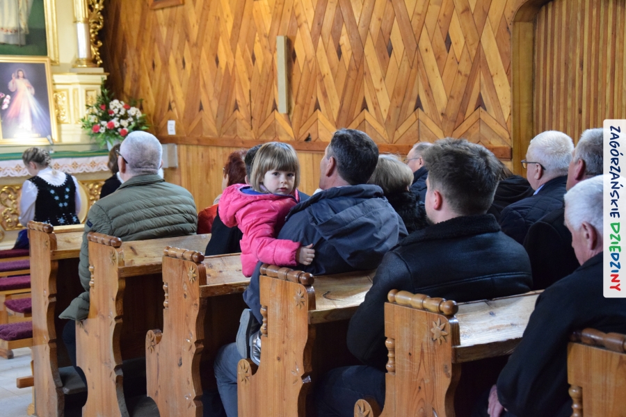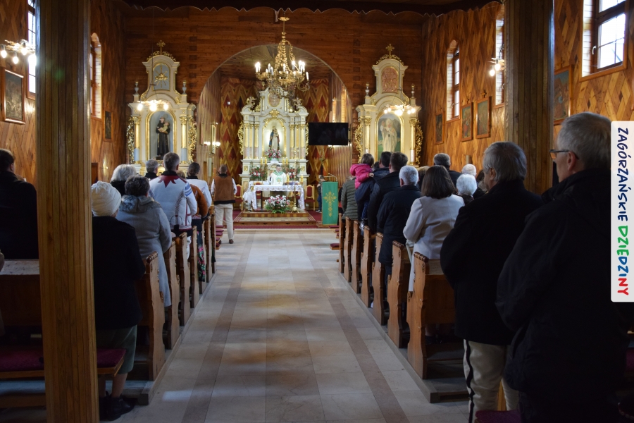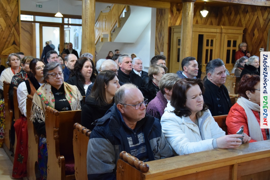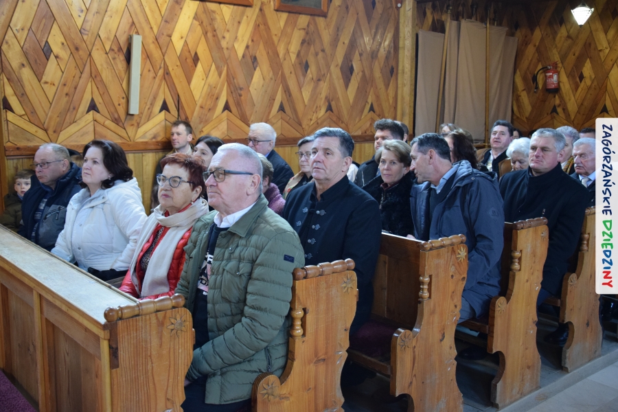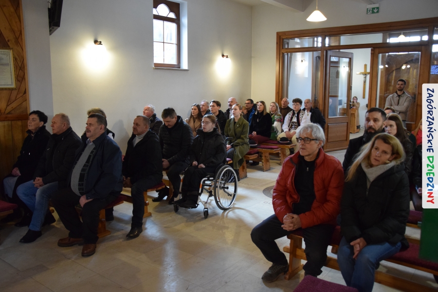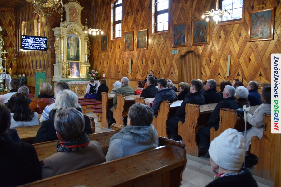 Tym razem, w ostatnią niedzielę lutego, 23., tej zimy już nie czuł nikt, kto pojawił się na dziedzińcu kościoła. Może trochę „zawczasu”, ale w mocnych promieniach słońca czuć było wiosnę, która wszystkim zaczęła już działać na wyobraźnię. Zebrani przed wejściem do świątyni, przygotowując do okolicznościowego kiermaszu biały, dziedzinny namiot, dzielili się swoimi spostrzeżeniami i planami; a to sołtys koniecznie chciał zaplanować nam kolejną wyprawę w znane tylko sobie leśne odstępy, co dalszą rozmowę przeniosło na czarny szlak do Kudłońskiego Bacy…; a to miejscowy proboszcz, O. Maciej Kustroń, pochwalił się wycieczkami na trzy okoliczne góry i zgrabnie to doświadczenie wplótł w niedzielne kazanie… Pojawili się również goście z okolic Limanowej i Dębicy, którzy najpierw skorzystali z uroków gorczańskich wzniesień, a potem odłożyli turystyczne kijki i lornetkę aby wspólnie z nami cieszyć się muzyczną oprawą Eucharystii przygotowanej przez rodzinną kapelę Kościelnioków z Olszówki.
