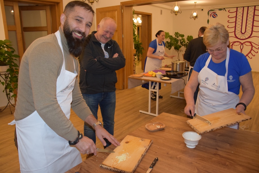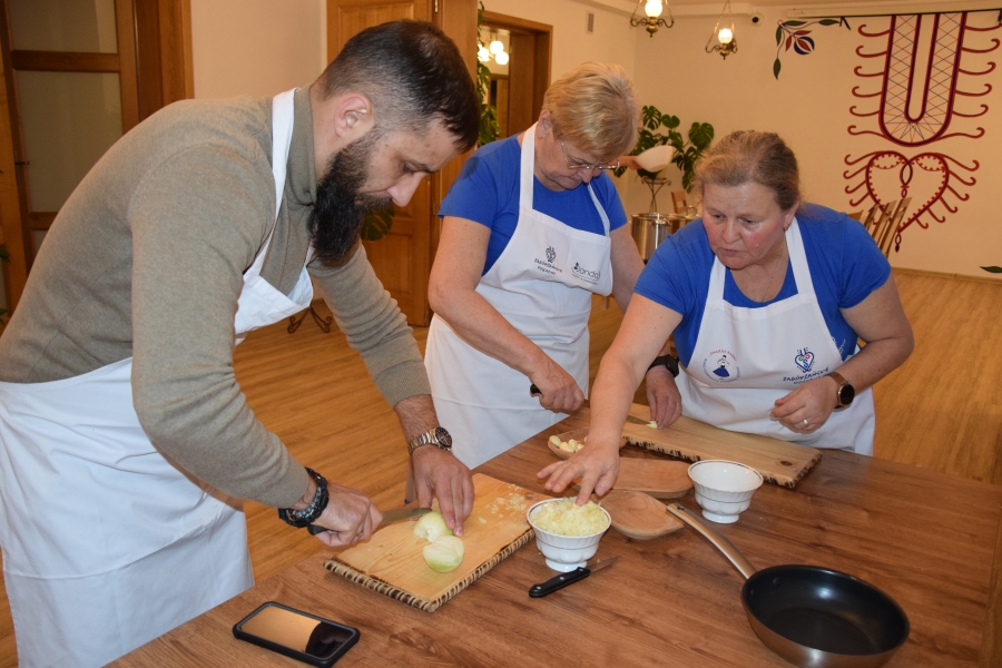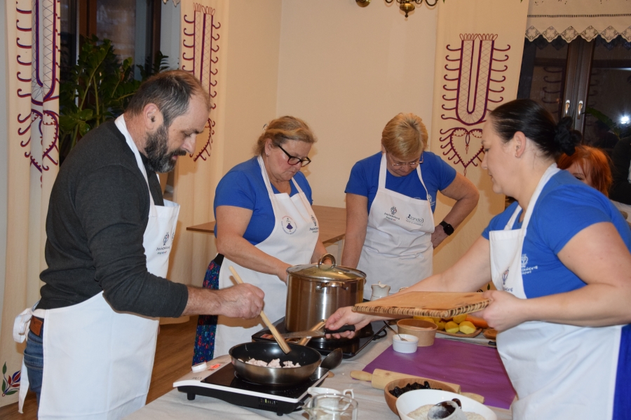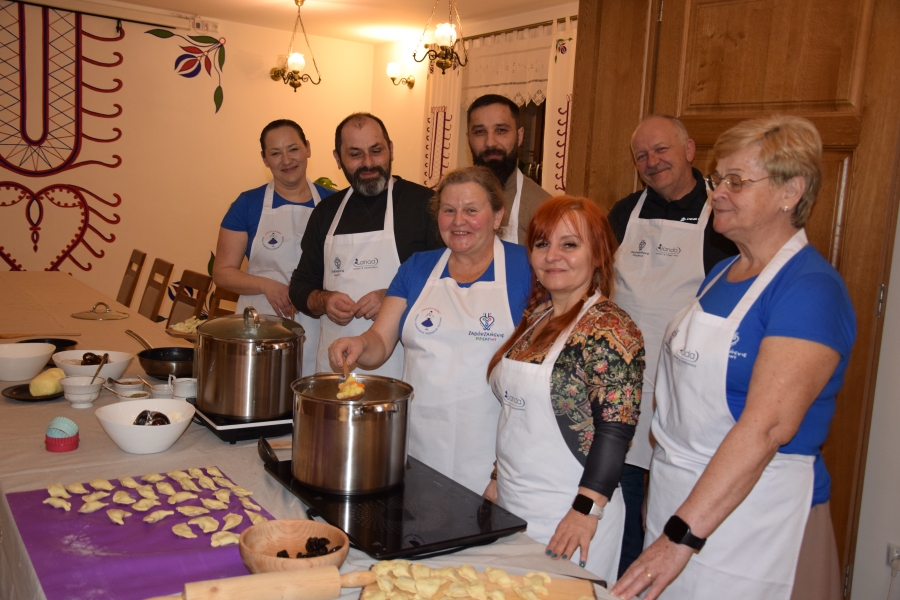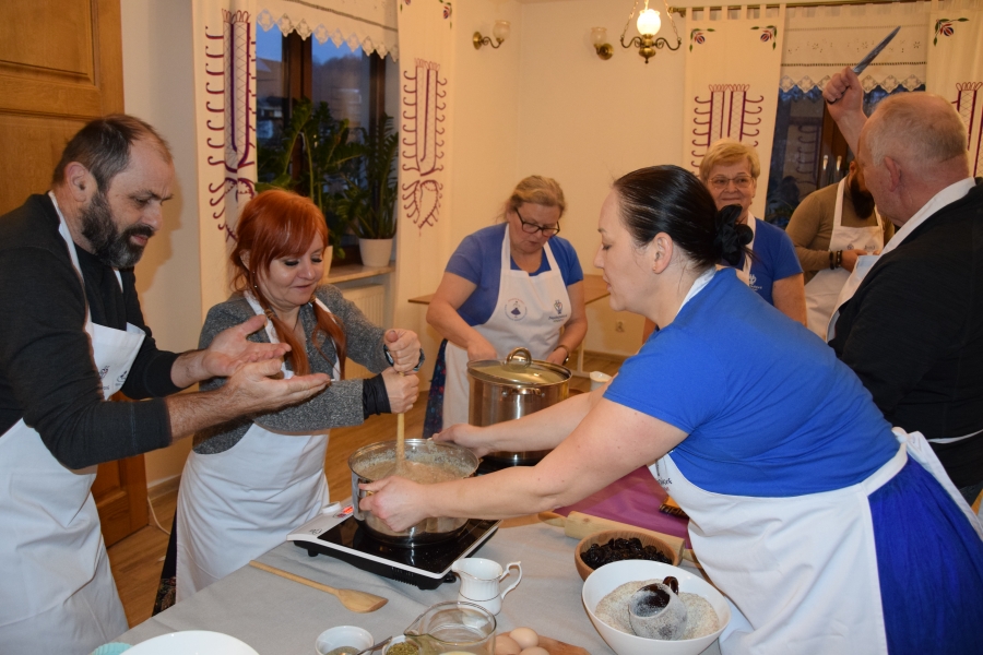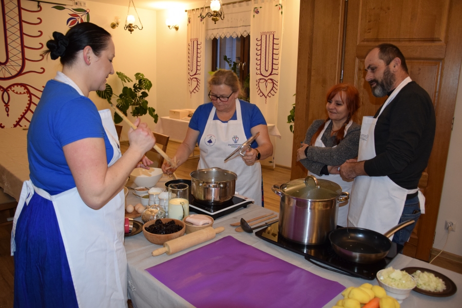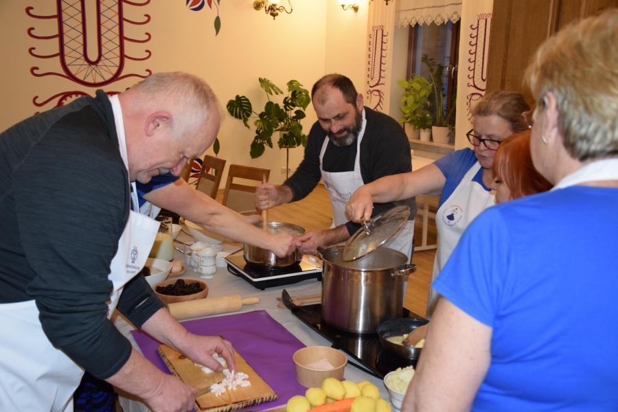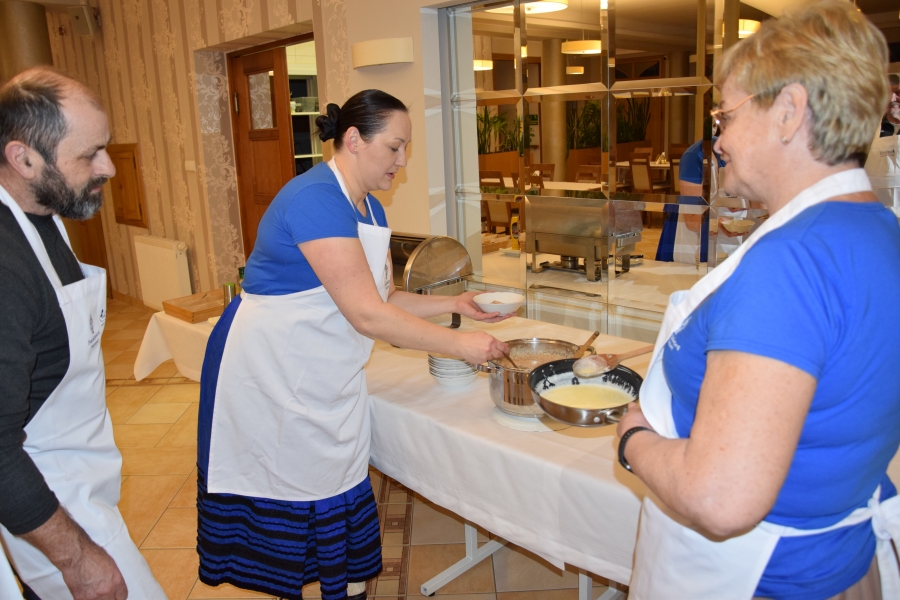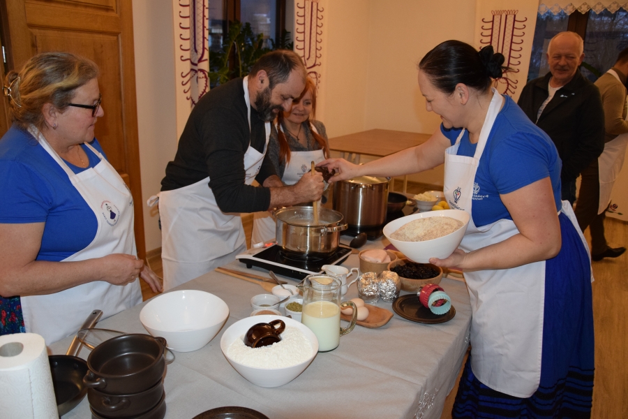 Goście mszańskich włodarzy, w ramach wizyty, odwiedzili kompleks Kasina Ski&Bike Park oraz zlokalizowane w budynku jej górnej stacji muzeum Moped Retro. Przy okazji popatrzyli z tarasu widokowego ośrodka na beskidzkie wyspy i odetchnęli zagórzańskim powietrzem. Wieczorem mieli możliwość doświadczyć namiastki kultury ludowej regionu podczas warsztatów „Zagórzańskie smaki”, na które gaździny z KGW Łętowe otrzymały Znak Promocyjny Zagórzańskie Dziedziny. Zarówno Kaszubi, jak i mszańscy wójtowie, w praktyce zgłębili tajniki przygotowania czterech zagórzańskich potraw wpisanych na ministerialną Listę Produktów Tradycyjnych. W dobrze nam już znanych wnętrzach Janda Resort (użytkowników Znaku Promocyjnego Zagórzańskie Dziedziny) najpierw, pod okiem Danuty Węglarz, Edyty Tromiczak i Danuty Babuśki, ugotowali sapkę, zagórzańską zupę z korpieli na mleku i ulepili pierogi z suszonymi śliwkami, a potem do woli rozkoszowali się tymi smakami. Łętowianki przywiozły też kołacze: jeden - ten z listy - razowy, na słono, a drugi – już na deser – słodki. Warsztaty stały się też przyczynkiem do rozmów o kulturze obu regionów oraz o możliwościach współpracy w tym zakresie.