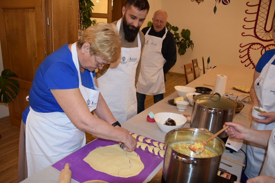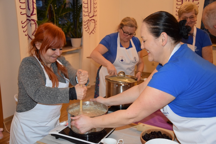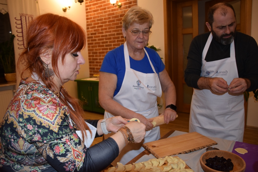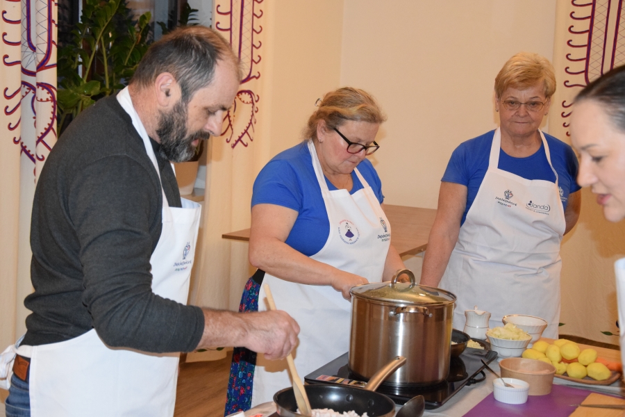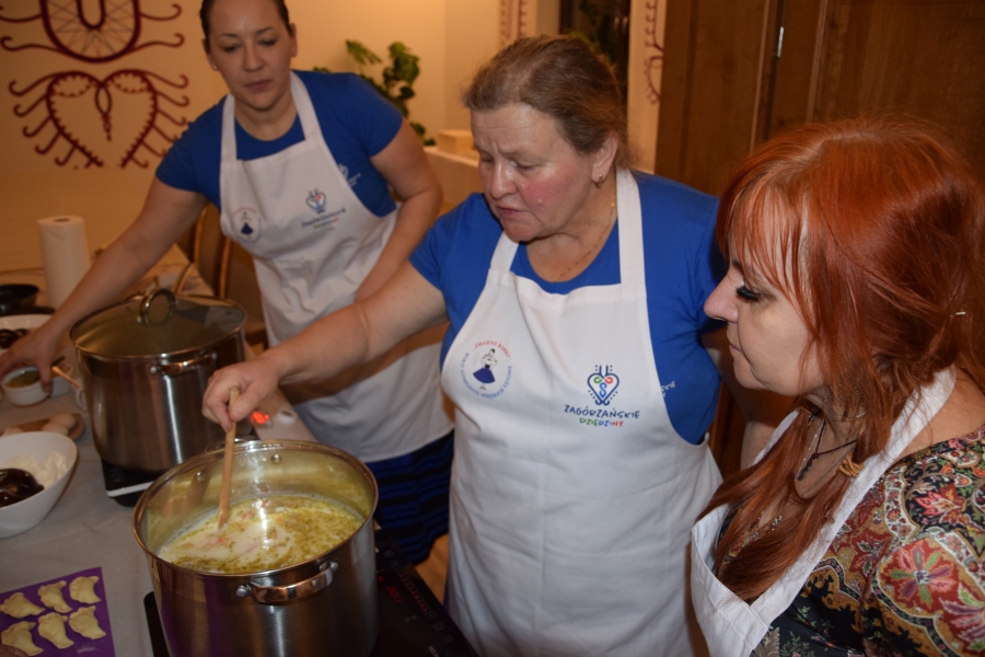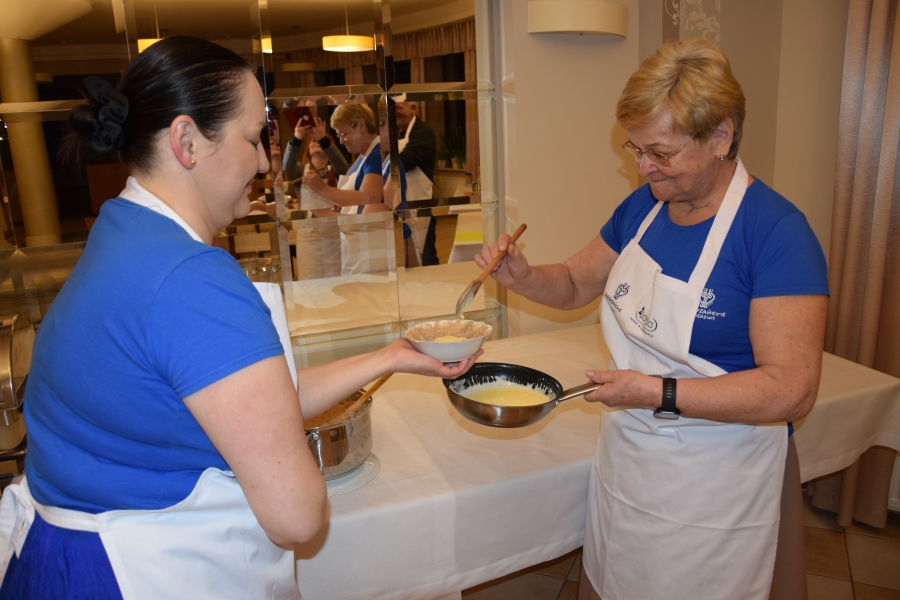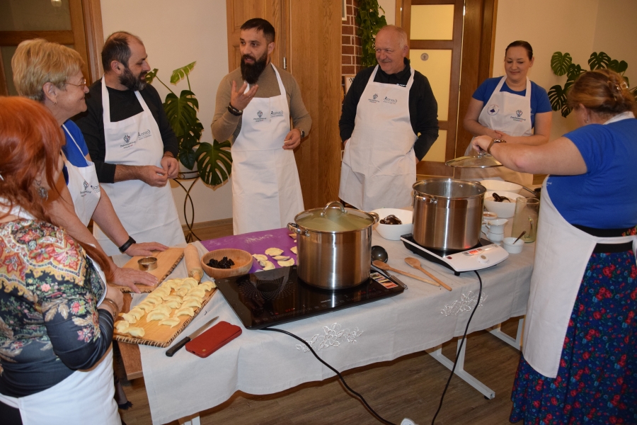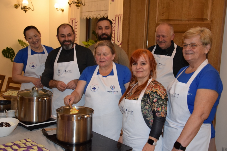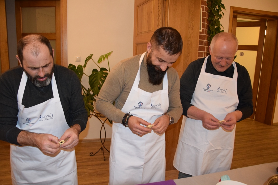 Goście mszańskich włodarzy, w ramach wizyty, odwiedzili kompleks Kasina Ski&Bike Park oraz zlokalizowane w budynku jej górnej stacji muzeum Moped Retro. Przy okazji popatrzyli z tarasu widokowego ośrodka na beskidzkie wyspy i odetchnęli zagórzańskim powietrzem. Wieczorem mieli możliwość doświadczyć namiastki kultury ludowej regionu podczas warsztatów „Zagórzańskie smaki”, na które gaździny z KGW Łętowe otrzymały Znak Promocyjny Zagórzańskie Dziedziny. Zarówno Kaszubi, jak i mszańscy wójtowie, w praktyce zgłębili tajniki przygotowania czterech zagórzańskich potraw wpisanych na ministerialną Listę Produktów Tradycyjnych. W dobrze nam już znanych wnętrzach Janda Resort (użytkowników Znaku Promocyjnego Zagórzańskie Dziedziny) najpierw, pod okiem Danuty Węglarz, Edyty Tromiczak i Danuty Babuśki, ugotowali sapkę, zagórzańską zupę z korpieli na mleku i ulepili pierogi z suszonymi śliwkami, a potem do woli rozkoszowali się tymi smakami. Łętowianki przywiozły też kołacze: jeden - ten z listy - razowy, na słono, a drugi – już na deser – słodki. Warsztaty stały się też przyczynkiem do rozmów o kulturze obu regionów oraz o możliwościach współpracy w tym zakresie.