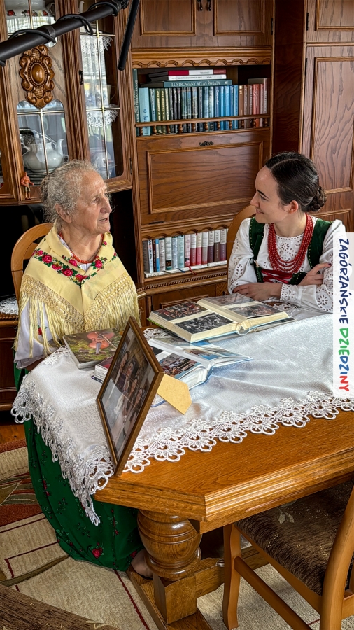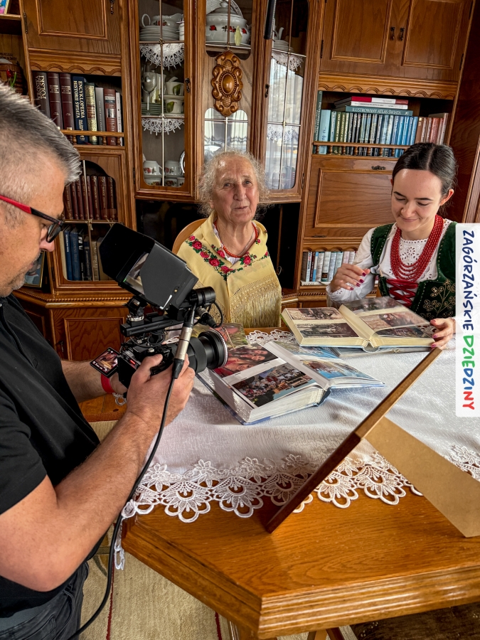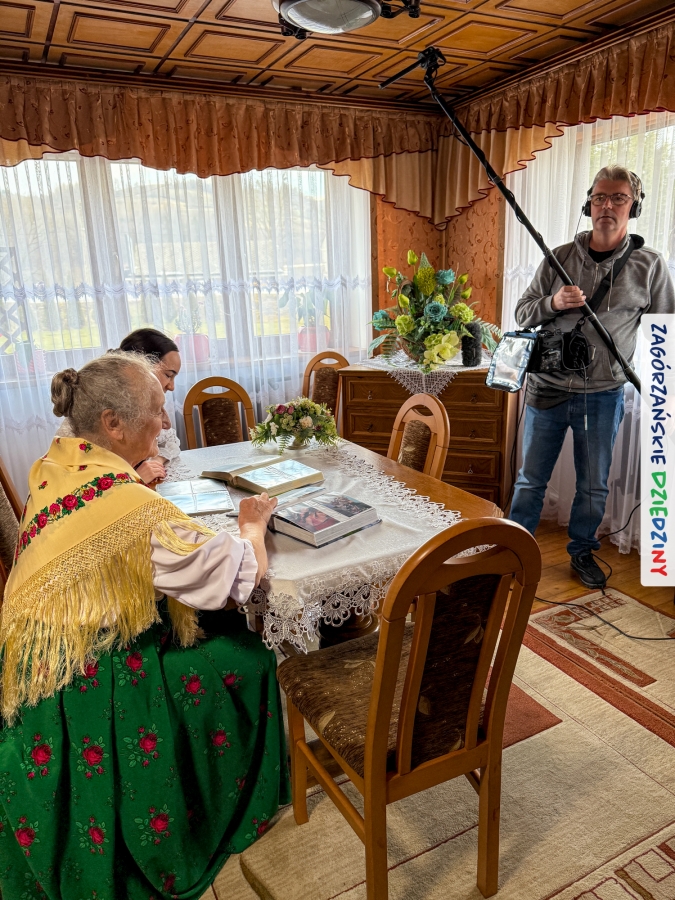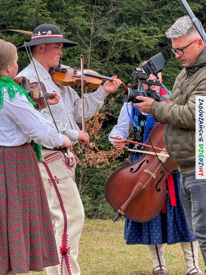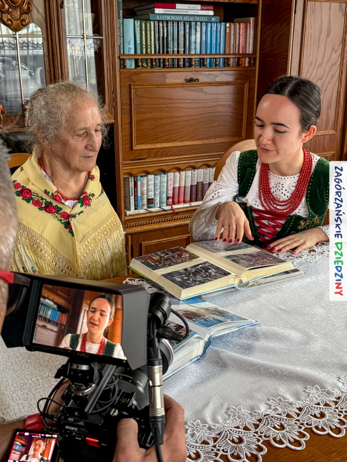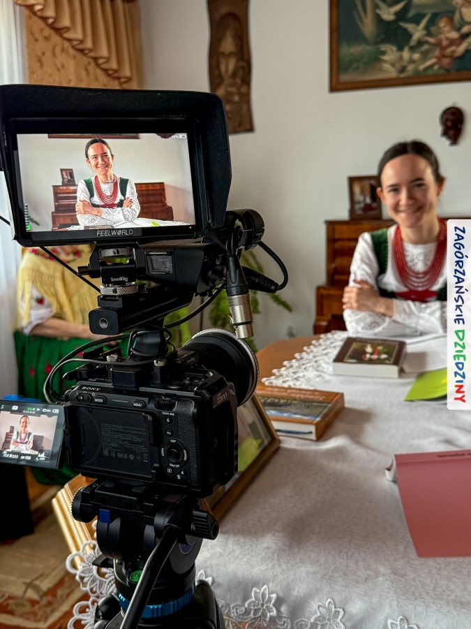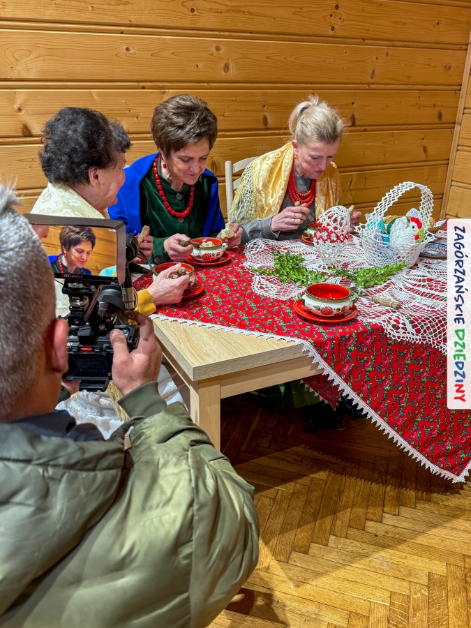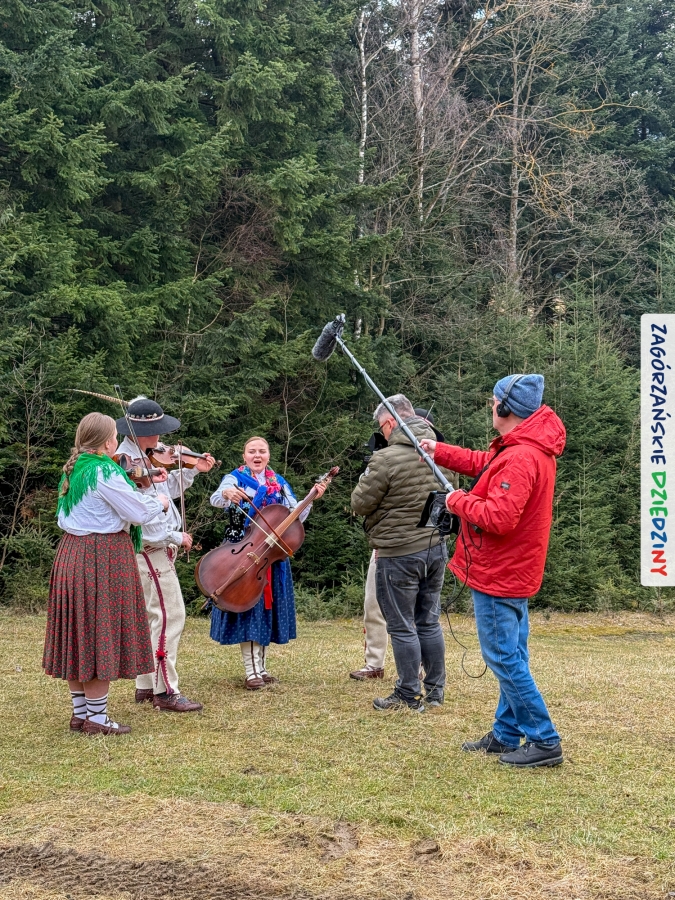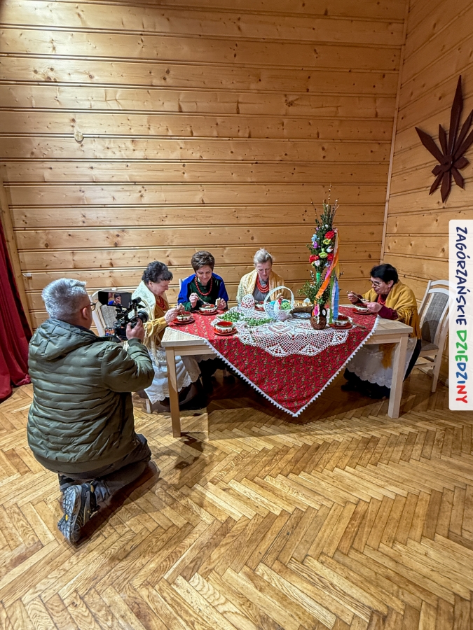 Zgodnie z ideą programu, wywiady nagraliśmy w Izbie podhalańskiej Muzeum Etnograficznego w Krakowie. Potem, już w terenie, z kamerą zawitaliśmy do Moniki Kościelniak – naszej bacy z certyfikatem czeladniczym. Przy okazji pobytu w Olszówce nie mogliśmy sobie odmówić przyjemności spotkania z muzykującym rodzeństwem – kapelą Kościelnioki, zrzeszonym w Stowarzyszeniu Miłośników Kultury Góralskiej Pod Cyrlom. Dorota, Marianna, Adrian i Grzegorz, to dzieci Moniki; również ich zobaczymy w pracy przy owczarni. W Olszówce spotkaliśmy się też z gaździnami z tamtejszego KGW, aby posłuchać opowieści o sodrze, czyli wielkanocnej zupie. Posileni tym niezwykle smacznym, zagórzańskim daniem, wybraliśmy się w podróż do Kasinki Małej. Tam, na przysiółku Zagródce, żywa jest inna wielkanocna tradycja, w odmianie nieco zapożyczonej z sąsiedniej Węglówki, a w zasadzie nawet z Wiśniowej, ale pomost stanowi ta pierwsza. Wyobraźcie sobie, że co roku, w Poniedziałek Wielkanocny, od bardzo wczesnych godzin porannych na Zagródcu słychać charakterystyczne „jukanie”. To znak, że „po śmiguszcie” wyruszyli przebrani za kobiety lub przedstawicieli różnych profesji, chłopcy i dorośli mężczyźni, upatrując swojej „ofiary”. Cieszy ich polewanie woda, cieszą ichpsoty, a młodzieńcy nie przepuszczą okazji, żeby w ten sposób przypodobać się dziewczynom. Te nie są wolne od ich „zalotów” również w drodze do kaplicy; wręcz przeciwnie – „dziadówki”, czyli nasi „śmiguśnicy” wiedzą, że w tym momencie mają największe pole do popisu… Po spotkaniu w wiosennymi kolędnikami spotkaliśmy się z tradycją bożonarodzeniową, która w rodzinie Szczypków, również z Kasinki Małej, trwa już przez cztery pokolenia. Ponad 130 – letnia szopkę lalkową przedstawił Dawid, tegoroczny maturzysta, niezwykle dumny z tego, że kultywuje rodzinne i rodzime tradycje! W tej zagórzańskiej miejscowości spotkaliśmy się również z Klaudią Gawronek, miłośniczką gwary zagórzańskiej, która, nie tylko zaprosiła wszystkich widzów do Zagórzańskich Dziedzin, ale pogwarzyła jeszcze wesoło z Anną Cież. Pochwaliła się też swoimi literackimi osiągnięciami.