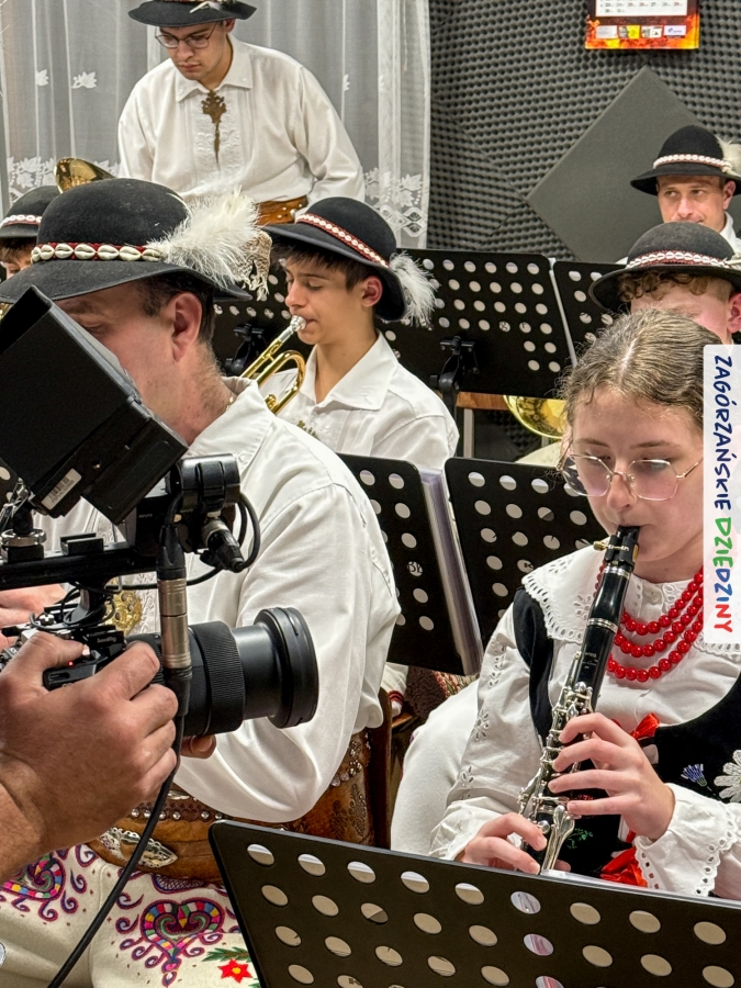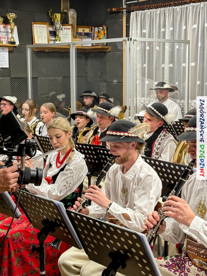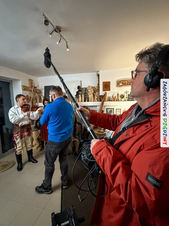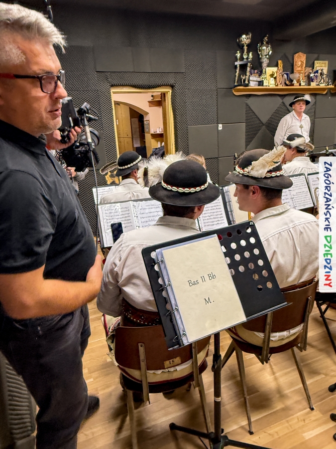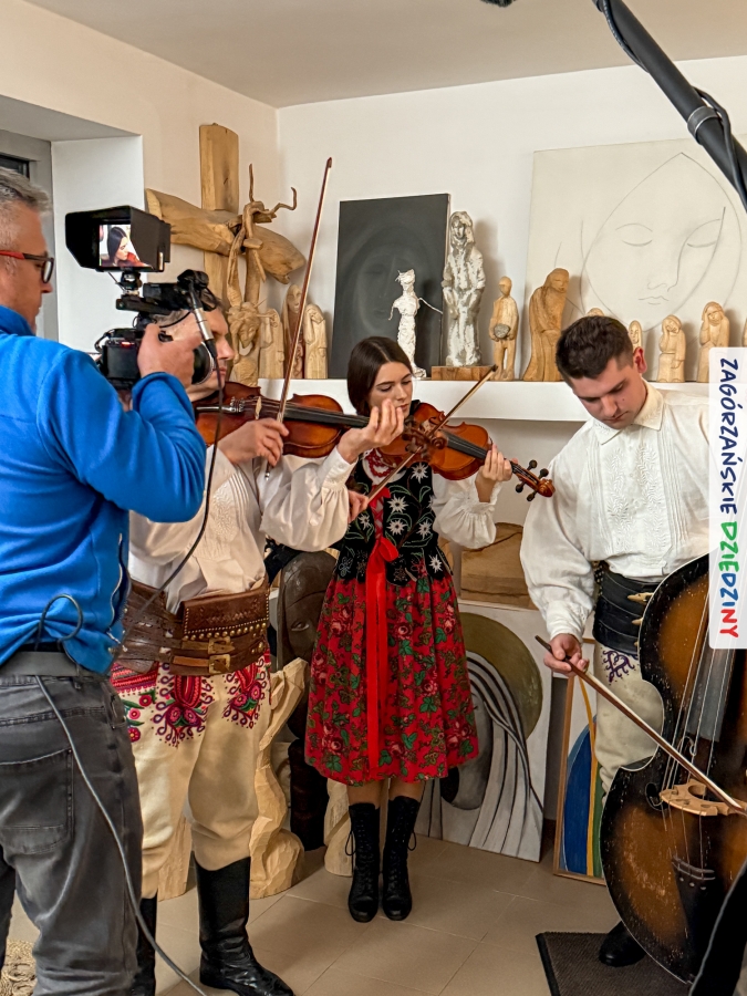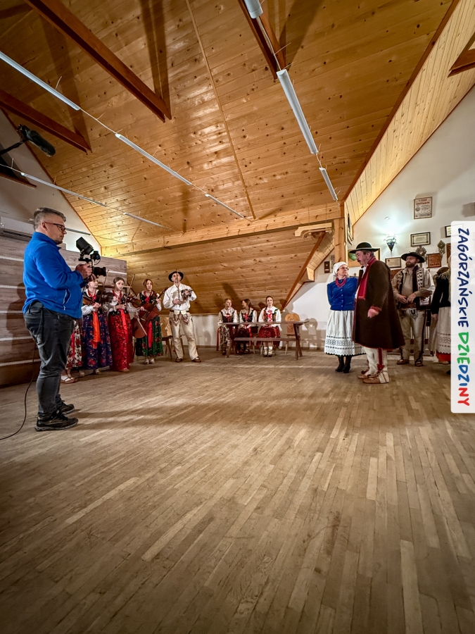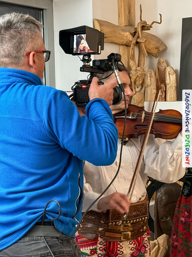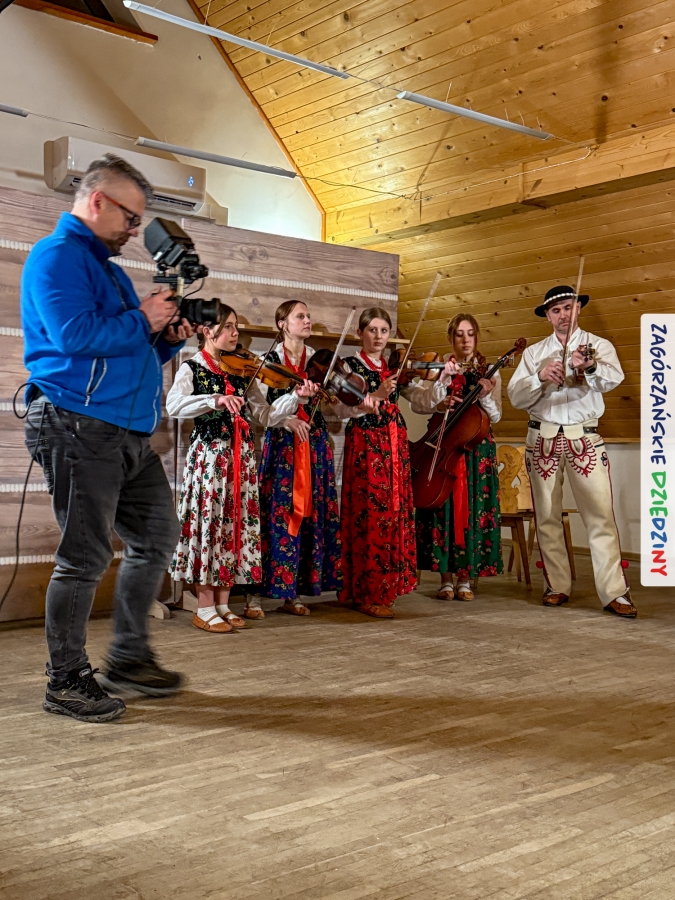Przystanek w drodze, tym razem bez kamer, to kasinczańska Szapo ba Pizzeria. Tam gospodarze, Patrycja i Paweł Kołodziejowie, ugościli nas po królewsku, a dzielna ekipa zregenerowała nadwątlone intensywną pracą siły. Napięty plan dnia nie pozwalał na dłuższa biesiadę; w Kasinie Wielkiej czekał już bowiem na nas w swojej pracowni Rafał Nowak. Ten najbardziej znany w okolicy kuśnierz pokazał jak szyje białe, zagórzańskie serdaki i opowiedział o zdobieniu portek. Tak się nam wszystko dobrze złożyło, że od niego to tylko rzut beretem do pracowni innego, zagórzańskiego artysty, niezwykle utalentowanego w wielu dziedzinach, Adama Rusnarczyka. Ten przywitał nas muzyką jego rodzinnej kapeli (grają z nim dzieci: Justyna i Mateusz), pokazał pracownię i na naszych oczach gładził pokaźną rzeźbę. Trudno było wyjść z tej świątyni sztuki, jednak czekali już na nas Kasinianie – Zagórzanie, których zastaliśmy na piątkowej próbie. Tupnęło, furgnęło, nogi same niosły ich po parkiecie, a jak zaśpiewali „ w kosińskiej krainie” to zapewniali, że „się na Ćwilinie fijołek łozwinie”! Nie sprawdzaliśmy, czy tak się stało, bo zapadł już zmierzch, a na telewizyjną ekipę czekała kolejna muzyczna uczta – tym razem zafundowała ją Orkiestra Dęta Echo Gór z Kasinki Małej, łącząca tradycyjne stroje i melodie zagórzańskie, z nowoczesnymi aranżacjami i poważnymi utworami. Cieszył oko widok muzykującej młodzieży, a serce aż podrygiwało w takt zagórzańskiego konika…