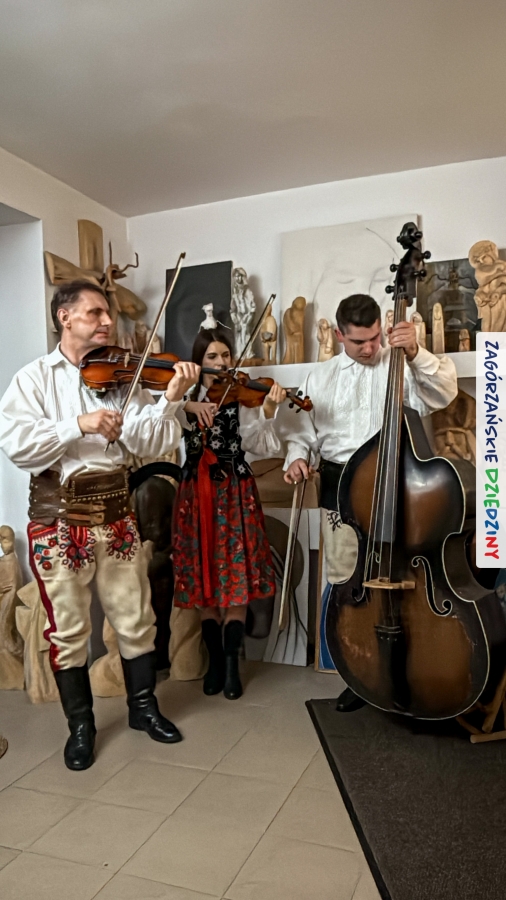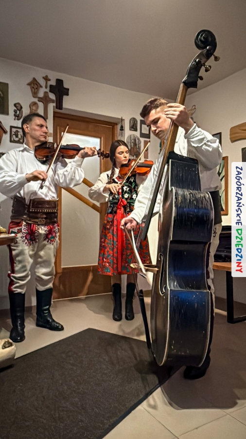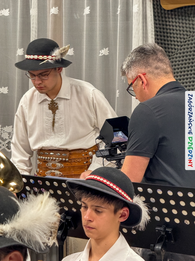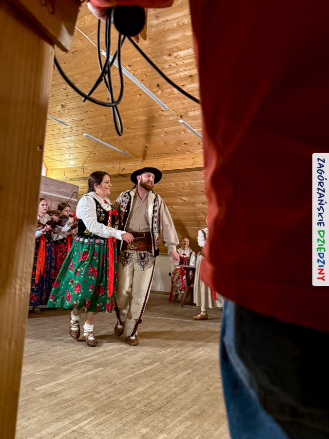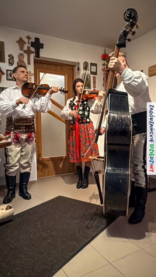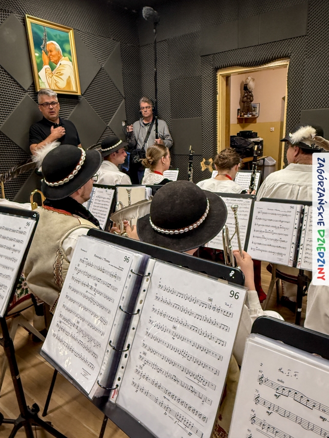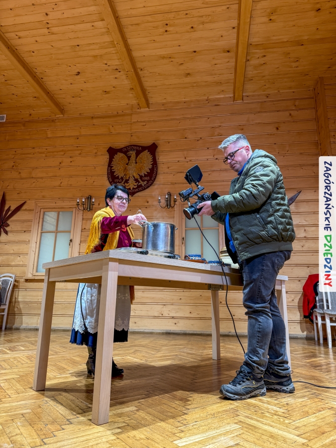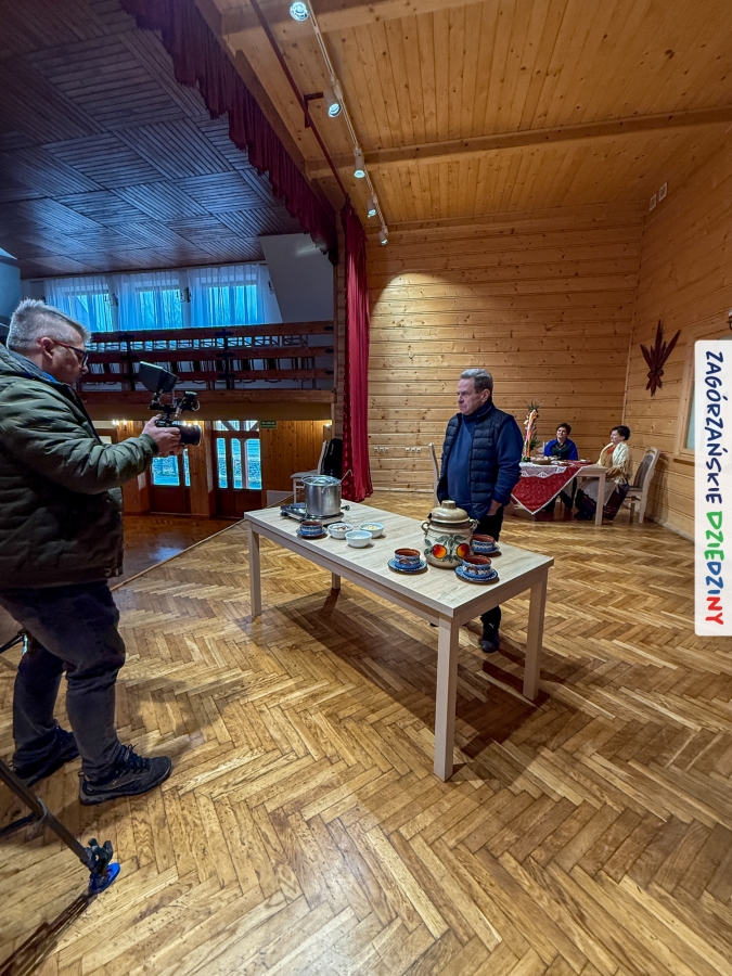 Przystanek w drodze, tym razem bez kamer, to kasinczańska Szapo ba Pizzeria. Tam gospodarze, Patrycja i Paweł Kołodziejowie, ugościli nas po królewsku, a dzielna ekipa zregenerowała nadwątlone intensywną pracą siły. Napięty plan dnia nie pozwalał na dłuższa biesiadę; w Kasinie Wielkiej czekał już bowiem na nas w swojej pracowni Rafał Nowak. Ten najbardziej znany w okolicy kuśnierz pokazał jak szyje białe, zagórzańskie serdaki i opowiedział o zdobieniu portek. Tak się nam wszystko dobrze złożyło, że od niego to tylko rzut beretem do pracowni innego, zagórzańskiego artysty, niezwykle utalentowanego w wielu dziedzinach, Adama Rusnarczyka. Ten przywitał nas muzyką jego rodzinnej kapeli (grają z nim dzieci: Justyna i Mateusz), pokazał pracownię i na naszych oczach gładził pokaźną rzeźbę. Trudno było wyjść z tej świątyni sztuki, jednak czekali już na nas Kasinianie – Zagórzanie, których zastaliśmy na piątkowej próbie. Tupnęło, furgnęło, nogi same niosły ich po parkiecie, a jak zaśpiewali „ w kosińskiej krainie” to zapewniali, że „się na Ćwilinie fijołek łozwinie”! Nie sprawdzaliśmy, czy tak się stało, bo zapadł już zmierzch, a na telewizyjną ekipę czekała kolejna muzyczna uczta – tym razem zafundowała ją Orkiestra Dęta Echo Gór z Kasinki Małej, łącząca tradycyjne stroje i melodie zagórzańskie, z nowoczesnymi aranżacjami i poważnymi utworami. Cieszył oko widok muzykującej młodzieży, a serce aż podrygiwało w takt zagórzańskiego konika…