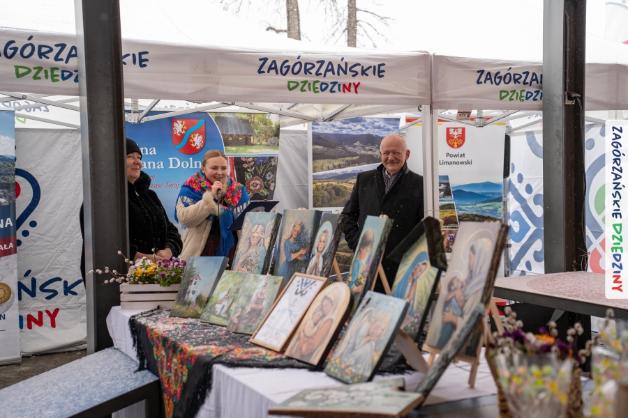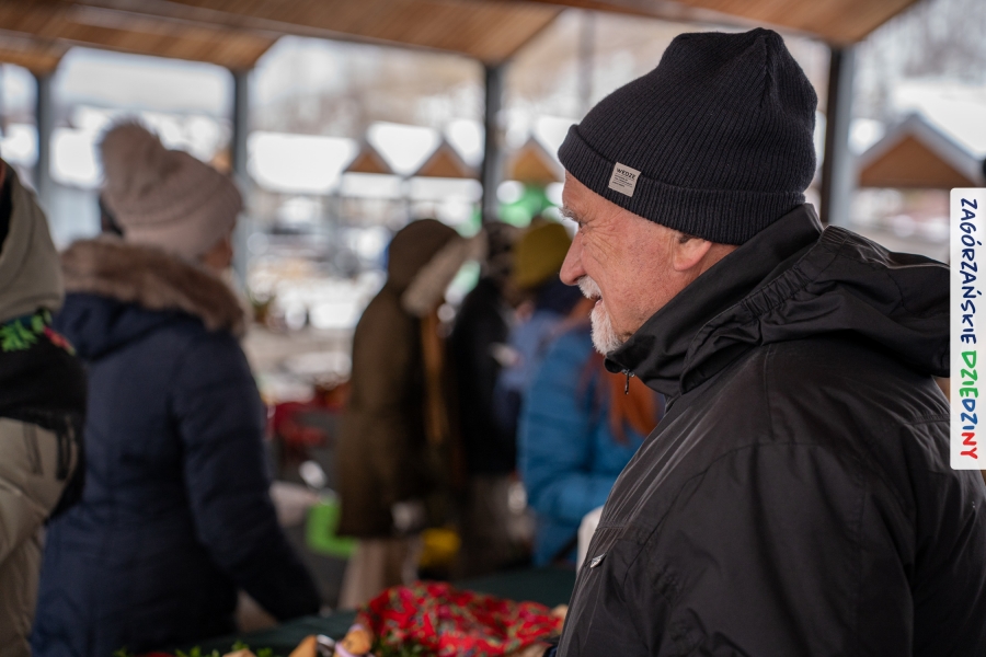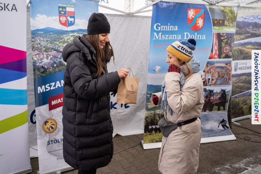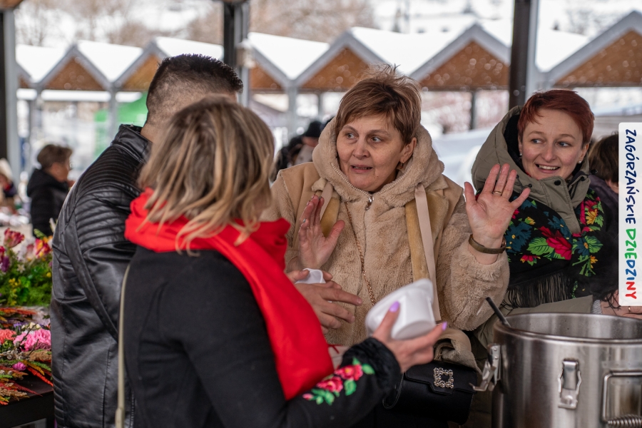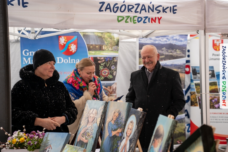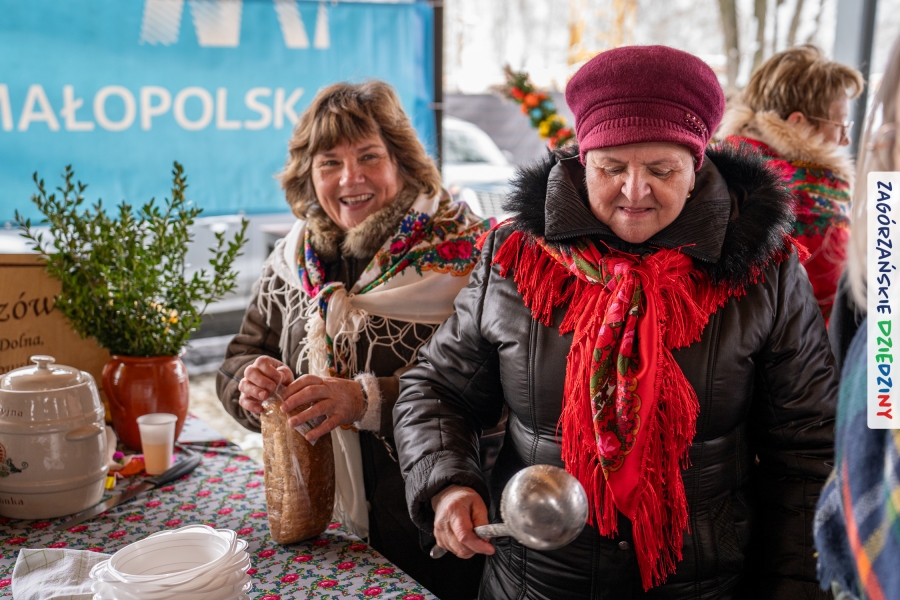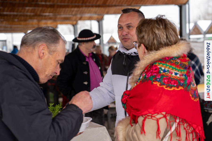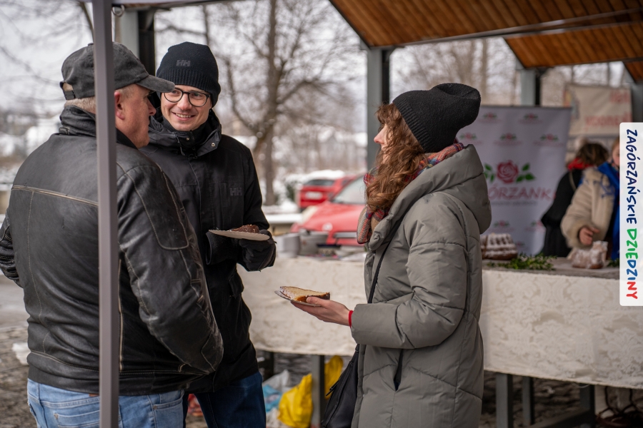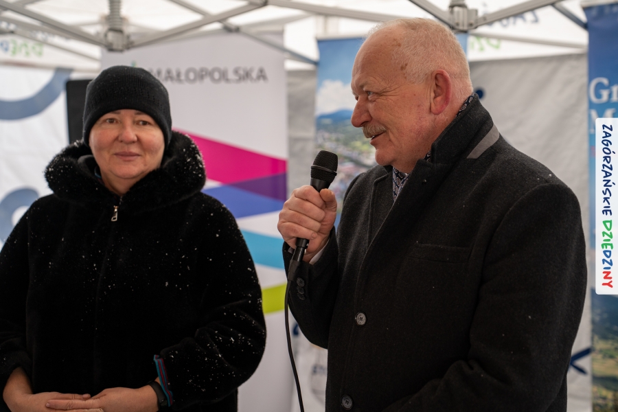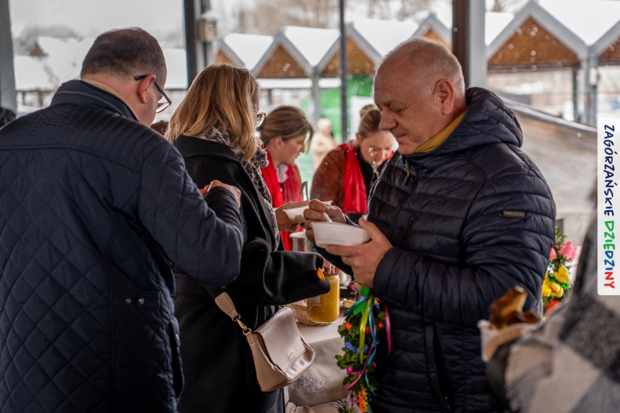 Nie ma jednak co narzekać, tylko działać, bo na tym opiera się siła wspólnej organizacji – są ludzie, jest moc, a przede wszystkim dobra energia! Wtedy widzimy same pozytywy, bo, przyznajcie sami, było zjawiskowo! Wystawcy zapełnili stoły swoimi wyrobami, pojawiły się nowe twarze i nowe produkty, co więcej, nawet grono posiadaczy znaku marki Zagórzańskie Dziedziny nam się poszerzyło o kolejne lokalne propozycje. W tej grppie mamy także współorganizatorów wydarzenia odpowiedzialnych za kulinarną stronę jarmarku, czyli Stowarzyszenie Miłośników Kultury Góralskiej „Pod Cyrlom” z Olszówki. To właśnie Dorota Kościelniak, jego prezeska, poprosiła włodarzy naszych zagórzańskich gmin o oficjalne otwarcie IV Zagórzańskiego Jarmarku Wielkanocnego. Zarówno Burmistrz Miasta Mszana Dolna, Agnieszka Orzeł, jak i Wacław Zoń, Zastępca Wójta Gminy Mszana Dolna, życzyli wszystkim udanego jarmarku, pomimo zimowej aury.