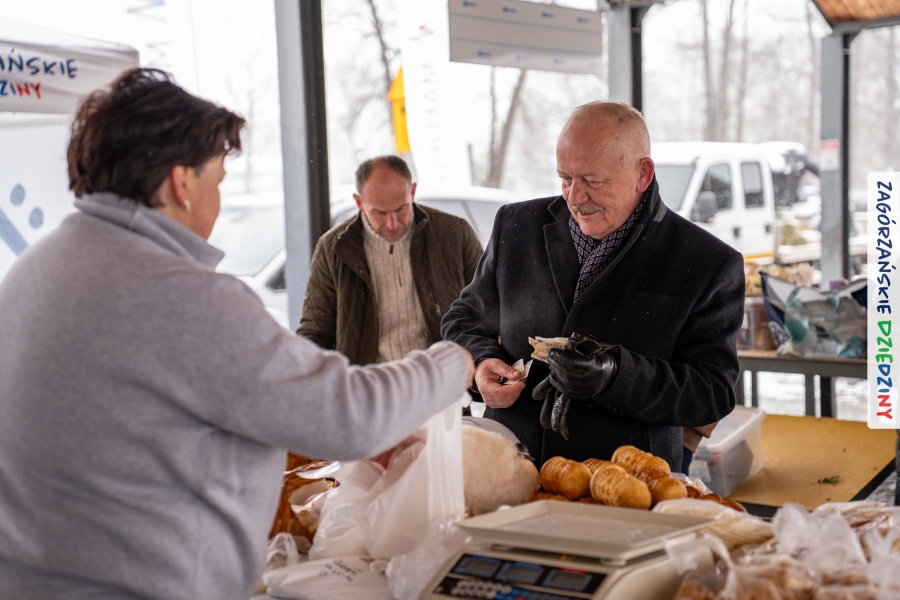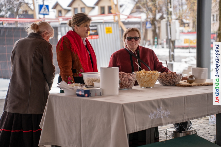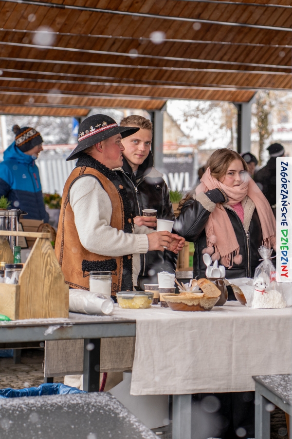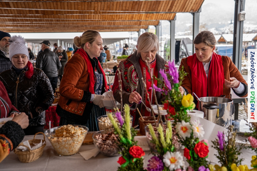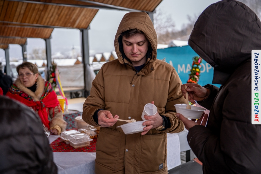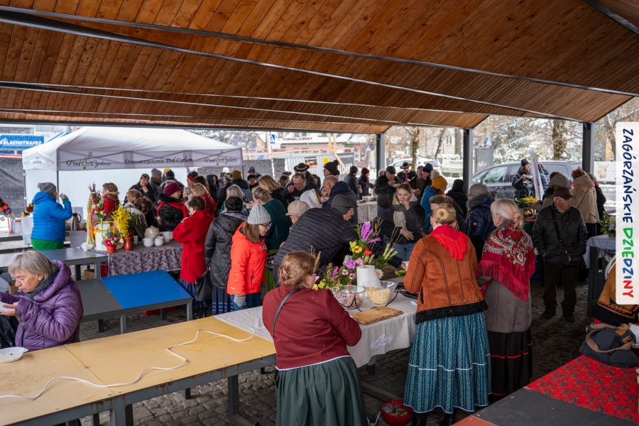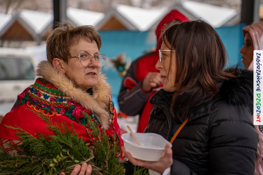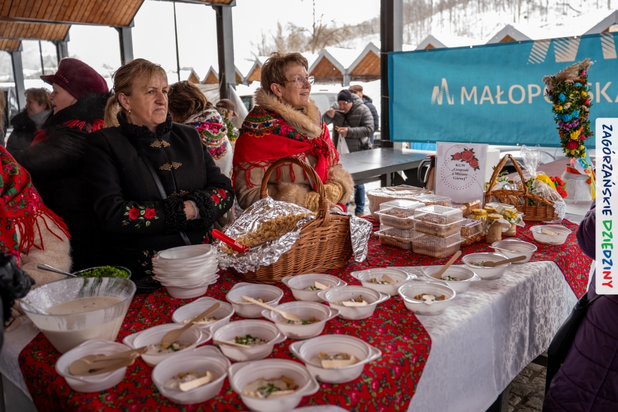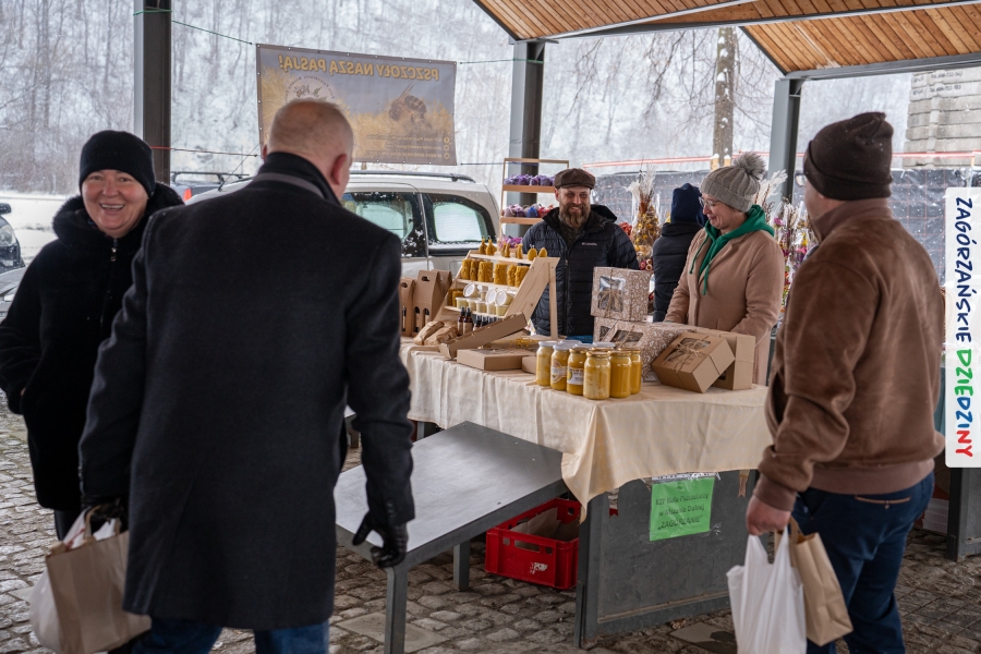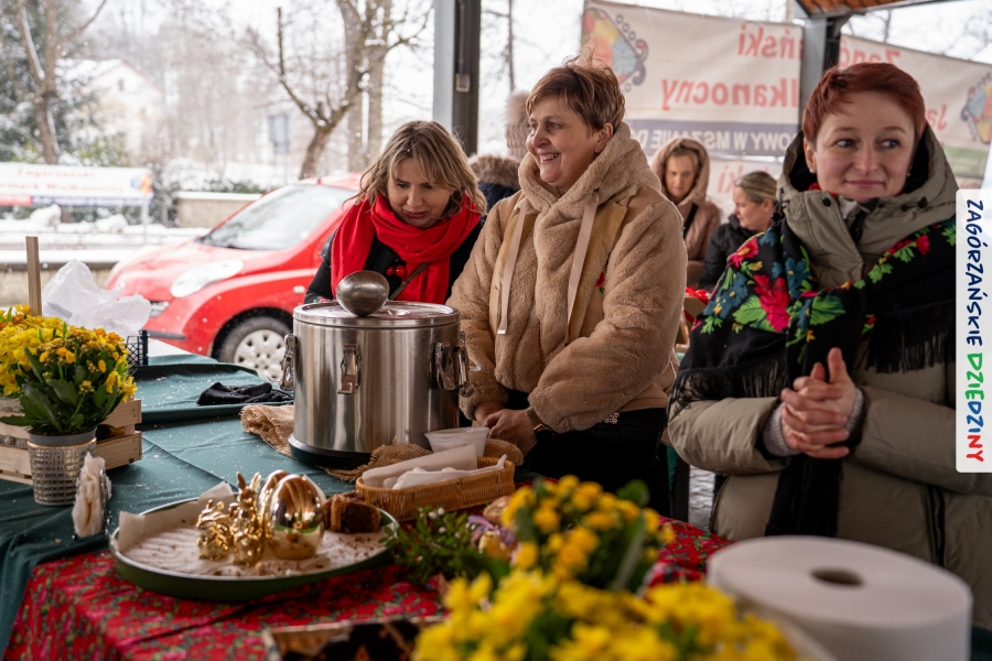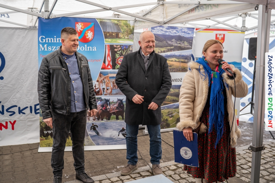 Nie ma jednak co narzekać, tylko działać, bo na tym opiera się siła wspólnej organizacji – są ludzie, jest moc, a przede wszystkim dobra energia! Wtedy widzimy same pozytywy, bo, przyznajcie sami, było zjawiskowo! Wystawcy zapełnili stoły swoimi wyrobami, pojawiły się nowe twarze i nowe produkty, co więcej, nawet grono posiadaczy znaku marki Zagórzańskie Dziedziny nam się poszerzyło o kolejne lokalne propozycje. W tej grppie mamy także współorganizatorów wydarzenia odpowiedzialnych za kulinarną stronę jarmarku, czyli Stowarzyszenie Miłośników Kultury Góralskiej „Pod Cyrlom” z Olszówki. To właśnie Dorota Kościelniak, jego prezeska, poprosiła włodarzy naszych zagórzańskich gmin o oficjalne otwarcie IV Zagórzańskiego Jarmarku Wielkanocnego. Zarówno Burmistrz Miasta Mszana Dolna, Agnieszka Orzeł, jak i Wacław Zoń, Zastępca Wójta Gminy Mszana Dolna, życzyli wszystkim udanego jarmarku, pomimo zimowej aury.