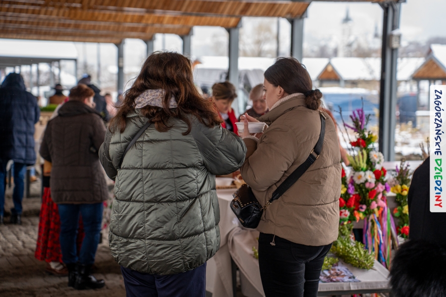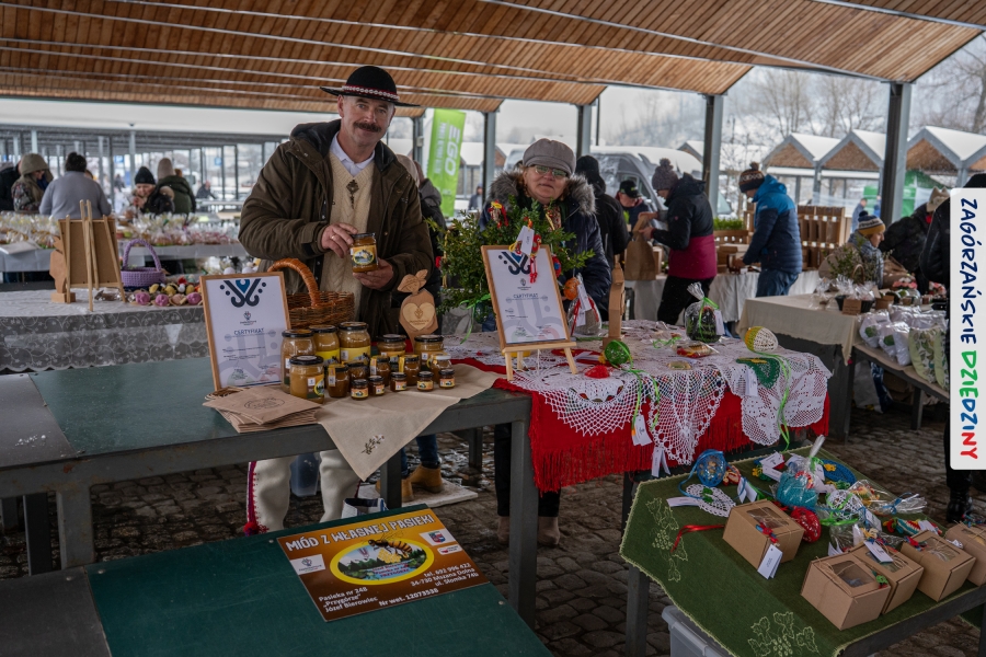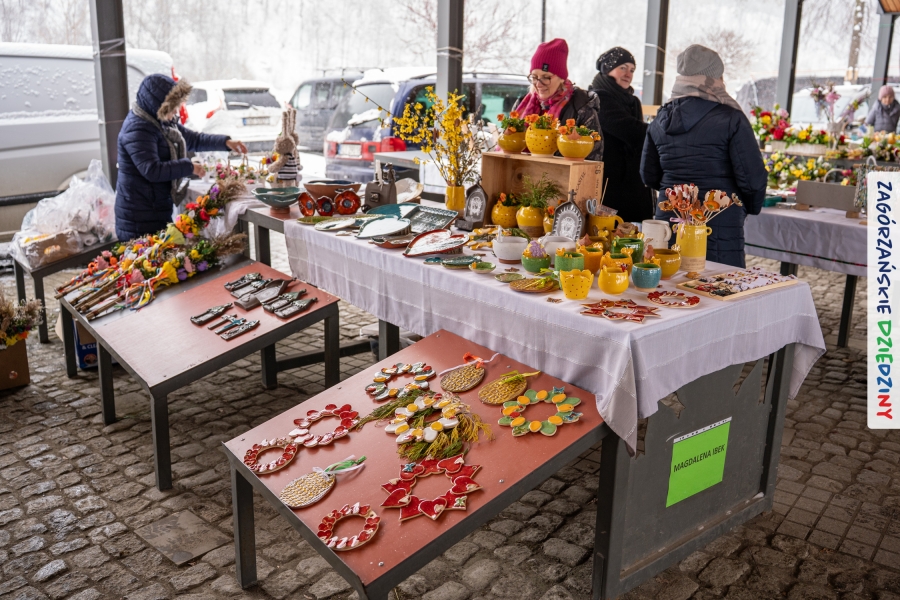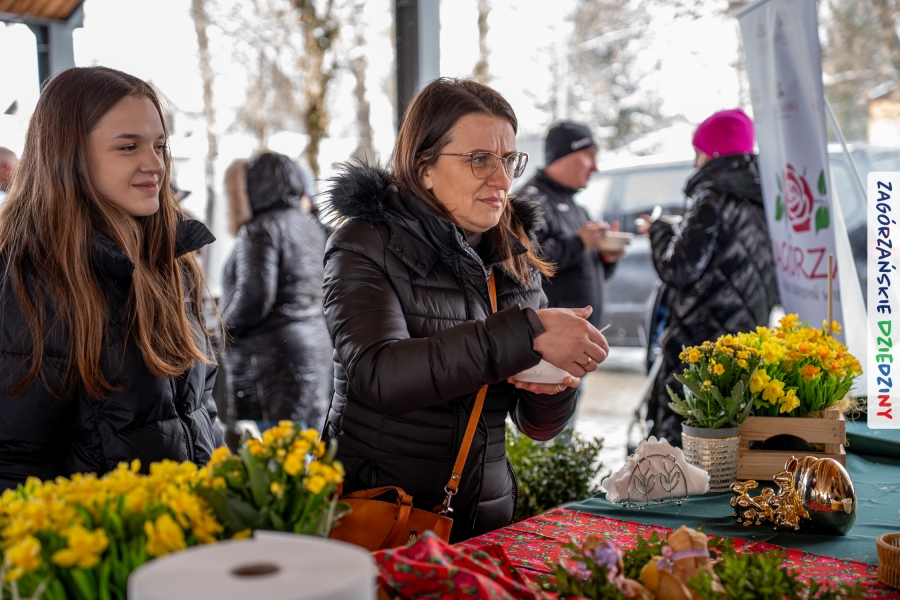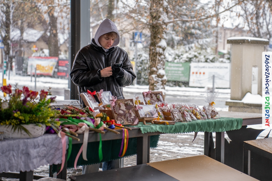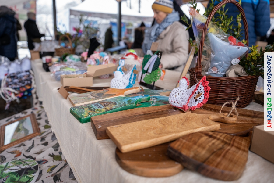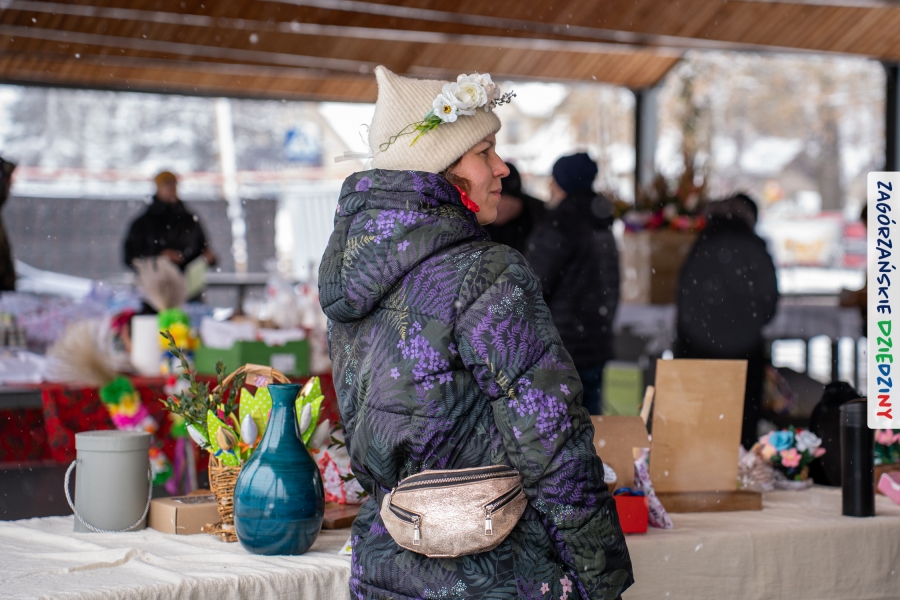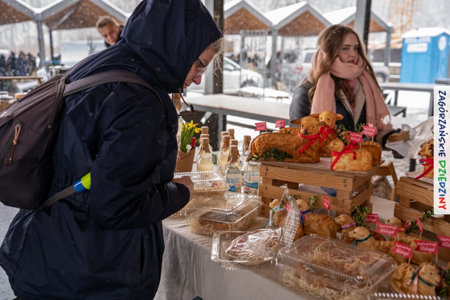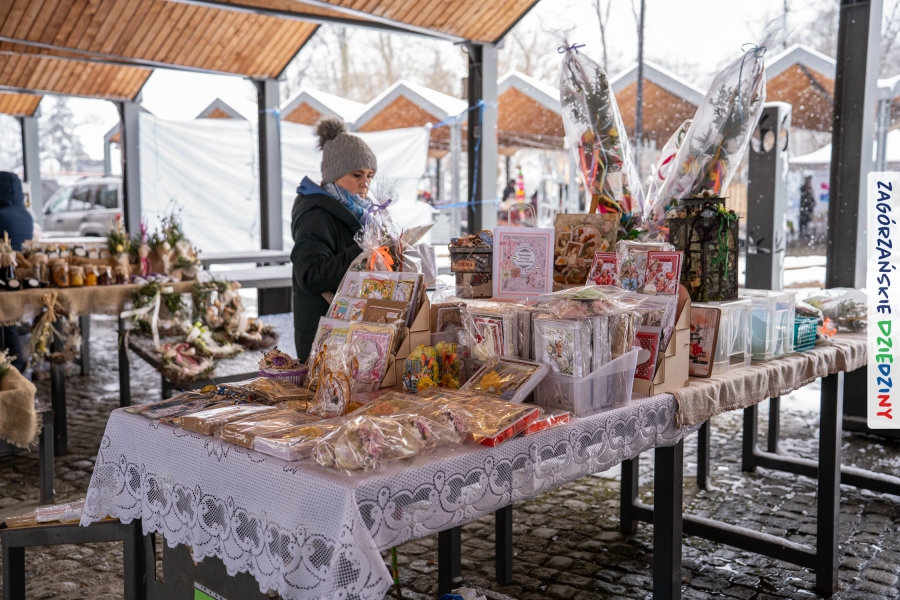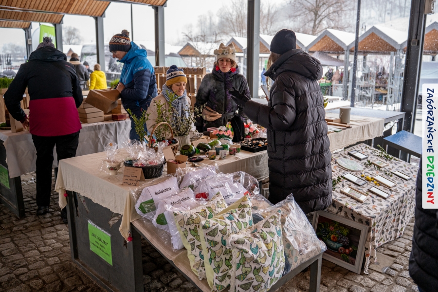 A to dopiero połowa listy! Posiadacze Znaku Promocyjnego Zagórzańskie Dziedziny stanowili mocny zespół, który w tym roku poszerzył się o kolejne nadania. Stoiskiem gastronomicznym z wielkanocnym żurkiem zarządzała rodzina Kościelniaków; to właśnie tam można było zakupić zarówno produkowany w mszańskiej octowni zagórzański żurek i ocet, ale także drożdżowe barany i kolorowe mazurki. Co więcej, nasza licencjonowana Baca w spódnicy, czyli Monika Kościelniak, przywiozła ze sobą swoje najmłodsze pociechy – młode baranki, wśród których serce skradł najmniejszy, Maniek. Wokół ich niewielkiej zagrody zrobiło się zielono i soczyście – to dzięki współpracy z firmą „Lux trawka” mieliśmy możliwość doświadczyć zielonego trawnika w ten śnieżny dzień. Miody od Moniki i Piotra Woźniaków dzięki wielu nagrodom mają swoich nabywców, a do tego sery od Moniki Kubik pasują jak ulał! Co więcej, na tym stoisku zawsze zaskoczy nas jakaś nowość! Tym razem były to serowe paluchy w różnych smakach. Widzieliście wielkanocne propozycje pierników od Gosi Suder? Aż żal będzie je zjeść, tak cieszą oko i zachwycają! Miodu u nas dostatek, wszak drugim, zagórzańskim, dostawcą tego produktu jest Józef Bierowiec, który również pojawił się na jarmarku dotrzymując towarzystwa naszej szydełkowej królowej, Zosi Piętoń. Ślinka ciekła jeszcze bardziej, gdy docieraliśmy na stoisko Moniki Kołodziej vel Cukiernia Babeczka. Ona miała świąteczną ofertę przeróżnych wypieków, wszystko w wielkanocnej aranżacji! Zawsze uśmiechnięta i radosna, Stanisława Blacharczyk, z równie sympatycznym mężem – Janem, na jarmark przywiozła barany – drożdżowe! i te „gołe” i te ubrane w biały, bezowy kożuszek, szybko znalazły nowych właścicieli. Nasze artystki - specjalistki od misternej i dokładnej pracy również mogły zaprezentować swój kunszt. Każdy Drzewniany łobrozek Józi Potaczek, to dopracowana w każdym detalu piękna, uduchowiona twórczość, a Sznurkowe Perełki - koszyczki do święcenia, czapeczki na jajka, okazjonalne dekoracje, pudełka czy zabawki – wszystko to szydełkowa robota. Nie mogło też zabraknąć palm wielkanocnych wykonanych przez Marię Bolisęgę, jak i produktów „Nie z Galerii” oraz dzieł Gabrysi vel Elondi. To właśnie one poszerzyły nasze „markowe grono”. Dziewczyny z Węglówki przywiozły ze sobą sporą ilość przeróżnego rękodzieła, ale nam wzrok uciekał w stronę fantastycznych, turystycznych poduszek. Cieszymy się ogromnie, że zawsze jest z nami Paulina Hanula z całym swoim asortymentem zawierającym się w rodzinnej nazwie firmy „Hafthan Konina”. Poza wszelką regionalną konfekcją i galanterią skórzaną polecamy ciepłe skarpety, które uratowały niejedne zimne nóżki w ten dzień. Na koniec zostawiamy sobie opis stoiska, które wyjątkowo nas urzekło, a należało do naszych przyjaciół, Karoliny i Filipa z „Pora na wycieczkę”. Okazuje się, że ta para ma talent nie tylko do turystycznych wypraw, ale całkiem nieźle radzą sobie w dekoracjach. Drewniana sklejka, naturalny materiał z pięknym świątecznym wzorem, zapakowany w pudełko, zachwycał swoją prostotą, a dodatkowo świecił i przepięknie wyglądał na drewnianej paterze z zielonym mchem chrobotkiem między dekoracją z wysianego owsa.