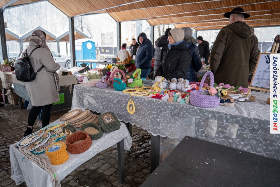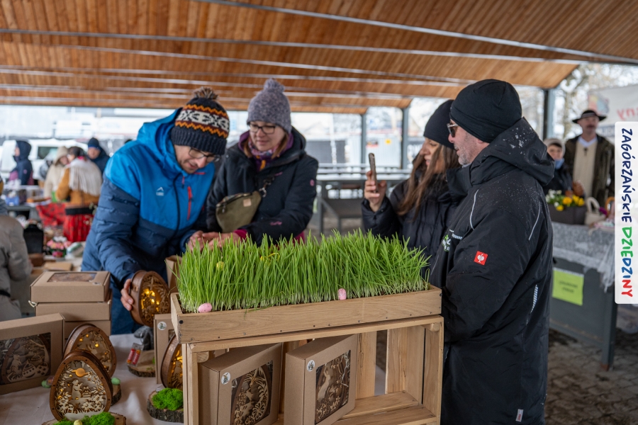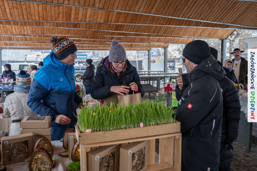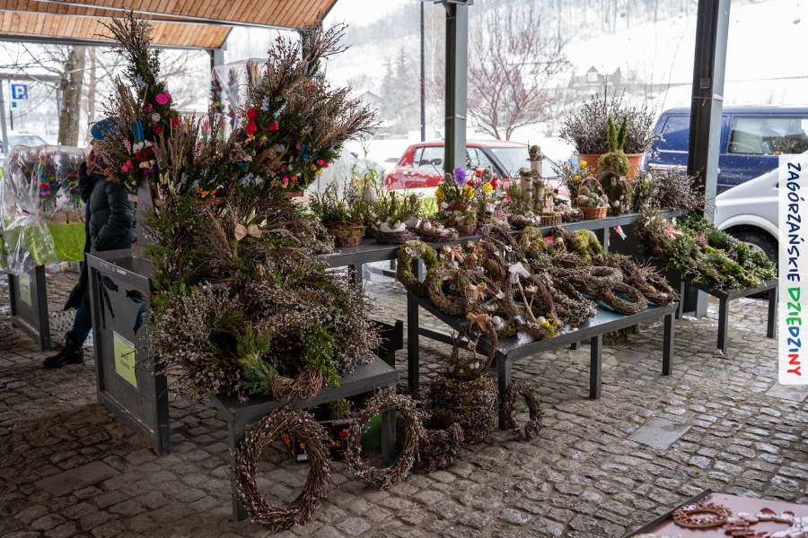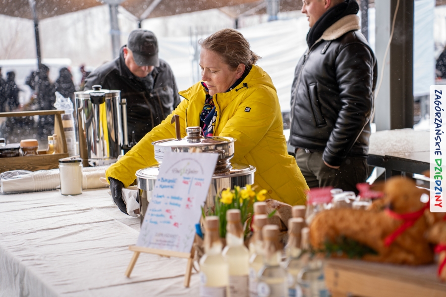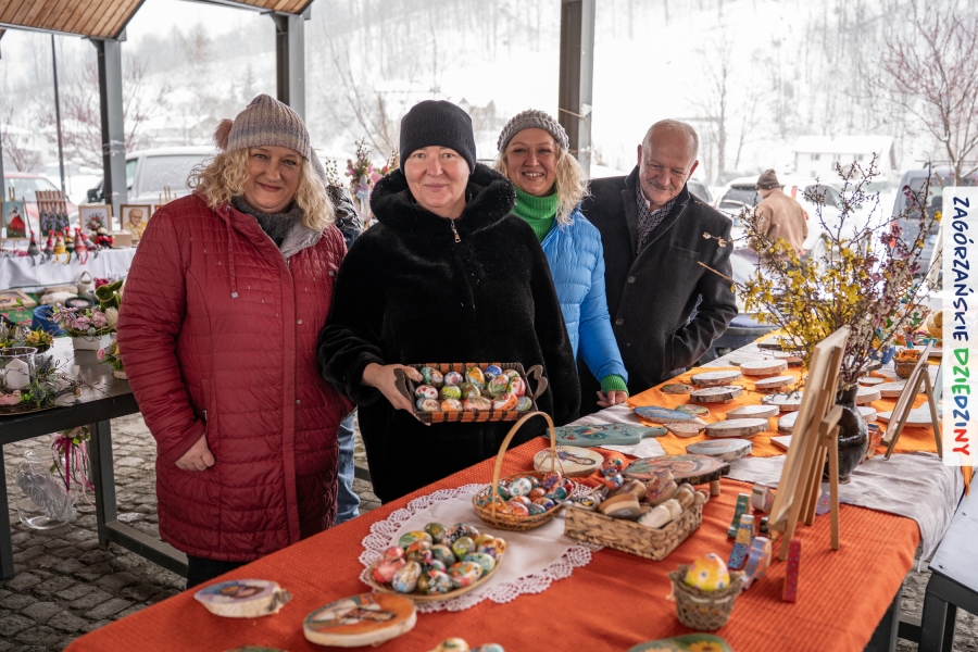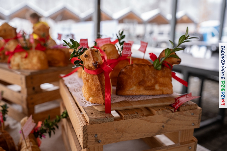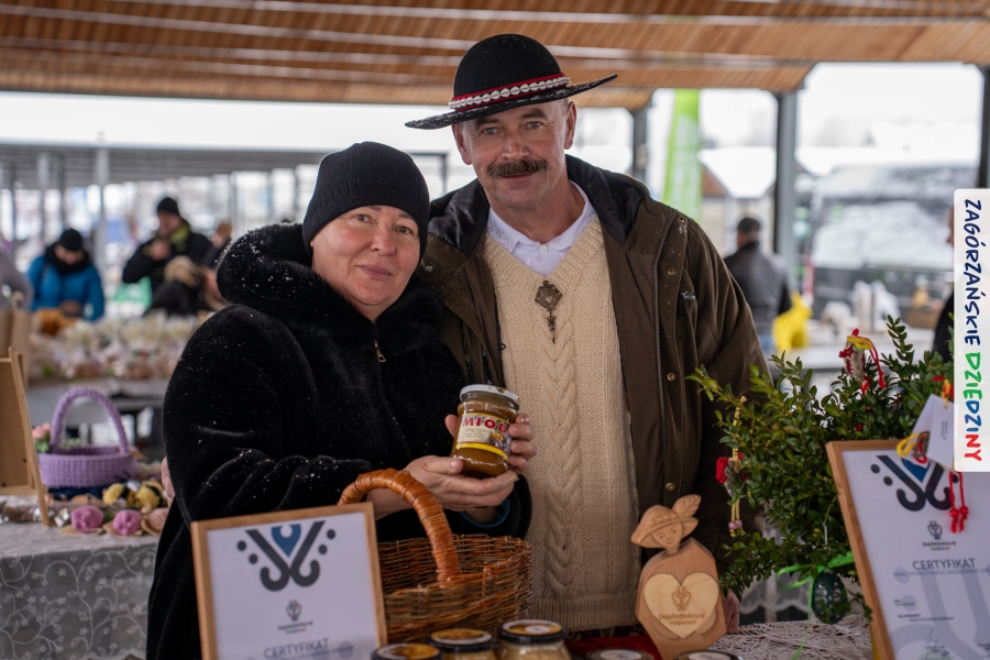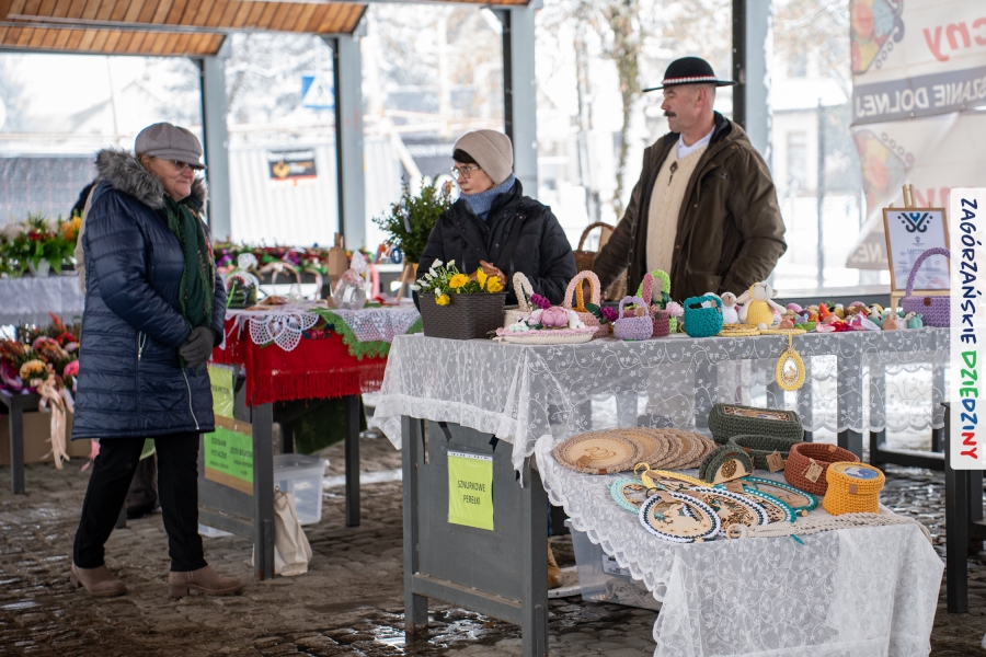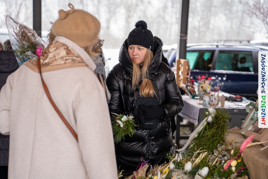 A to dopiero połowa listy! Posiadacze Znaku Promocyjnego Zagórzańskie Dziedziny stanowili mocny zespół, który w tym roku poszerzył się o kolejne nadania. Stoiskiem gastronomicznym z wielkanocnym żurkiem zarządzała rodzina Kościelniaków; to właśnie tam można było zakupić zarówno produkowany w mszańskiej octowni zagórzański żurek i ocet, ale także drożdżowe barany i kolorowe mazurki. Co więcej, nasza licencjonowana Baca w spódnicy, czyli Monika Kościelniak, przywiozła ze sobą swoje najmłodsze pociechy – młode baranki, wśród których serce skradł najmniejszy, Maniek. Wokół ich niewielkiej zagrody zrobiło się zielono i soczyście – to dzięki współpracy z firmą „Lux trawka” mieliśmy możliwość doświadczyć zielonego trawnika w ten śnieżny dzień. Miody od Moniki i Piotra Woźniaków dzięki wielu nagrodom mają swoich nabywców, a do tego sery od Moniki Kubik pasują jak ulał! Co więcej, na tym stoisku zawsze zaskoczy nas jakaś nowość! Tym razem były to serowe paluchy w różnych smakach. Widzieliście wielkanocne propozycje pierników od Gosi Suder? Aż żal będzie je zjeść, tak cieszą oko i zachwycają! Miodu u nas dostatek, wszak drugim, zagórzańskim, dostawcą tego produktu jest Józef Bierowiec, który również pojawił się na jarmarku dotrzymując towarzystwa naszej szydełkowej królowej, Zosi Piętoń. Ślinka ciekła jeszcze bardziej, gdy docieraliśmy na stoisko Moniki Kołodziej vel Cukiernia Babeczka. Ona miała świąteczną ofertę przeróżnych wypieków, wszystko w wielkanocnej aranżacji! Zawsze uśmiechnięta i radosna, Stanisława Blacharczyk, z równie sympatycznym mężem – Janem, na jarmark przywiozła barany – drożdżowe! i te „gołe” i te ubrane w biały, bezowy kożuszek, szybko znalazły nowych właścicieli. Nasze artystki - specjalistki od misternej i dokładnej pracy również mogły zaprezentować swój kunszt. Każdy Drzewniany łobrozek Józi Potaczek, to dopracowana w każdym detalu piękna, uduchowiona twórczość, a Sznurkowe Perełki - koszyczki do święcenia, czapeczki na jajka, okazjonalne dekoracje, pudełka czy zabawki – wszystko to szydełkowa robota. Nie mogło też zabraknąć palm wielkanocnych wykonanych przez Marię Bolisęgę, jak i produktów „Nie z Galerii” oraz dzieł Gabrysi vel Elondi. To właśnie one poszerzyły nasze „markowe grono”. Dziewczyny z Węglówki przywiozły ze sobą sporą ilość przeróżnego rękodzieła, ale nam wzrok uciekał w stronę fantastycznych, turystycznych poduszek. Cieszymy się ogromnie, że zawsze jest z nami Paulina Hanula z całym swoim asortymentem zawierającym się w rodzinnej nazwie firmy „Hafthan Konina”. Poza wszelką regionalną konfekcją i galanterią skórzaną polecamy ciepłe skarpety, które uratowały niejedne zimne nóżki w ten dzień. Na koniec zostawiamy sobie opis stoiska, które wyjątkowo nas urzekło, a należało do naszych przyjaciół, Karoliny i Filipa z „Pora na wycieczkę”. Okazuje się, że ta para ma talent nie tylko do turystycznych wypraw, ale całkiem nieźle radzą sobie w dekoracjach. Drewniana sklejka, naturalny materiał z pięknym świątecznym wzorem, zapakowany w pudełko, zachwycał swoją prostotą, a dodatkowo świecił i przepięknie wyglądał na drewnianej paterze z zielonym mchem chrobotkiem między dekoracją z wysianego owsa.