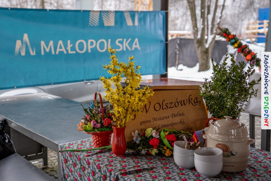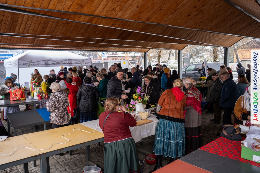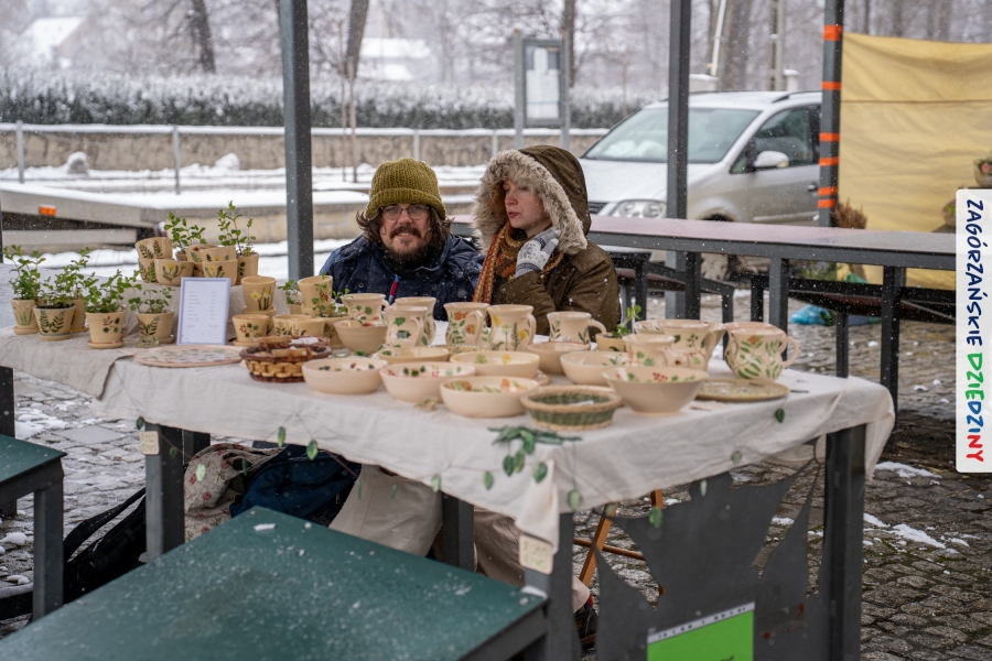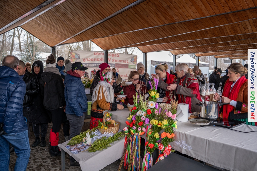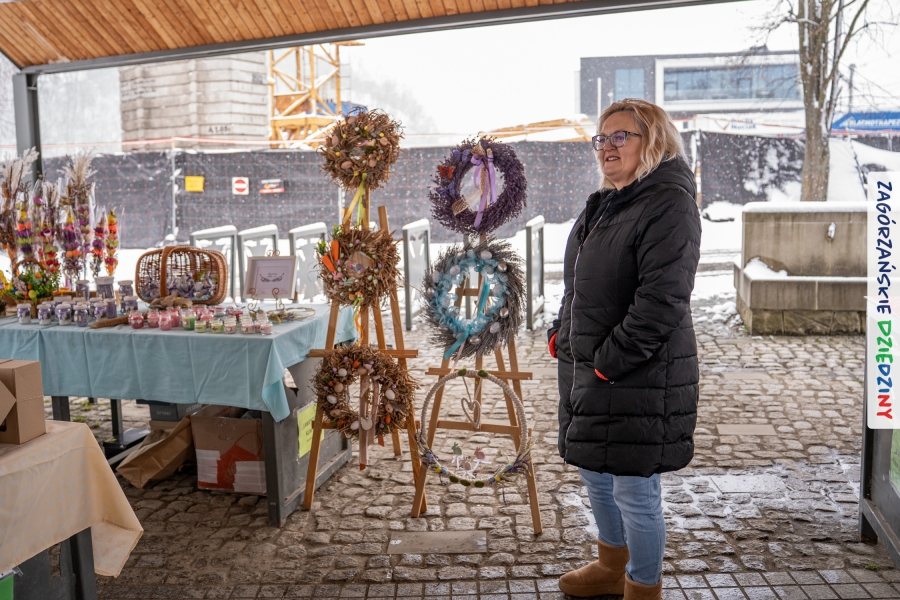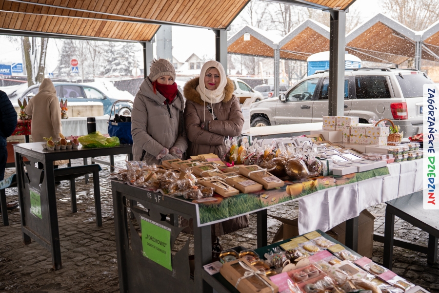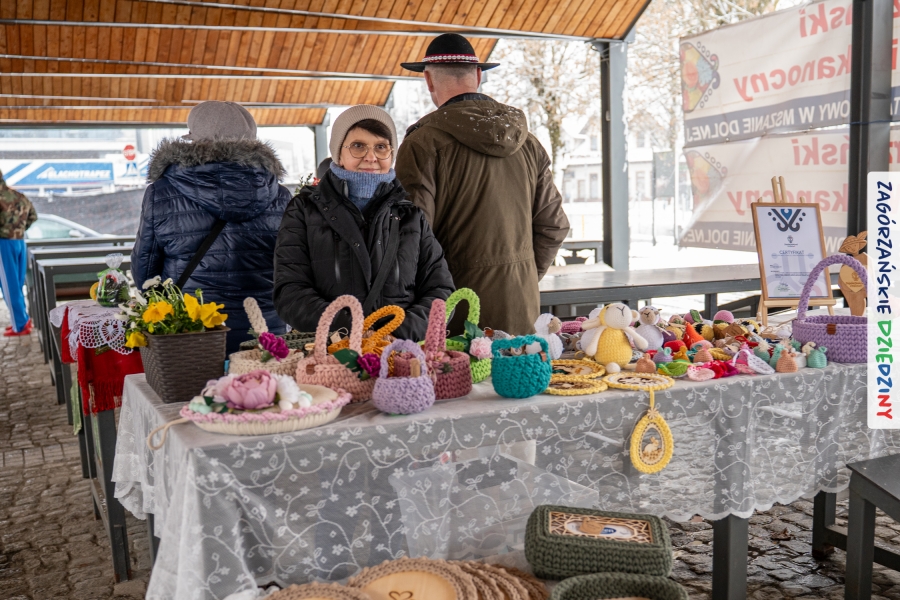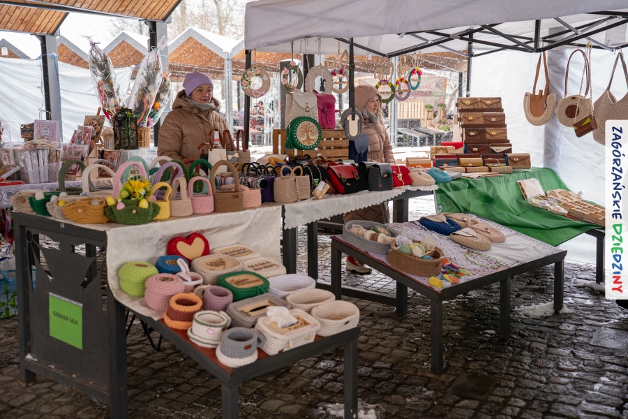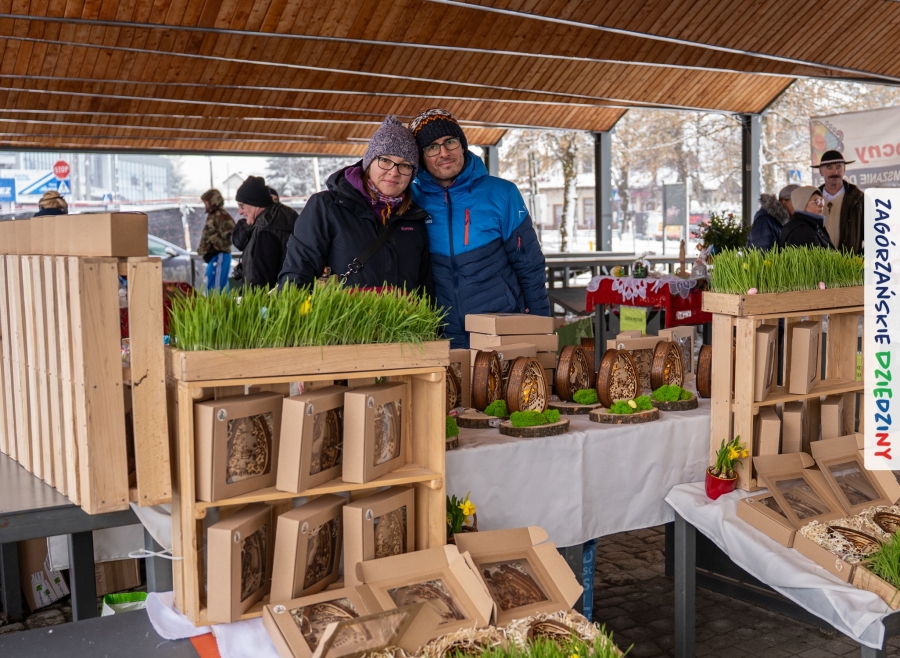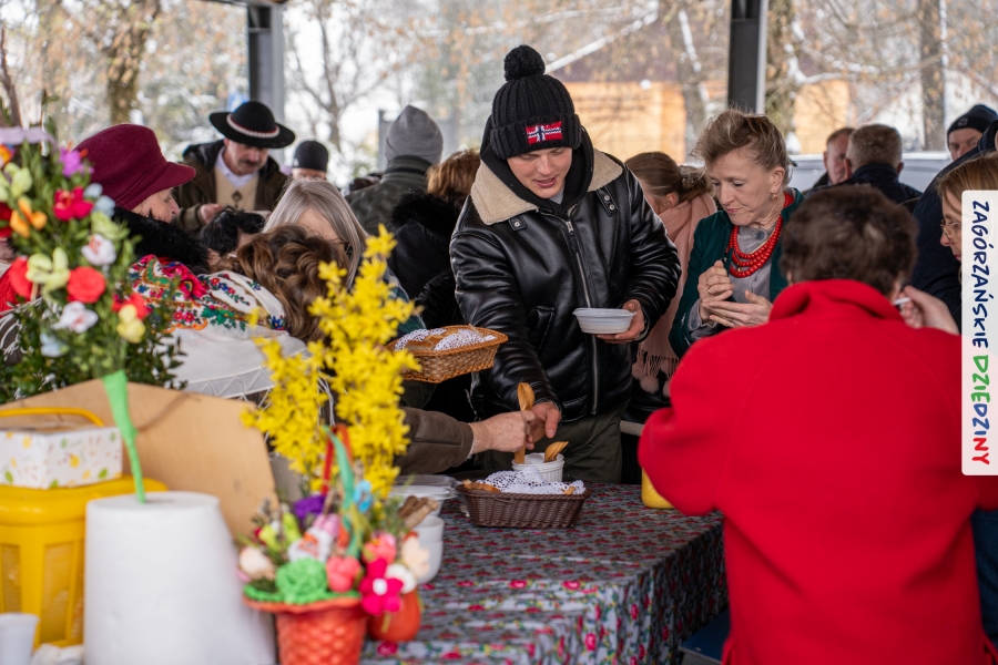 A to dopiero połowa listy! Posiadacze Znaku Promocyjnego Zagórzańskie Dziedziny stanowili mocny zespół, który w tym roku poszerzył się o kolejne nadania. Stoiskiem gastronomicznym z wielkanocnym żurkiem zarządzała rodzina Kościelniaków; to właśnie tam można było zakupić zarówno produkowany w mszańskiej octowni zagórzański żurek i ocet, ale także drożdżowe barany i kolorowe mazurki. Co więcej, nasza licencjonowana Baca w spódnicy, czyli Monika Kościelniak, przywiozła ze sobą swoje najmłodsze pociechy – młode baranki, wśród których serce skradł najmniejszy, Maniek. Wokół ich niewielkiej zagrody zrobiło się zielono i soczyście – to dzięki współpracy z firmą „Lux trawka” mieliśmy możliwość doświadczyć zielonego trawnika w ten śnieżny dzień. Miody od Moniki i Piotra Woźniaków dzięki wielu nagrodom mają swoich nabywców, a do tego sery od Moniki Kubik pasują jak ulał! Co więcej, na tym stoisku zawsze zaskoczy nas jakaś nowość! Tym razem były to serowe paluchy w różnych smakach. Widzieliście wielkanocne propozycje pierników od Gosi Suder? Aż żal będzie je zjeść, tak cieszą oko i zachwycają! Miodu u nas dostatek, wszak drugim, zagórzańskim, dostawcą tego produktu jest Józef Bierowiec, który również pojawił się na jarmarku dotrzymując towarzystwa naszej szydełkowej królowej, Zosi Piętoń. Ślinka ciekła jeszcze bardziej, gdy docieraliśmy na stoisko Moniki Kołodziej vel Cukiernia Babeczka. Ona miała świąteczną ofertę przeróżnych wypieków, wszystko w wielkanocnej aranżacji! Zawsze uśmiechnięta i radosna, Stanisława Blacharczyk, z równie sympatycznym mężem – Janem, na jarmark przywiozła barany – drożdżowe! i te „gołe” i te ubrane w biały, bezowy kożuszek, szybko znalazły nowych właścicieli. Nasze artystki - specjalistki od misternej i dokładnej pracy również mogły zaprezentować swój kunszt. Każdy Drzewniany łobrozek Józi Potaczek, to dopracowana w każdym detalu piękna, uduchowiona twórczość, a Sznurkowe Perełki - koszyczki do święcenia, czapeczki na jajka, okazjonalne dekoracje, pudełka czy zabawki – wszystko to szydełkowa robota. Nie mogło też zabraknąć palm wielkanocnych wykonanych przez Marię Bolisęgę, jak i produktów „Nie z Galerii” oraz dzieł Gabrysi vel Elondi. To właśnie one poszerzyły nasze „markowe grono”. Dziewczyny z Węglówki przywiozły ze sobą sporą ilość przeróżnego rękodzieła, ale nam wzrok uciekał w stronę fantastycznych, turystycznych poduszek. Cieszymy się ogromnie, że zawsze jest z nami Paulina Hanula z całym swoim asortymentem zawierającym się w rodzinnej nazwie firmy „Hafthan Konina”. Poza wszelką regionalną konfekcją i galanterią skórzaną polecamy ciepłe skarpety, które uratowały niejedne zimne nóżki w ten dzień. Na koniec zostawiamy sobie opis stoiska, które wyjątkowo nas urzekło, a należało do naszych przyjaciół, Karoliny i Filipa z „Pora na wycieczkę”. Okazuje się, że ta para ma talent nie tylko do turystycznych wypraw, ale całkiem nieźle radzą sobie w dekoracjach. Drewniana sklejka, naturalny materiał z pięknym świątecznym wzorem, zapakowany w pudełko, zachwycał swoją prostotą, a dodatkowo świecił i przepięknie wyglądał na drewnianej paterze z zielonym mchem chrobotkiem między dekoracją z wysianego owsa.